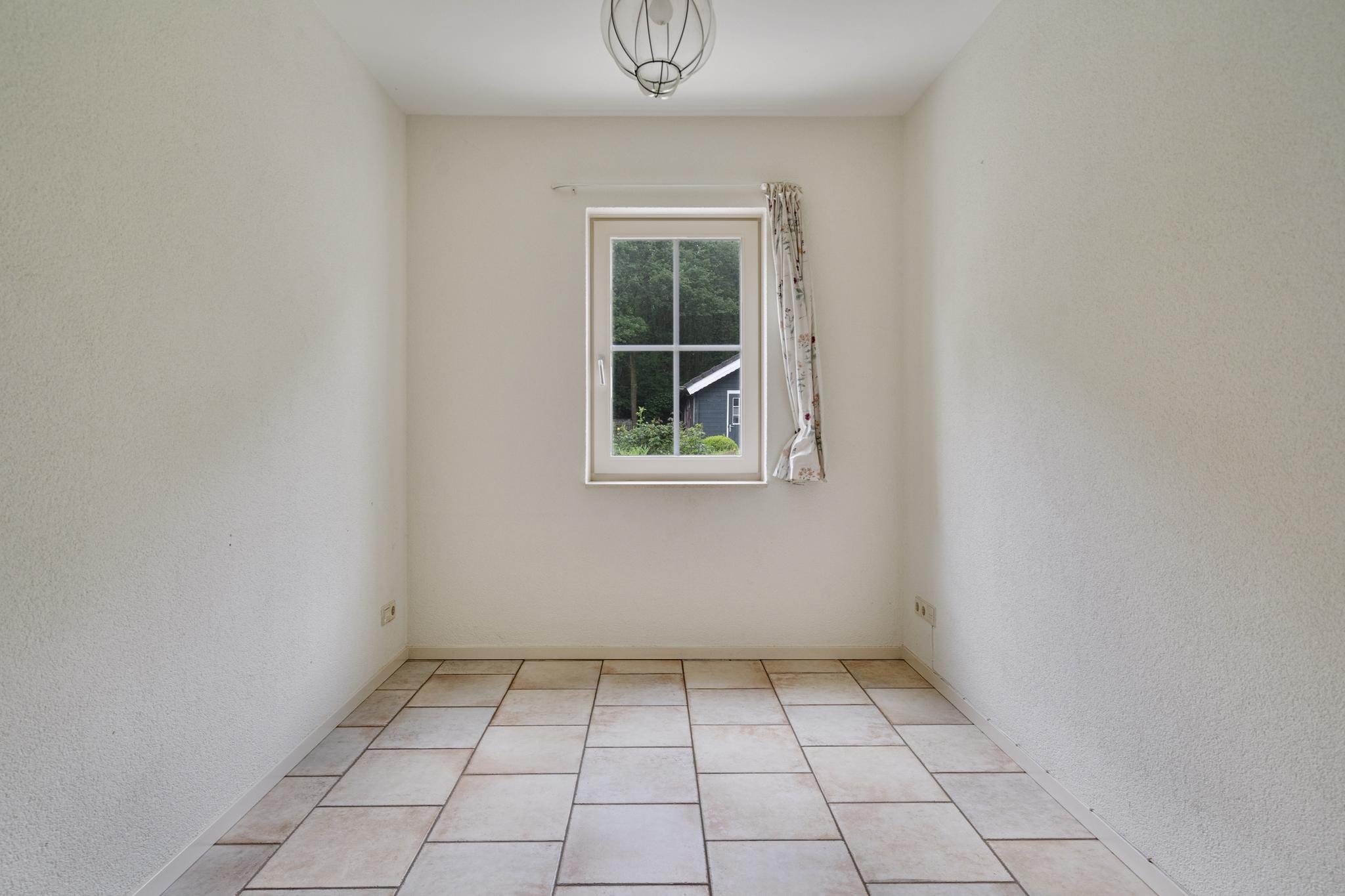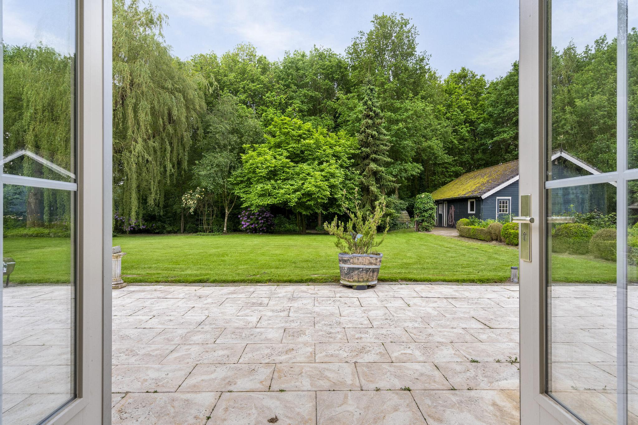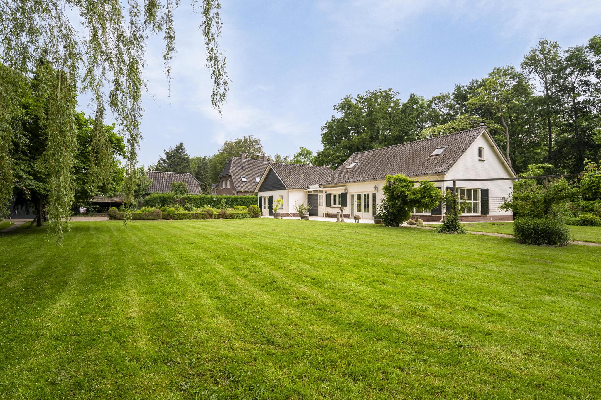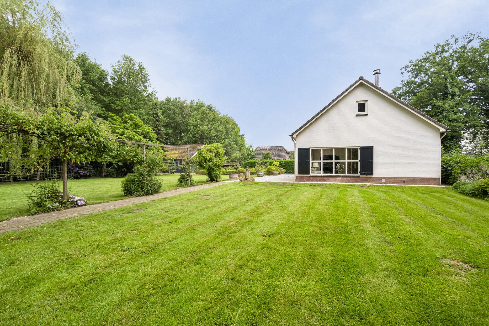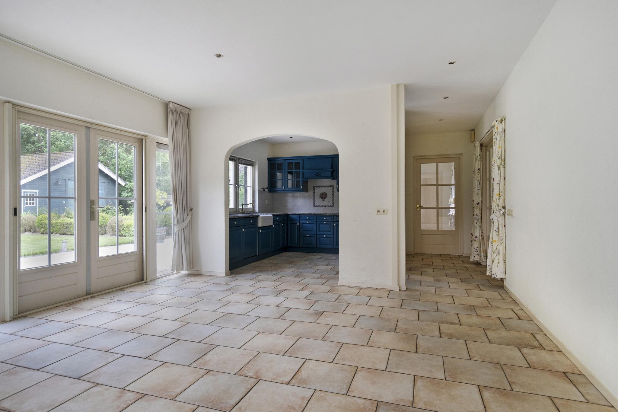 Begane grond: Overdekte entree; royale hal; meterkast; garderobenis; badkamer I met wandtoilet, wastafel, douchecabine en een design radiator; vlieringtrap naar de 1e verdieping; vanuit de hal een dubbele deur naar de woonkamer met een openhaard; dubbele deuren naar de tuin; een landelijke open keuken in L-opstelling en voorzien van granieten aanrechtblad met een inductie kookplaat met afzuigkap, oven, koelkast; tussenhal met schuifkasten wand; bijkeuken spoelbak, inloopkast en met een deur naar de tuin; gang naar slaapkamer I; slaapkamer II met dubbele deuren naar de tuin; badkamer II met raam en voorzien van wastafel, douchecabine, ligbad, bidet en wastafel; vlieringtrap naar de 1e verdieping.