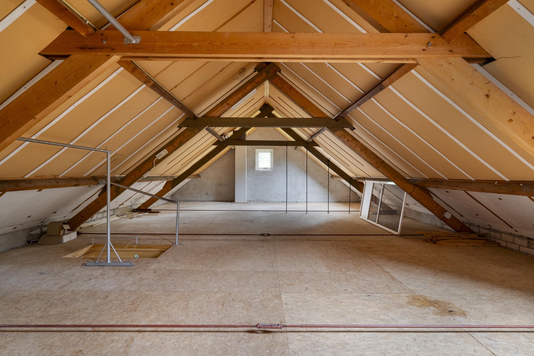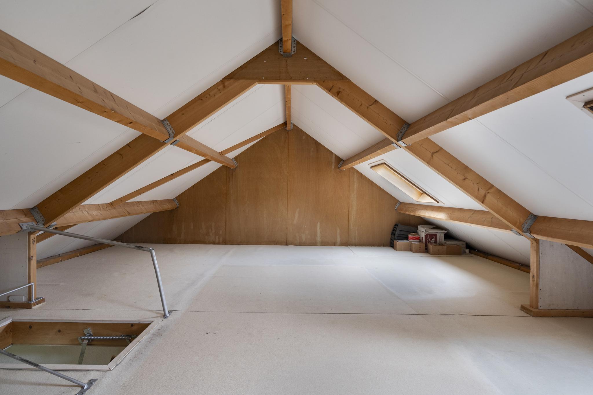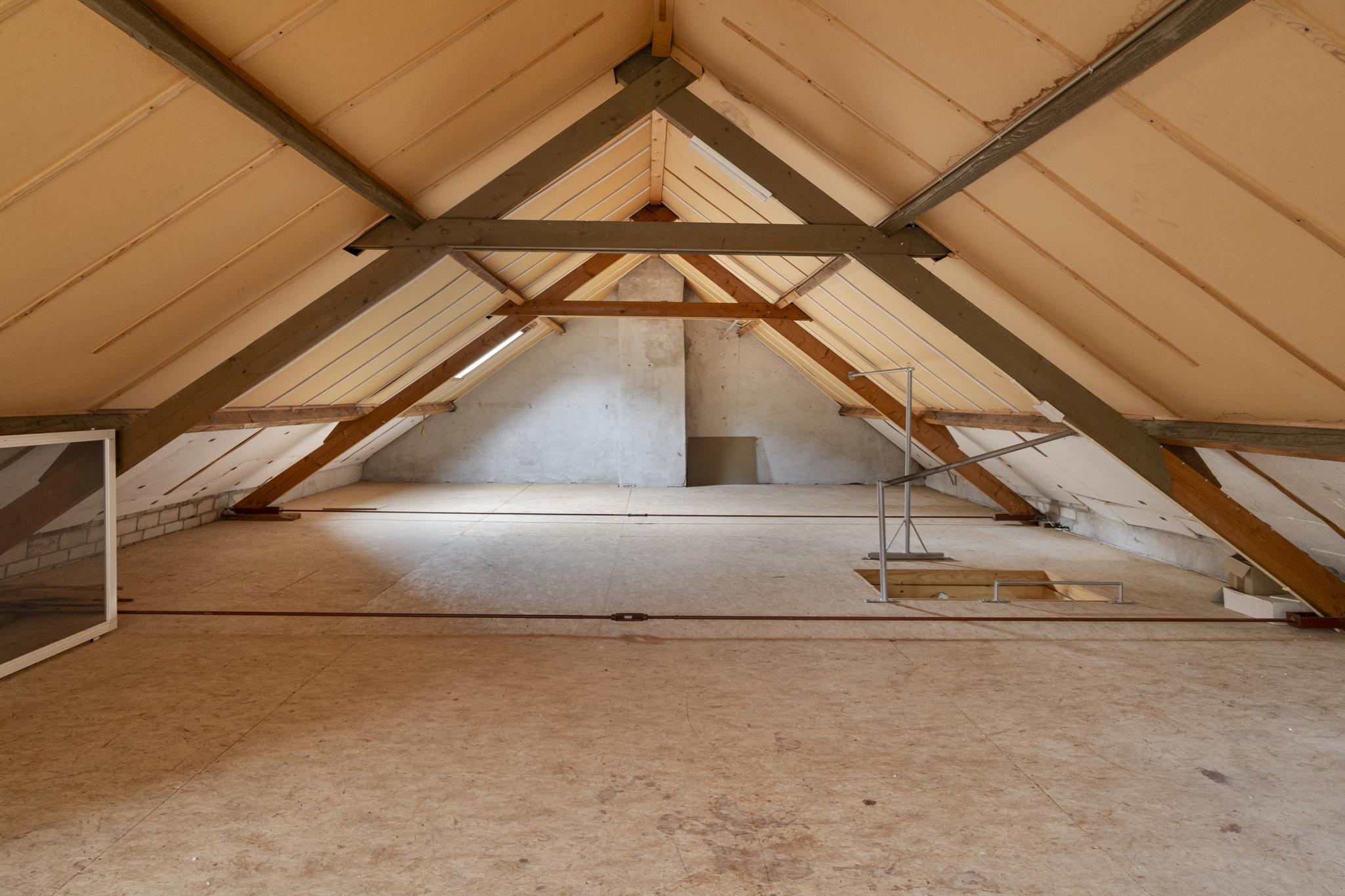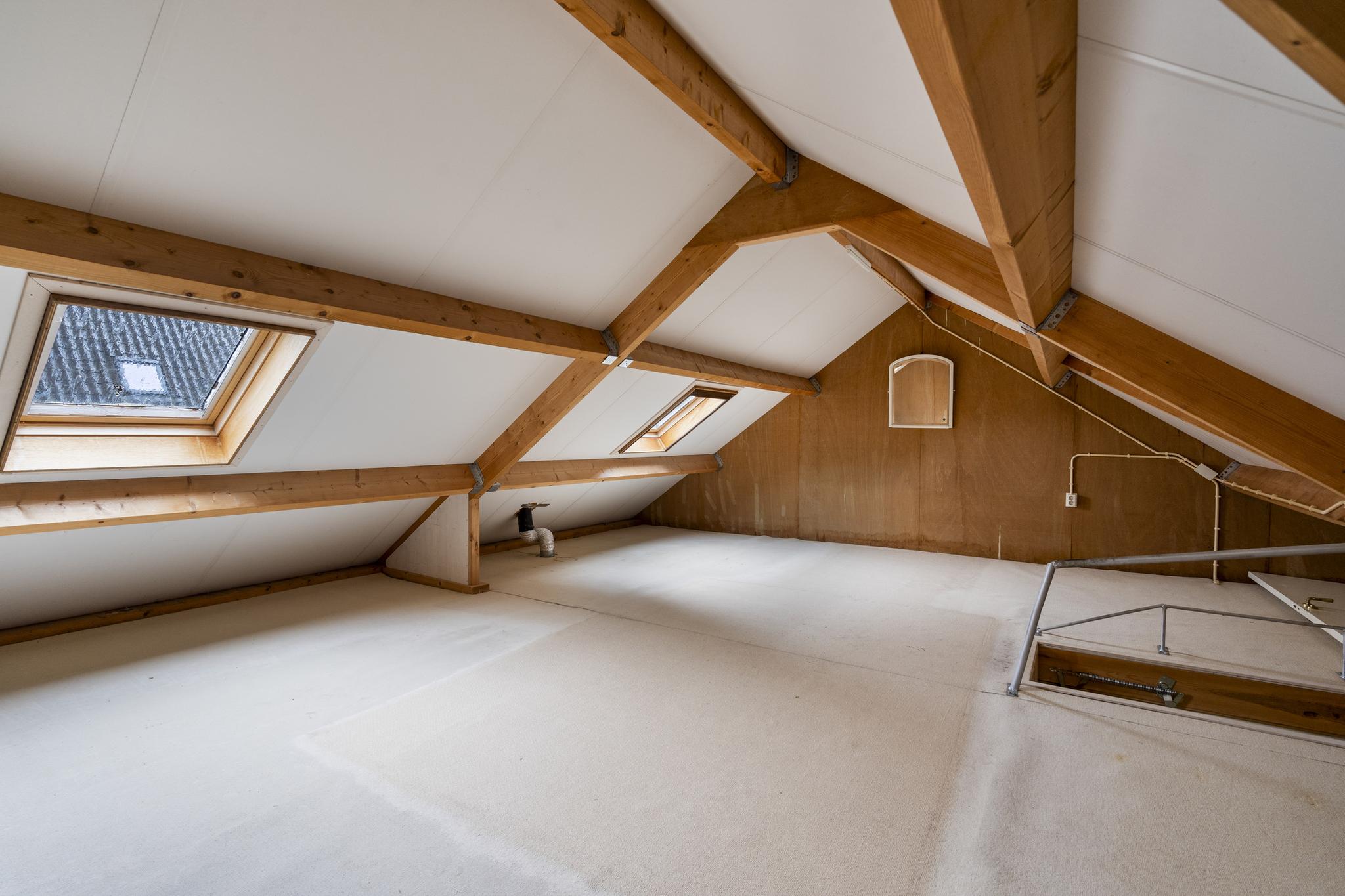 1e verdieping: Via 2 vlizotrappen toegang tot 2 grote aparte zolders beide voorzien van dakvensters, hier is de mogelijkheid aanwezig om meerdere slaapkamers te realiseren.