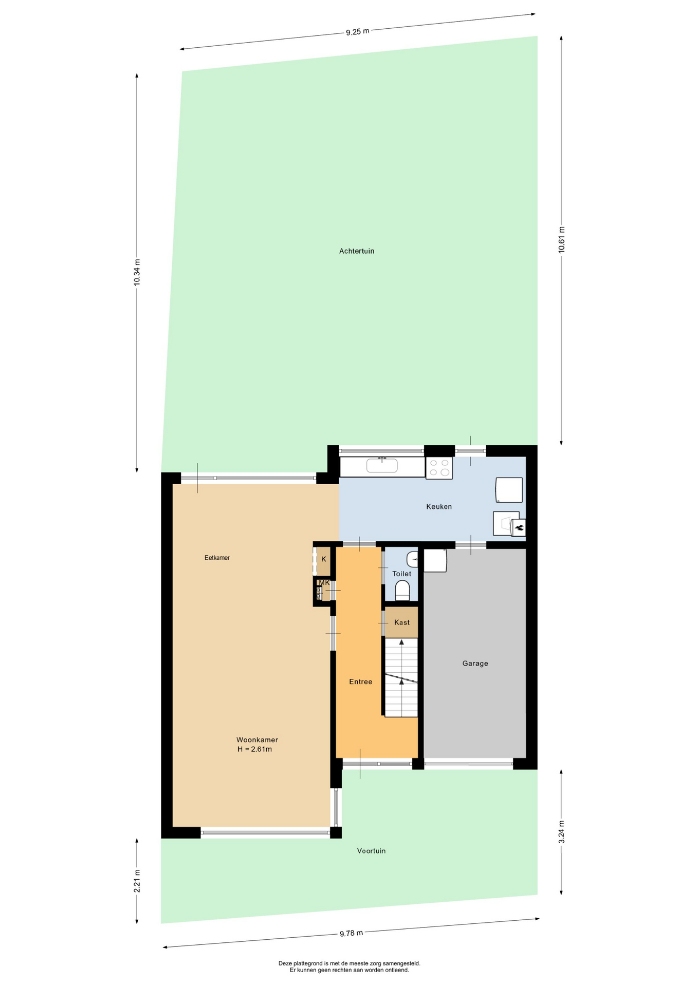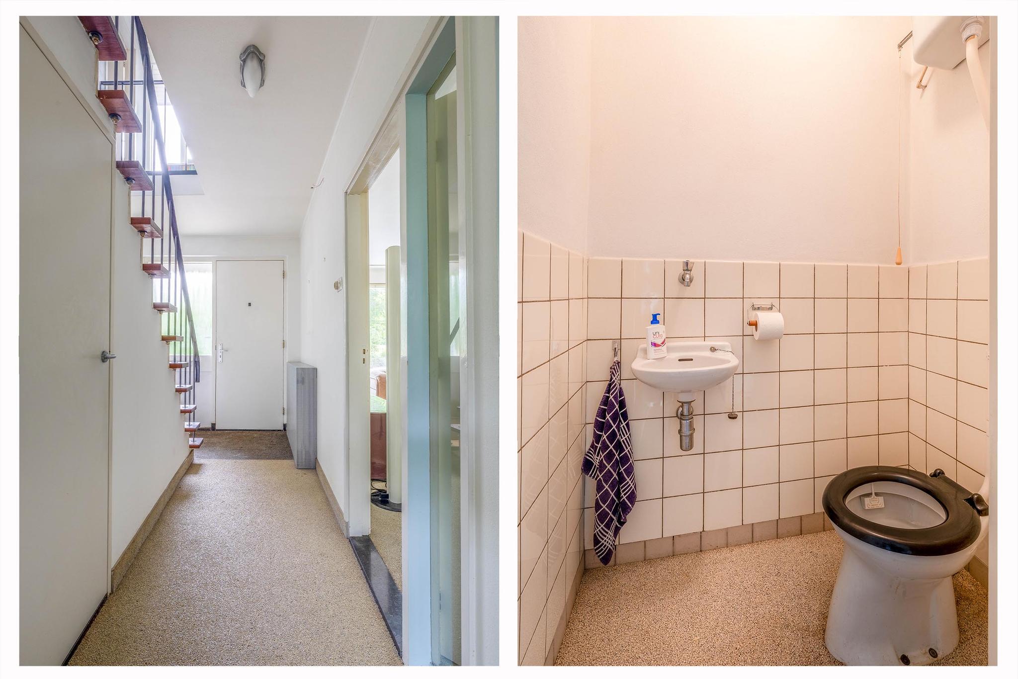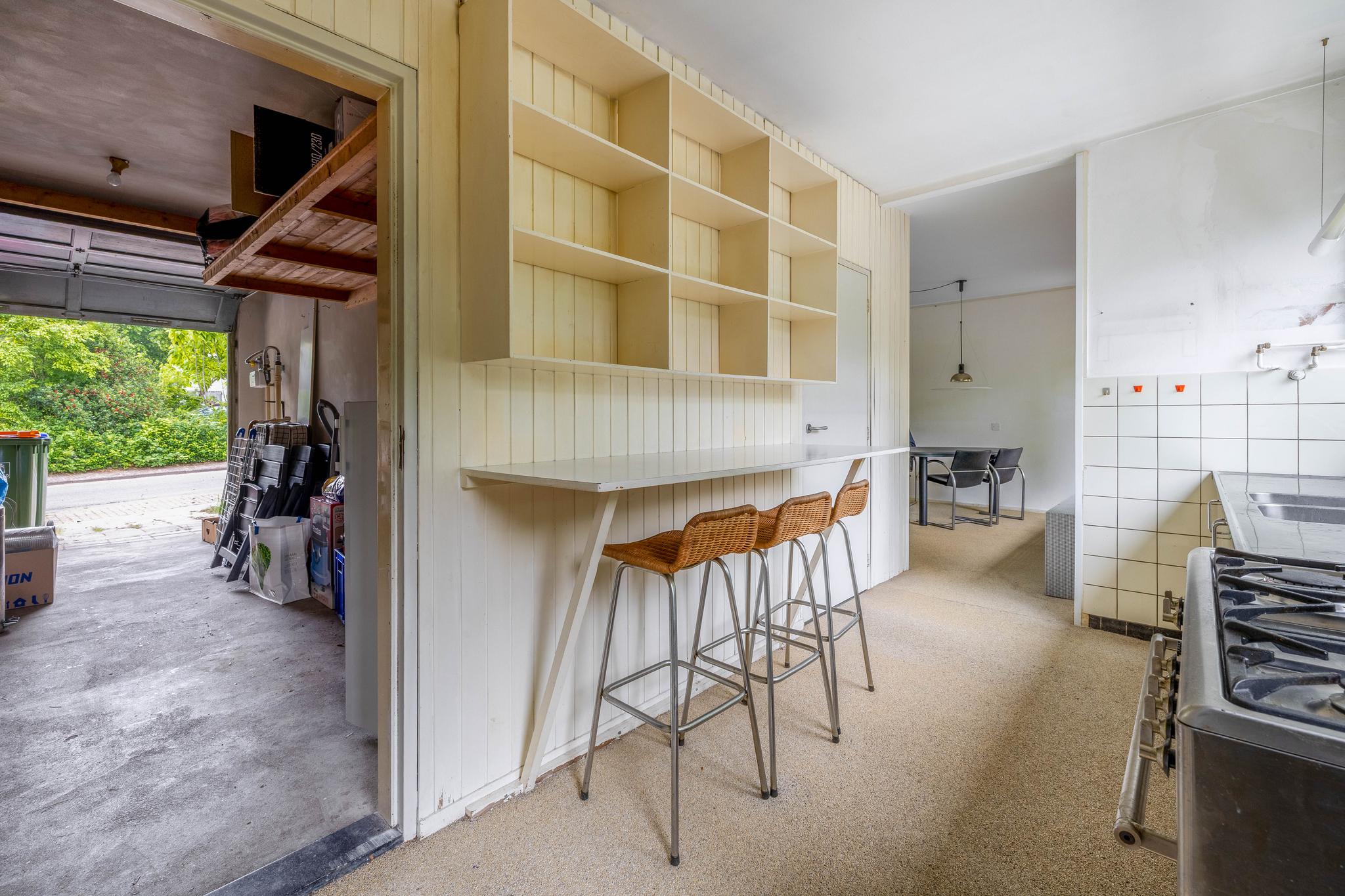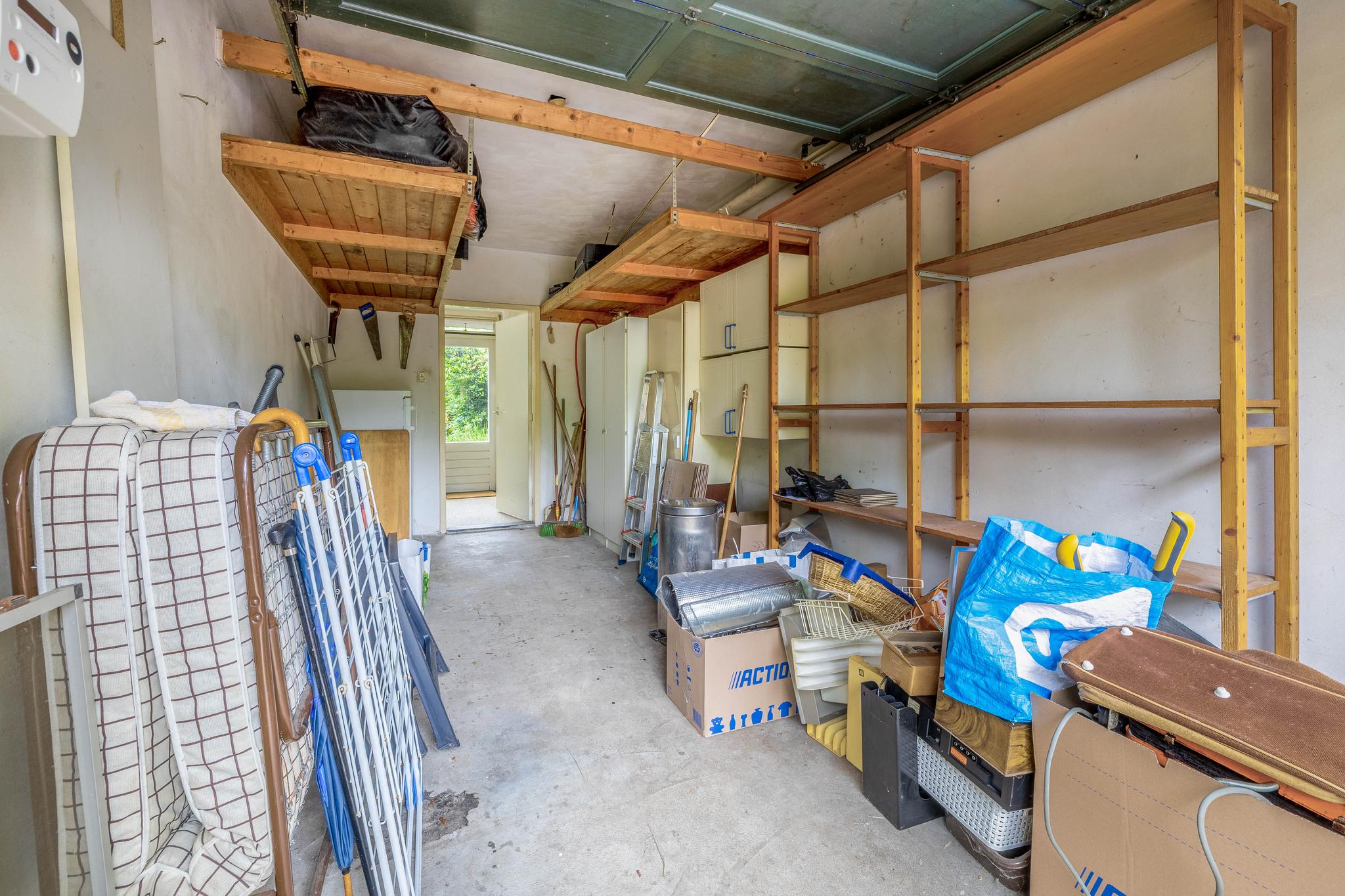 Begane grond: Overdekte entree; hal; verdiepte trapkast; toilet met fontein; meterkast; doorzonwoonkamer voorzien van dubbel glas met een deur naar de tuin, houten vloer en ondervloer en woongrind erboven; doorloop naar de eenvoudige keuken in rechte opstelling geplaatst en met een vrijstaand gasfornuis met oven 90 cm breed, wasmachine aansluiting, kast met c.v.-ketel (Nefit Topline HR uit 2008); aangebouwde/inpandige garage met garagedeur.