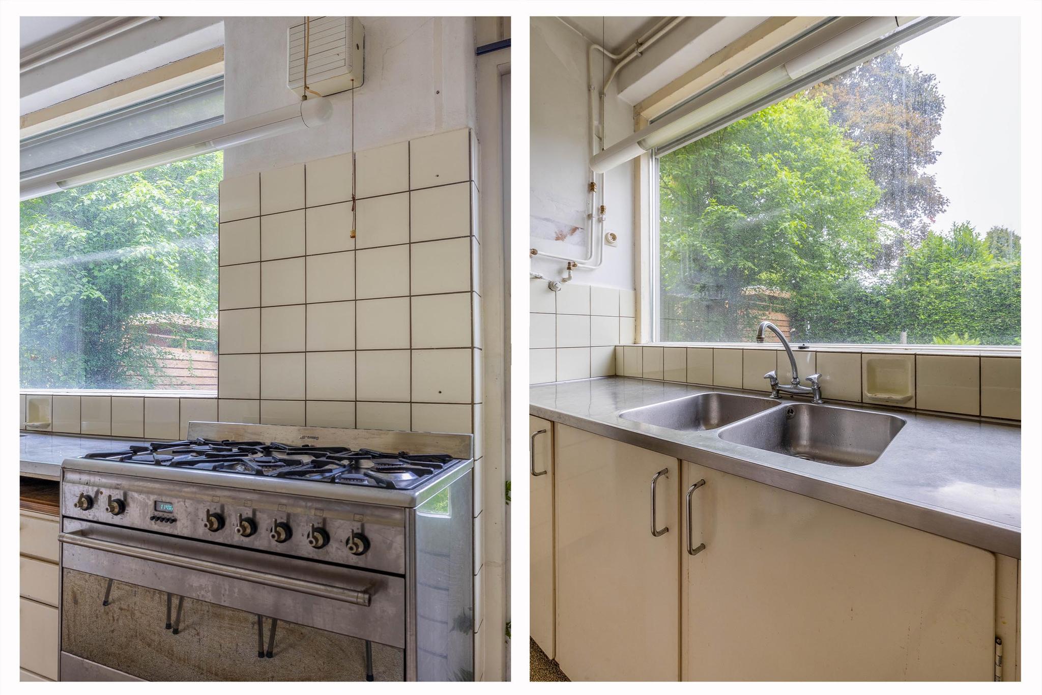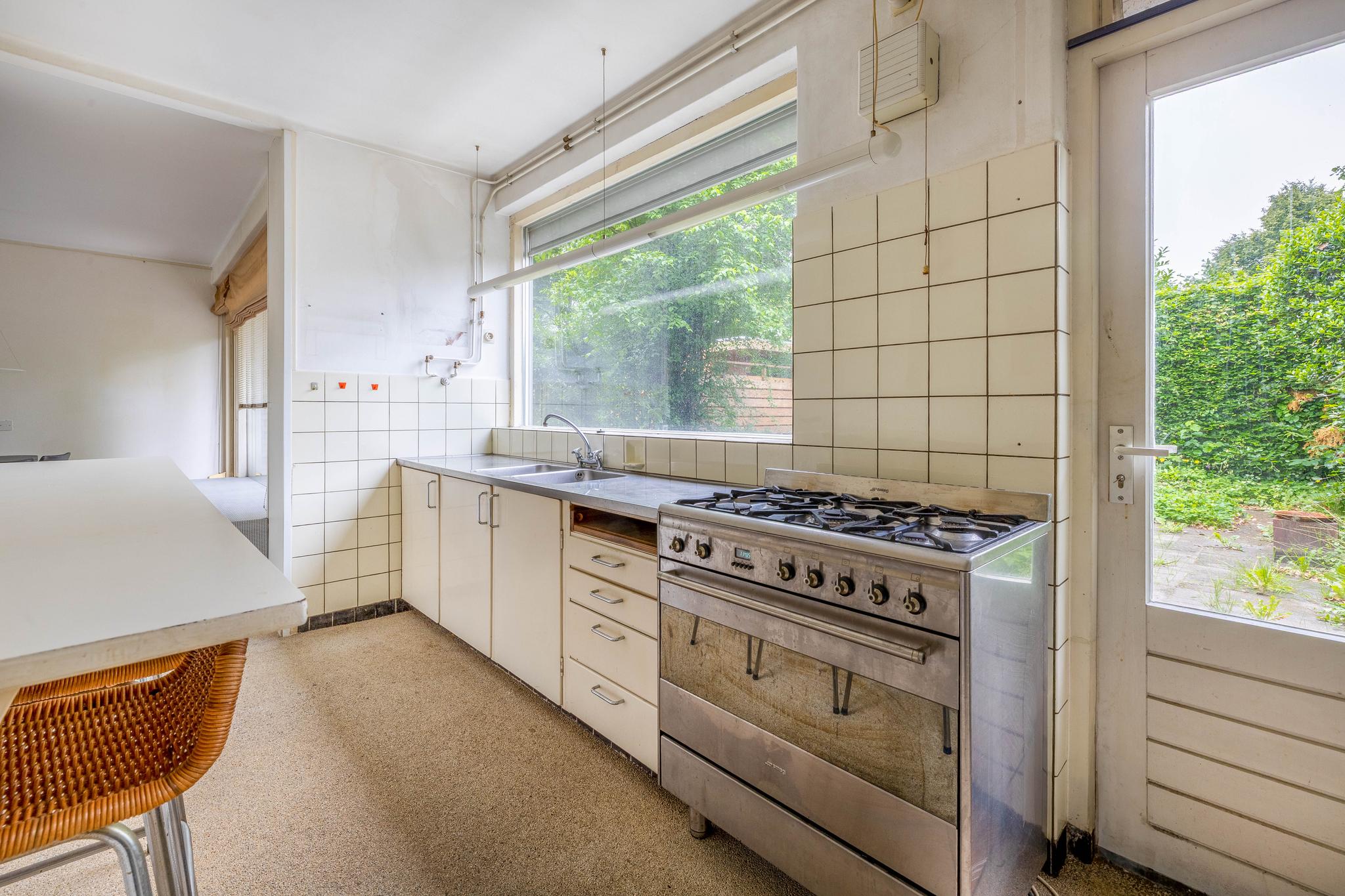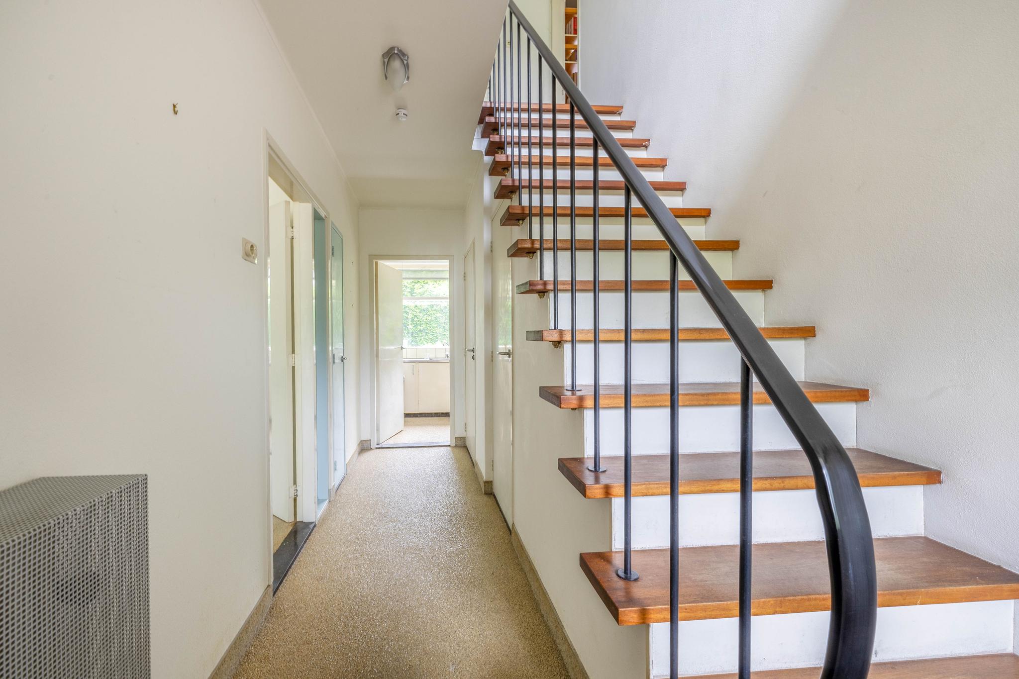 Begane grond: Overdekte entree; hal; verdiepte trapkast; toilet met fontein; meterkast; doorzonwoonkamer voorzien van dubbel glas met een deur naar de tuin, houten vloer en ondervloer en woongrind erboven; doorloop naar de eenvoudige keuken in rechte opstelling geplaatst en met een vrijstaand gasfornuis met oven 90 cm breed, wasmachine aansluiting, kast met c.v.-ketel (Nefit Topline HR uit 2008); aangebouwde/inpandige garage met garagedeur.
