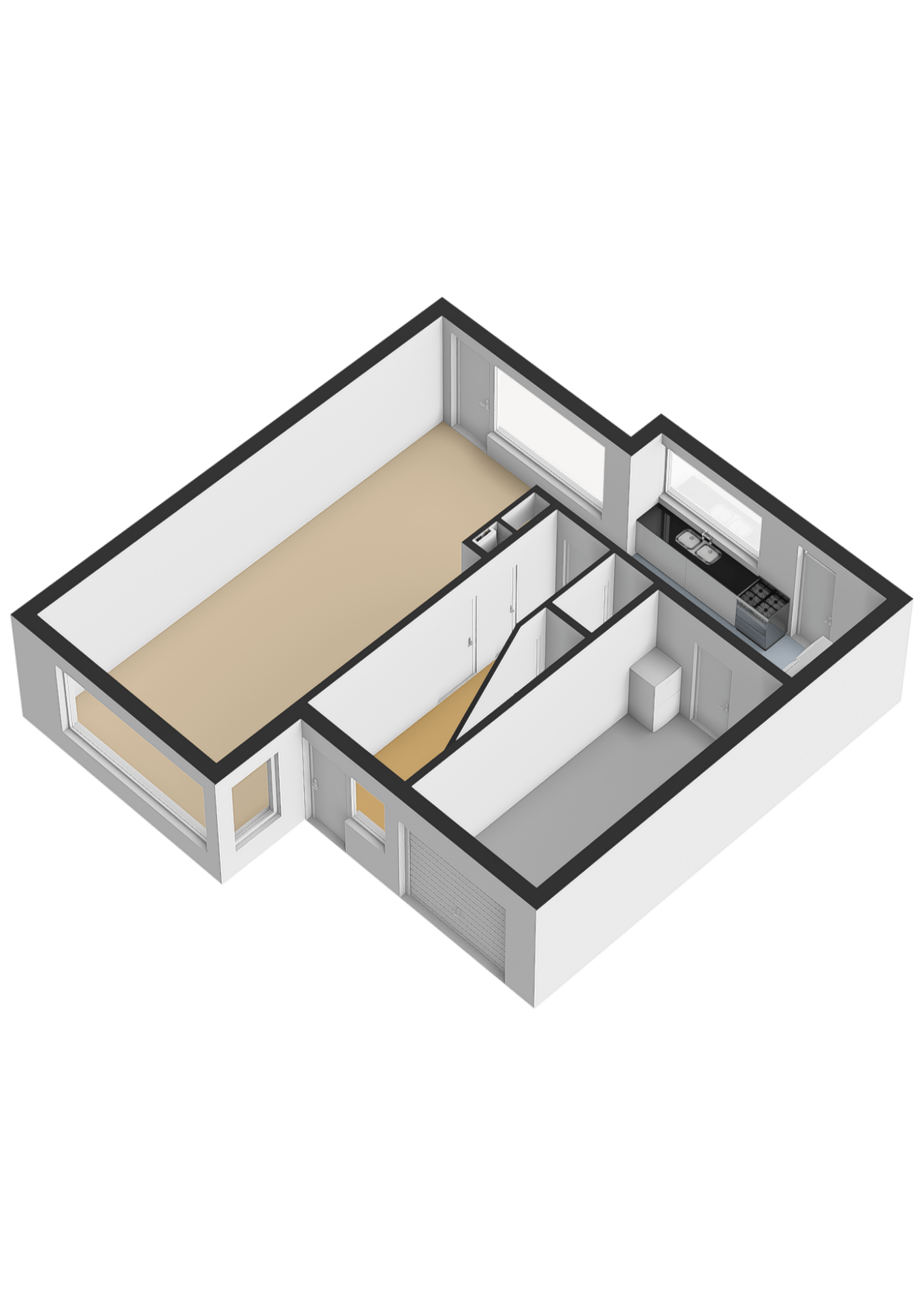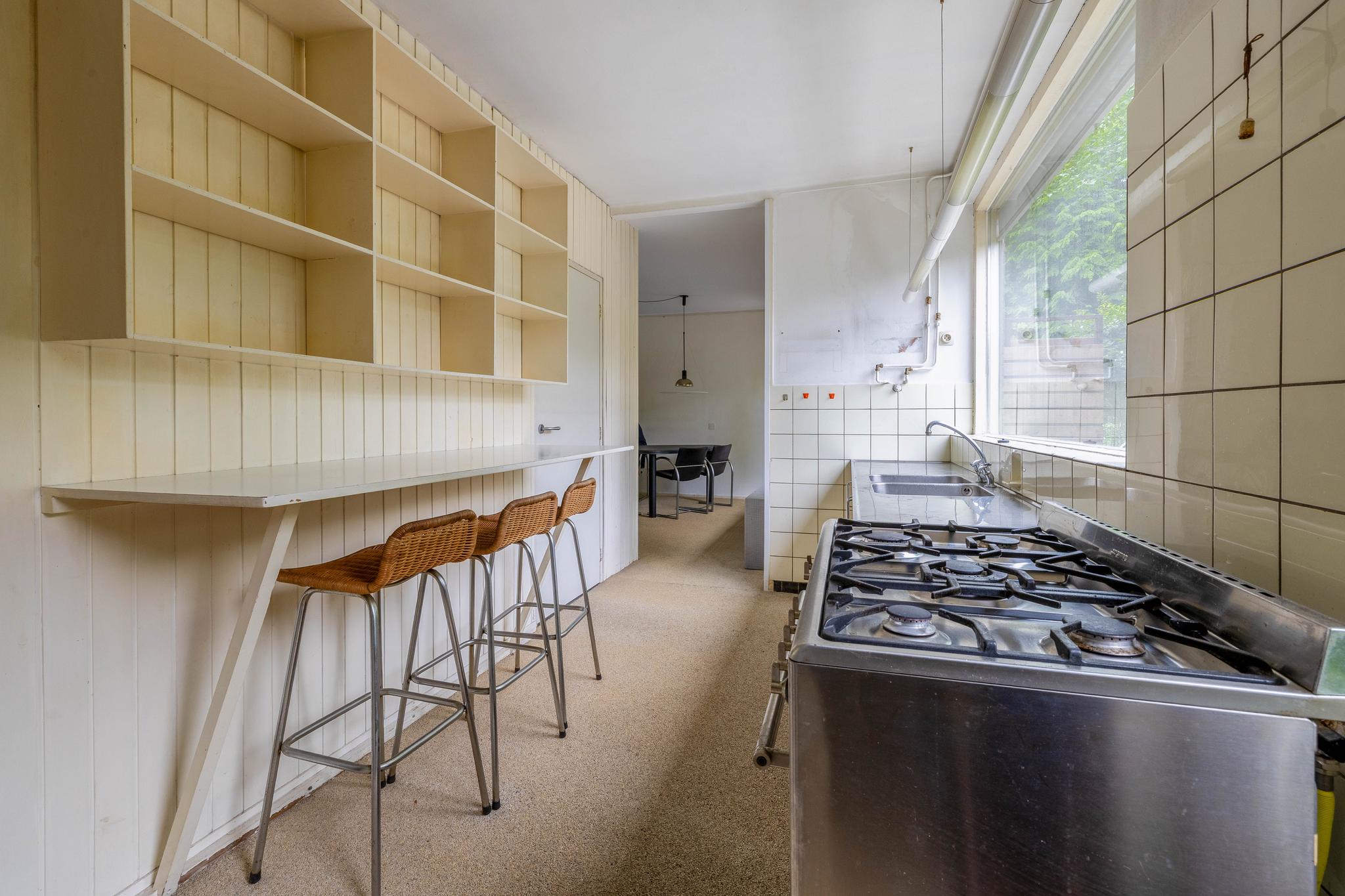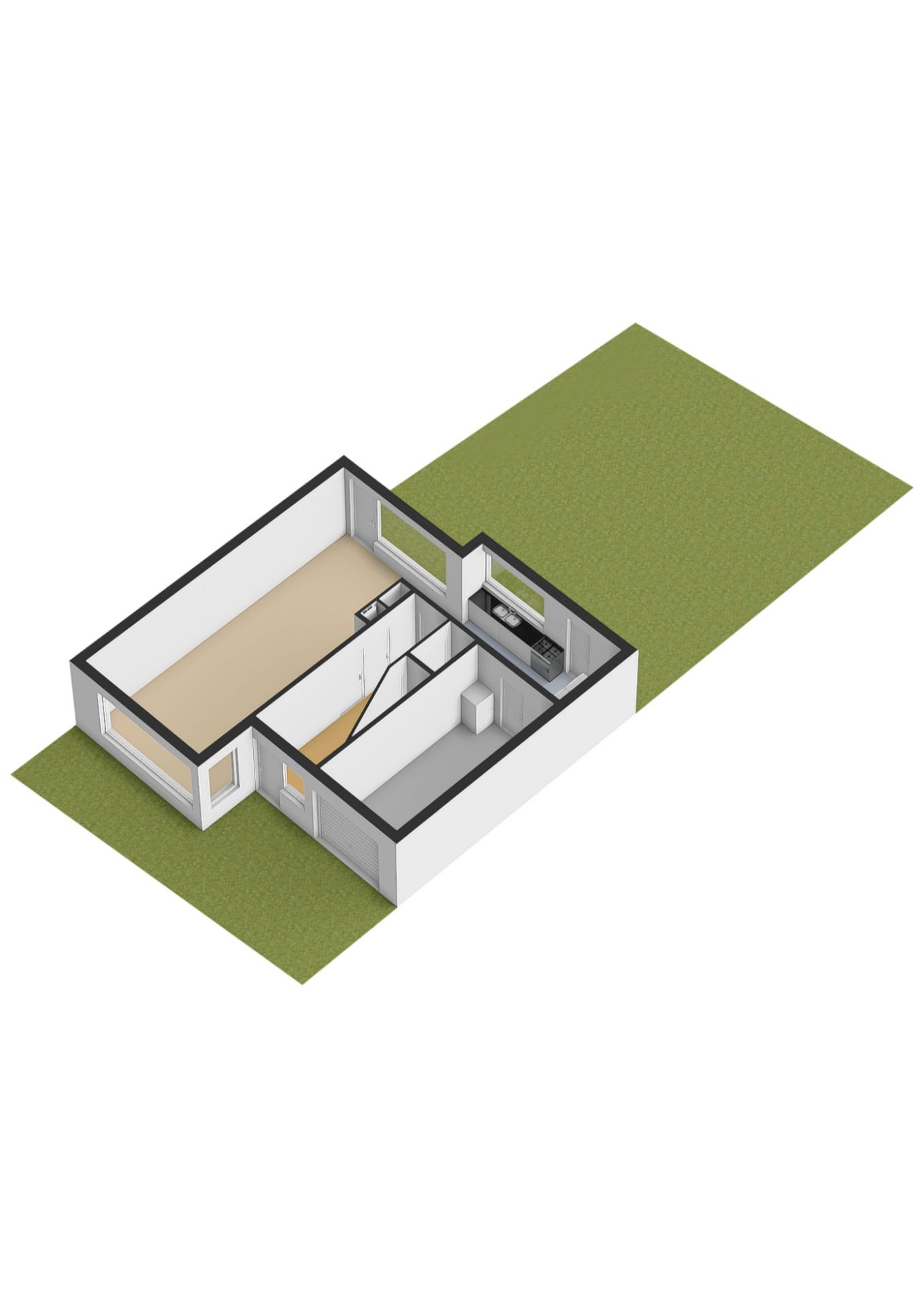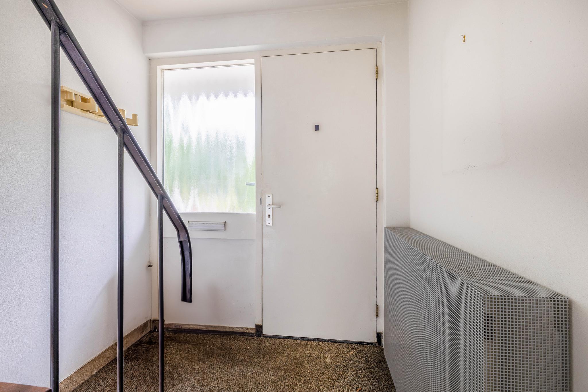 Begane grond: Overdekte entree; hal; verdiepte trapkast; toilet met fontein; meterkast; doorzonwoonkamer voorzien van dubbel glas met een deur naar de tuin, houten vloer en ondervloer en woongrind erboven; doorloop naar de eenvoudige keuken in rechte opstelling geplaatst en met een vrijstaand gasfornuis met oven 90 cm breed, wasmachine aansluiting, kast met c.v.-ketel (Nefit Topline HR uit 2008); aangebouwde/inpandige garage met garagedeur.