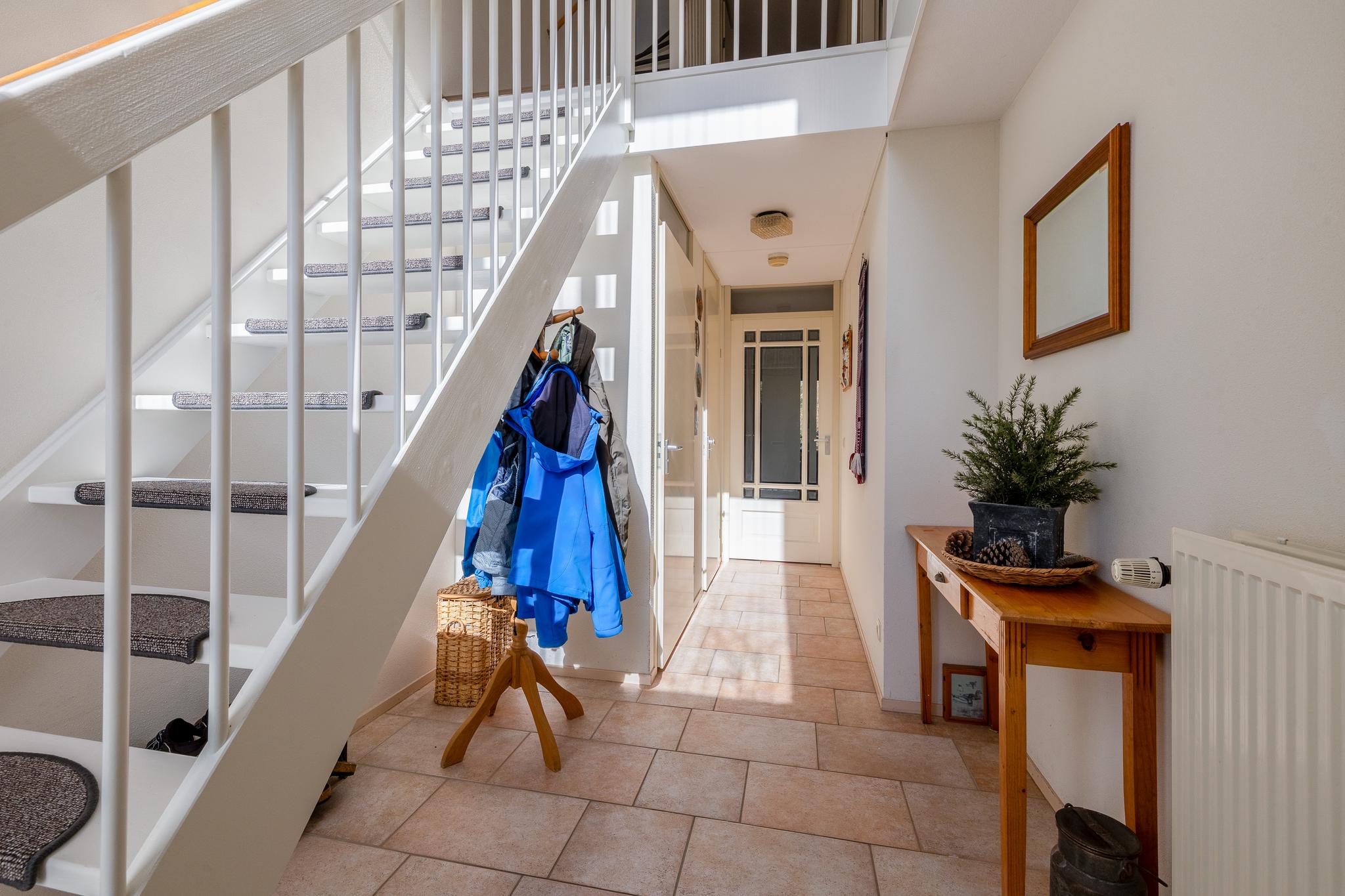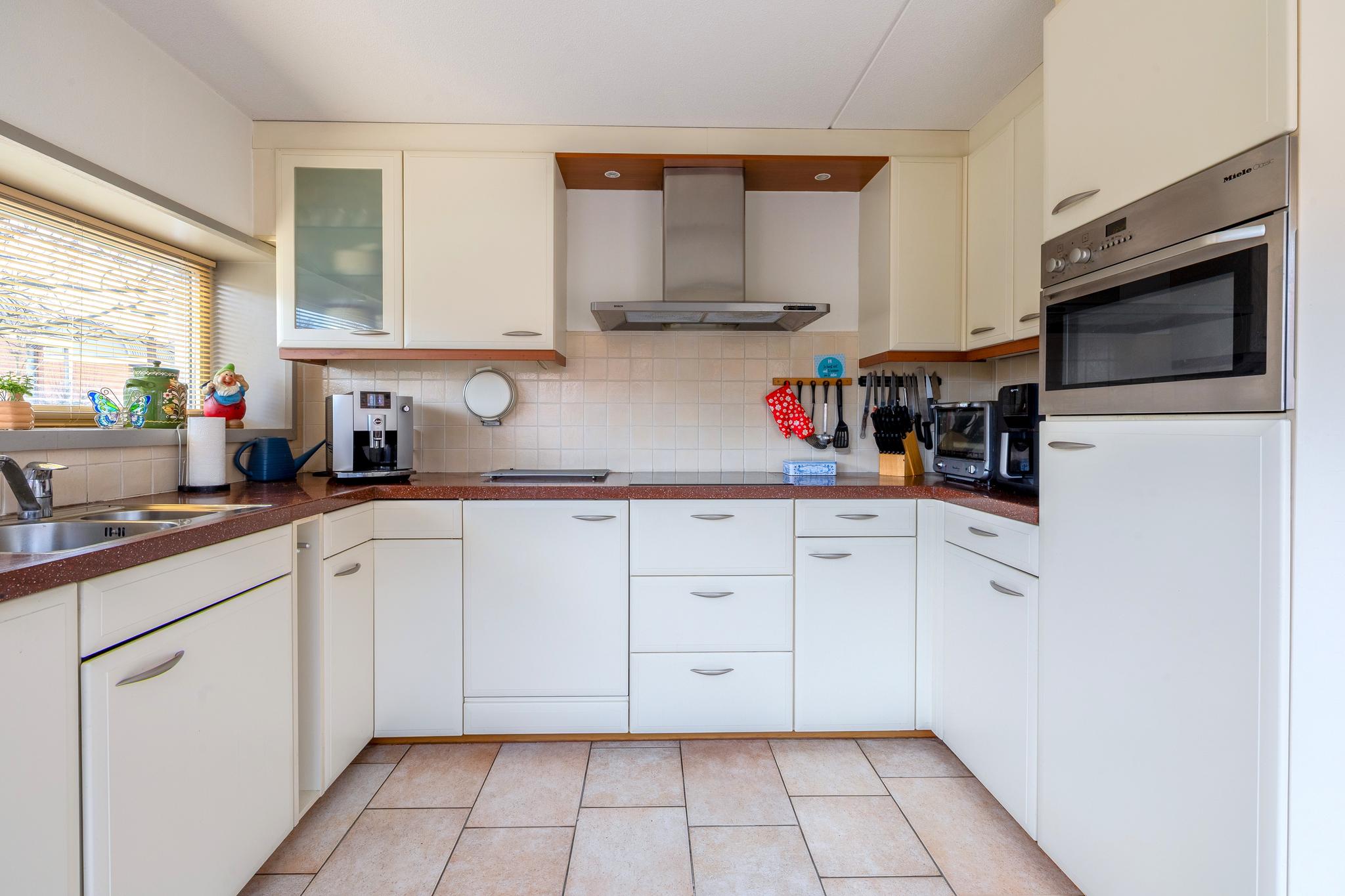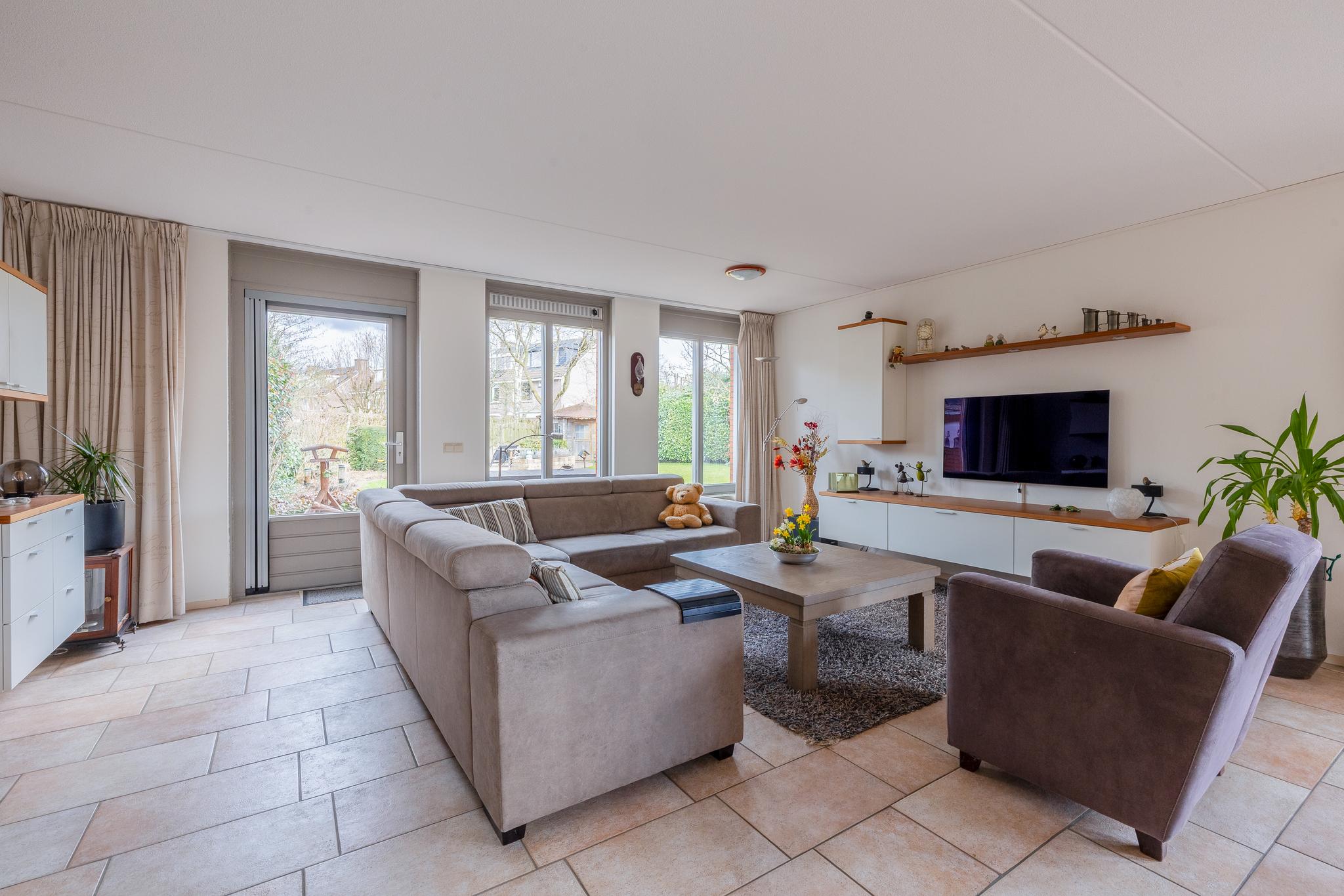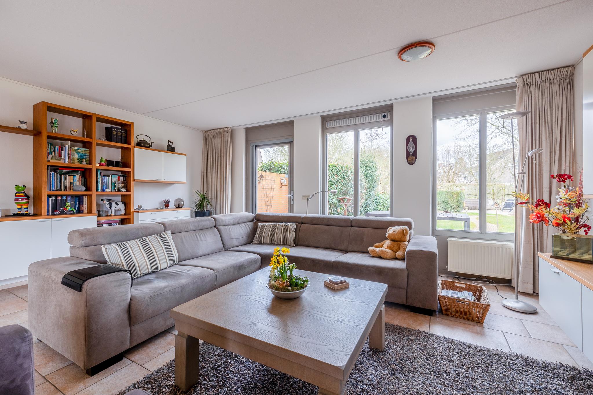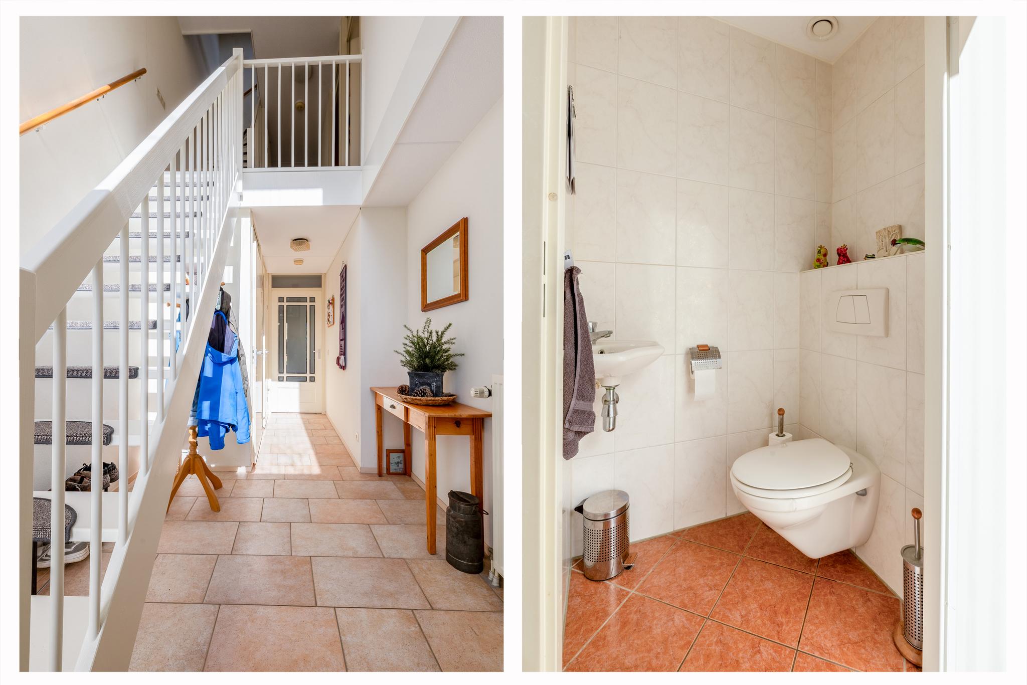 Entree, hal met meterkast en toiletruimte met hangend closet en hoekfontein. Vanuit de hal, met trapkast met de verdeler van de vloerverwarming, is de sfeervolle woonkamer bereikbaar. De openslaande dubbele deuren geven toegang tot de zij-ingang (zijtuin). De half open keuken bevindt zich aan de voorzijde is uitgevoerd in een lichte kleurstelling met L-vormige opstelling en voorzien van afwasmachine, close-in boiler, inductie kookplaat met afzuigkap, oven, magnetron, vriezer, koelkast en granieten aanrechtblad.
