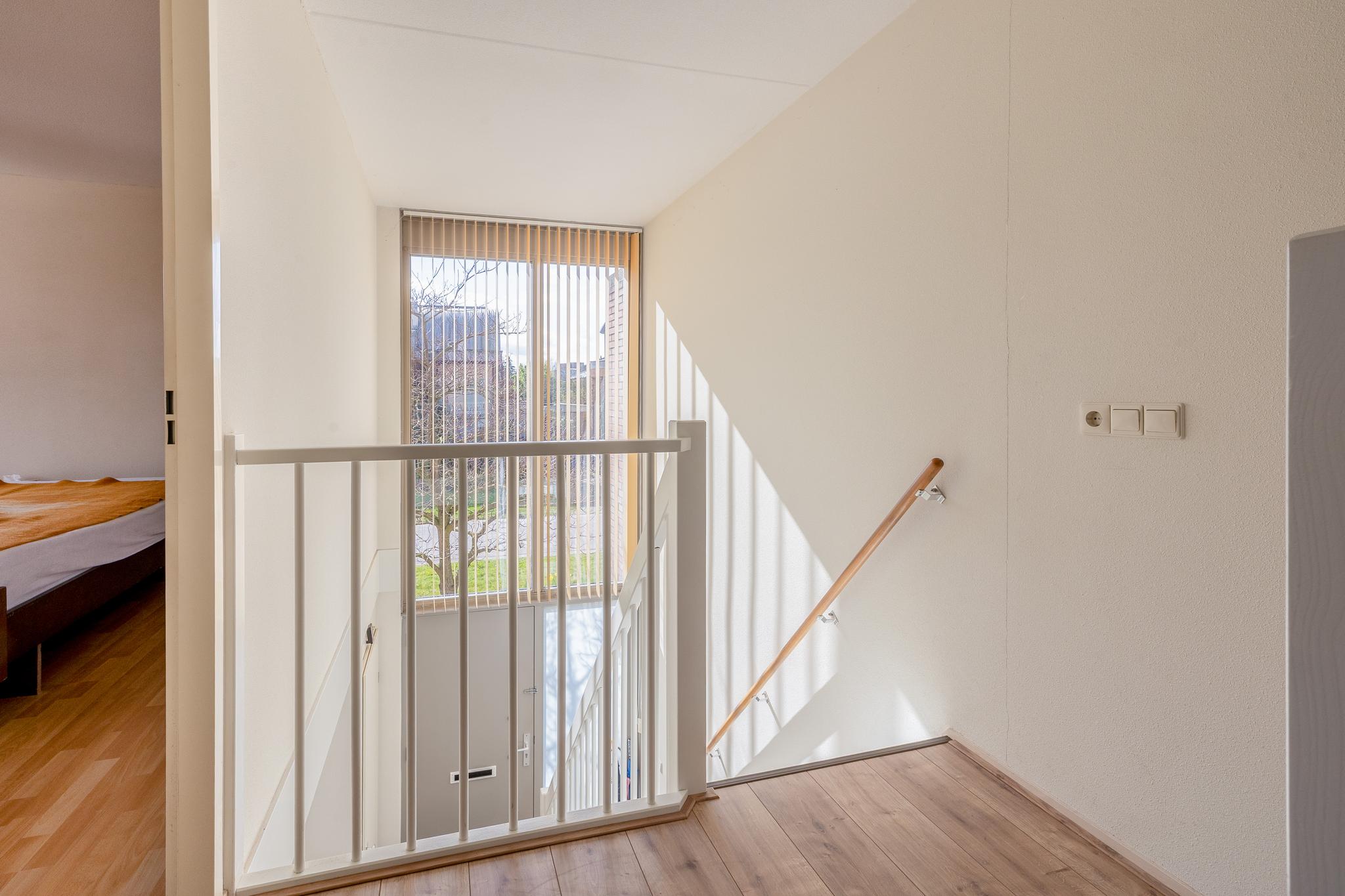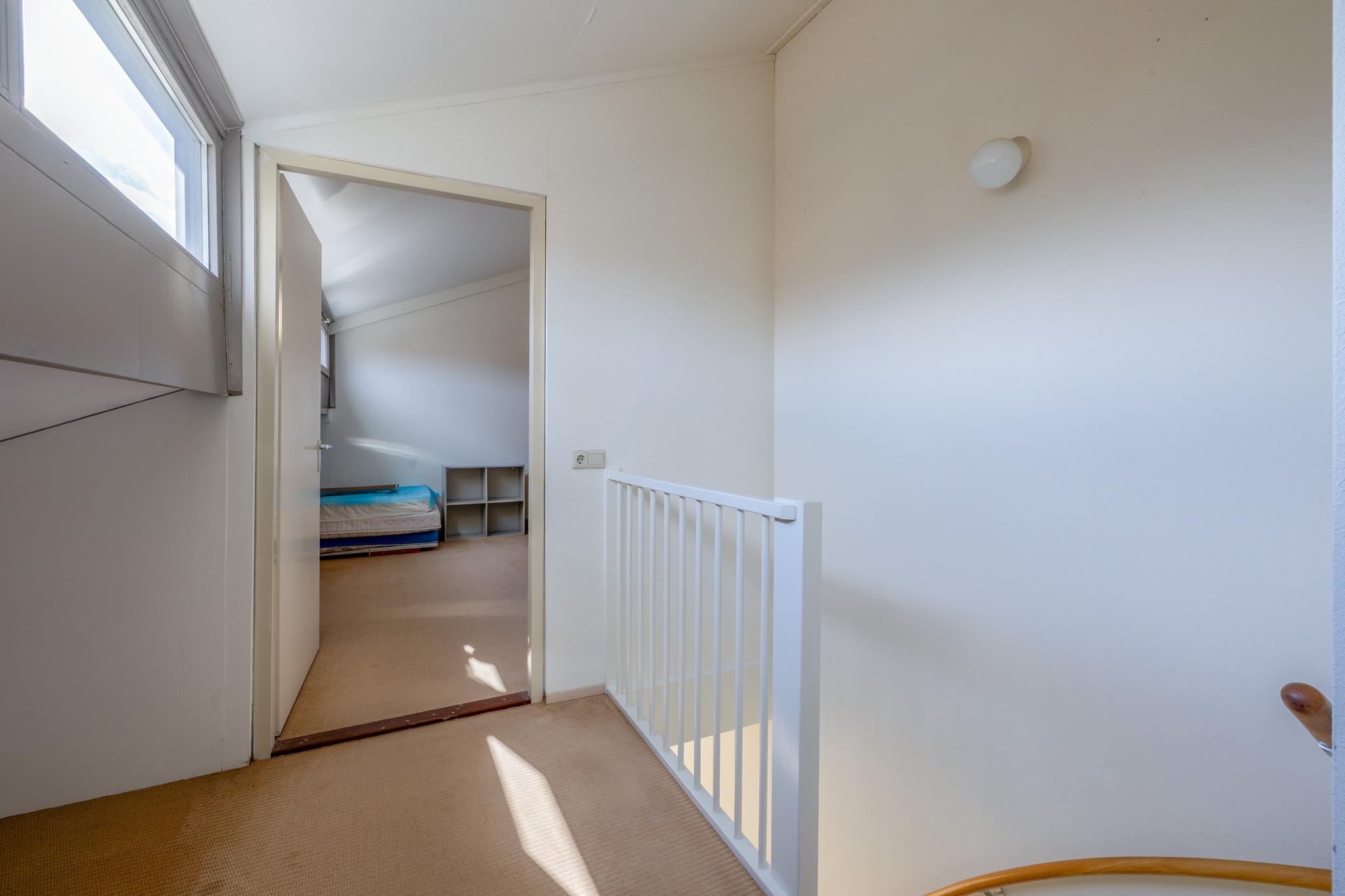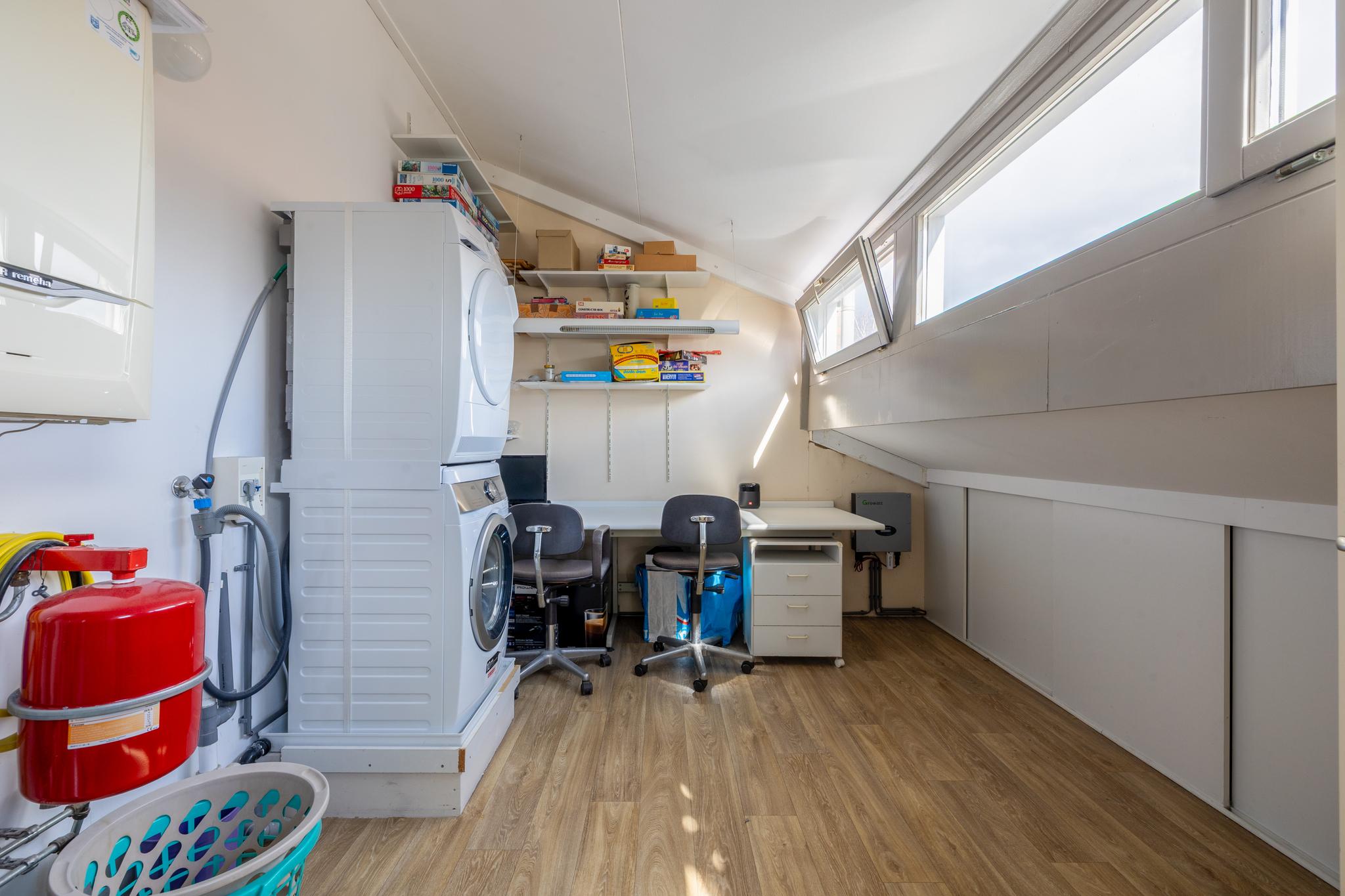 Overloop met ramen en opbergruimte, slaapkamer met opbergruimte; wasruimte met aansluitingen voor de wasapparatuur; slaapkamer met opstelling van de C.V. ketel en omvormer voor de zonnepanelen.