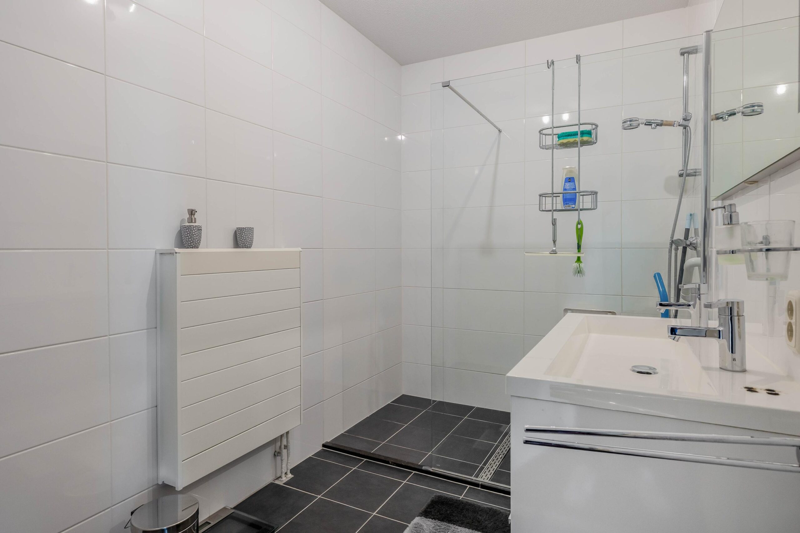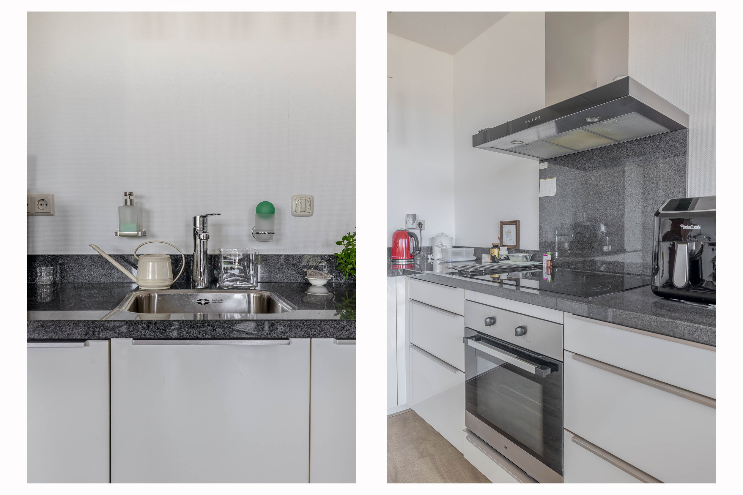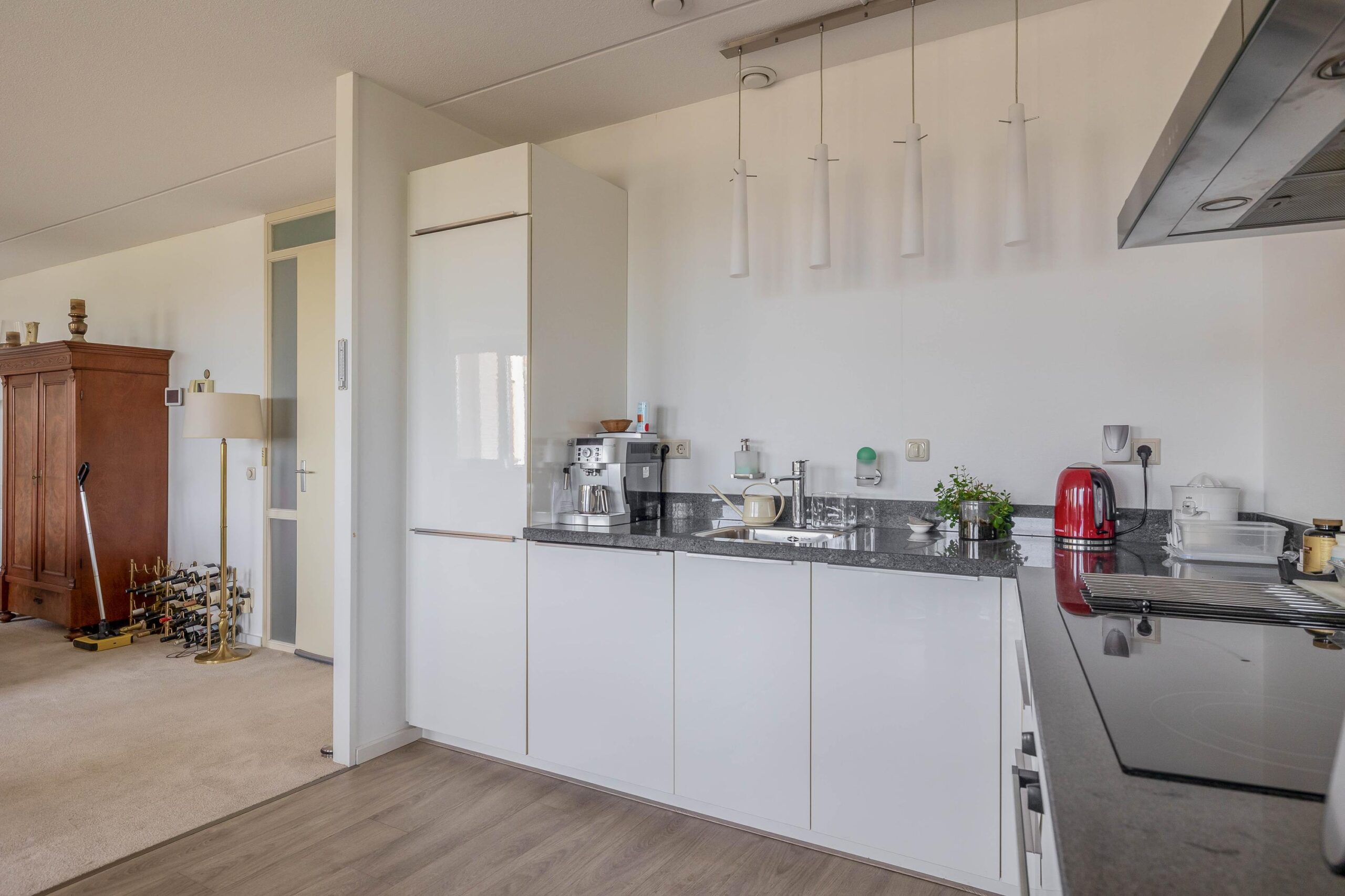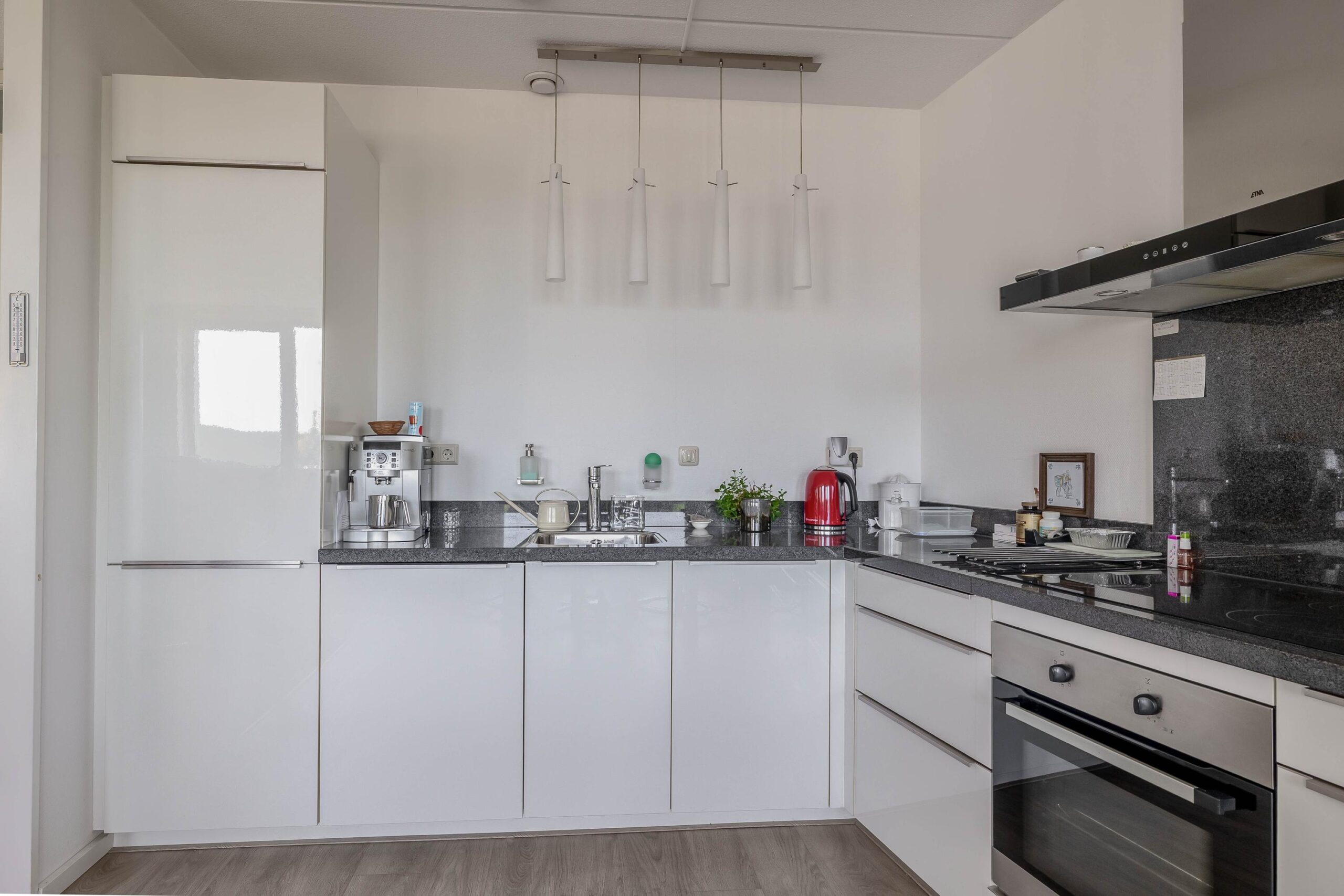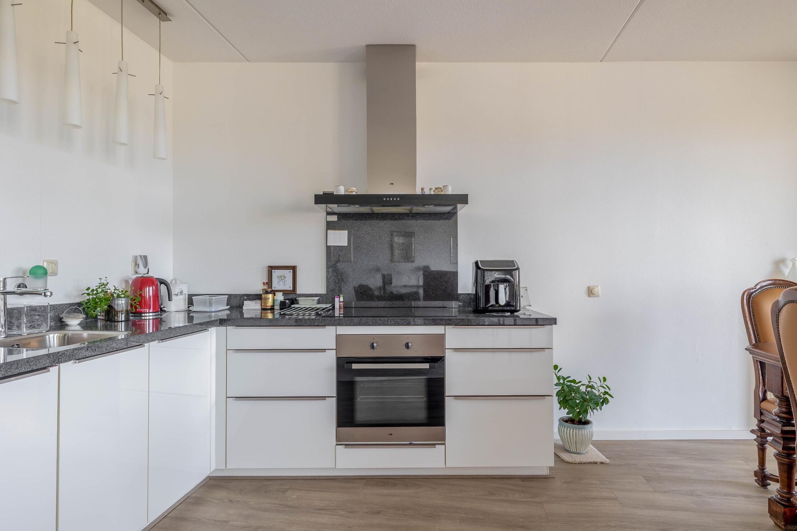 cv-ketel Intergas HR; badkamer tot plafond betegeld en uitgerust met wastafelmeubel, design radiator en inloopdouche met glazenwand en drain; separaat wandcloset tot de helft betegeld met fontein; lichte open keuken in L-opstelling geplaatst voorzien van diverse inbouwapparatuur, t.w. vaatwasser, inductie kookplaat, RVS afzuigschouw, granieten aanrechtblad, koelkast, vriezer en oven; royale woonkamer met dubbele deuren naar het overdekte balkon.