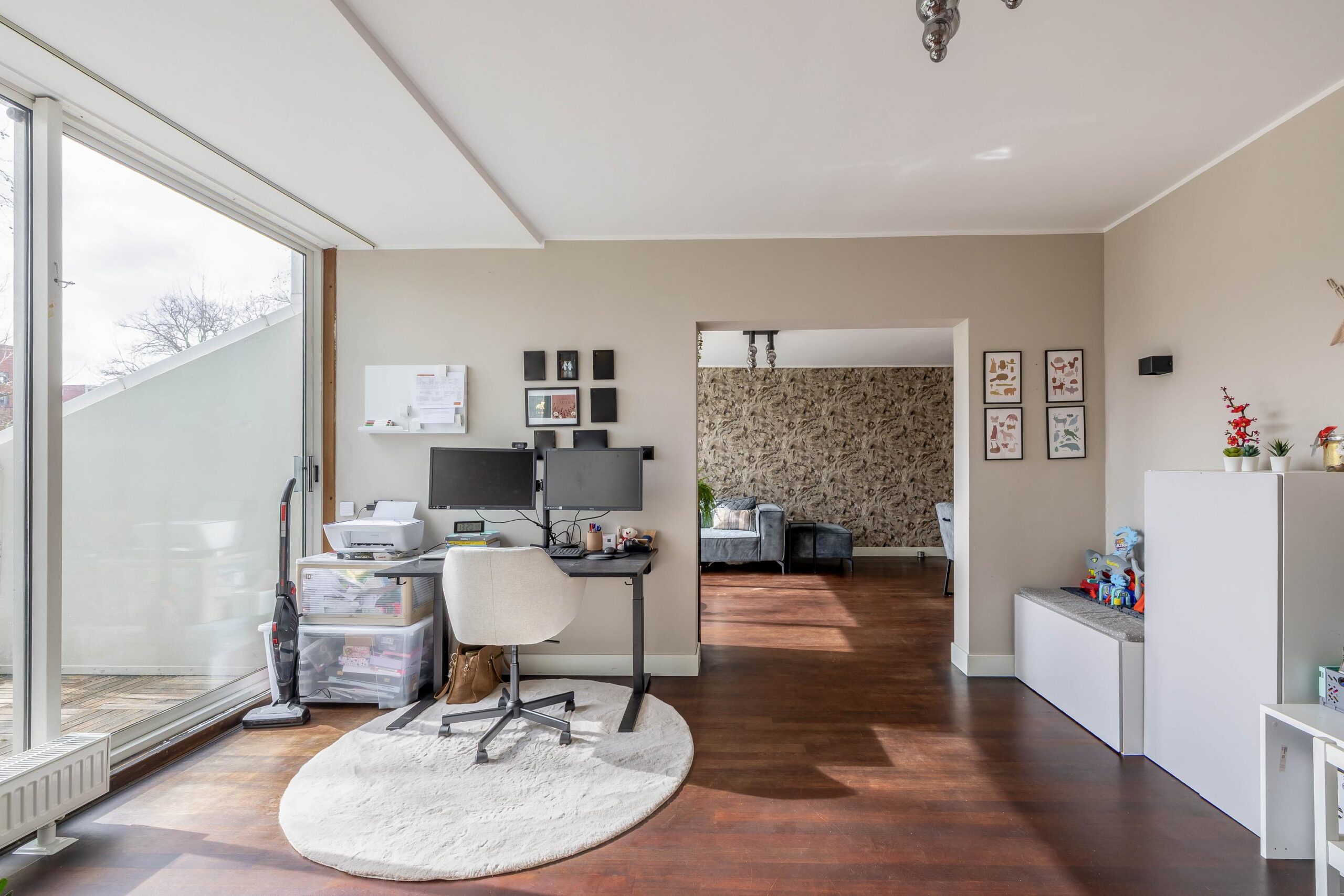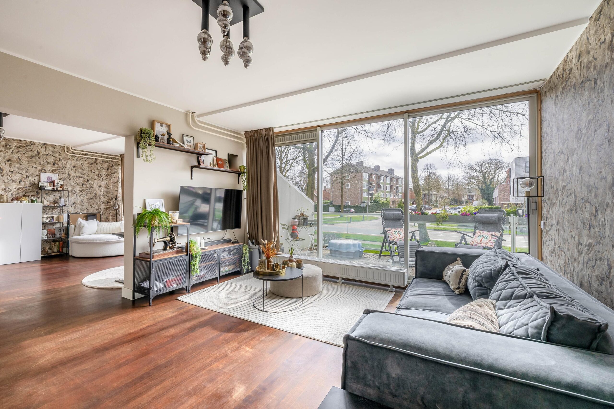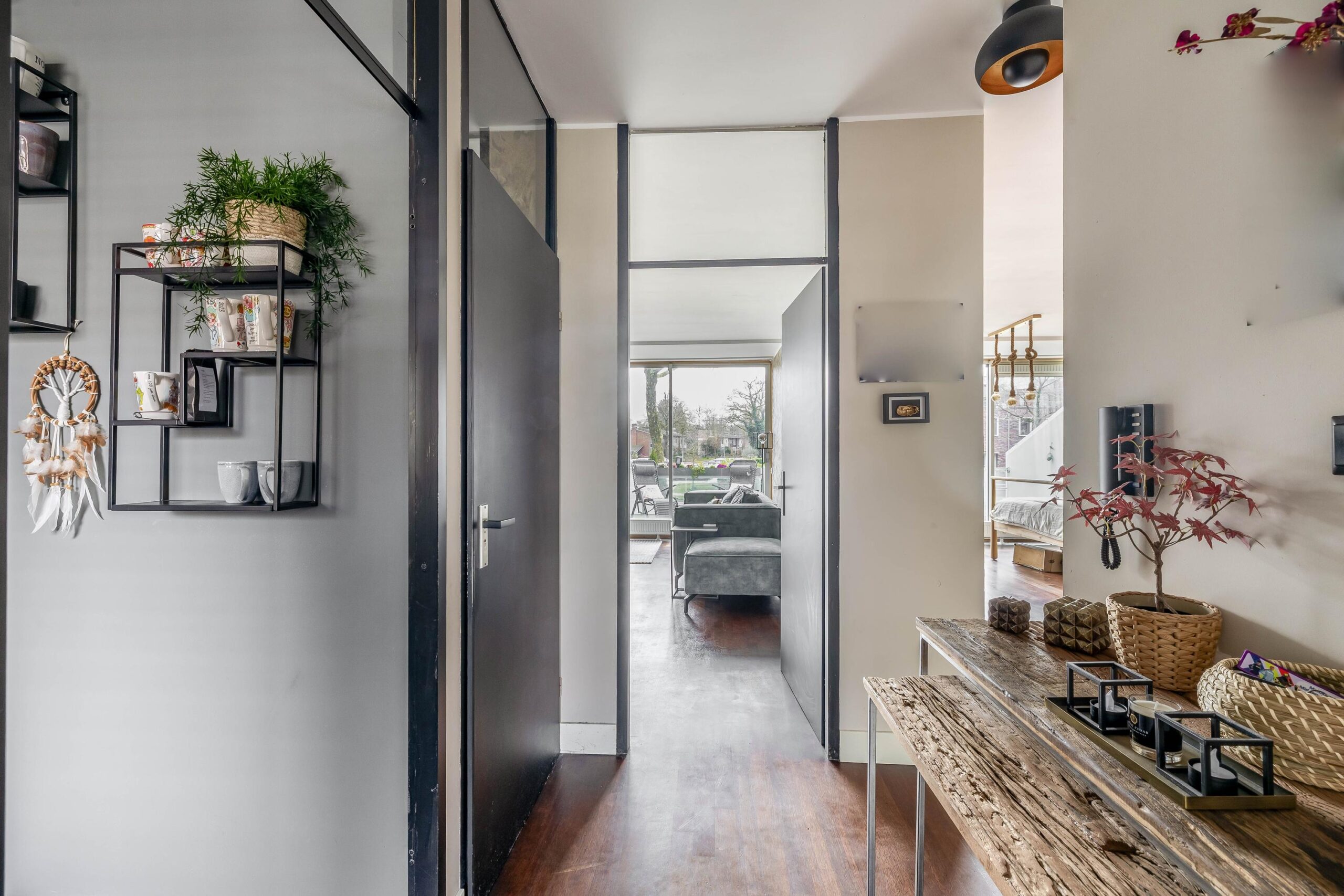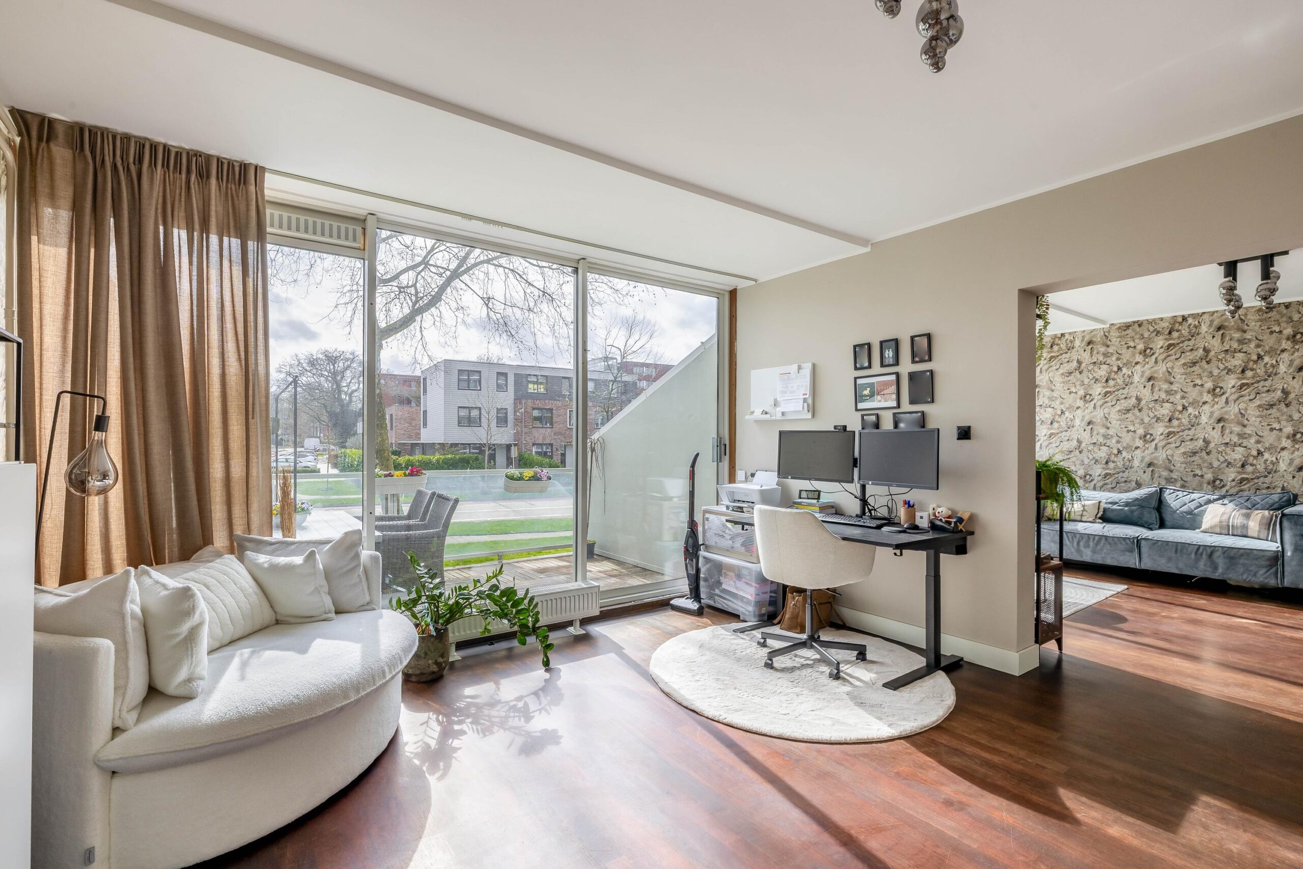 Entree; hal; meterkast; toiletruimte met hangend closet; dichte keuken (2017) met inbouwkast in rechte opstelling en voorzien van gas op glas, vaatwasser, koelkast, vriezer en combi-oven; slaapkamer I; slaapkamer II; slaapkamer III met open badkamer (2023) en voorzien van aansluiting was-apparatuur, wastafelmeubel, douchecabine met stortdouche en schuifpui naar terras (zuiden); woonkamer met schuifpui naar terras; doorloop naar aparte werkkamer met schuifpui naar terras.