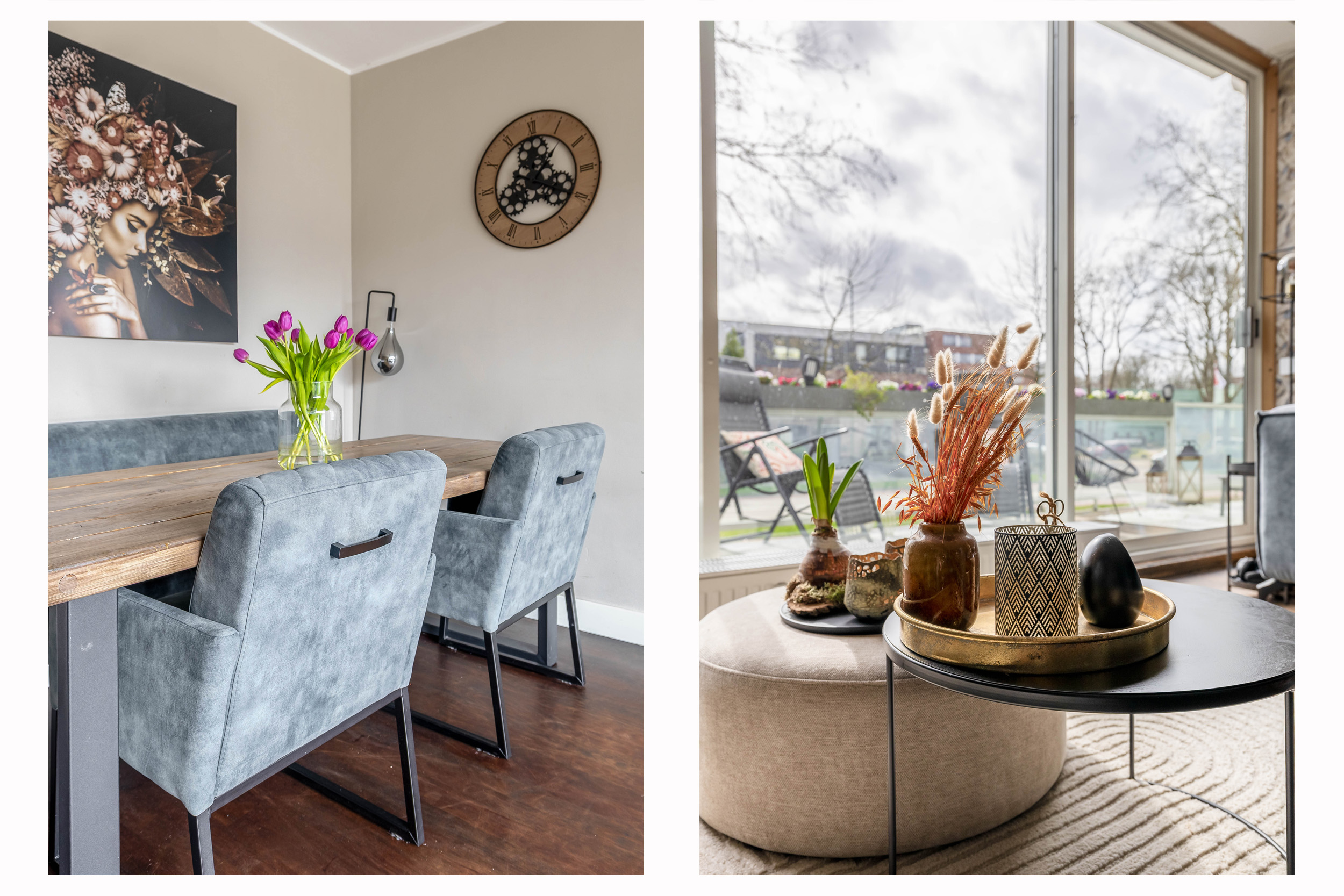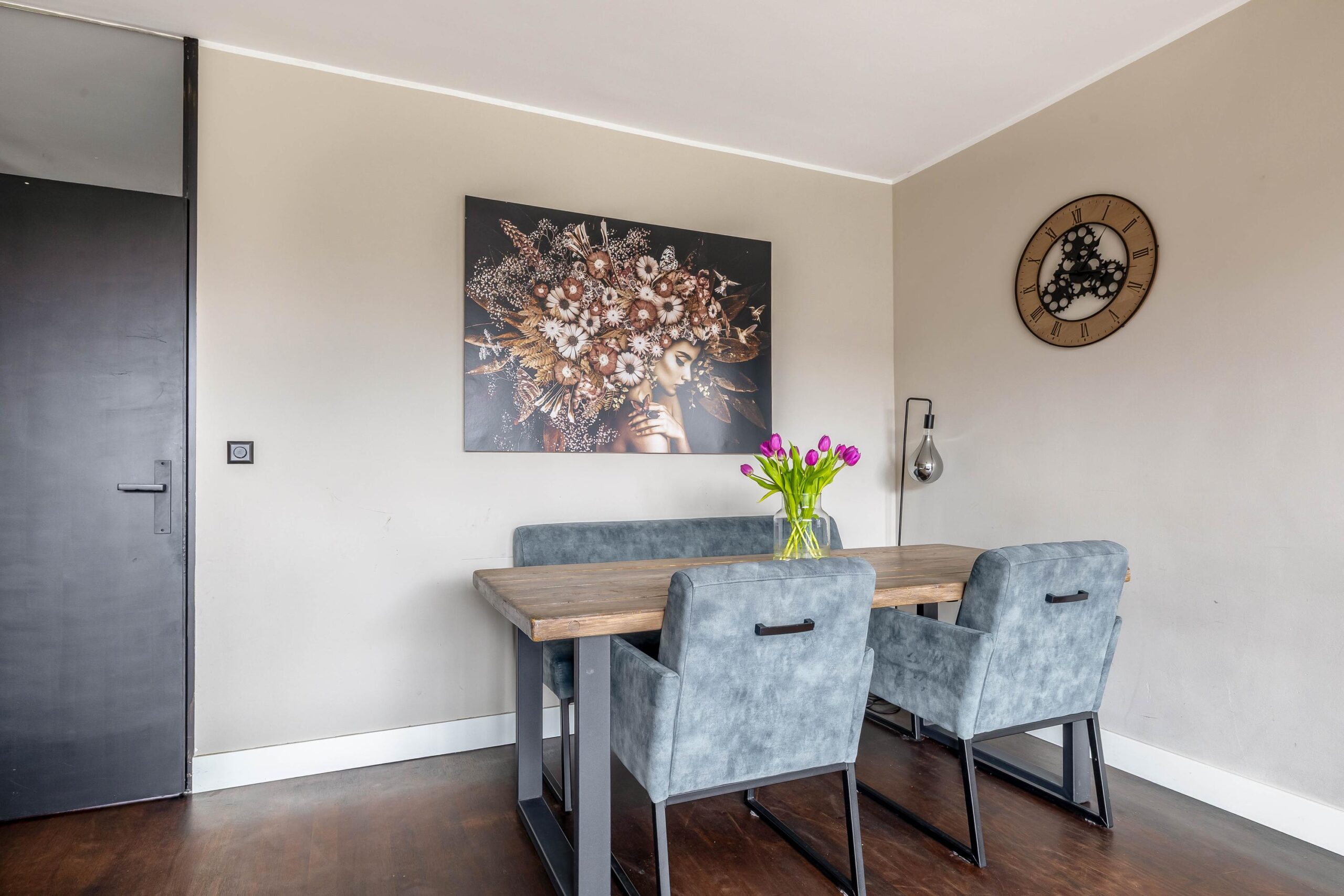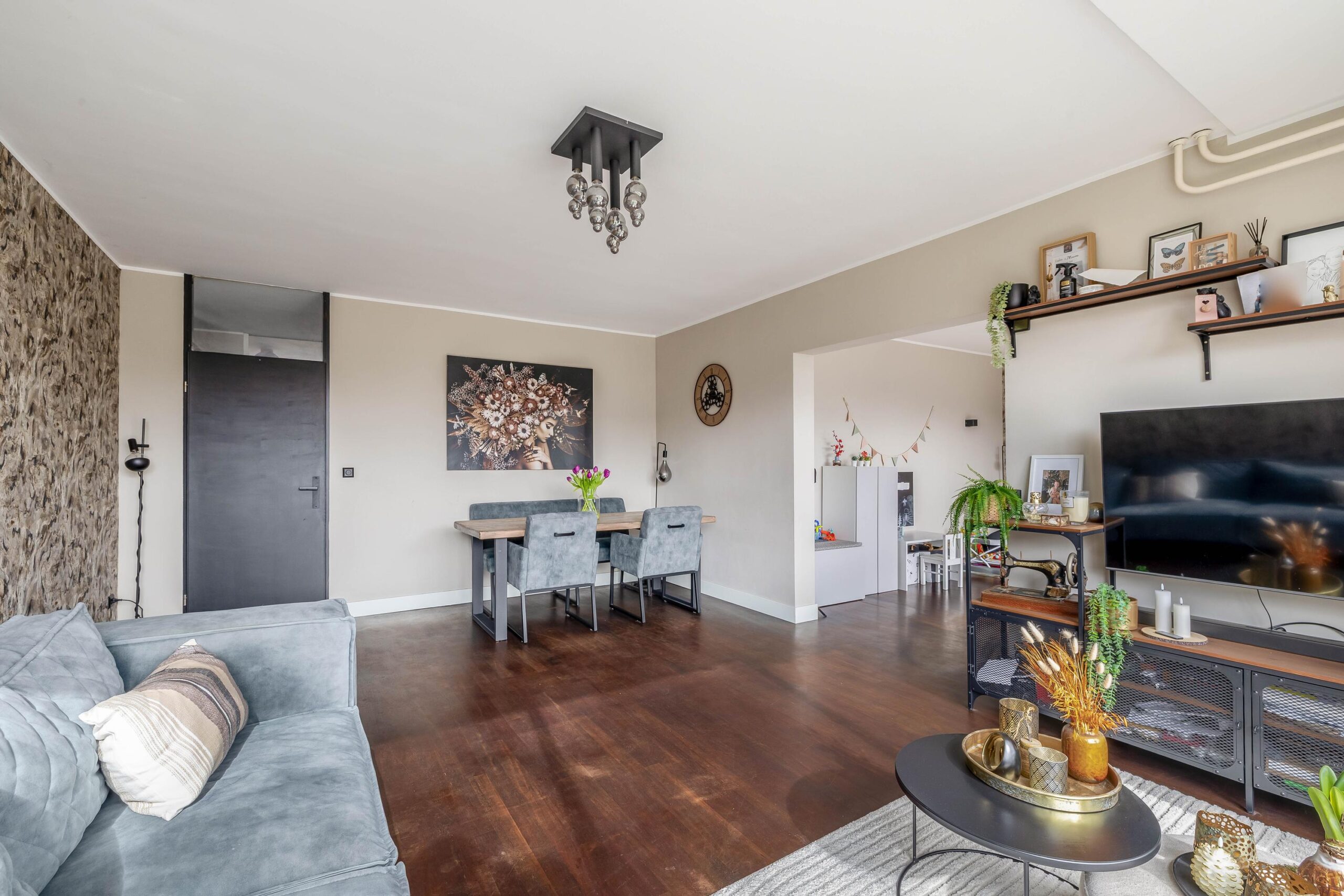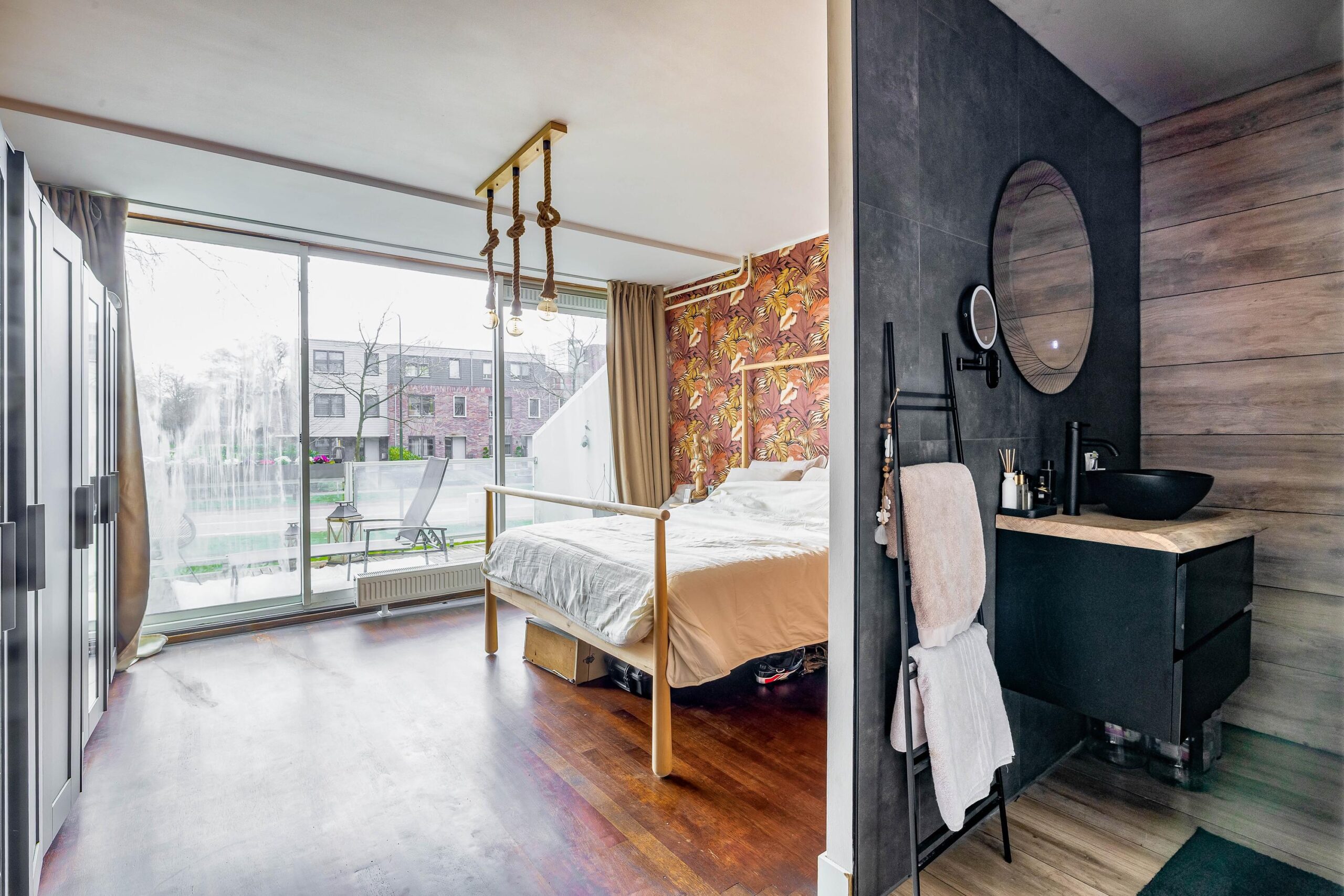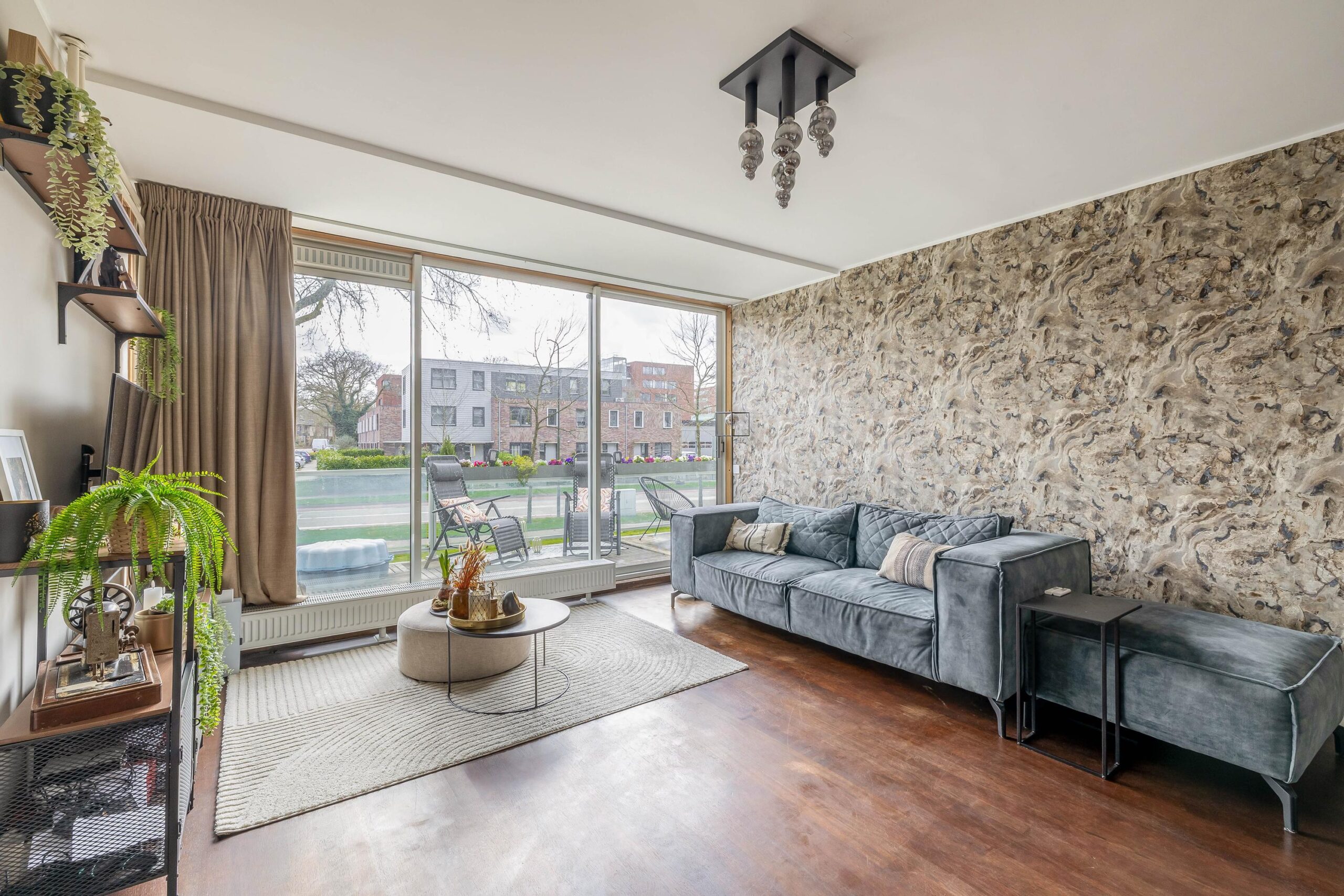 Entree; hal; meterkast; toiletruimte met hangend closet; dichte keuken (2017) met inbouwkast in rechte opstelling en voorzien van gas op glas, vaatwasser, koelkast, vriezer en combi-oven; slaapkamer I; slaapkamer II; slaapkamer III met open badkamer (2023) en voorzien van aansluiting was-apparatuur, wastafelmeubel, douchecabine met stortdouche en schuifpui naar terras (zuiden); woonkamer met schuifpui naar terras; doorloop naar aparte werkkamer met schuifpui naar terras.
