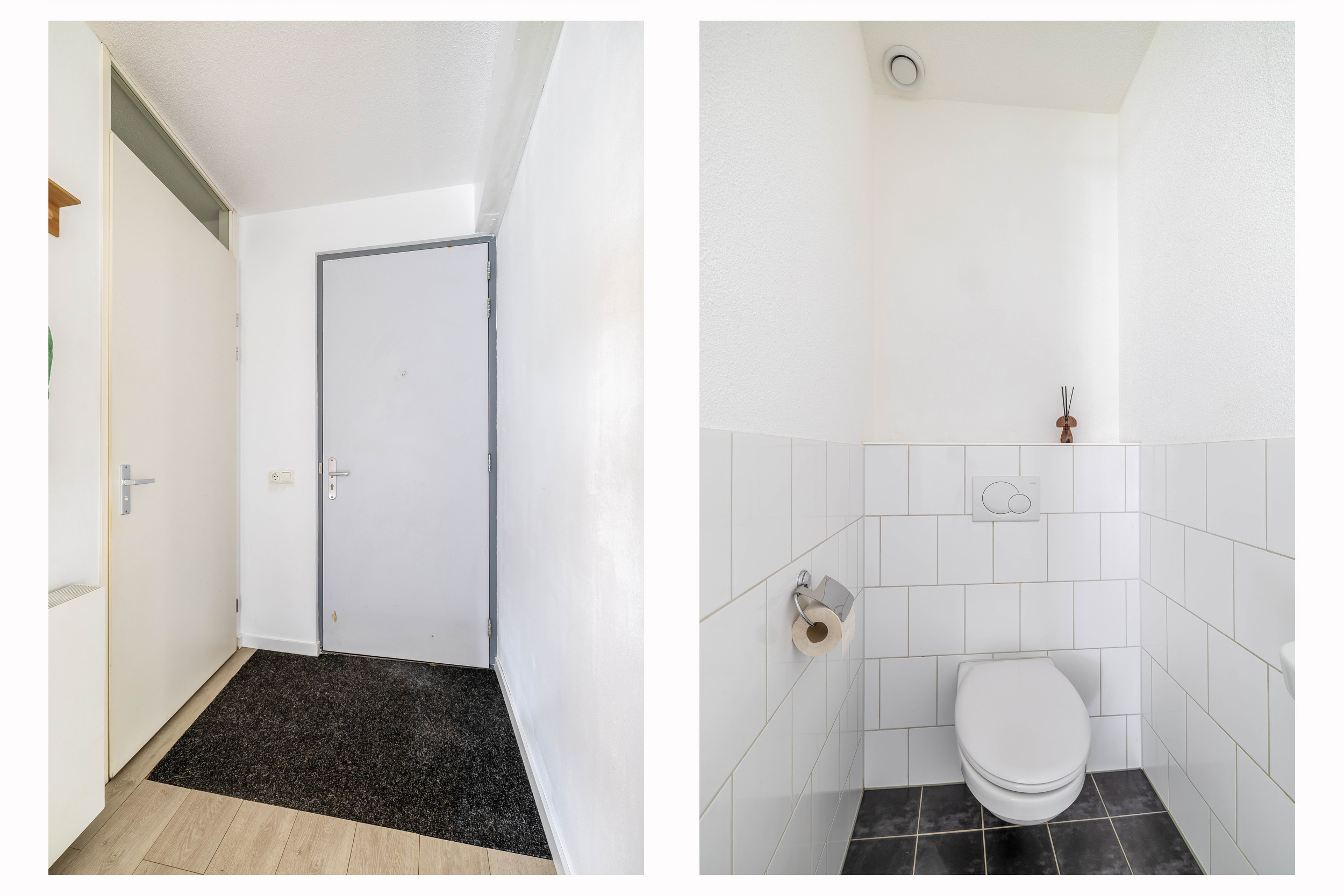 Entree, ruime hal met meterkast, wandcloset met fontein tot de helft betegeld, berging met opstelling voor