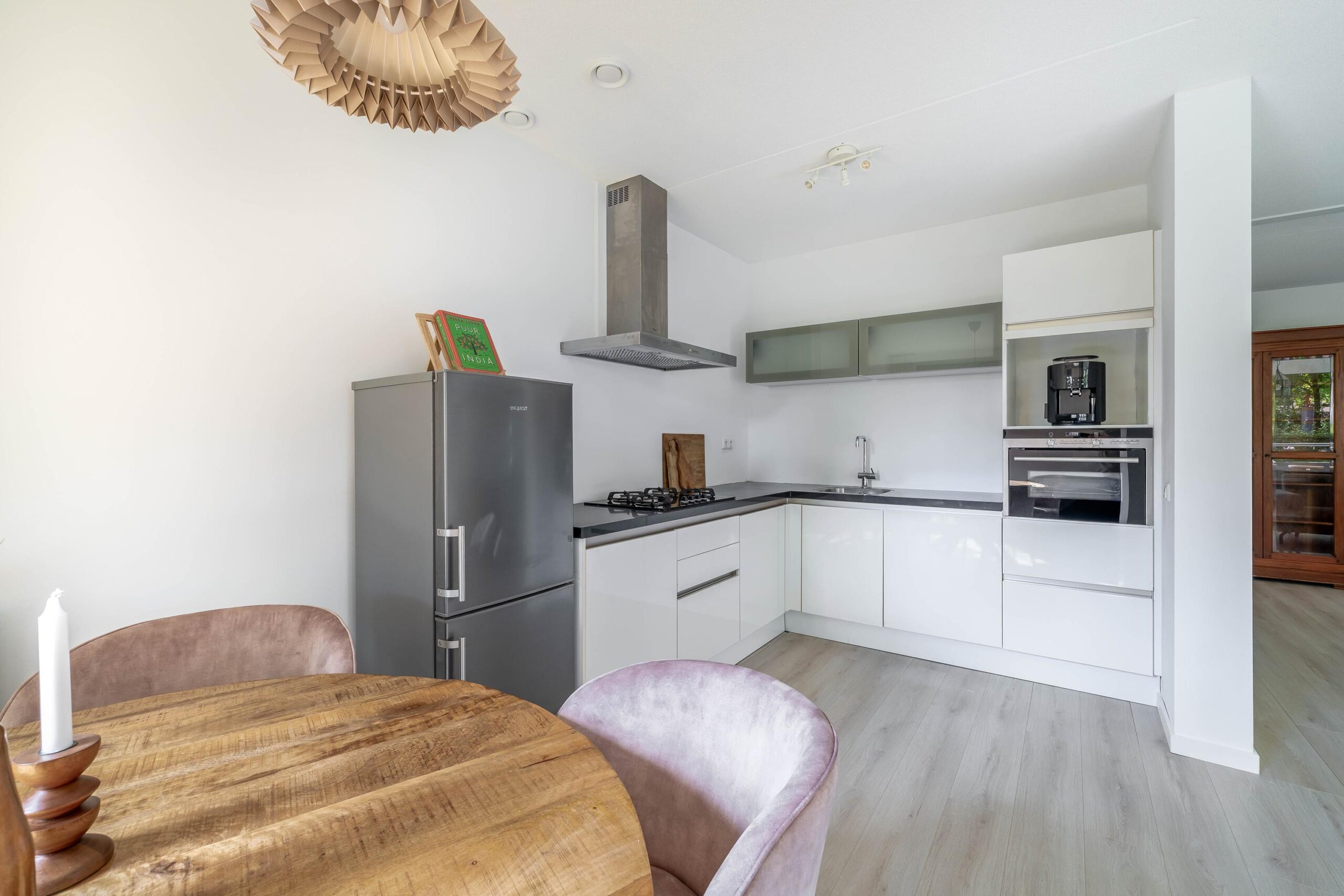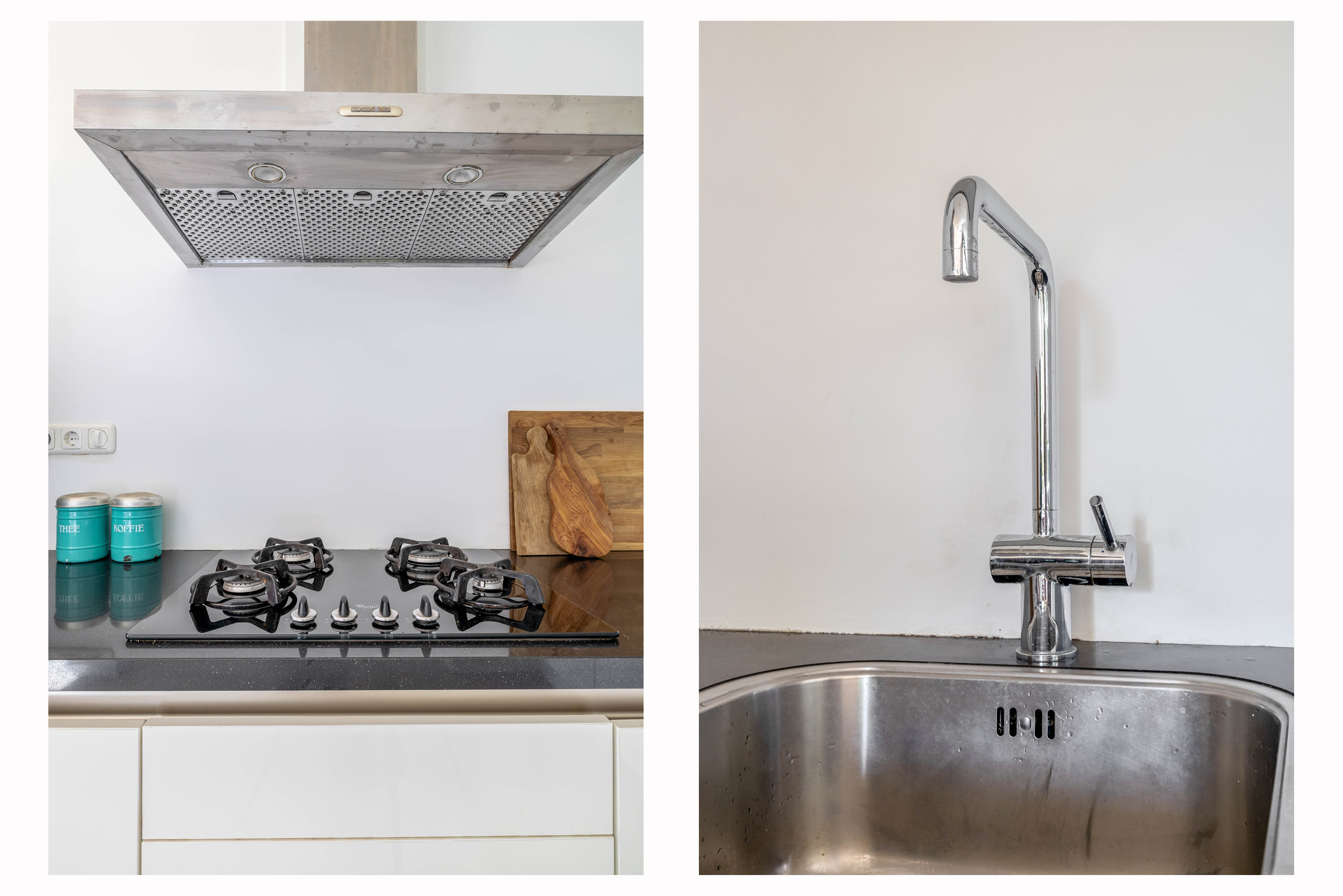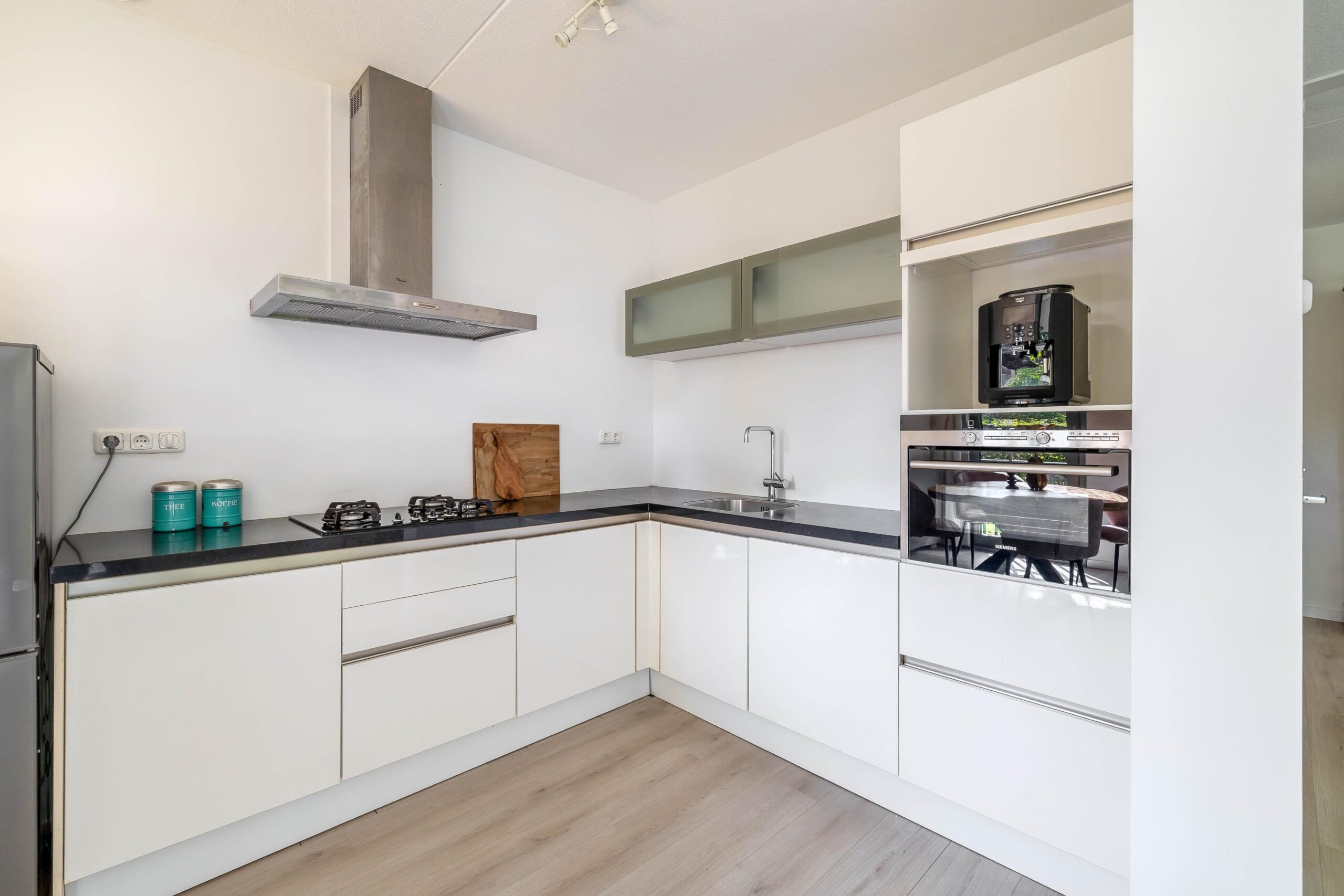 open keuken in L-opstelling uitgevoerd in een licht kleurstelling met Frans balkon en voorzien van diverse inbouwapparatuur, t.w., 4 pits-gasfornuis met afzuigkap, combi-oven en vaatwasser. Een deur bij de eethoek biedt toegang tot het balkon, twee slaapkamers met Frans balkon en vrij uitzicht;
