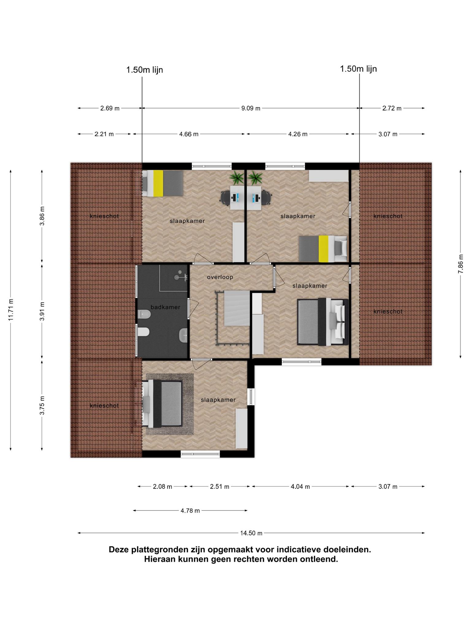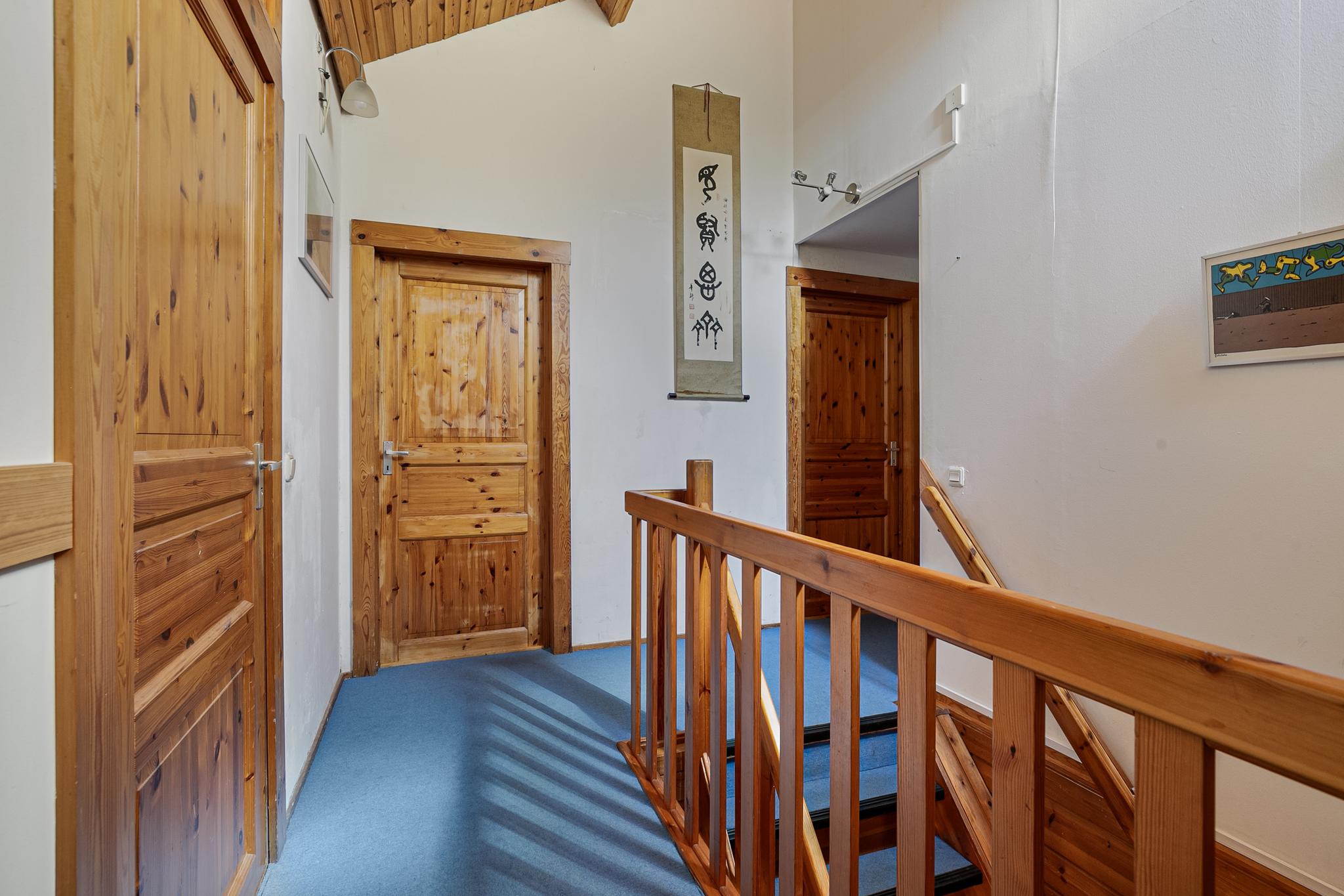 1e verdieping: overloop met opslagruimte; slaapkamer II met hoog plafond en opbergruimte; slaapkamer III met hoog plafond en opbergruimte; slaapkamer IV met hoog plafond en opbergruimte; badkamer II met dakkapel (vernieuwd in 2021) en voorzien van inloopdouche met drain en glazenwand, bidet, wandtoilet en wastafelmeubel; slaapkamer V met een hoog plafond en opbergruimte.