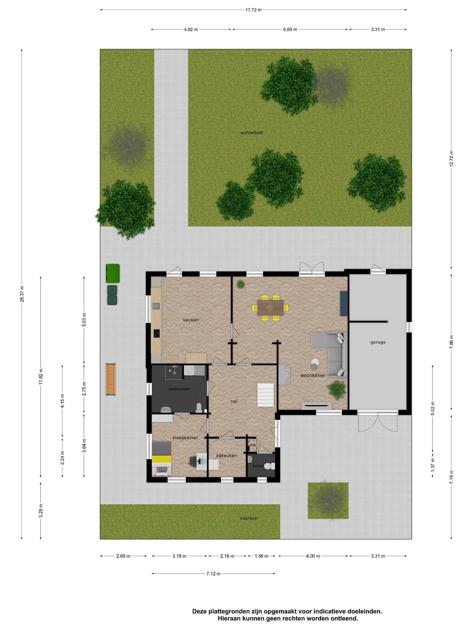 Begane grond: overdekte entree; ruime hal; toilet met fontein en raam; meterkast; bijkeuken met raam; slaapkamer I/werkkamer met aangrenzend badkamer I met raam en voorzien van wastafelmeubel, toilet en toilet; woon- en eetkeuken in rechte opstelling geplaatst en voorzien van een vaatwasser, inductie kookplaat met afzuigkap, oven en combimagnetron; vanuit de woon-/eetkeuken is de besloten tuin te bereiken; opslagplek voor de C.V.-ketel; woonkamer in L-vorm met een open haard en dubbele deuren naar buiten.