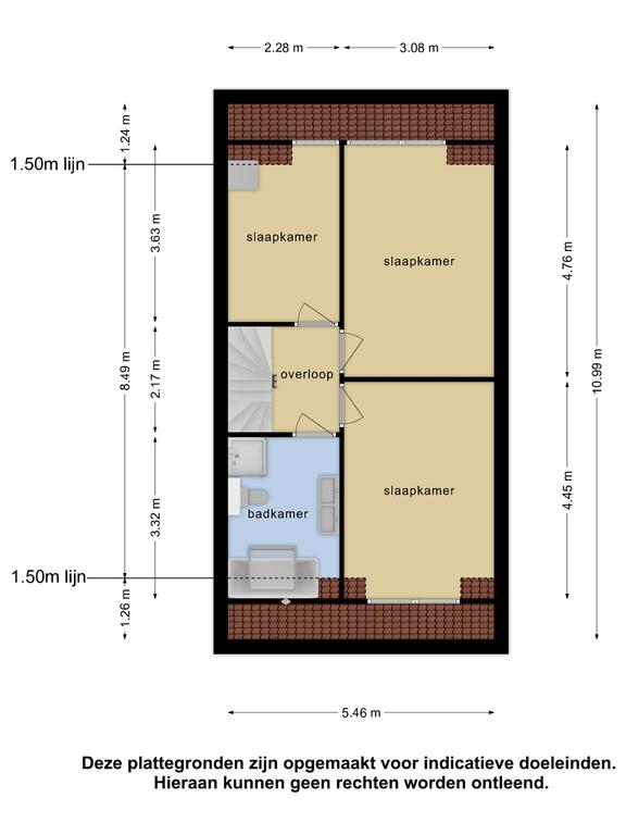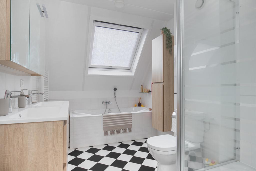 1e verdieping: overloop; slaapkamer I met dakkapel; slaapkamer II met dakkapel; slaapkamer III met dakkapel; badkamer v.v. Velux dakraam, ligbad, douchecabine, toilet, dubbele wastafelmeubel en design radiator.