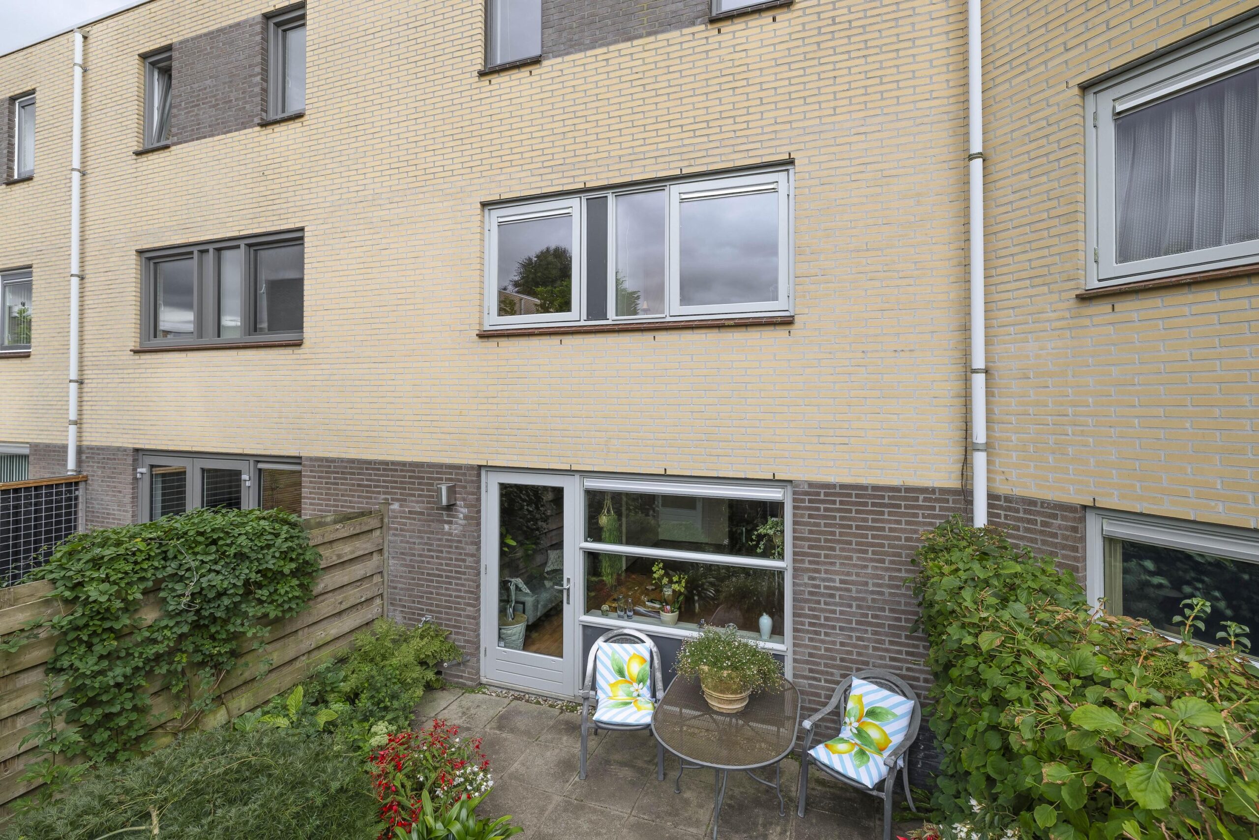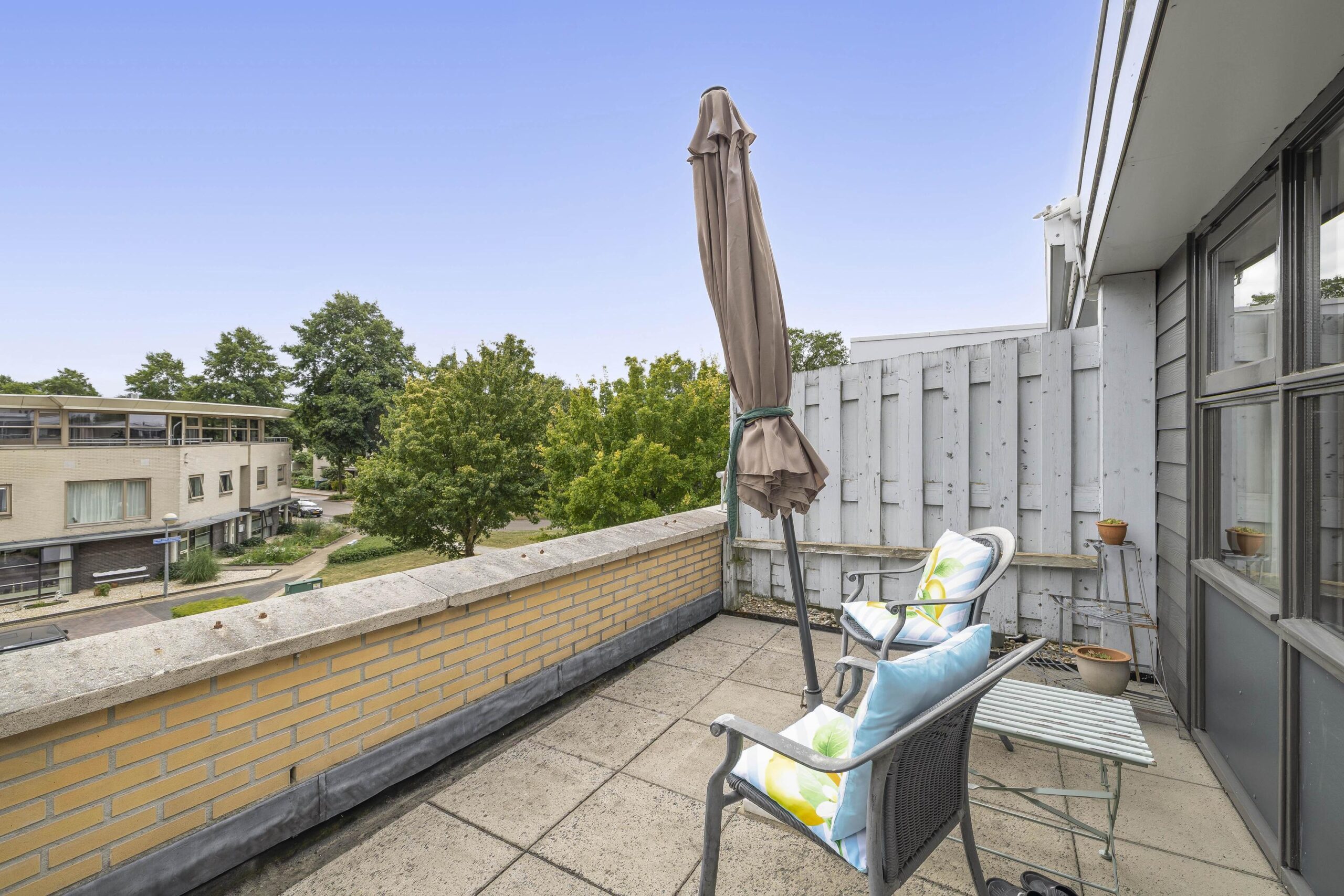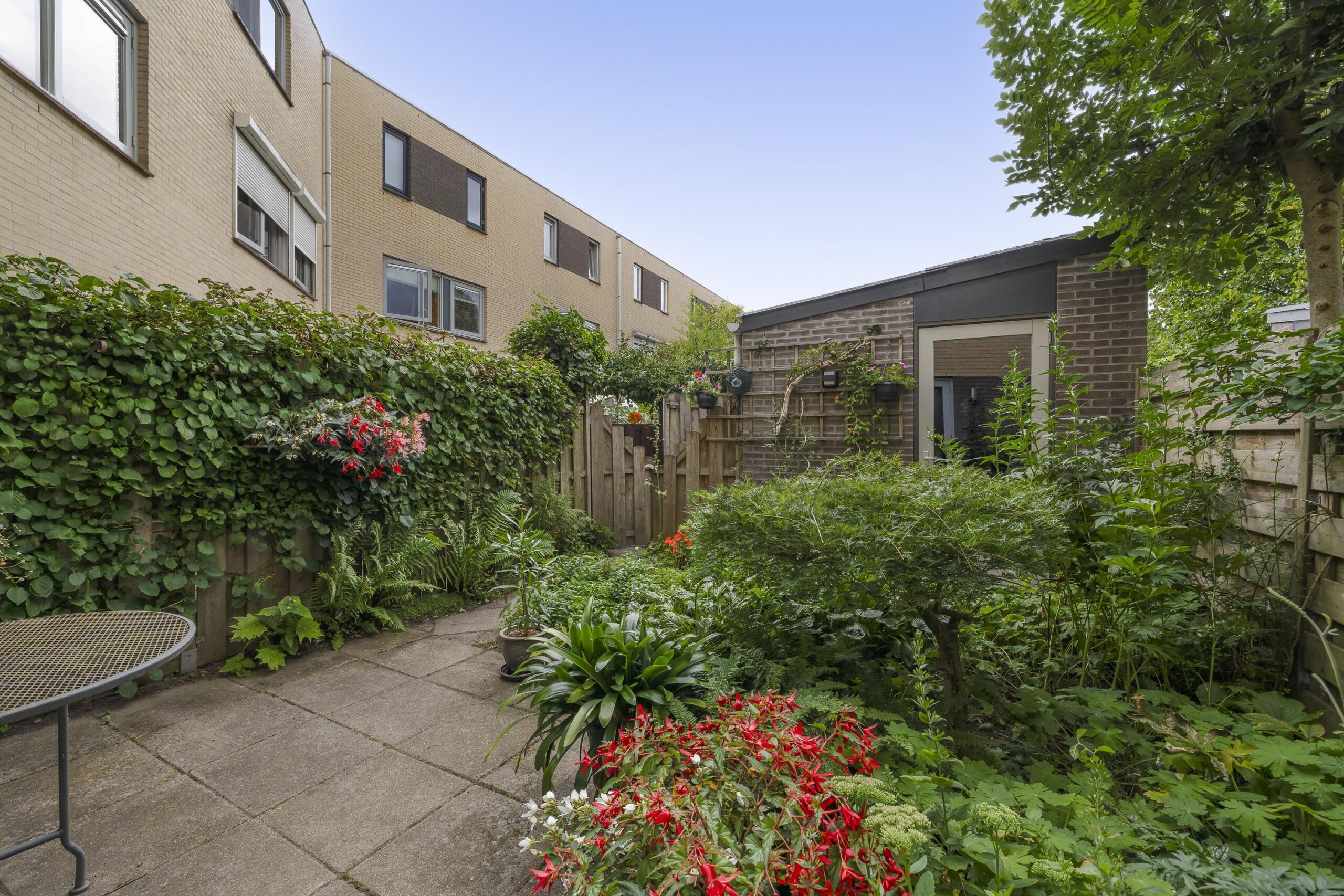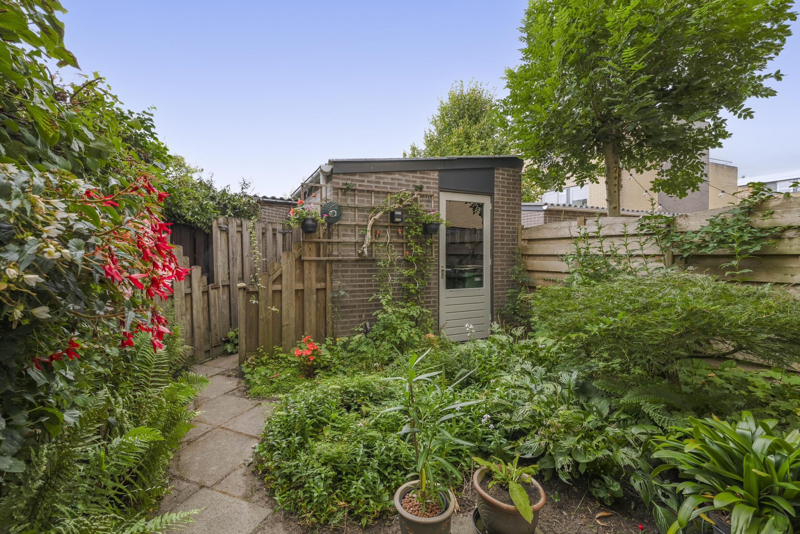 – Achtertuin gelegen op het noodwesten met een vrijstaande stenen berging en dakterras gelegen op het zuidoosten zodat