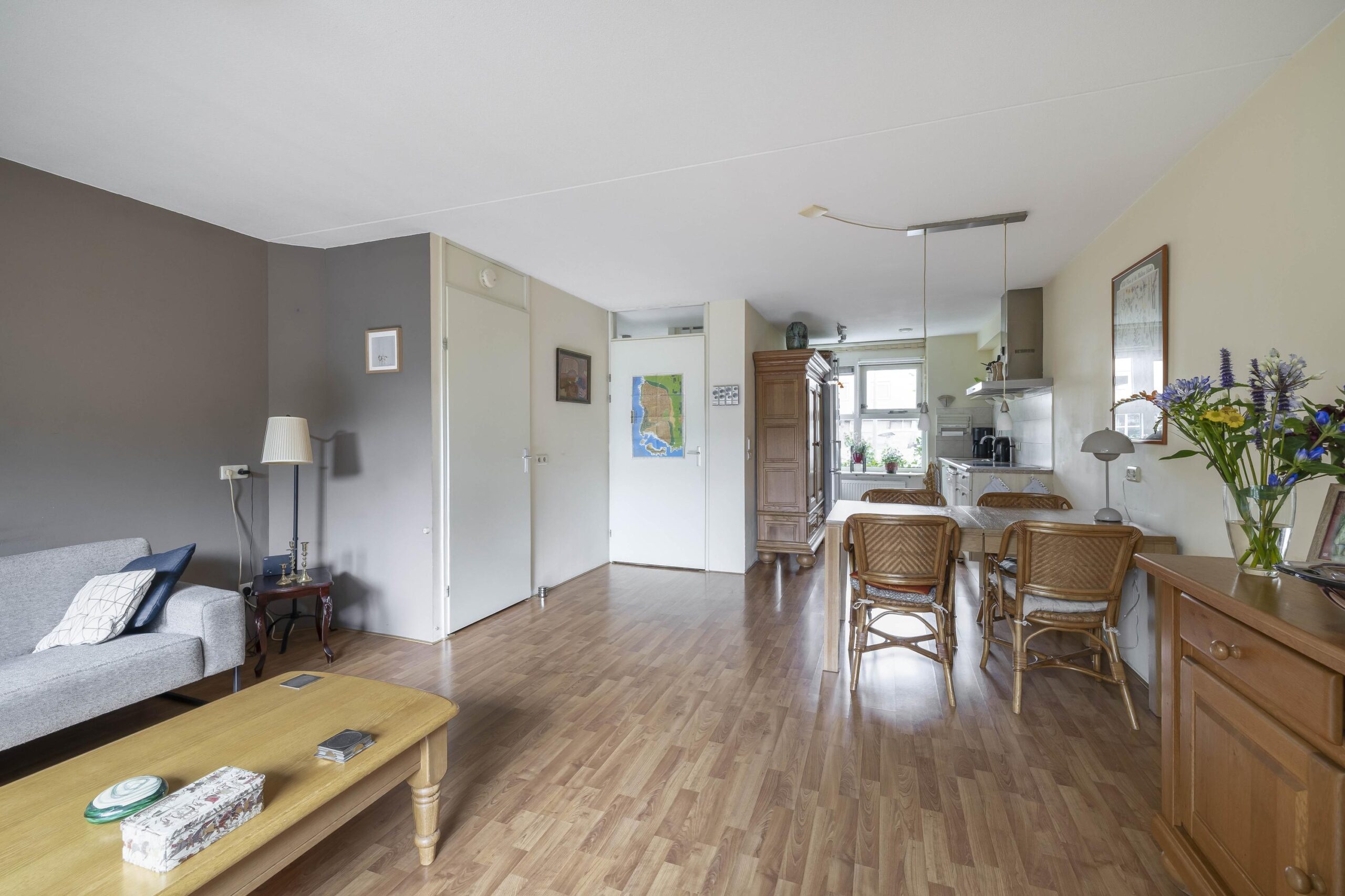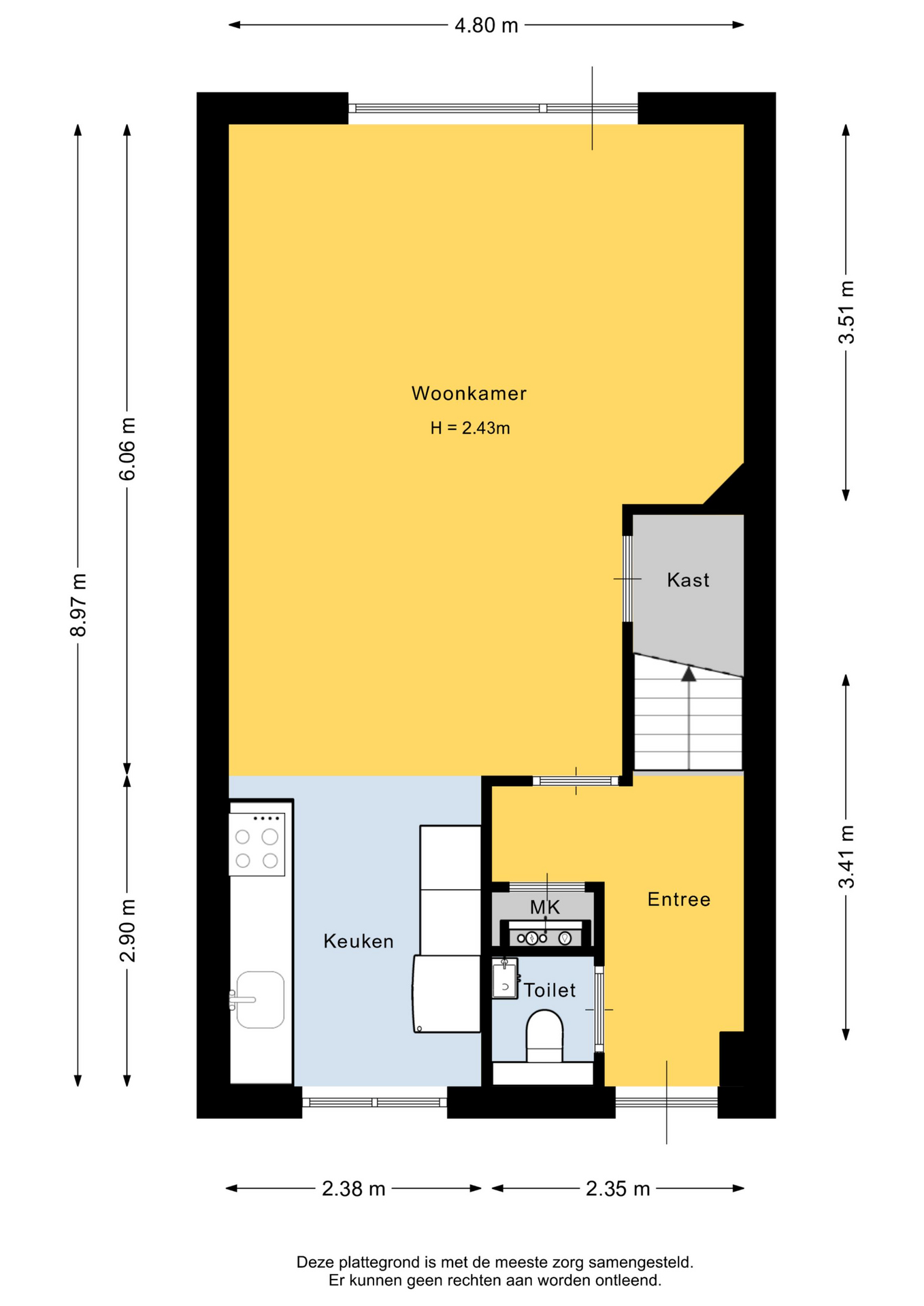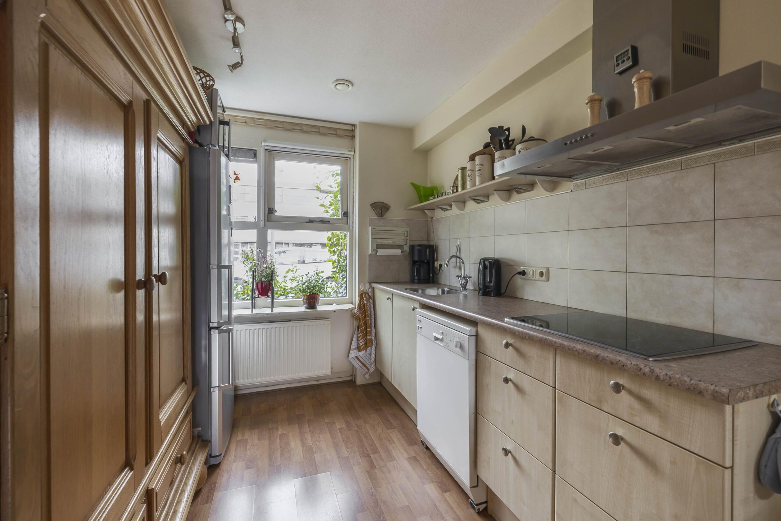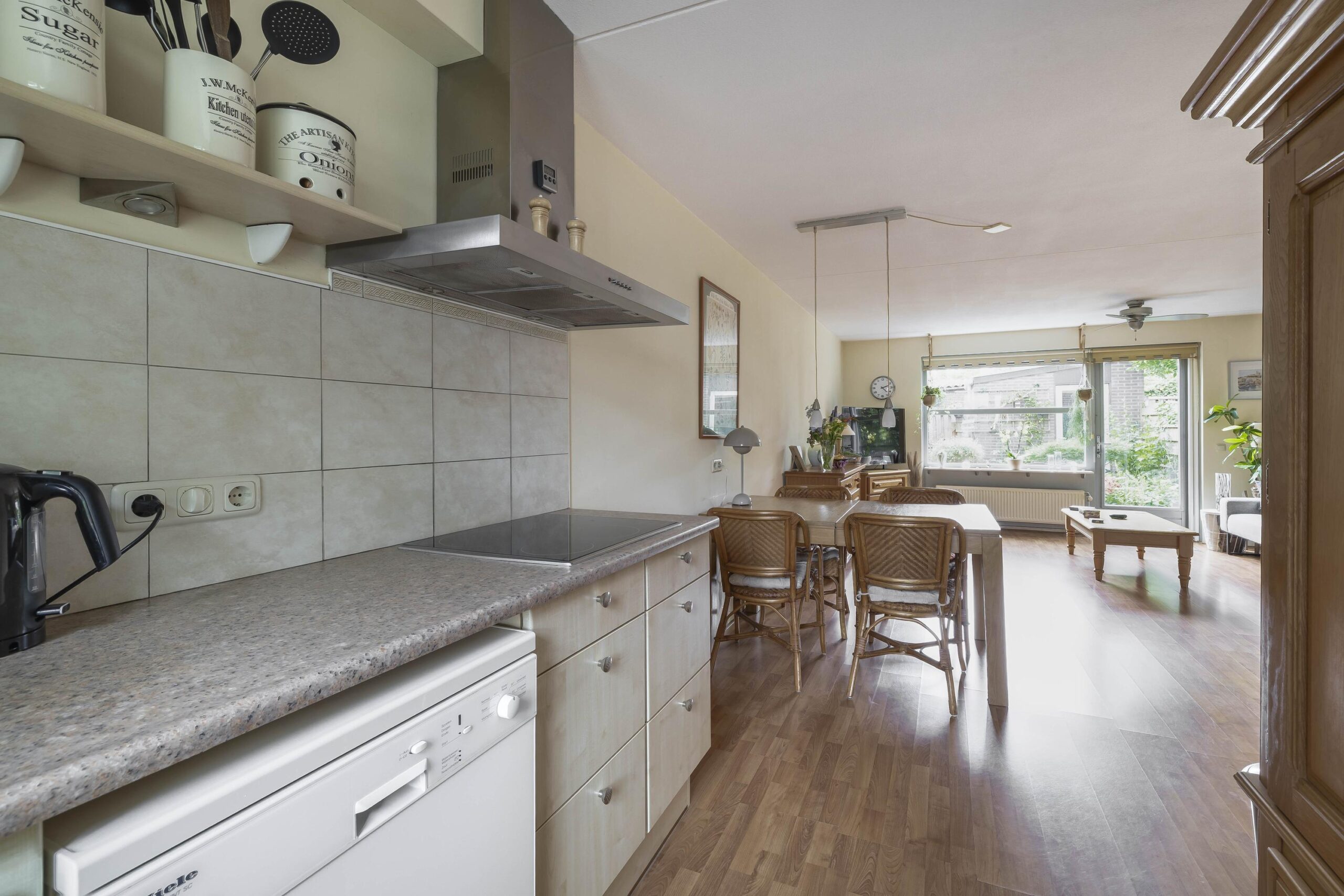 Begane grond: Entree; hal; toiletruimte met wandcloset en fonteintje; meterkast (7 groepen, 2 aardlekschakelaars en warmtewisselaar); woonkamer met trapkast, deur naar de tuin en open keuken in rechte opstelling en voorzien van keramische kookplaat en afzuigkap, losse vaatwasser en losse koelkast.