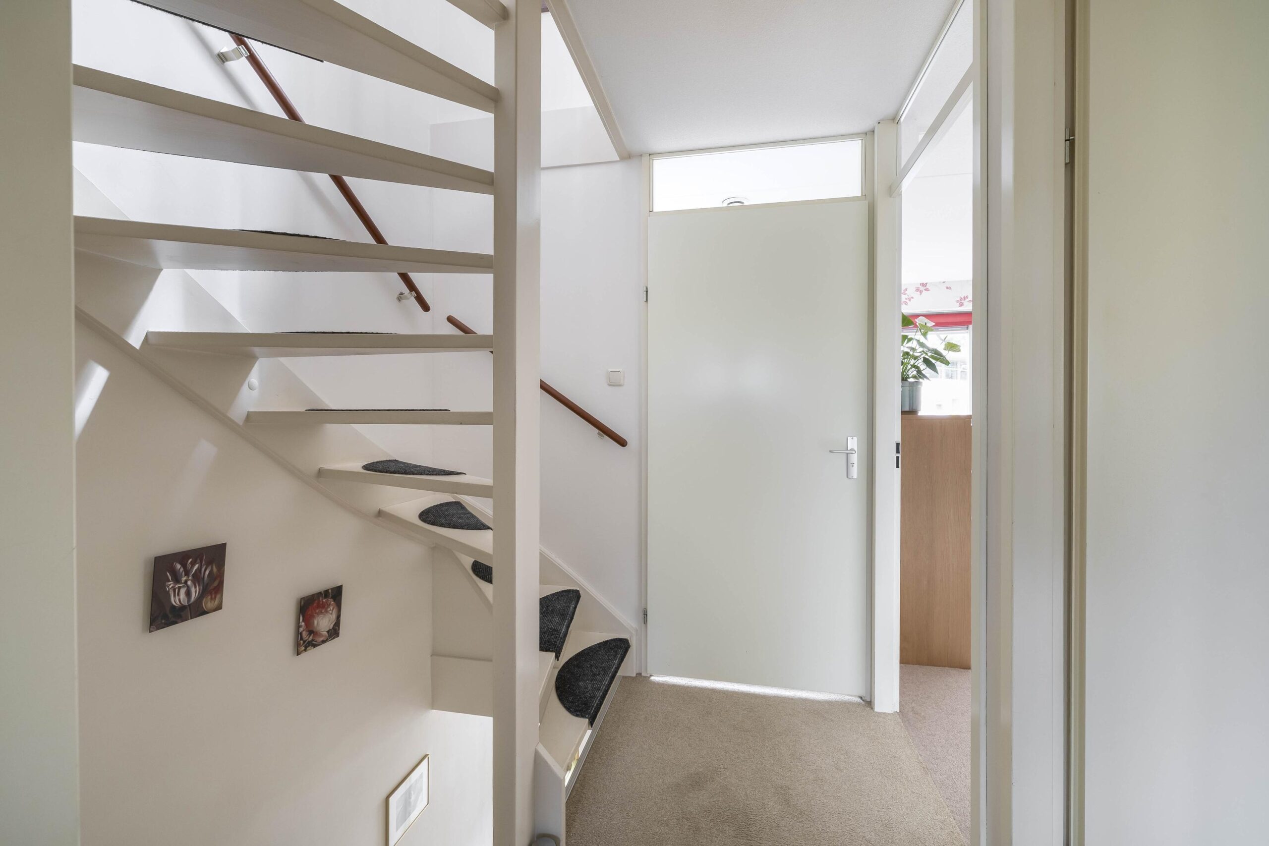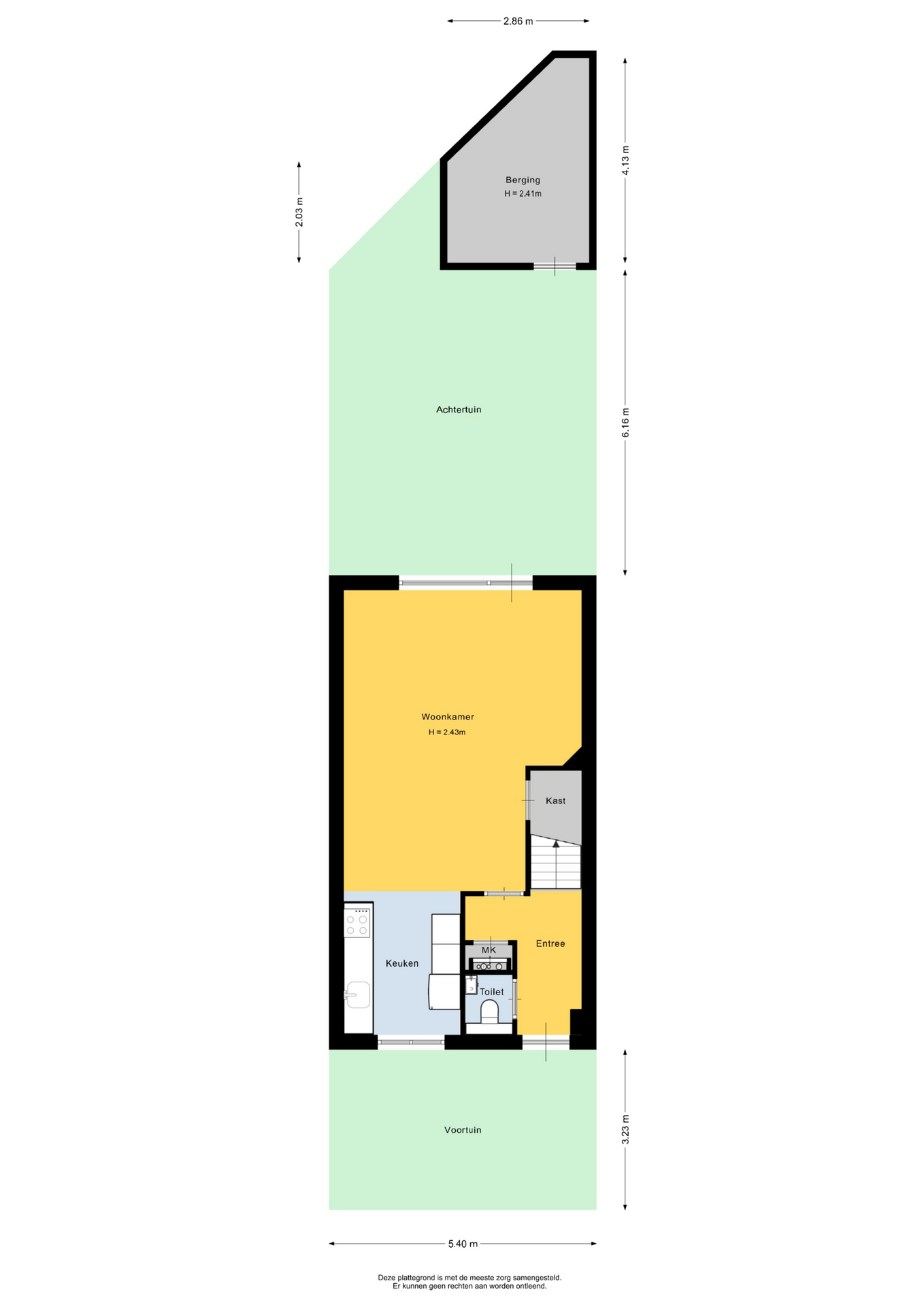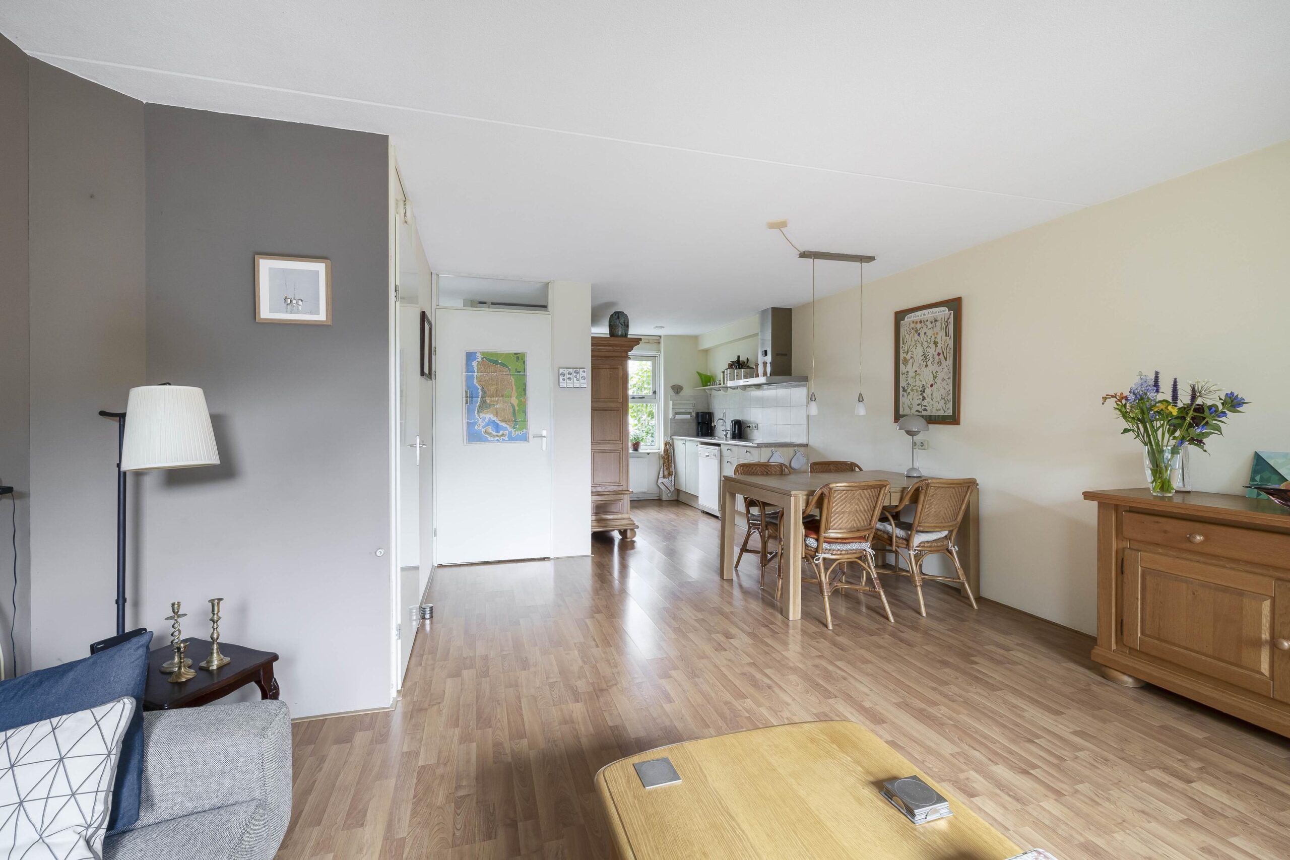 Begane grond: Entree; hal; toiletruimte met wandcloset en fonteintje; meterkast (7 groepen, 2 aardlekschakelaars en warmtewisselaar); woonkamer met trapkast, deur naar de tuin en open keuken in rechte opstelling en voorzien van keramische kookplaat en afzuigkap, losse vaatwasser en losse koelkast.