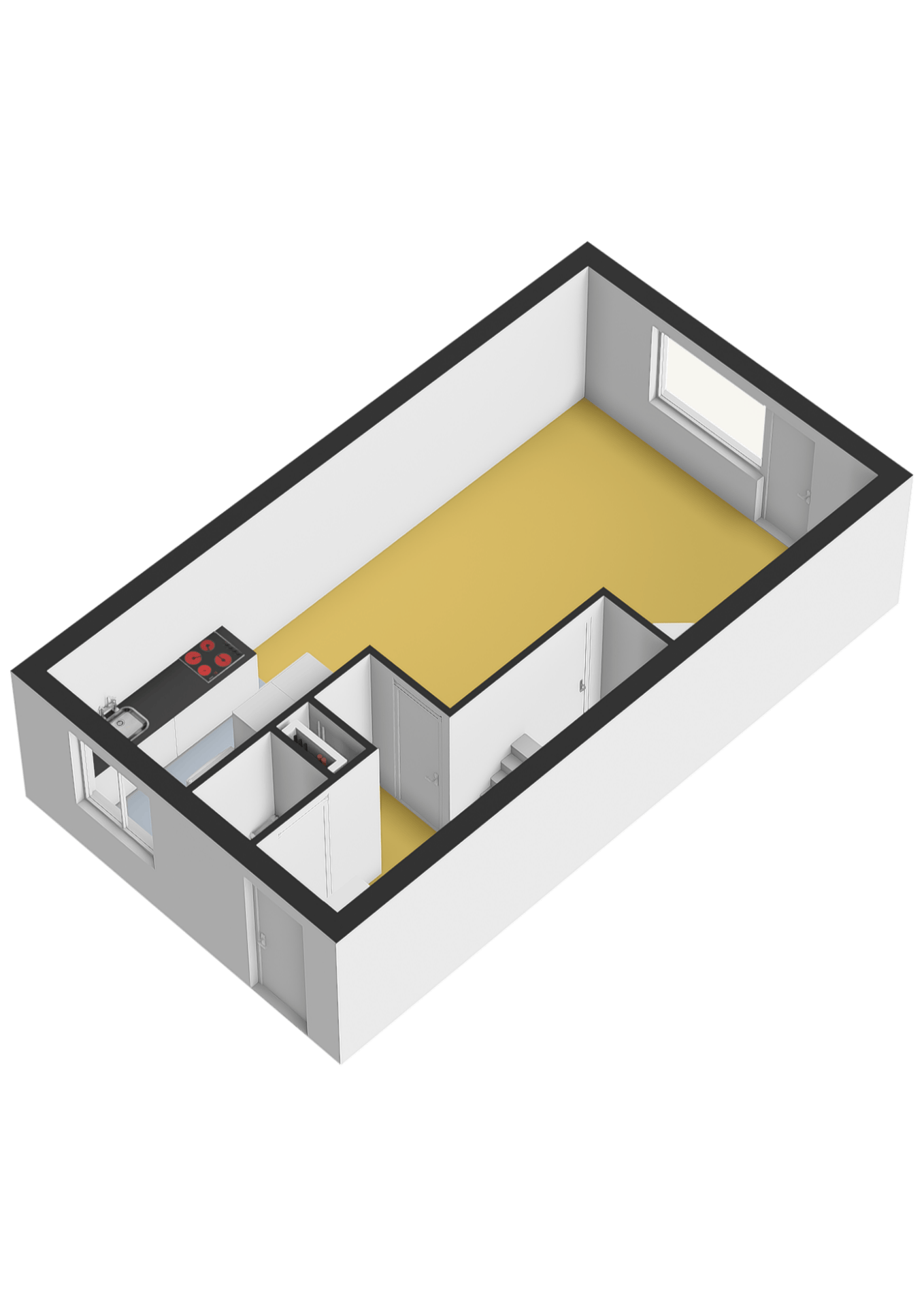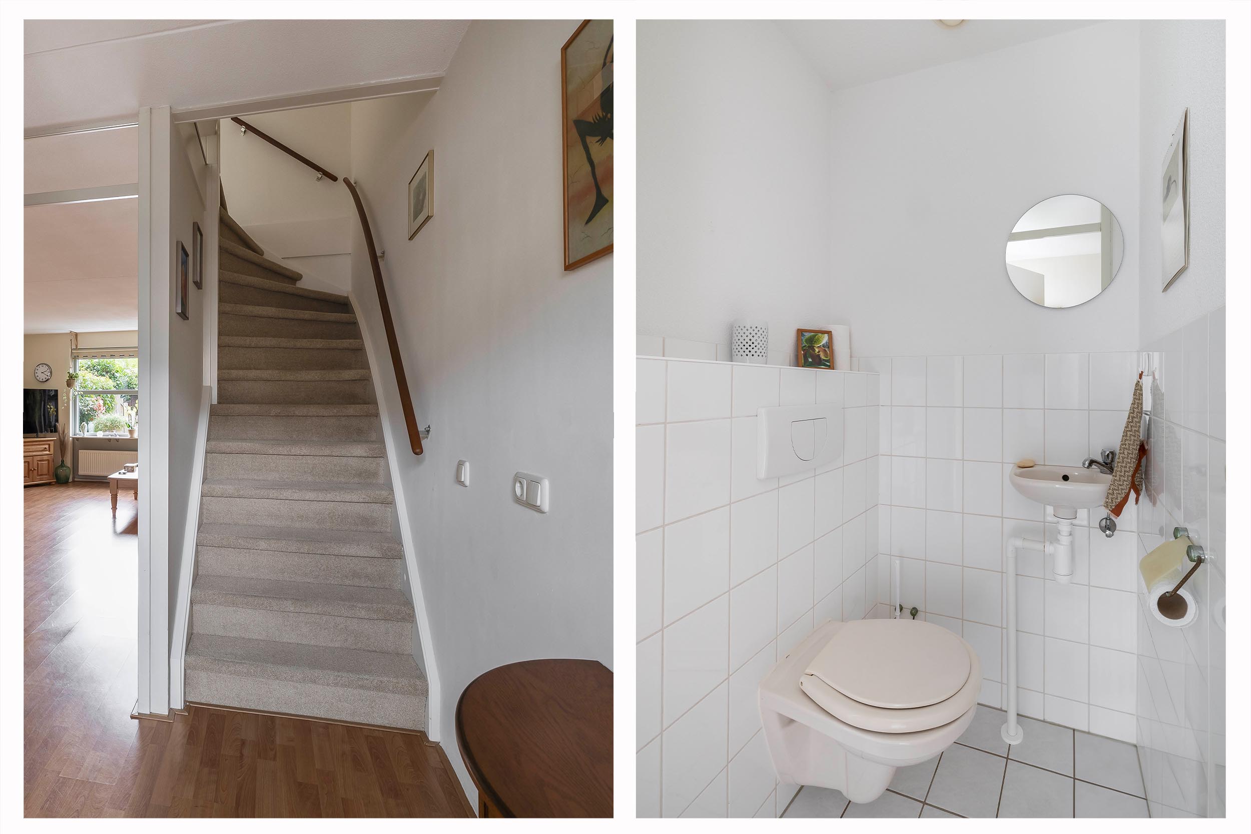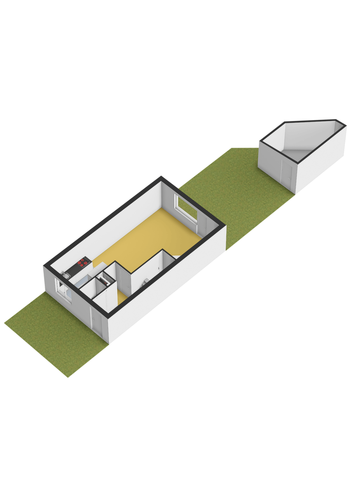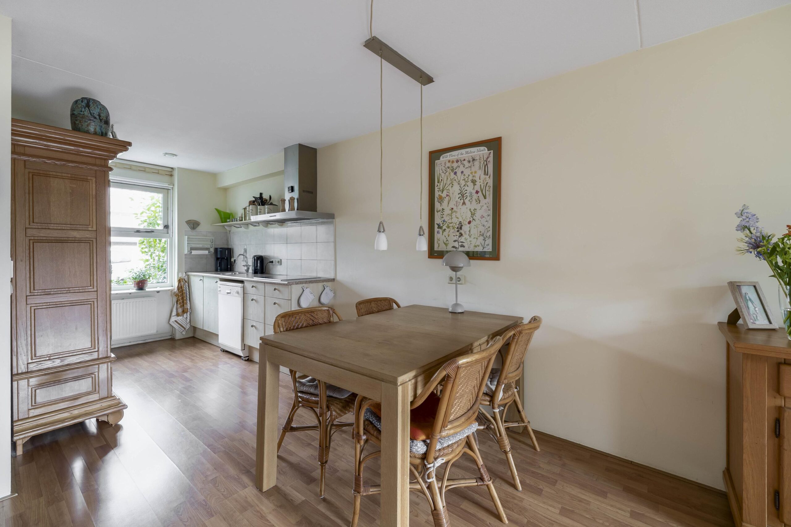 Begane grond: Entree; hal; toiletruimte met wandcloset en fonteintje; meterkast (7 groepen, 2 aardlekschakelaars en warmtewisselaar); woonkamer met trapkast, deur naar de tuin en open keuken in rechte opstelling en voorzien van keramische kookplaat en afzuigkap, losse vaatwasser en losse koelkast.