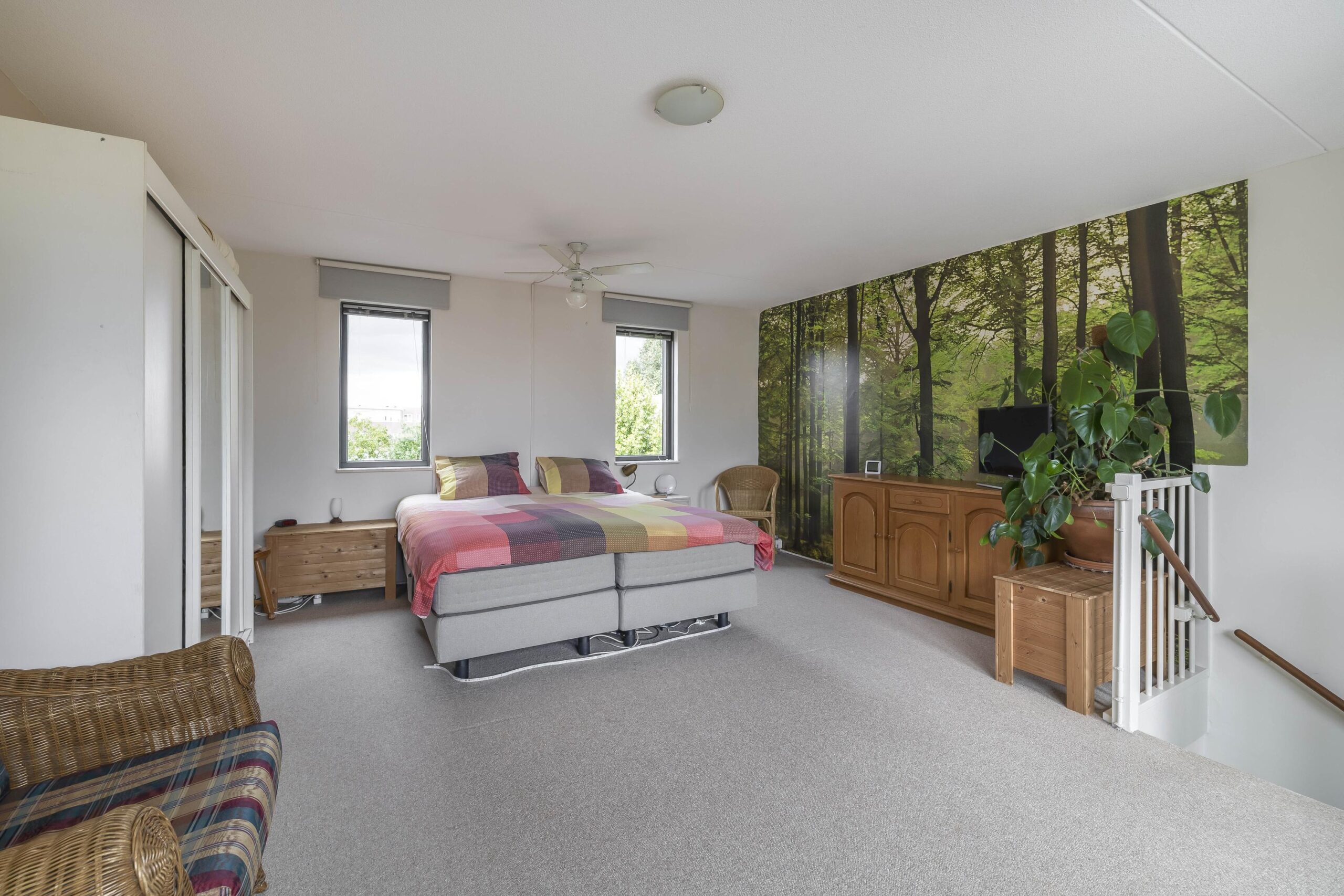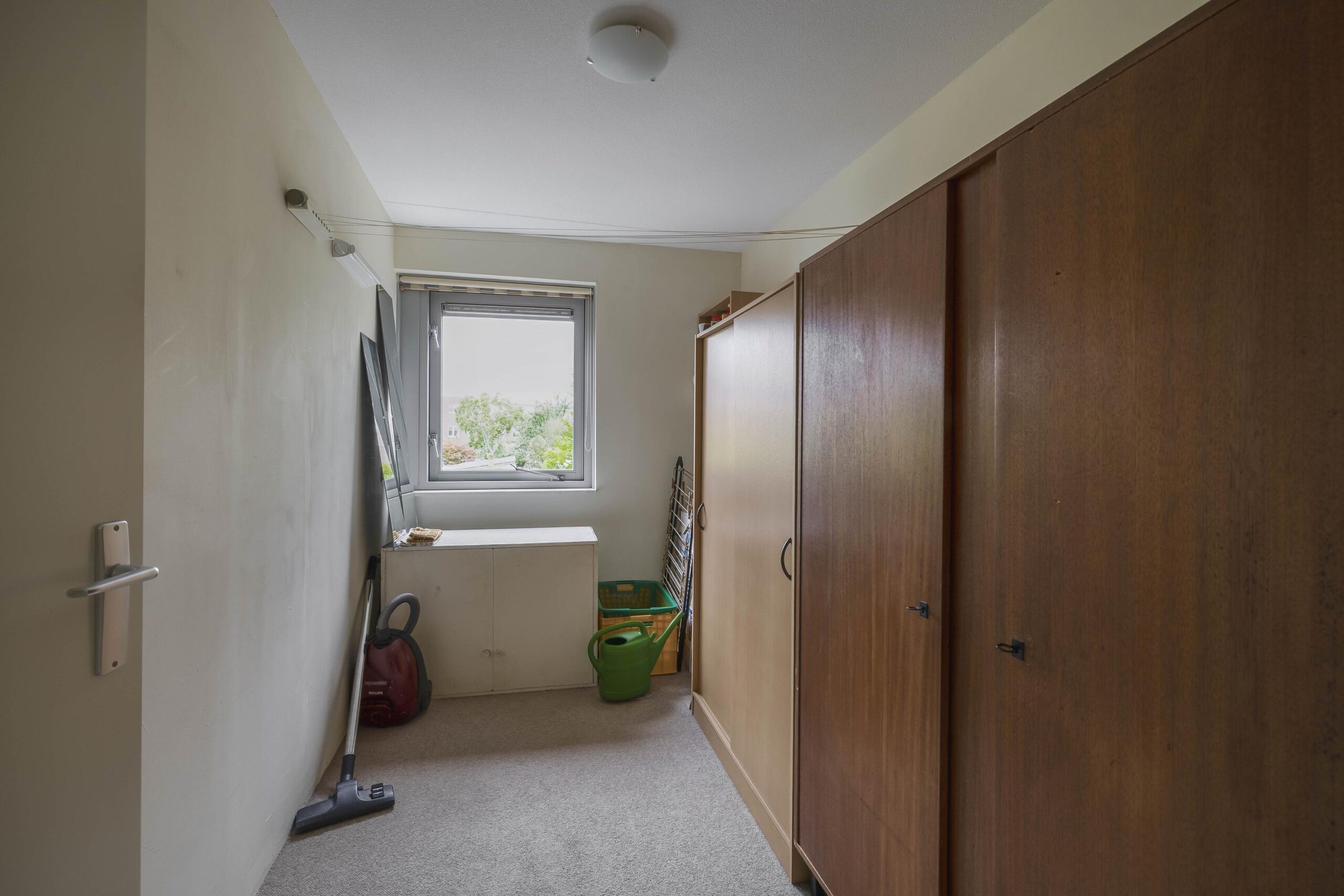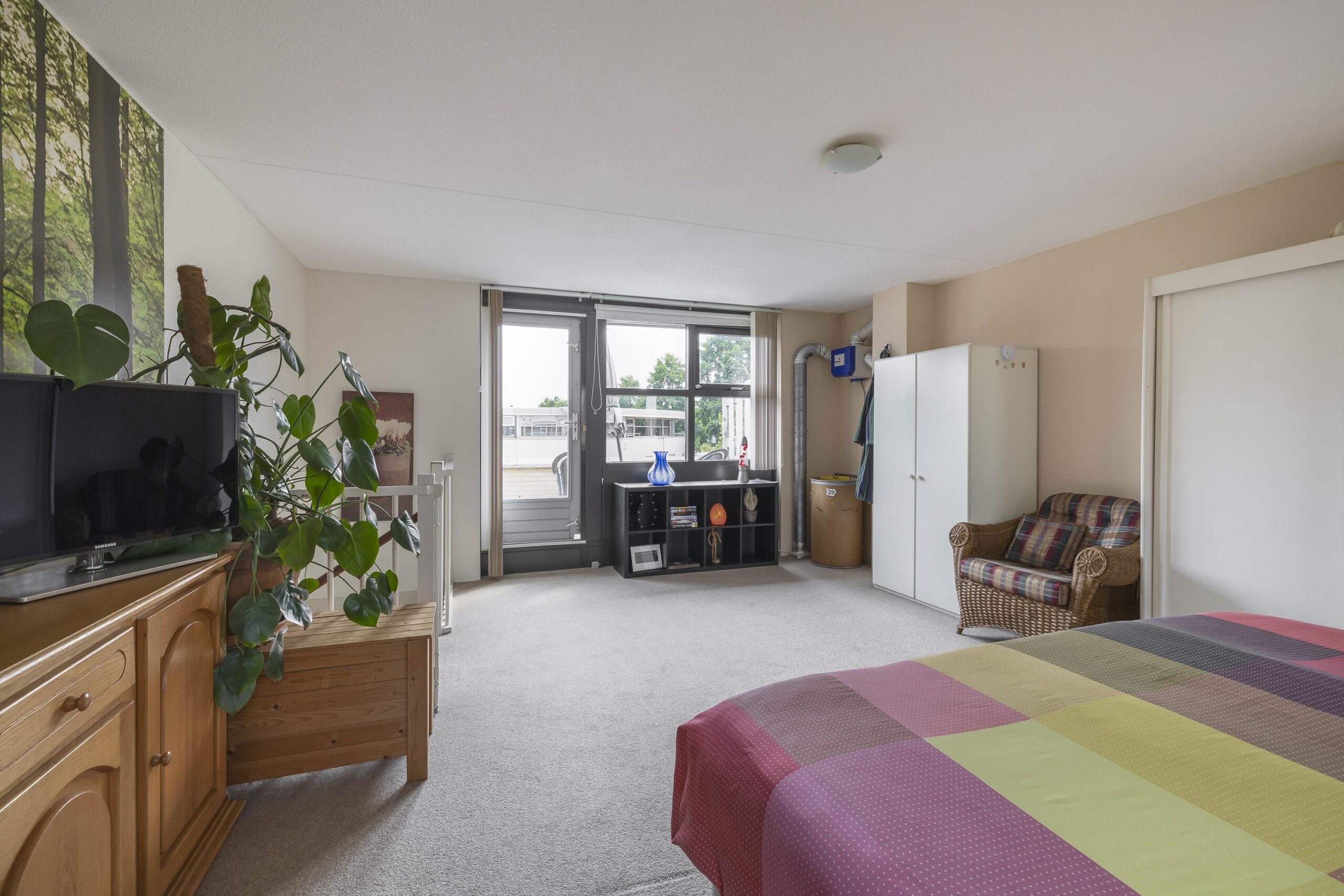2e verdieping: Grote zolderruimte thans ingericht als slaapkamer met opstelling mechanische ventilatie-box en toegang tot het dakterras. Deze verdieping biedt de mogelijkheid om een tweede slaapkamer te creëren.