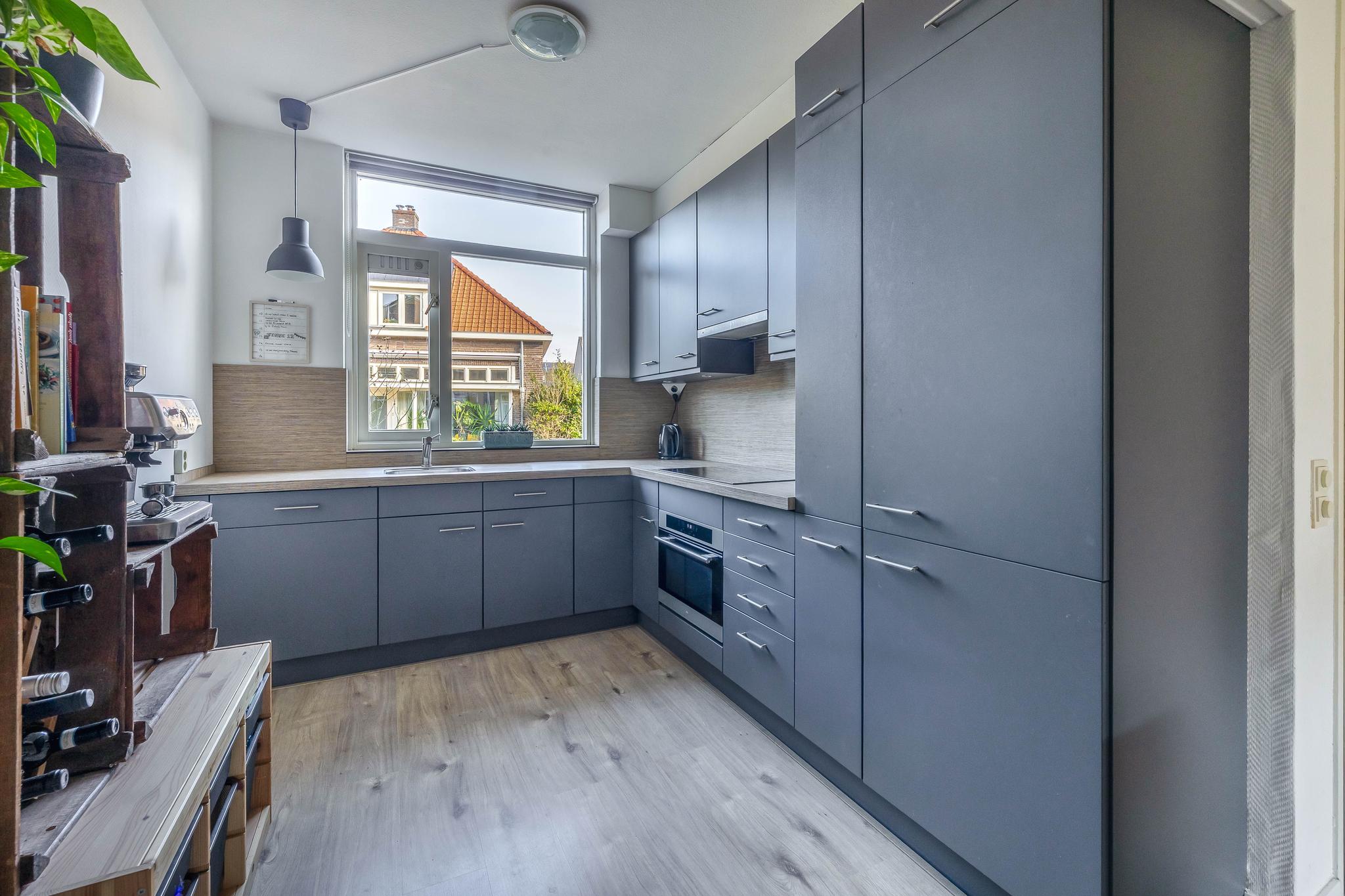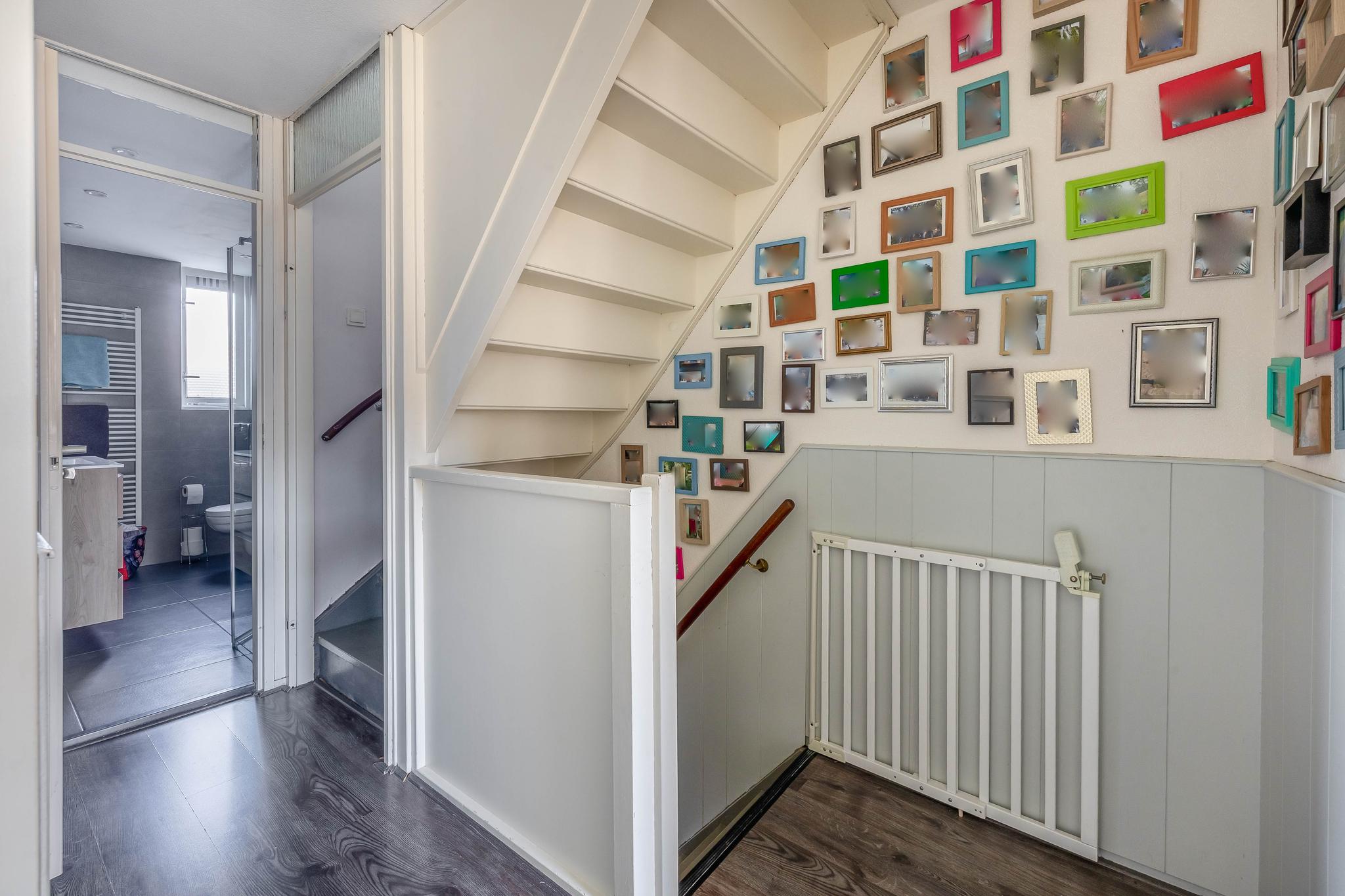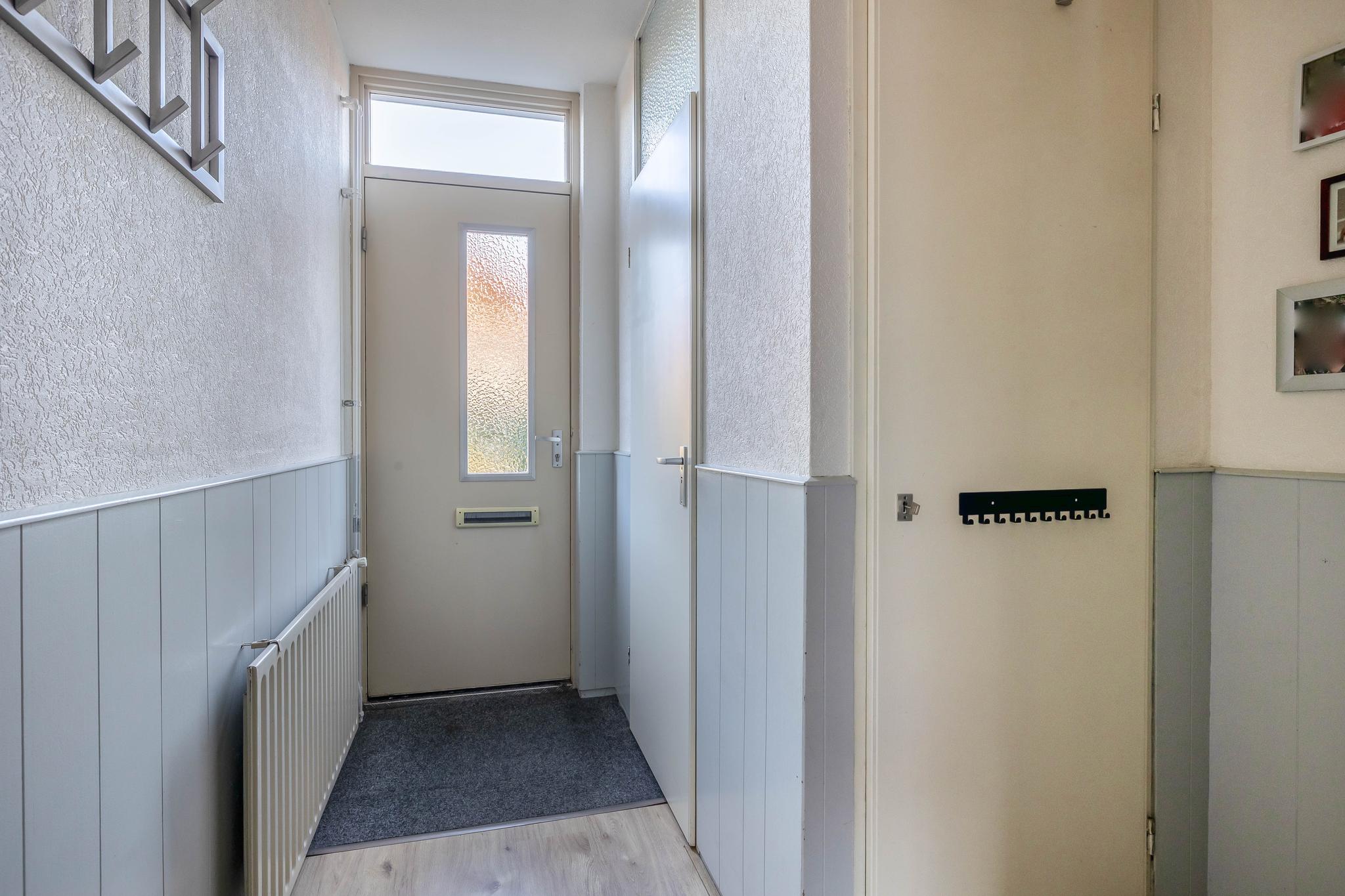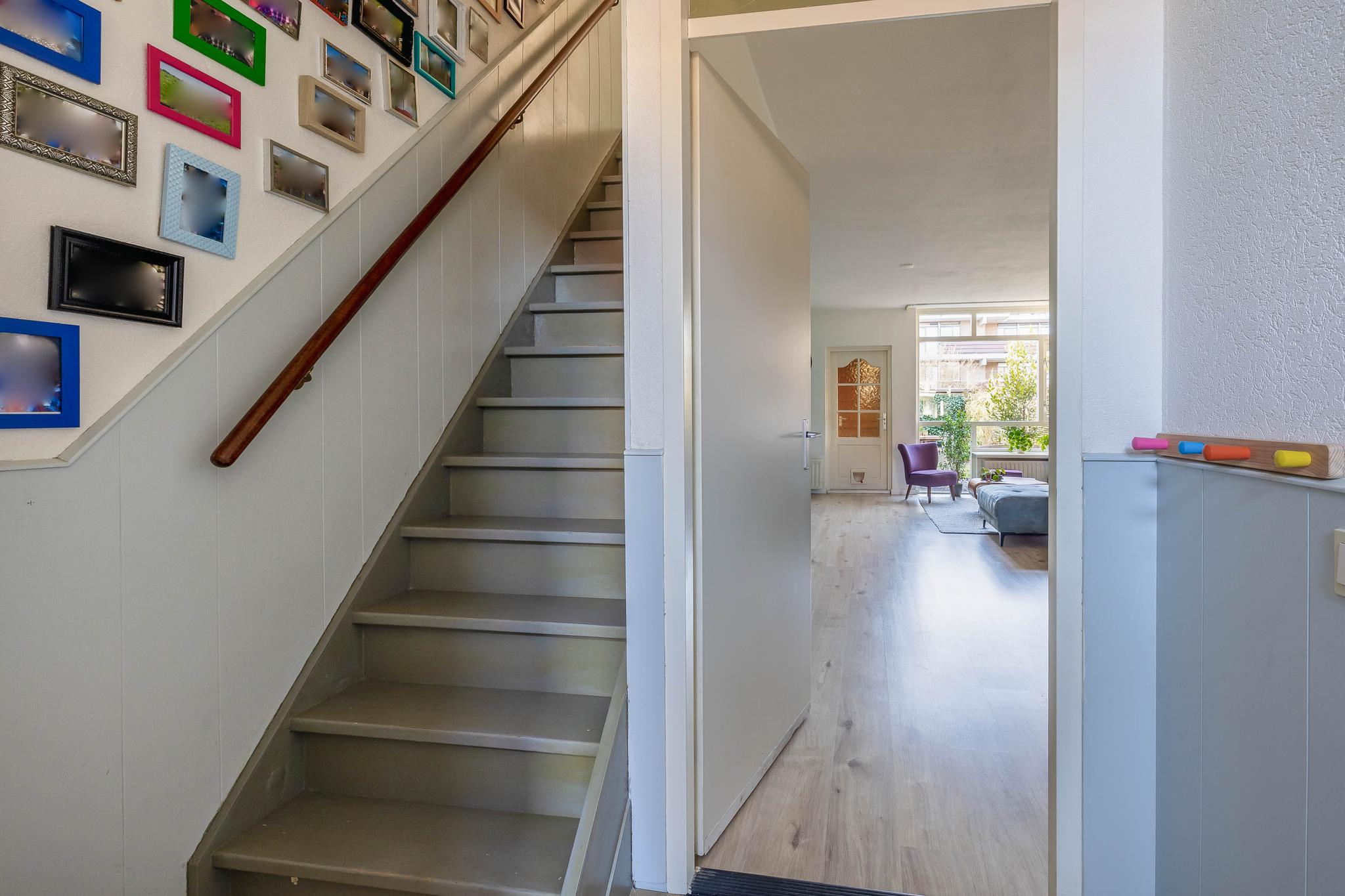 Begane grond: Entree; hal; meterkast; modern toilet met fontein en voorzien van raam; trapkast; open keuken met raam in L-opstelling geplaatst voorzien van diverse inbouwapparatuur, t.w. inductie kookplaat, afzuigkap, combi oven/magnetron, koelkast, vriezer en vaatwasser; tuingerichte woonkamer en doorloop naar tussenhal met aangebouwde berging.