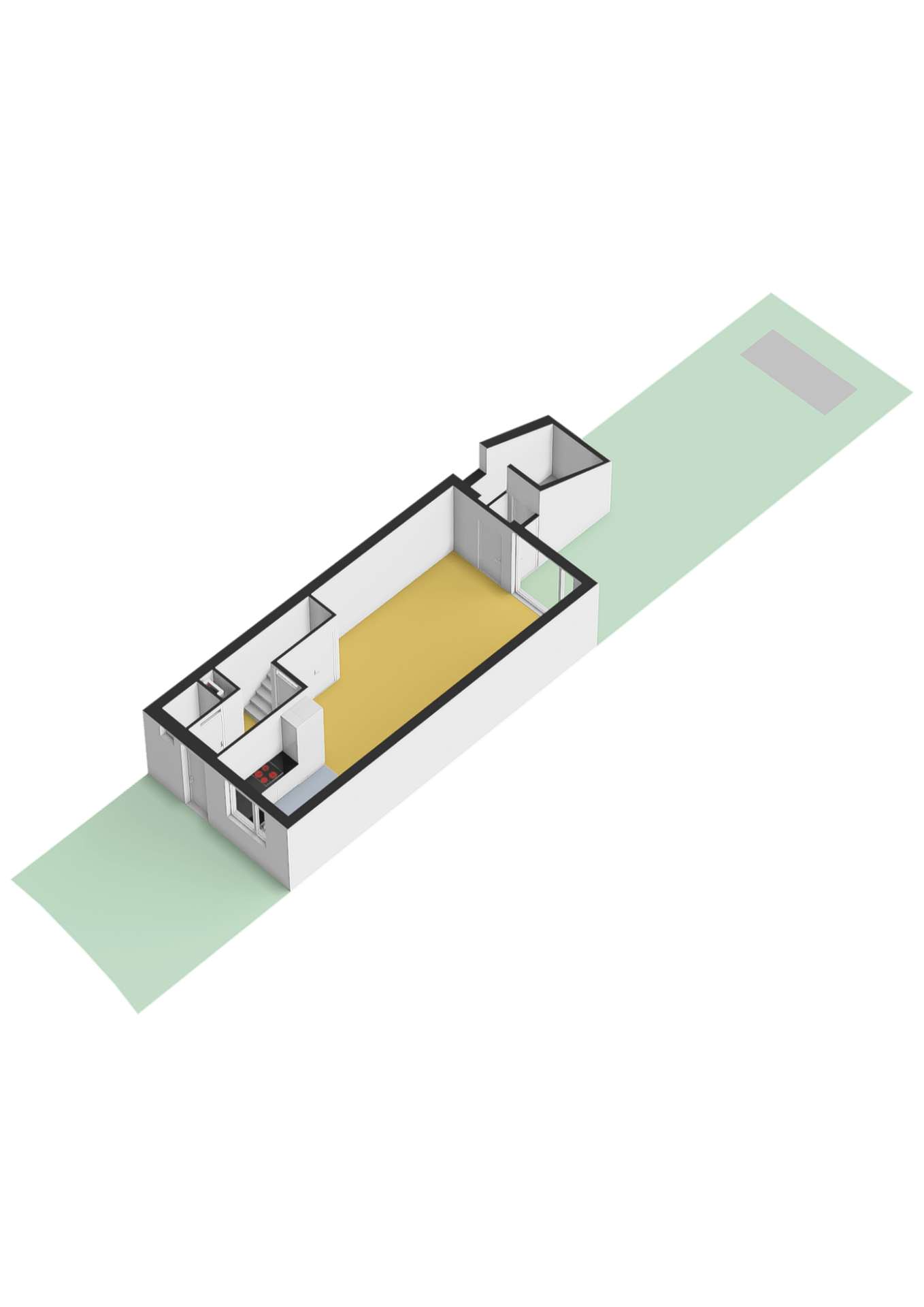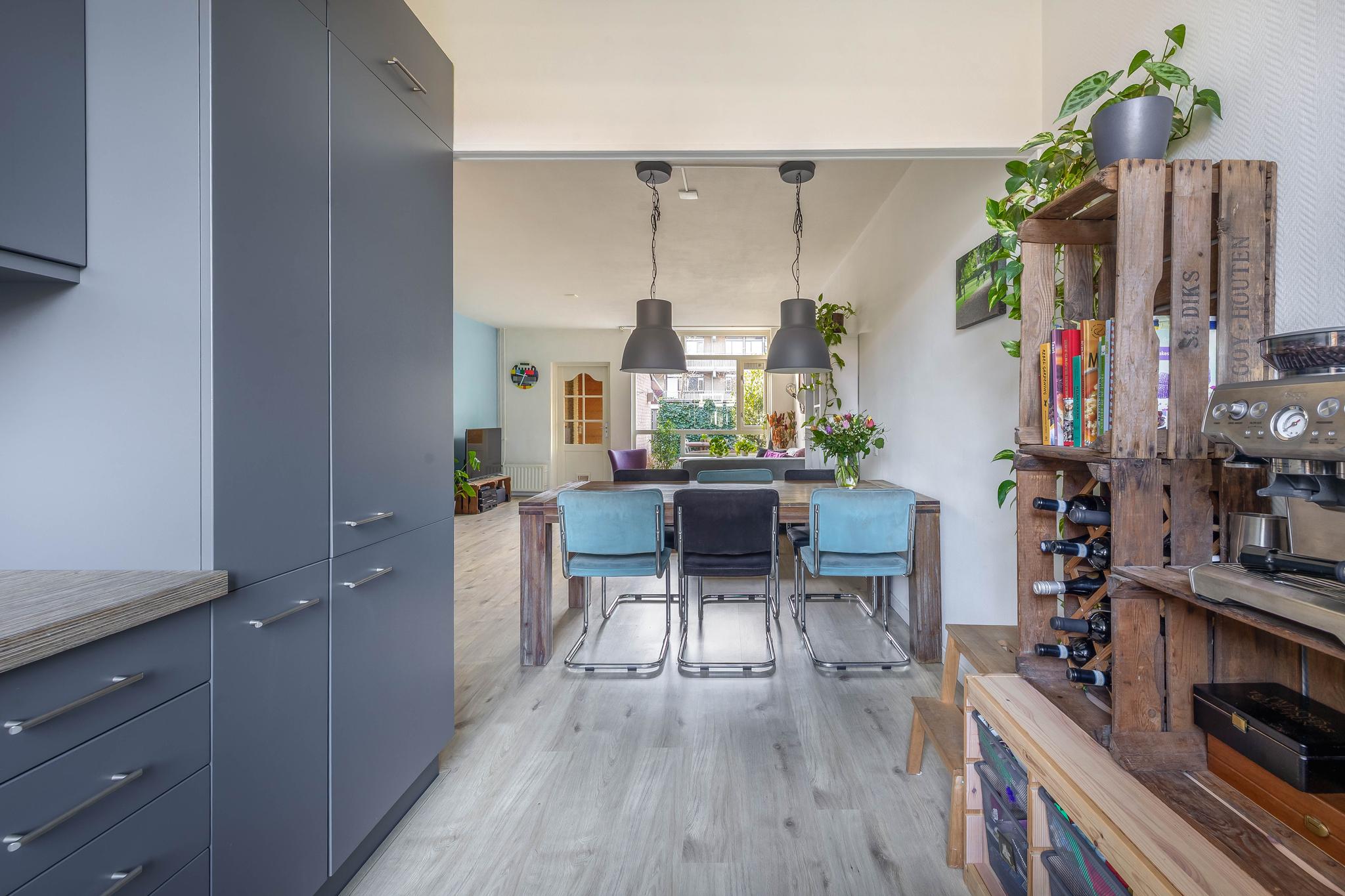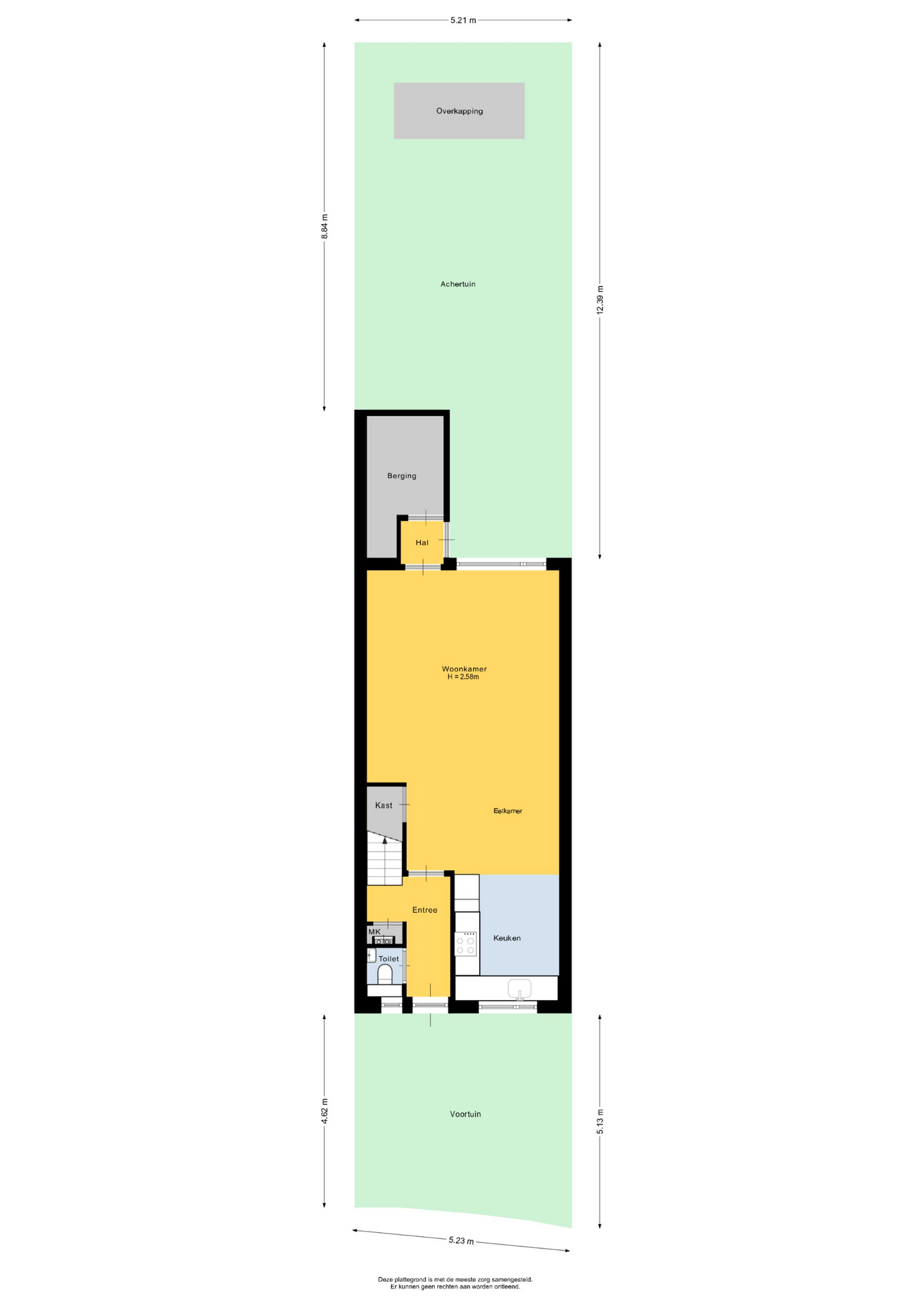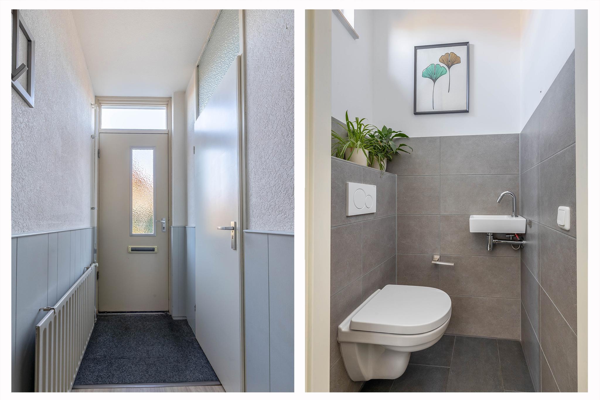 Begane grond: Entree; hal; meterkast; modern toilet met fontein en voorzien van raam; trapkast; open keuken met raam in L-opstelling geplaatst voorzien van diverse inbouwapparatuur, t.w. inductie kookplaat, afzuigkap, combi oven/magnetron, koelkast, vriezer en vaatwasser; tuingerichte woonkamer en doorloop naar tussenhal met aangebouwde berging.