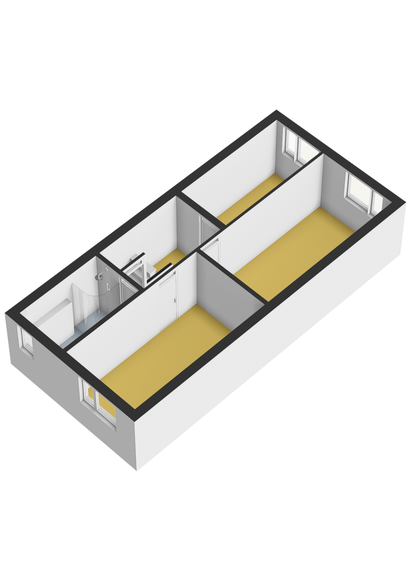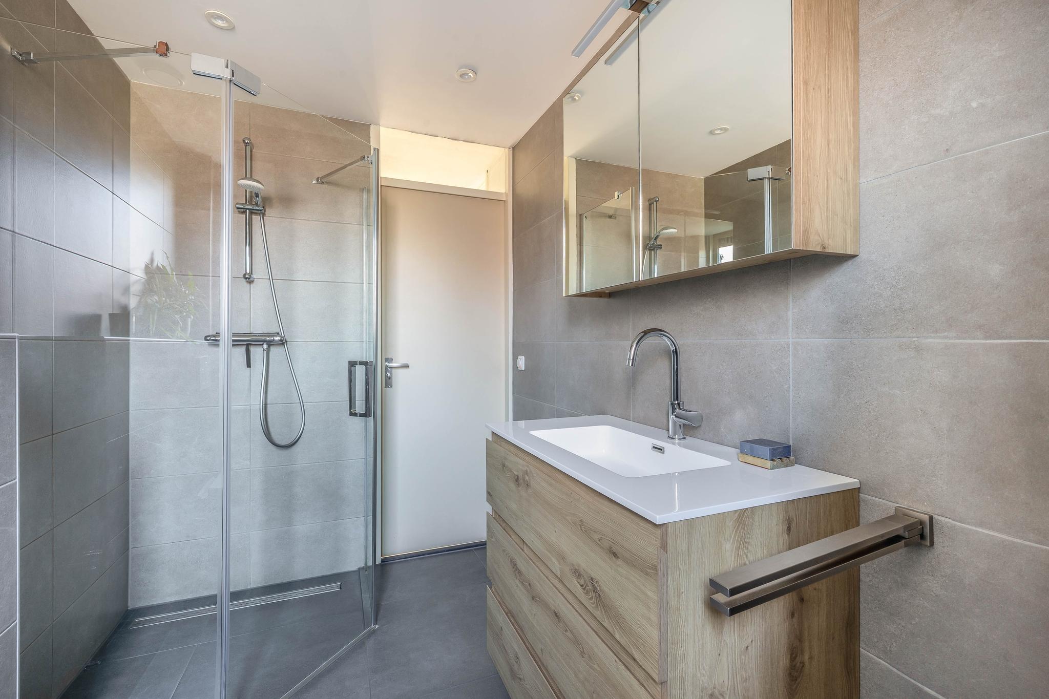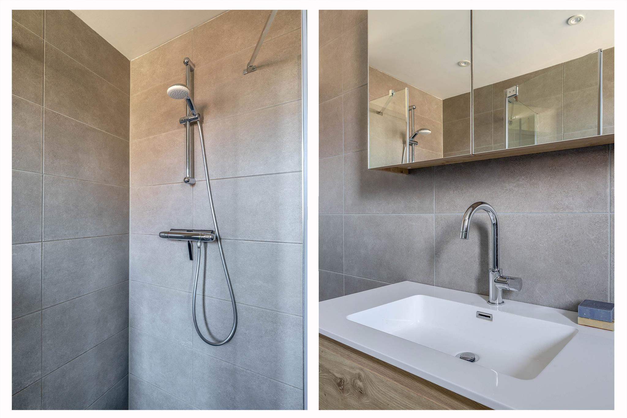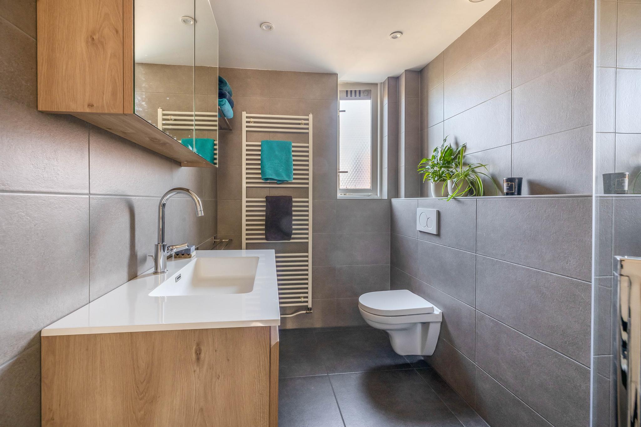 1e verdieping: Overloop; slaapkamer I; slaapkamer II; slaapkamer III; moderne lichte badkamer met raam en verlaagd plafond uitgerust met een wandtoilet, design radiator, inloopdouche met glazenwand en wastafelmeubel.