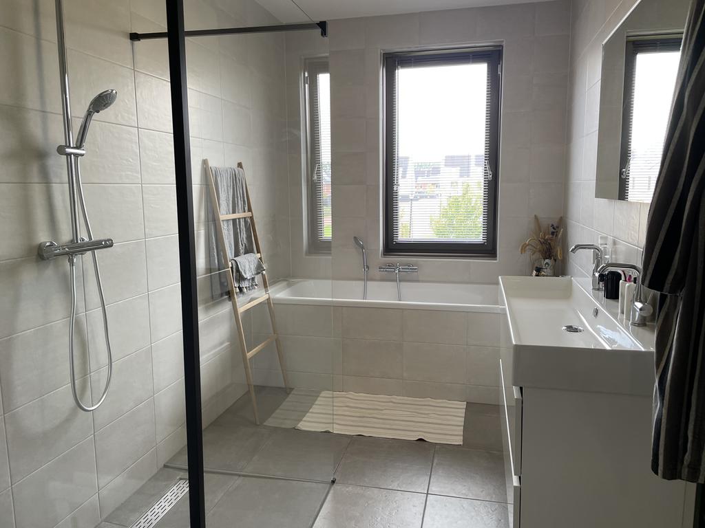 1e verdieping: overloop; badkamer tot plafond betegeld en v.v. raam, design radiator, vloerverwarming, wandcloset, ligbad, inloopdouche en wastafelmeubel; slaapkamer I met raam tot aan de vloer en royale slaapkamer II.