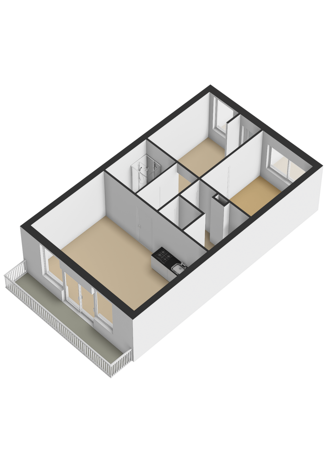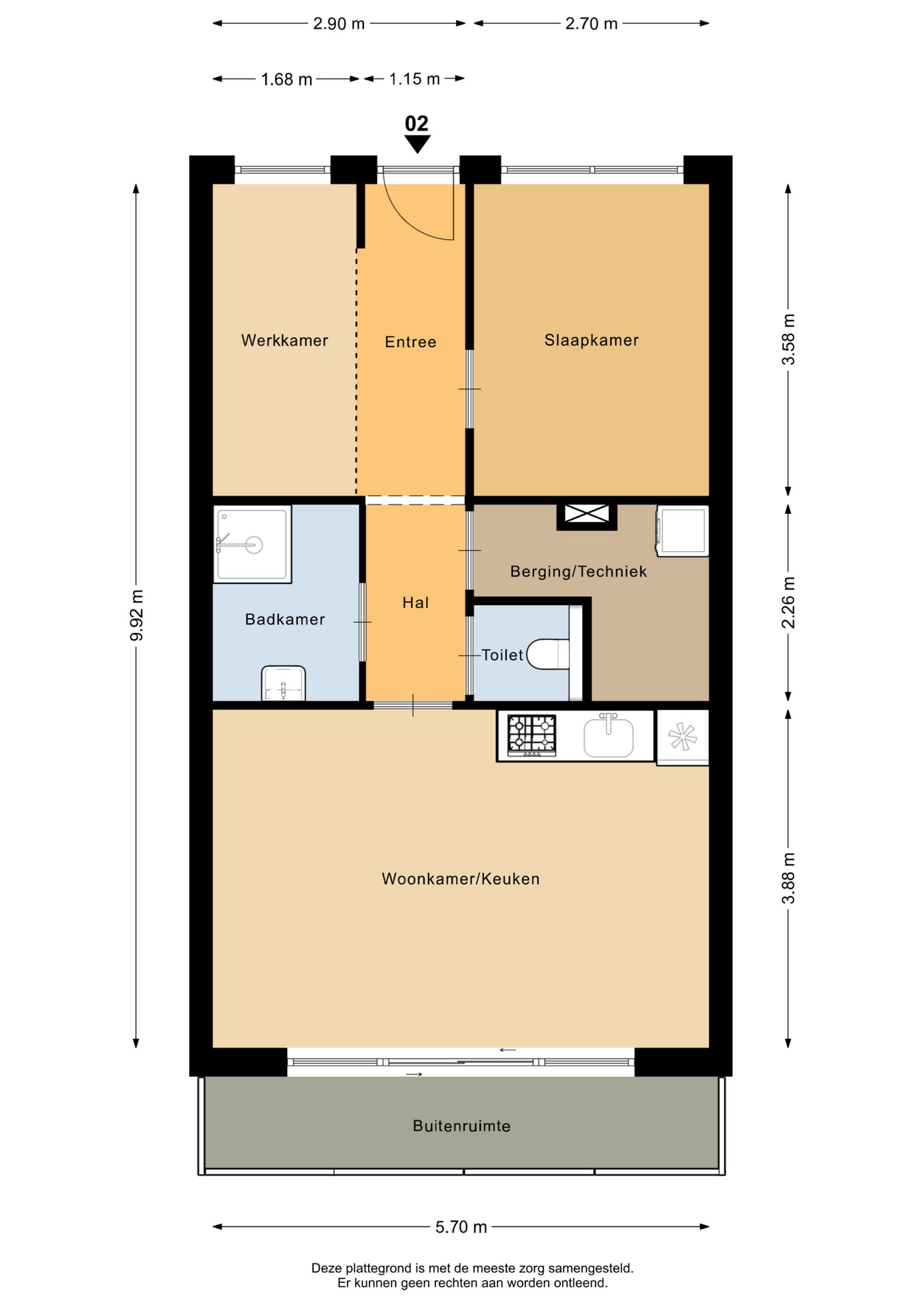 Indeling: Entree; slaapkamer; werkkamer; hal; badkamer met douche en wastafel; berging met aansluiting voor de wasapparatuur en technische ruimte; toilet; woonkamer met open keuken; balkon op het zuiden gesitueerd.