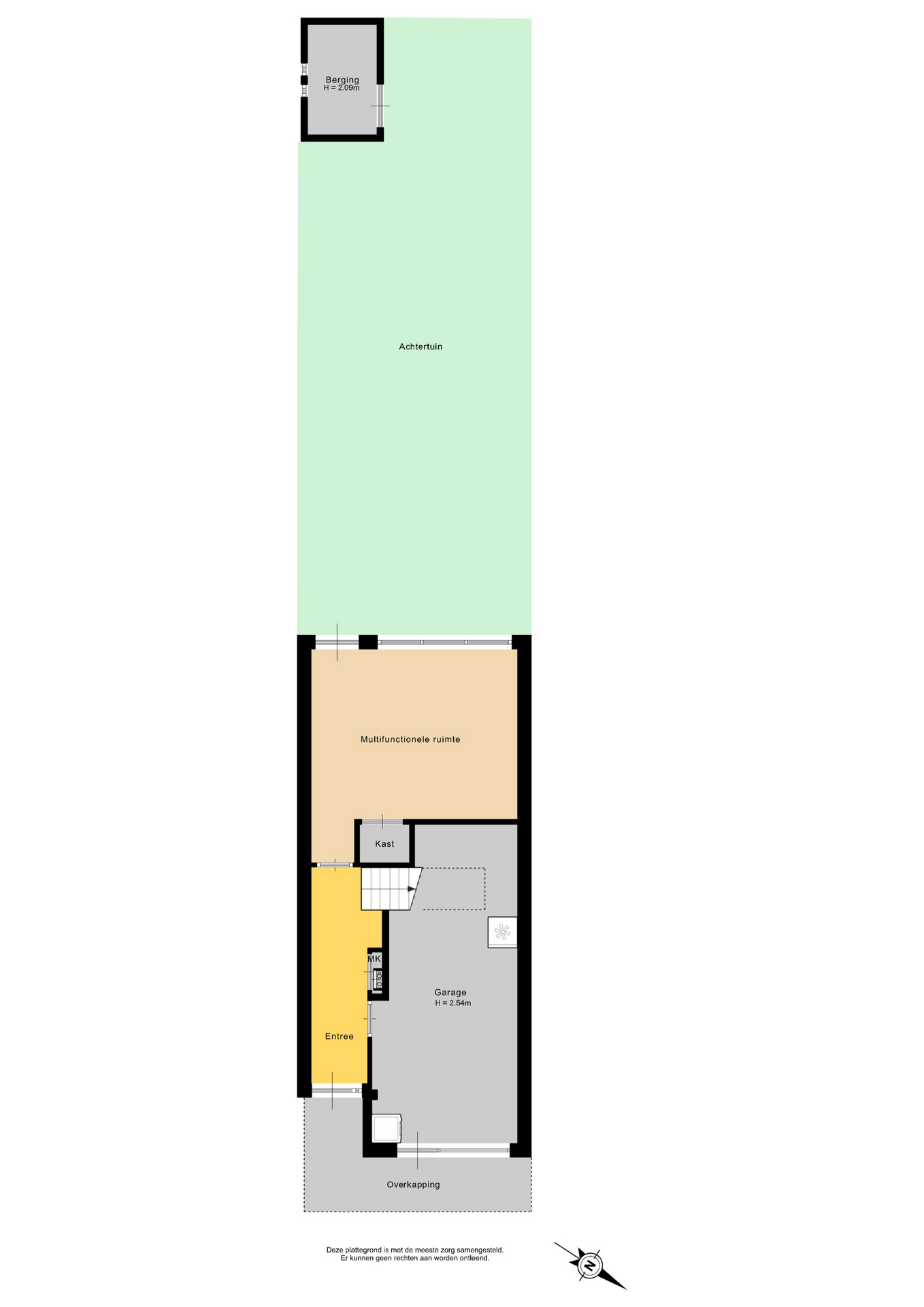 Overdekte entree; gang; meterkast; garderobe-nis; tuinkamer met inbouwkast en toegang tot de tuin; inpandige ruime garage met aansluiting voor de was-apparatuur.