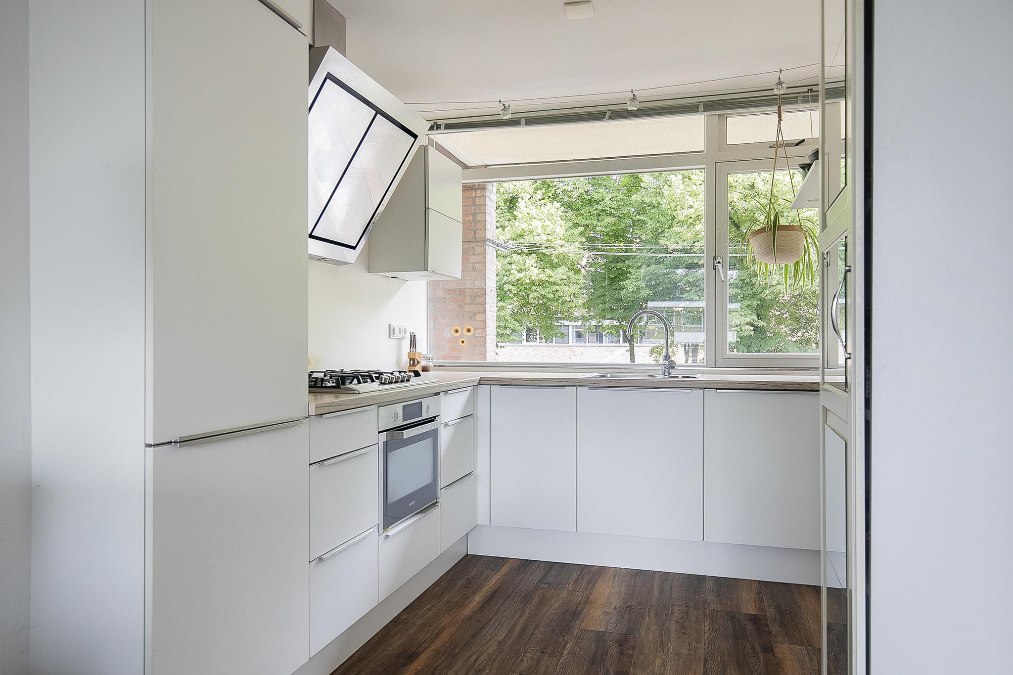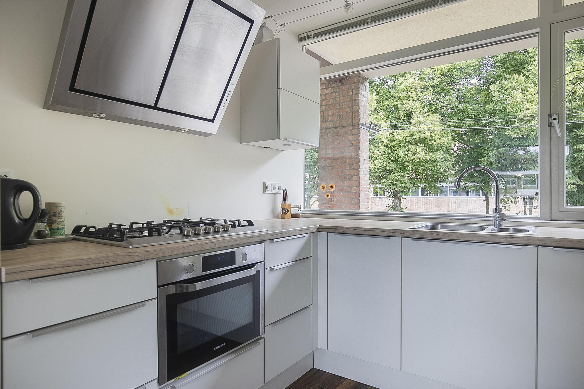 Begane grond: entree; gang; wandtoilet; meterkast; trapkast; half open keuken (2017) in L-opstelling geplaatst en voorzien van een 5-pits gasfornuis met RVS afzuigkap, koelkast, vriezer, combimagnetron en vaatwasser; woonkamer met toegang tot het balkon op het zuiden.