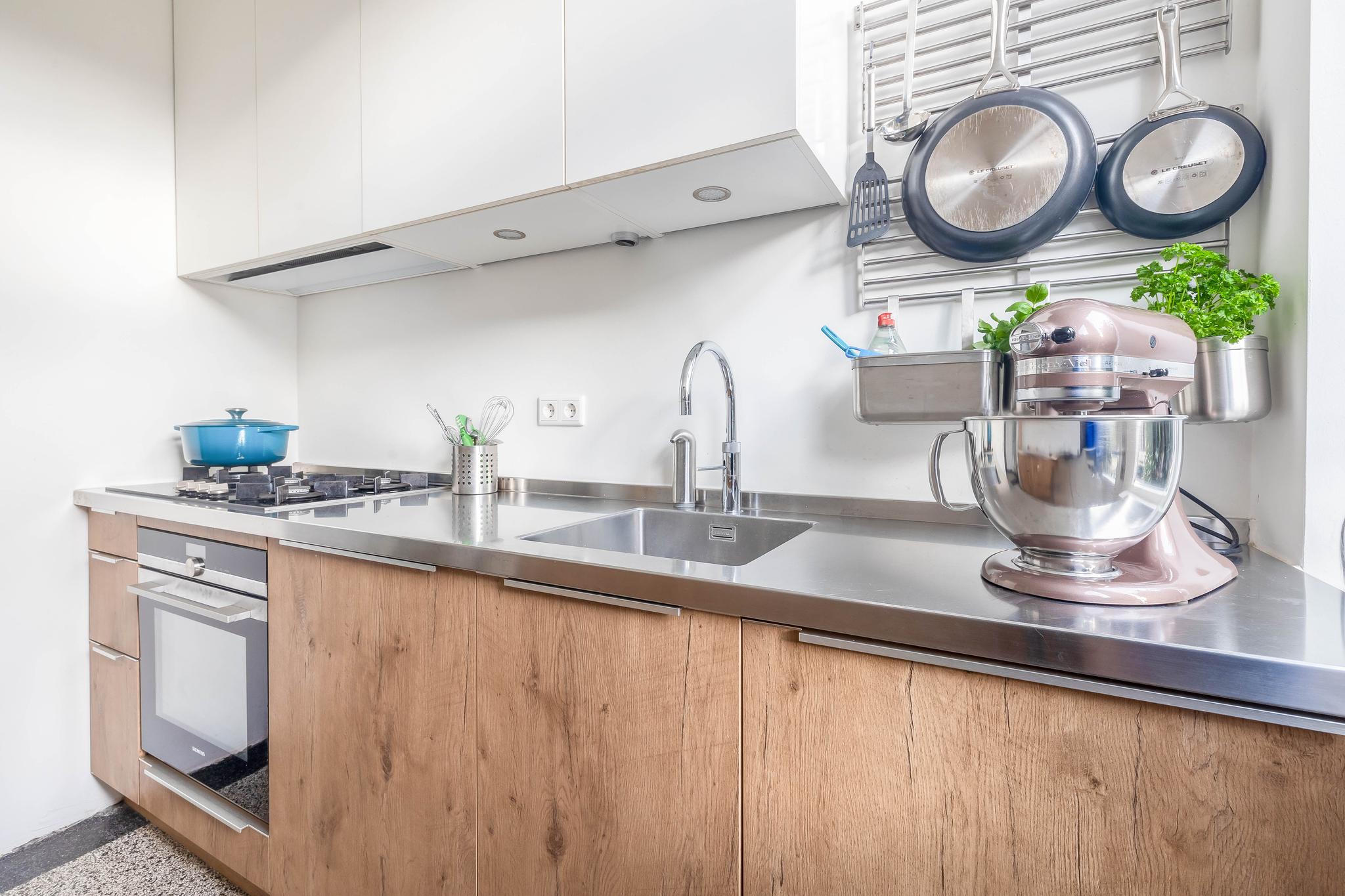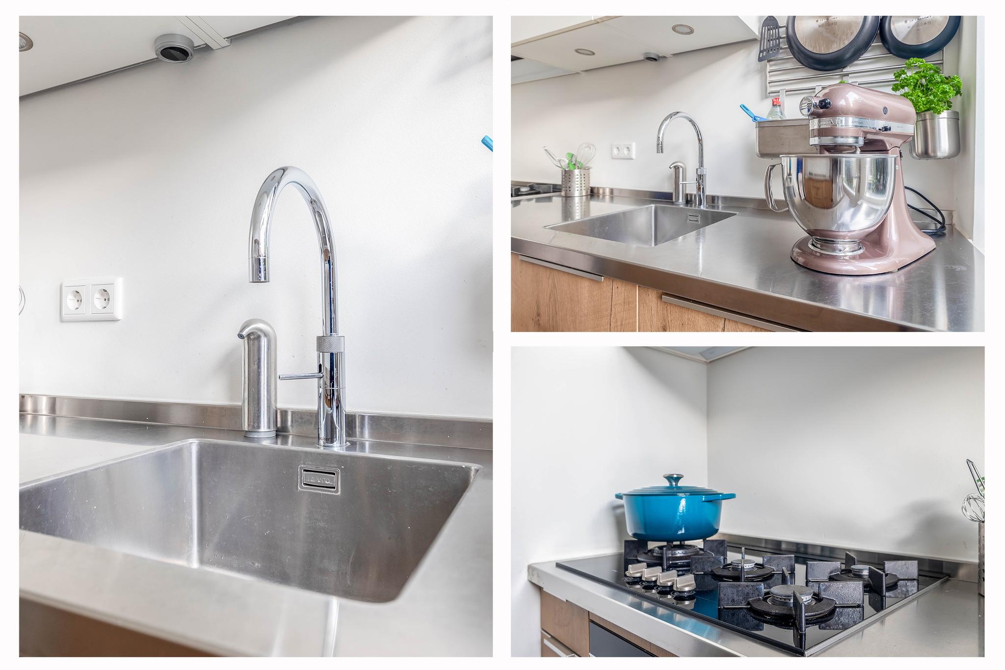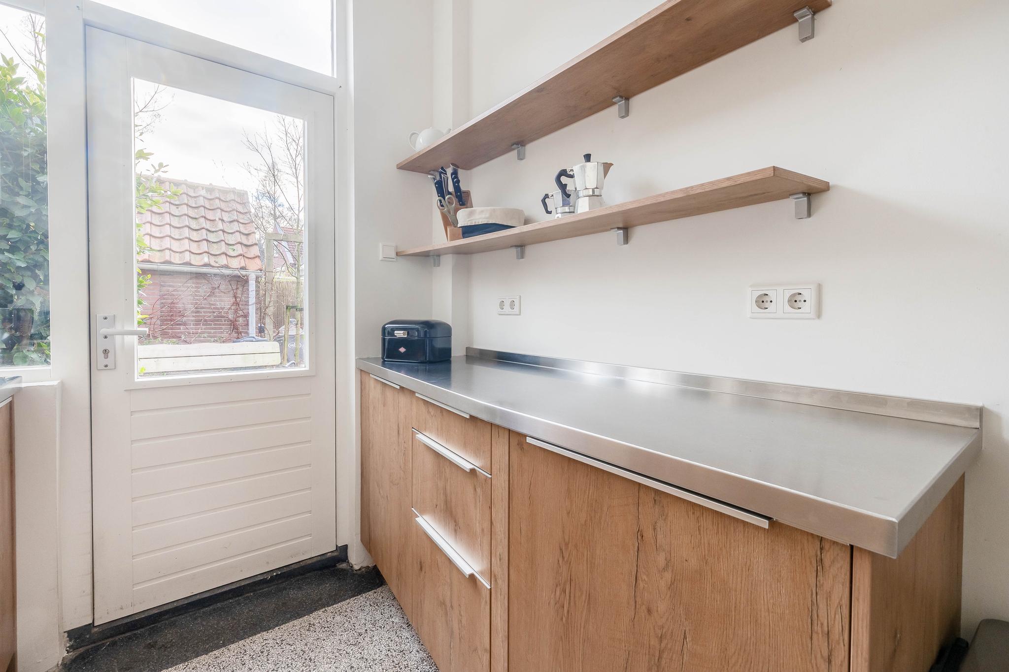 Begane grond: Entree, gang met nieuwe granito vloer; meterkast; wandtoilet; verdiepte trapkast; dichte moderne keuken met deur naar de tuin in 2x rechte opstelling geplaatst voorzien van diverse inbouwapparatuur, t.w. Quooker, koelkast (Siemens), vriezer (Siemens), 4-pits gas op glas met afzuigkap, vaatwasser (Siemens), oven/magnetron (Siemens); doorzon woonkamer met dubbele deuren naar de tuin voorzien van een houten vloer.