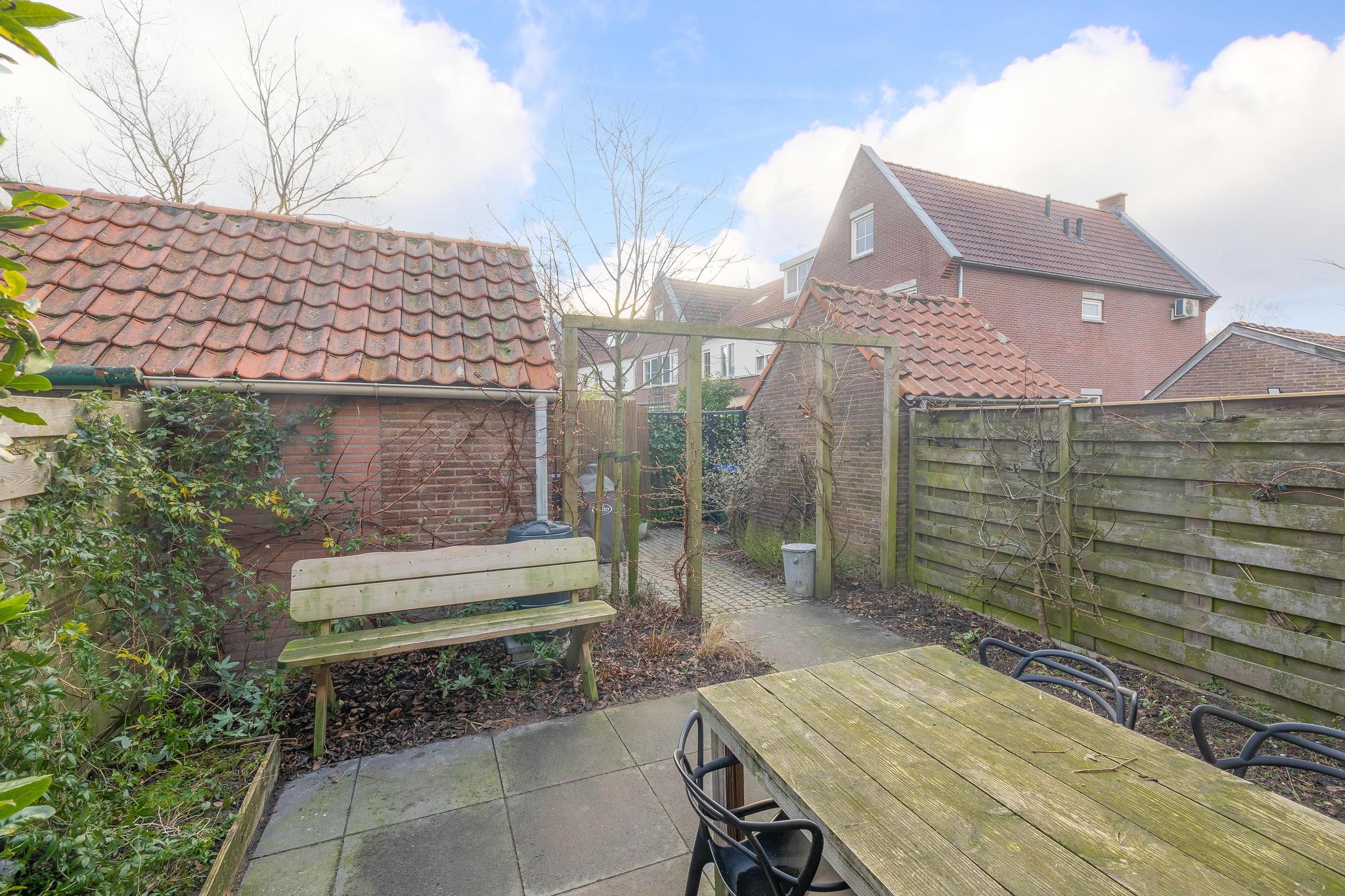 De zonnige achtertuin is gelegen op het zuiden en voorzien een vrijstaande, stenen schuur voorzien van elektra. Een poort leidt naar het pad achterom.