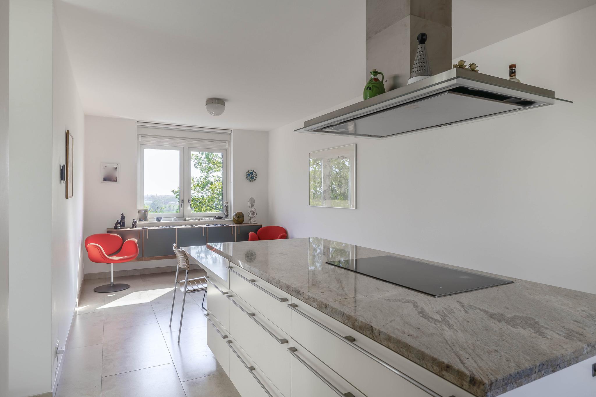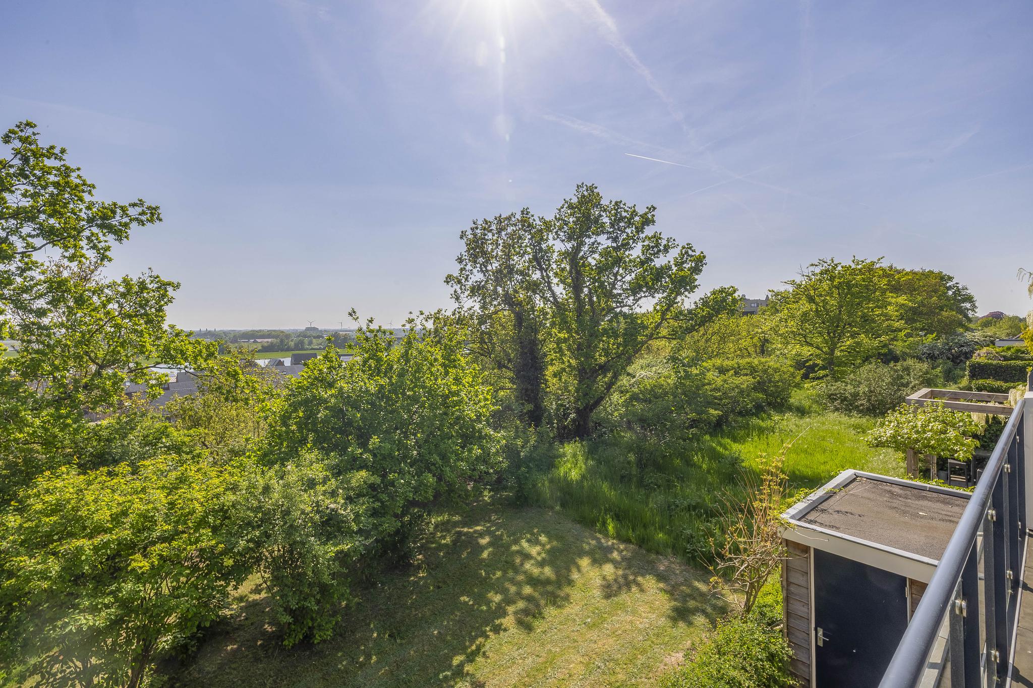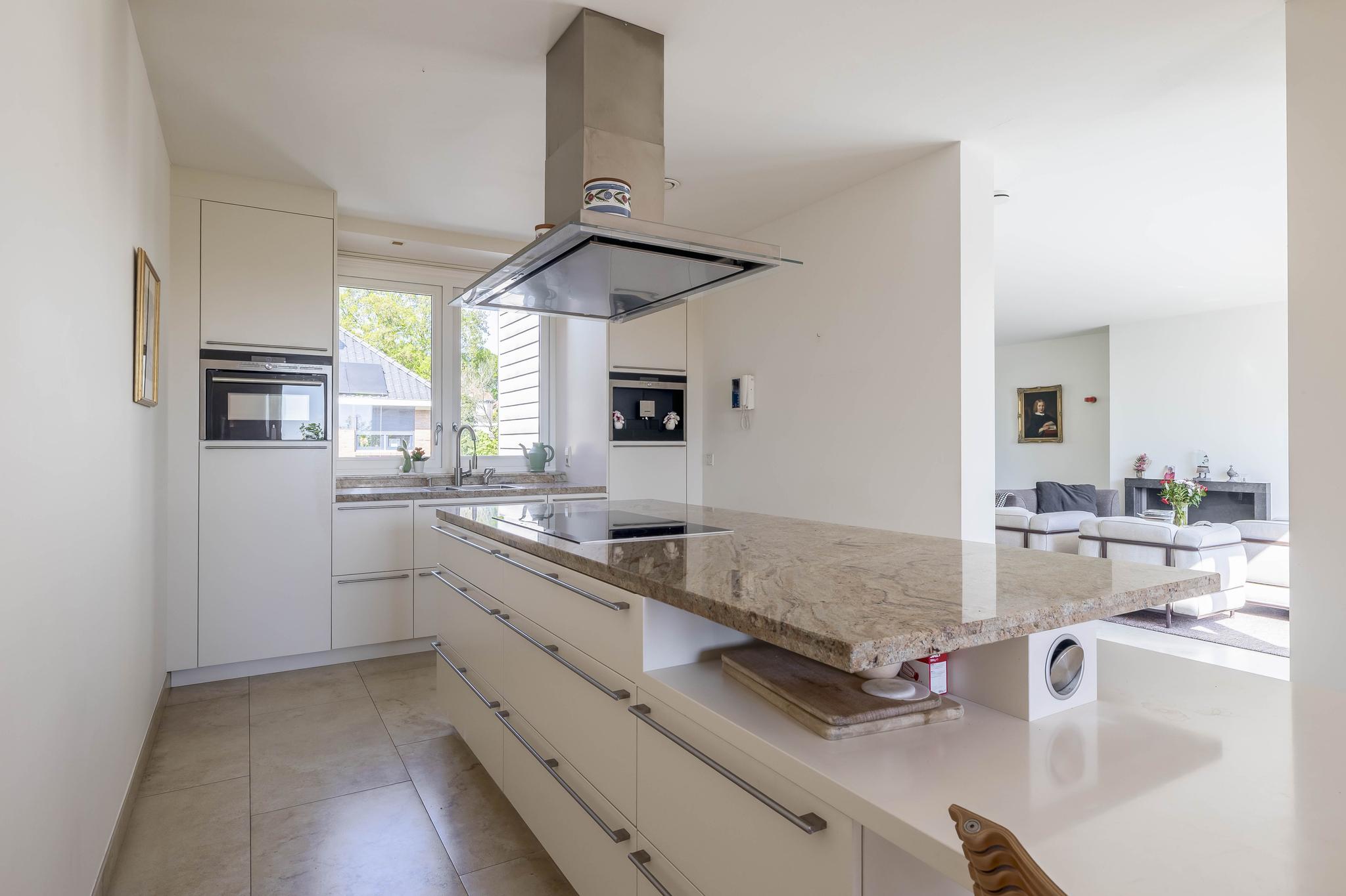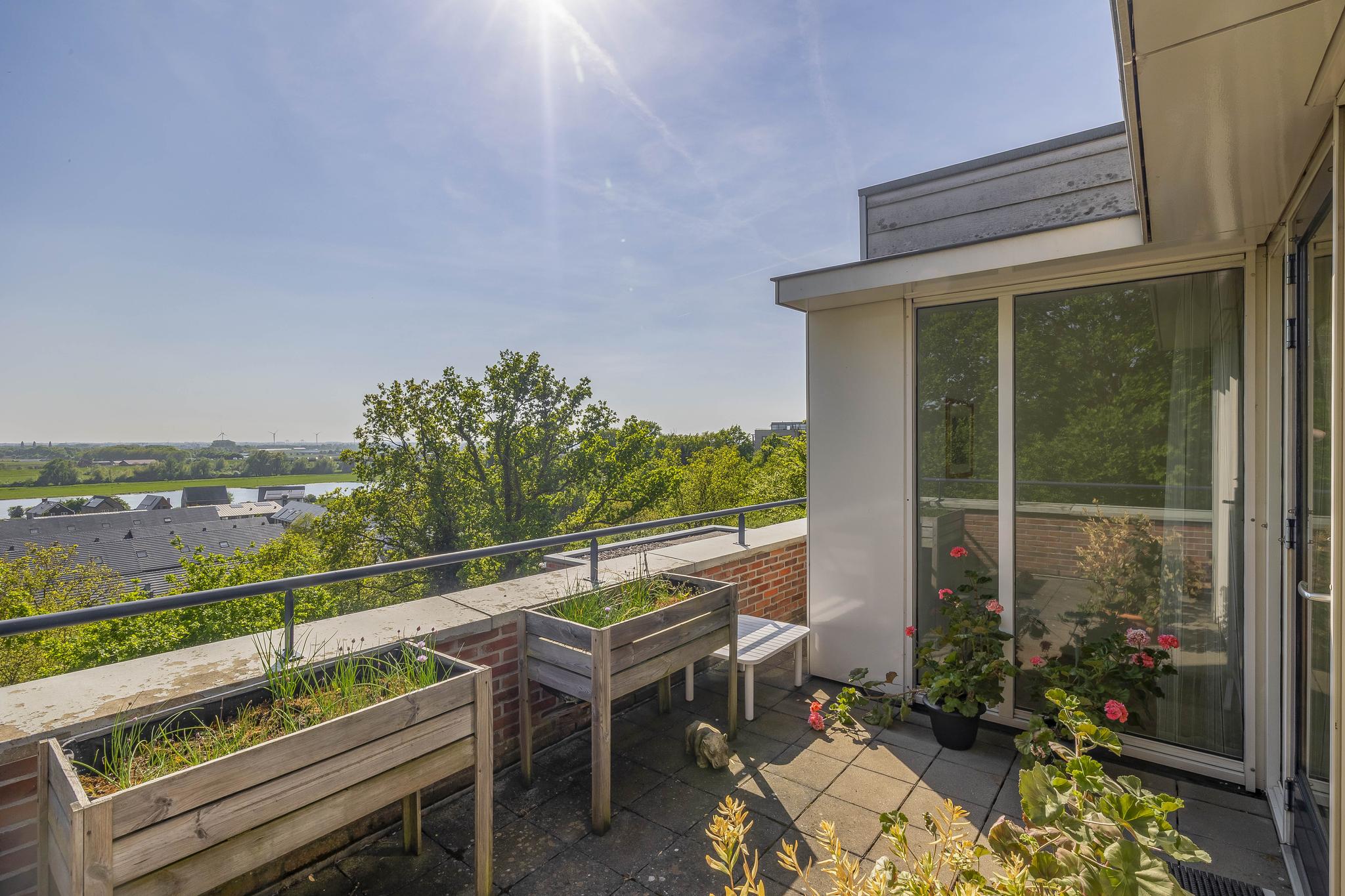 1e verdieping: Opvallend lichte living die is gesitueerd richting de terraszijde, waardoor er een prachtig uitzicht is op de groene omgeving, het naastgelegen meer en de Betuwe aan de horizon. De living beschikt over een strak vormgegeven schouw met gashaard en een brede schuifpui naar het dakterras. De half open keuken heeft een royaal kookeiland met RVS afzuigschouw, vaatwasser en veel kastruimte in de extra brede laden en werkruimte op het natuurstenen werkblad. In het wandmeubel bevinden zich o.a. een combi-oven, koelkast en koffiemachine. Het kookeiland is op een fraaie wijze “verlengd” met een tafelblad, waardoor het mogelijk is met meerdere personen bij de kookplaat plaats te nemen. Het grote terras (circa 20m²) is gelegen op het zuiden en biedt adembenemend uitzicht, privacy en volop zon. Via een portaal is er ook op deze verdieping toegang tot een toiletruimte.