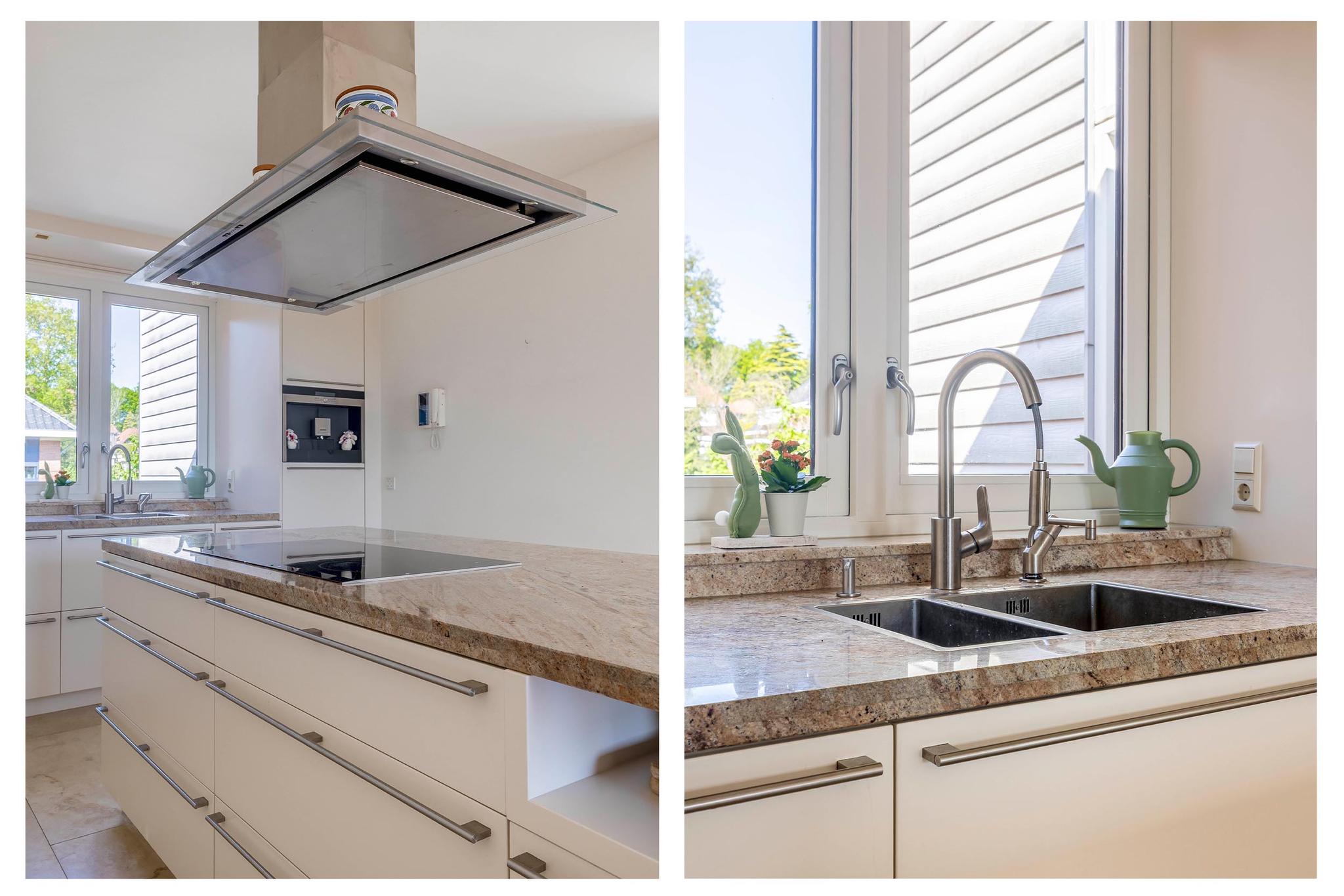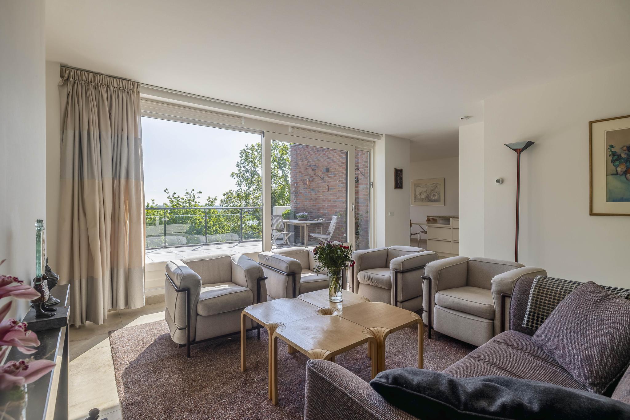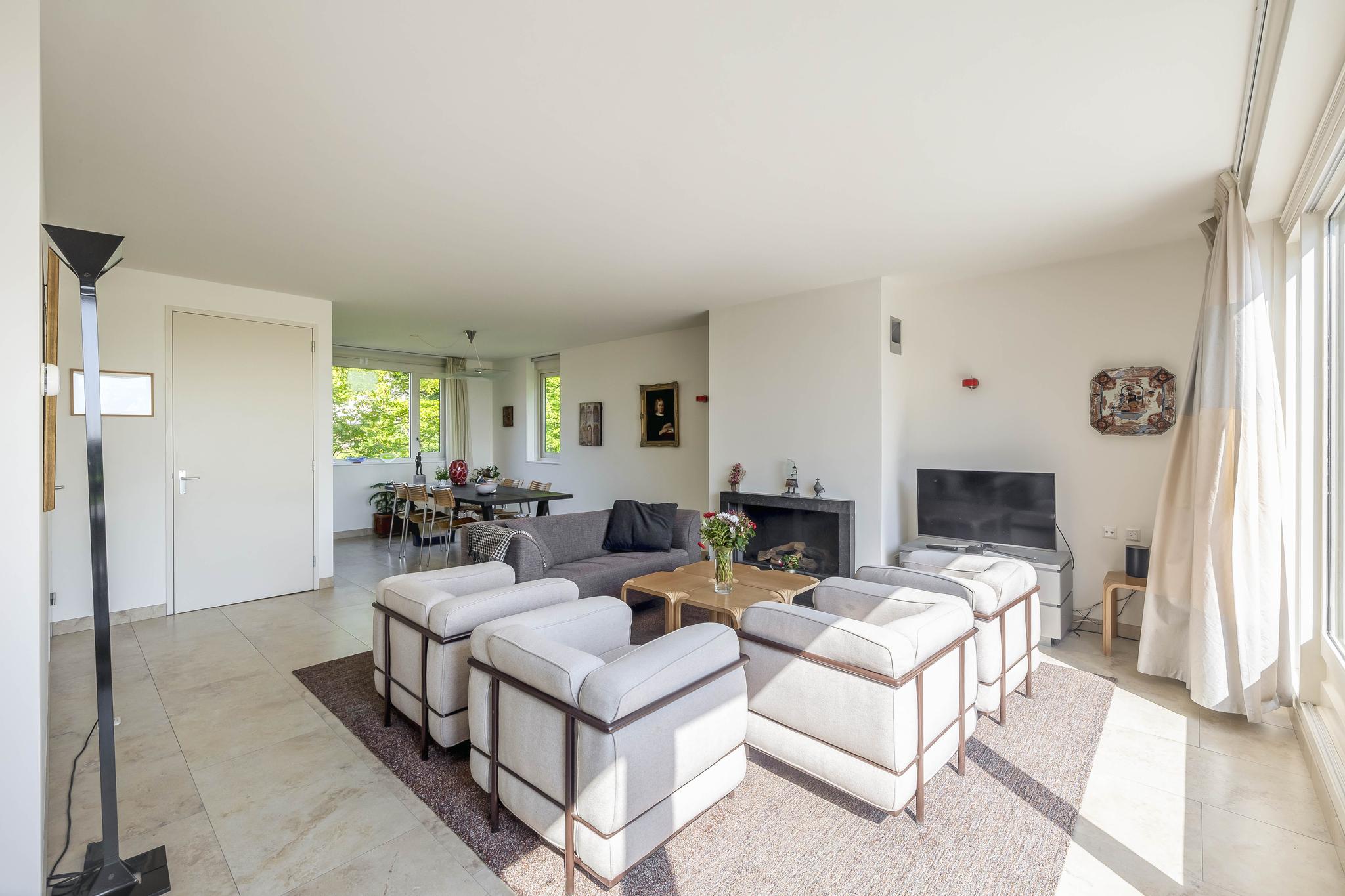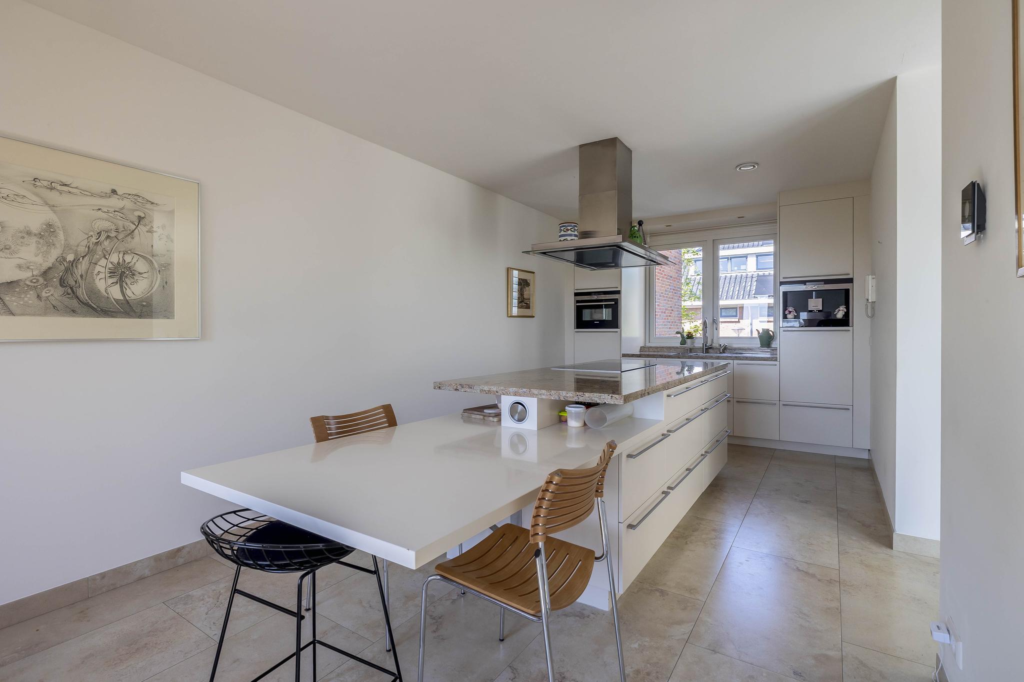 1e verdieping: Opvallend lichte living die is gesitueerd richting de terraszijde, waardoor er een prachtig uitzicht is op de groene omgeving, het naastgelegen meer en de Betuwe aan de horizon. De living beschikt over een strak vormgegeven schouw met gashaard en een brede schuifpui naar het dakterras. De half open keuken heeft een royaal kookeiland met RVS afzuigschouw, vaatwasser en veel kastruimte in de extra brede laden en werkruimte op het natuurstenen werkblad. In het wandmeubel bevinden zich o.a. een combi-oven, koelkast en koffiemachine. Het kookeiland is op een fraaie wijze “verlengd” met een tafelblad, waardoor het mogelijk is met meerdere personen bij de kookplaat plaats te nemen. Het grote terras (circa 20m²) is gelegen op het zuiden en biedt adembenemend uitzicht, privacy en volop zon. Via een portaal is er ook op deze verdieping toegang tot een toiletruimte.