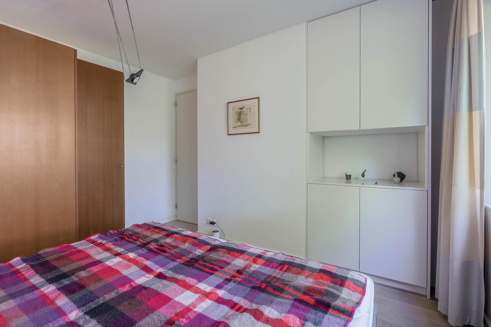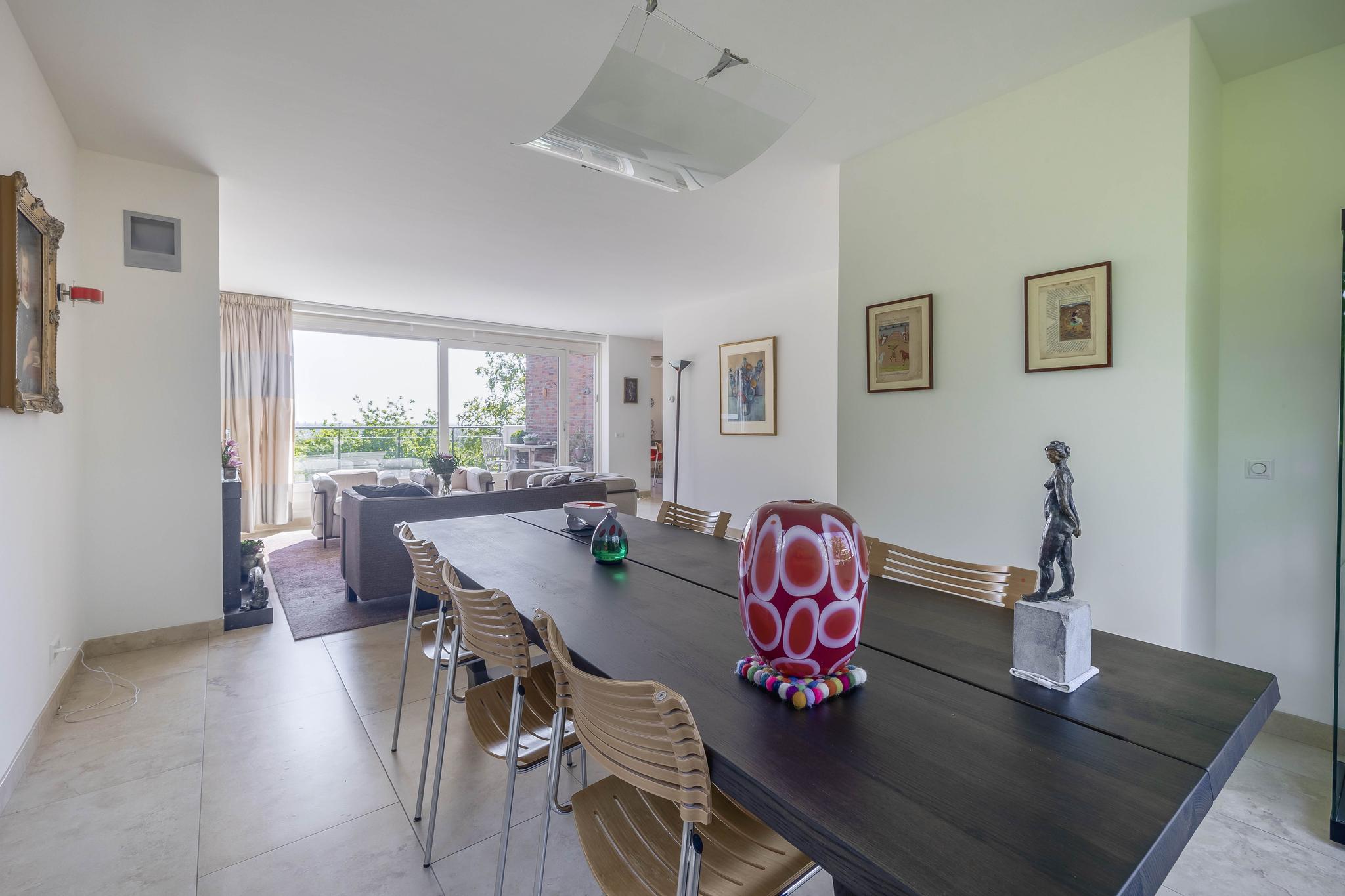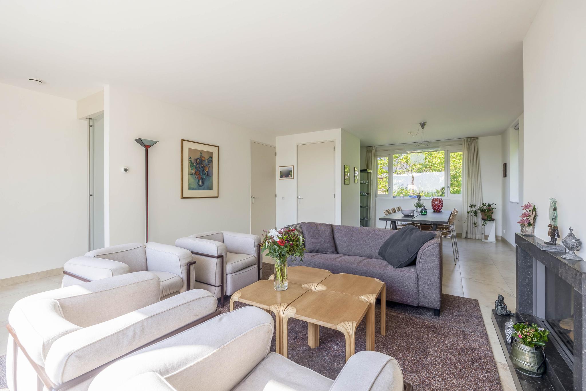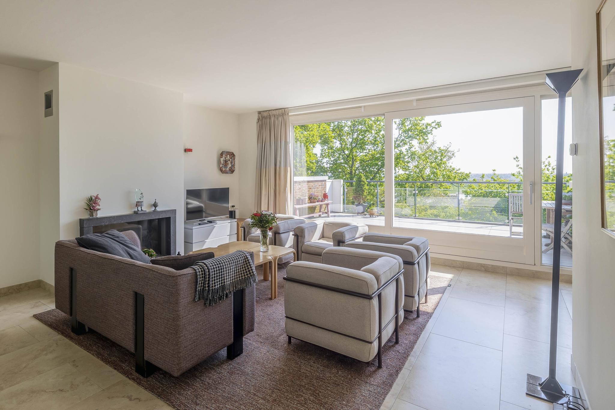 1e verdieping: Opvallend lichte living die is gesitueerd richting de terraszijde, waardoor er een prachtig uitzicht is op de groene omgeving, het naastgelegen meer en de Betuwe aan de horizon. De living beschikt over een strak vormgegeven schouw met gashaard en een brede schuifpui naar het dakterras. De half open keuken heeft een royaal kookeiland met RVS afzuigschouw, vaatwasser en veel kastruimte in de extra brede laden en werkruimte op het natuurstenen werkblad. In het wandmeubel bevinden zich o.a. een combi-oven, koelkast en koffiemachine. Het kookeiland is op een fraaie wijze “verlengd” met een tafelblad, waardoor het mogelijk is met meerdere personen bij de kookplaat plaats te nemen. Het grote terras (circa 20m²) is gelegen op het zuiden en biedt adembenemend uitzicht, privacy en volop zon. Via een portaal is er ook op deze verdieping toegang tot een toiletruimte.