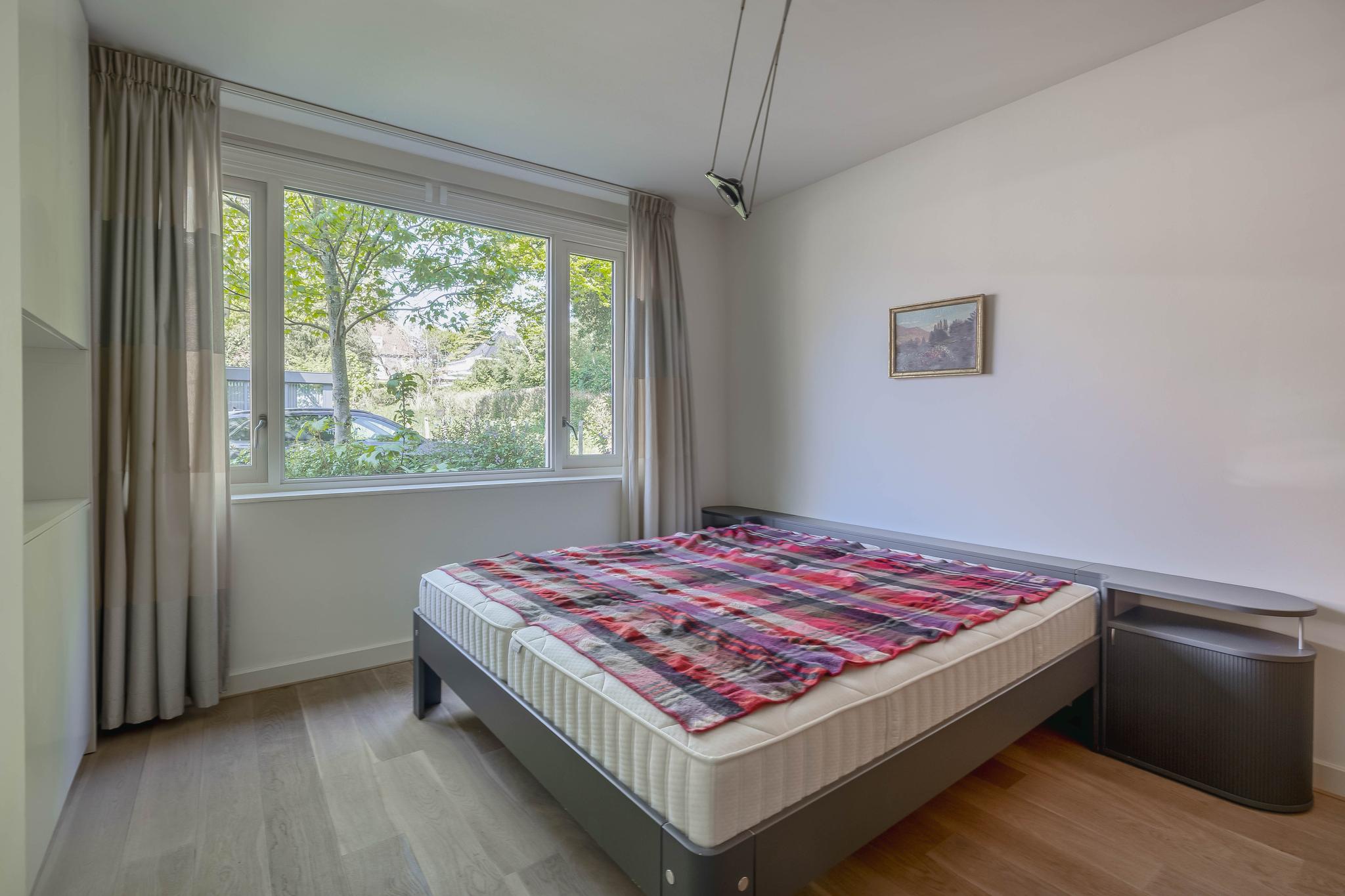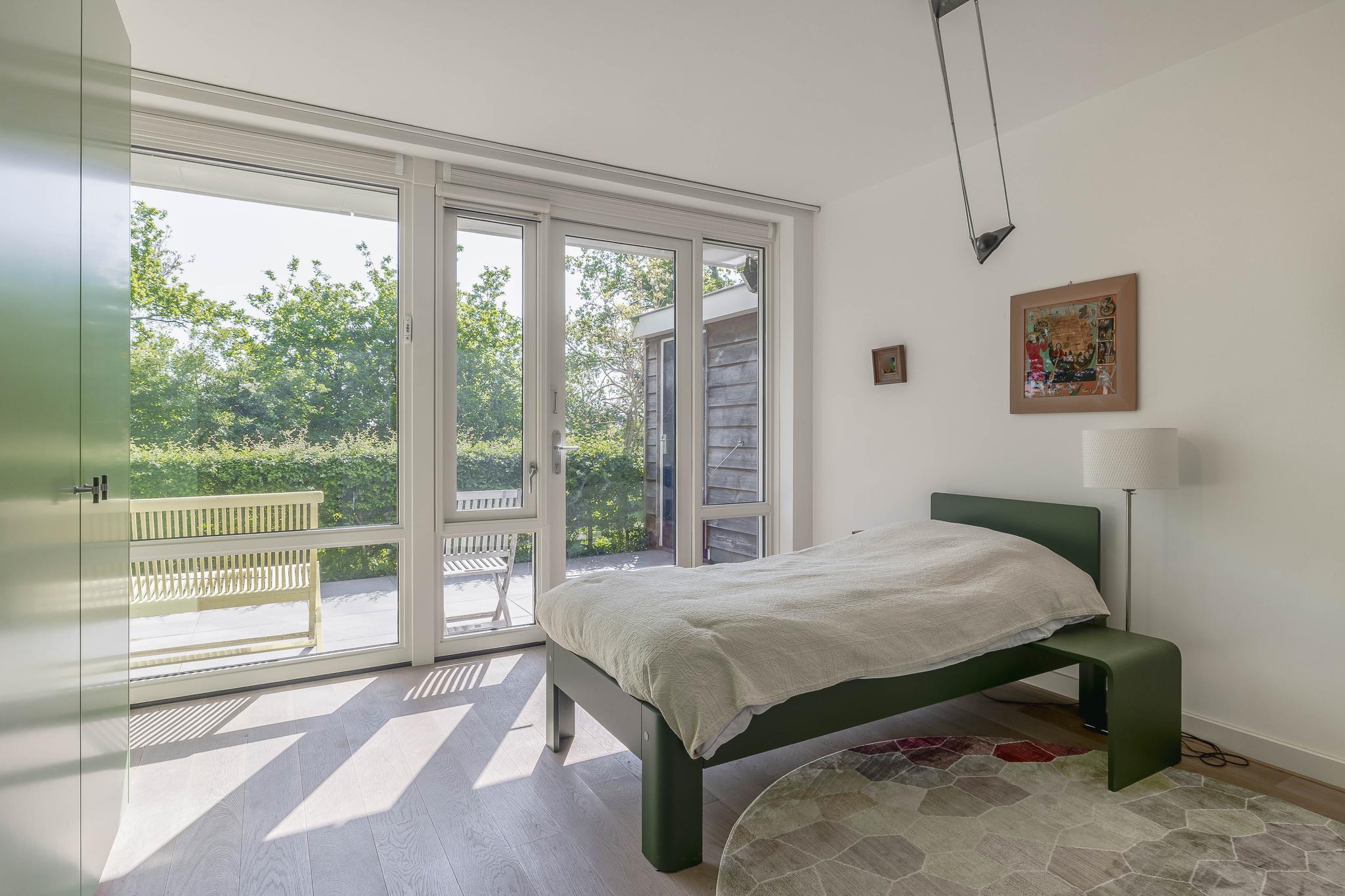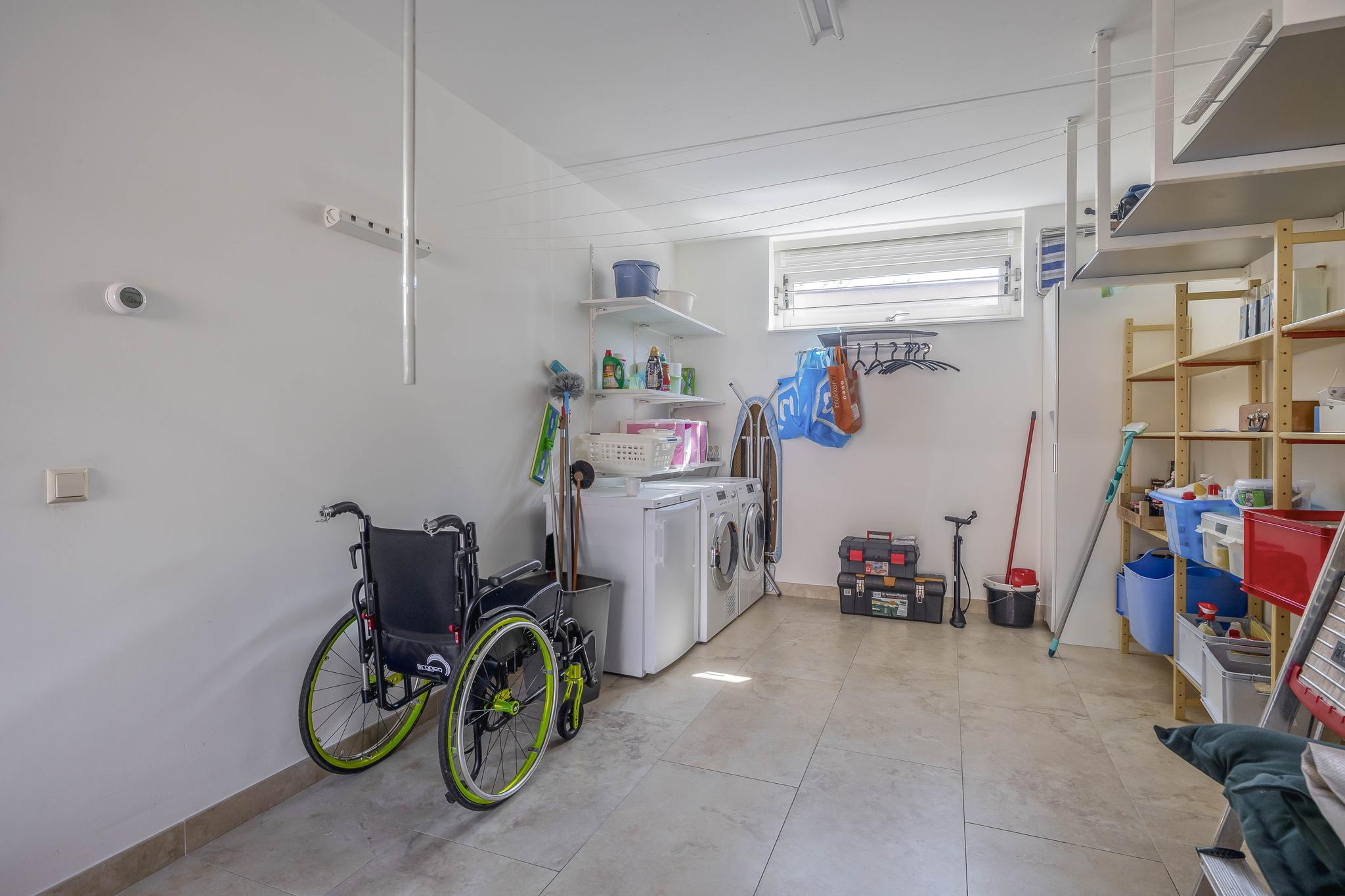 Begane grond: Royale entree/hal met fraaie vloertegels en garderobekast, opengewerkte trapopgang en toegang tot alle vertrekken. Aan de straatzijde bevindt zich een ruime slaap-/studeerkamer met kastenwand. Aan de tuinzijde is de ouderslaapkamer gesitueerd die is voorzien van een op maat gemaakte kastenwand en garderobemeubel en een deur naar het terras. Dit terras grenst letterlijk aan de natuur. Vanuit de slaapkamer is het slechts enkele stappen lopen naar de naastgelegen badkamer waar we een complete wellness aantreffen. Bij binnenkomst treffen we een royaal duo ligbad (met jetstreams), wastafel met spiegelkast (over de gehele breedte) en een vrij-hangende toilet “om de hoek”. De royale inloopdouche-/stoomruimte wordt afgesloten door een glazen deur, waardoor er verbinding met het centrale deel van de badkamer is. Datzelfde geldt voor de saunaruimte die ondanks de afsluitbaarheid visueel mooi in verbinding staat met de badkamer en zelfs met de naastgelegen ouderslaapkamer via een glazen pui in het hogere deel van de saunaruimte. De sauna is uitgevoerd in red cedar en er kan worden gekozen voor de traditionele “Finse” wijze (met kachels) of infrarood. Vanuit de centrale hal is er tot slot binnendoor toegang tot de geïsoleerde garage met elektrische sectionaaldeur en aansluitingen voor wasmachine en droger en omvormer voor de zonnepanelen.