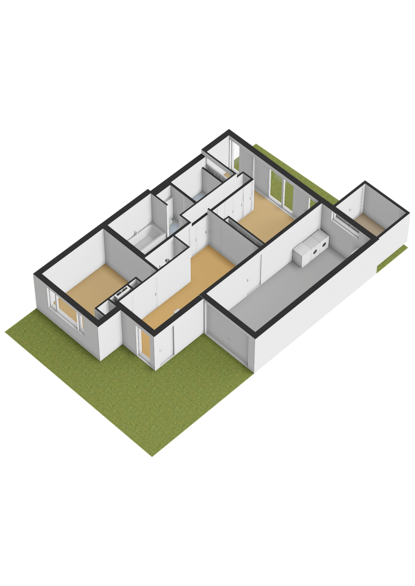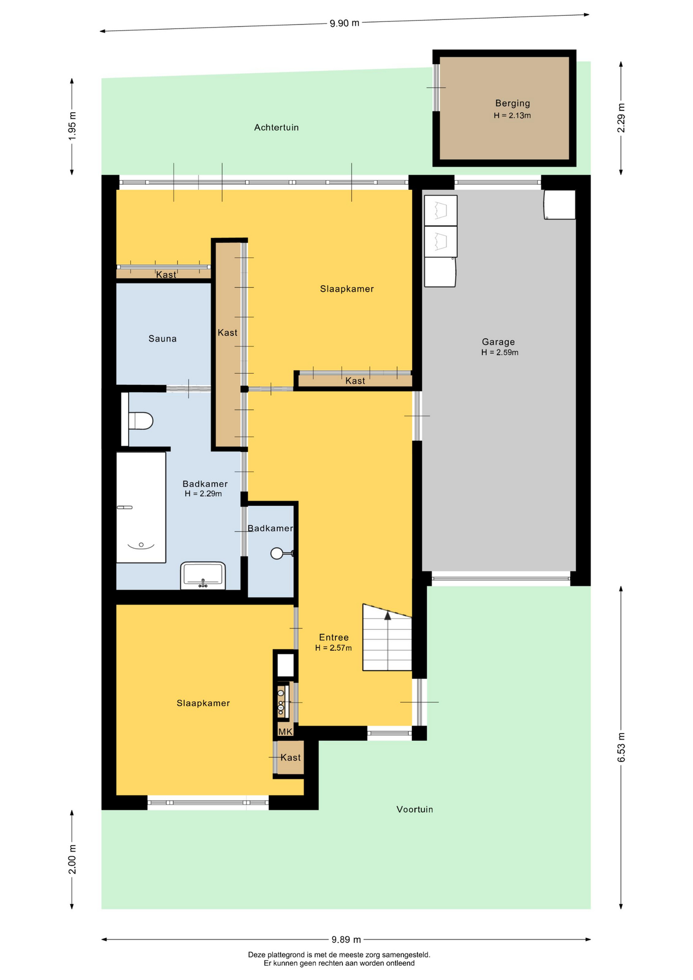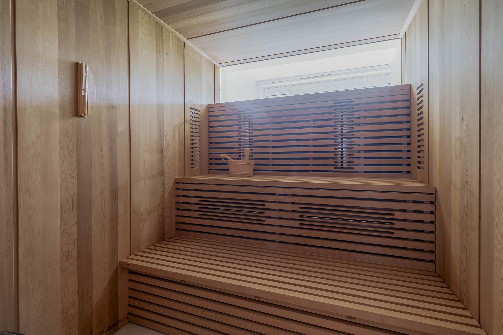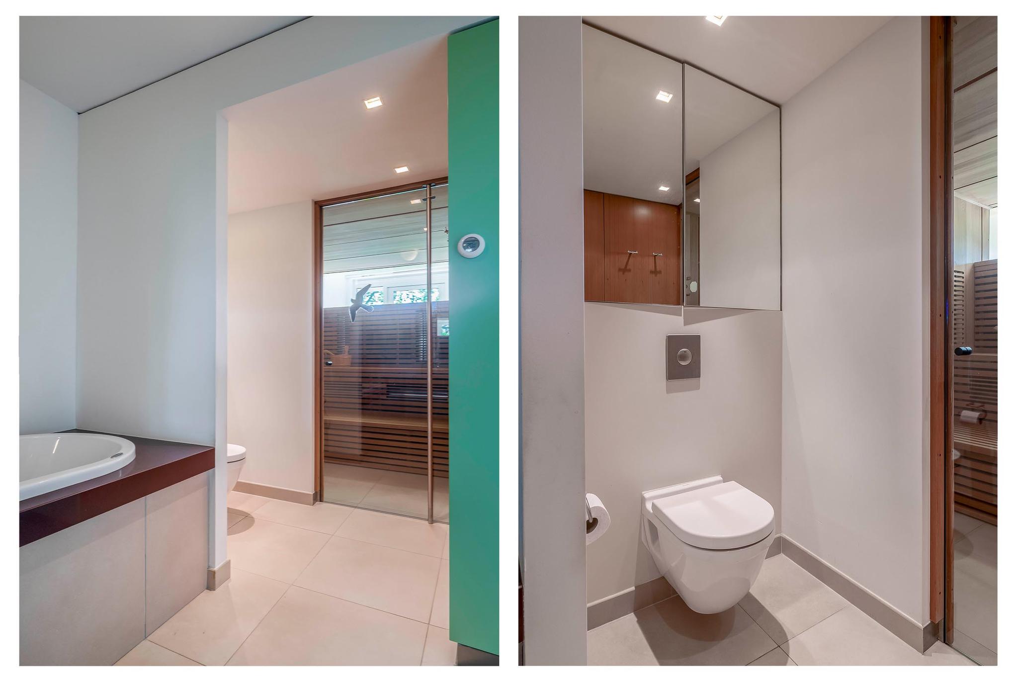 Begane grond: Royale entree/hal met fraaie vloertegels en garderobekast, opengewerkte trapopgang en toegang tot alle vertrekken. Aan de straatzijde bevindt zich een ruime slaap-/studeerkamer met kastenwand. Aan de tuinzijde is de ouderslaapkamer gesitueerd die is voorzien van een op maat gemaakte kastenwand en garderobemeubel en een deur naar het terras. Dit terras grenst letterlijk aan de natuur. Vanuit de slaapkamer is het slechts enkele stappen lopen naar de naastgelegen badkamer waar we een complete wellness aantreffen. Bij binnenkomst treffen we een royaal duo ligbad (met jetstreams), wastafel met spiegelkast (over de gehele breedte) en een vrij-hangende toilet “om de hoek”. De royale inloopdouche-/stoomruimte wordt afgesloten door een glazen deur, waardoor er verbinding met het centrale deel van de badkamer is. Datzelfde geldt voor de saunaruimte die ondanks de afsluitbaarheid visueel mooi in verbinding staat met de badkamer en zelfs met de naastgelegen ouderslaapkamer via een glazen pui in het hogere deel van de saunaruimte. De sauna is uitgevoerd in red cedar en er kan worden gekozen voor de traditionele “Finse” wijze (met kachels) of infrarood. Vanuit de centrale hal is er tot slot binnendoor toegang tot de geïsoleerde garage met elektrische sectionaaldeur en aansluitingen voor wasmachine en droger en omvormer voor de zonnepanelen.