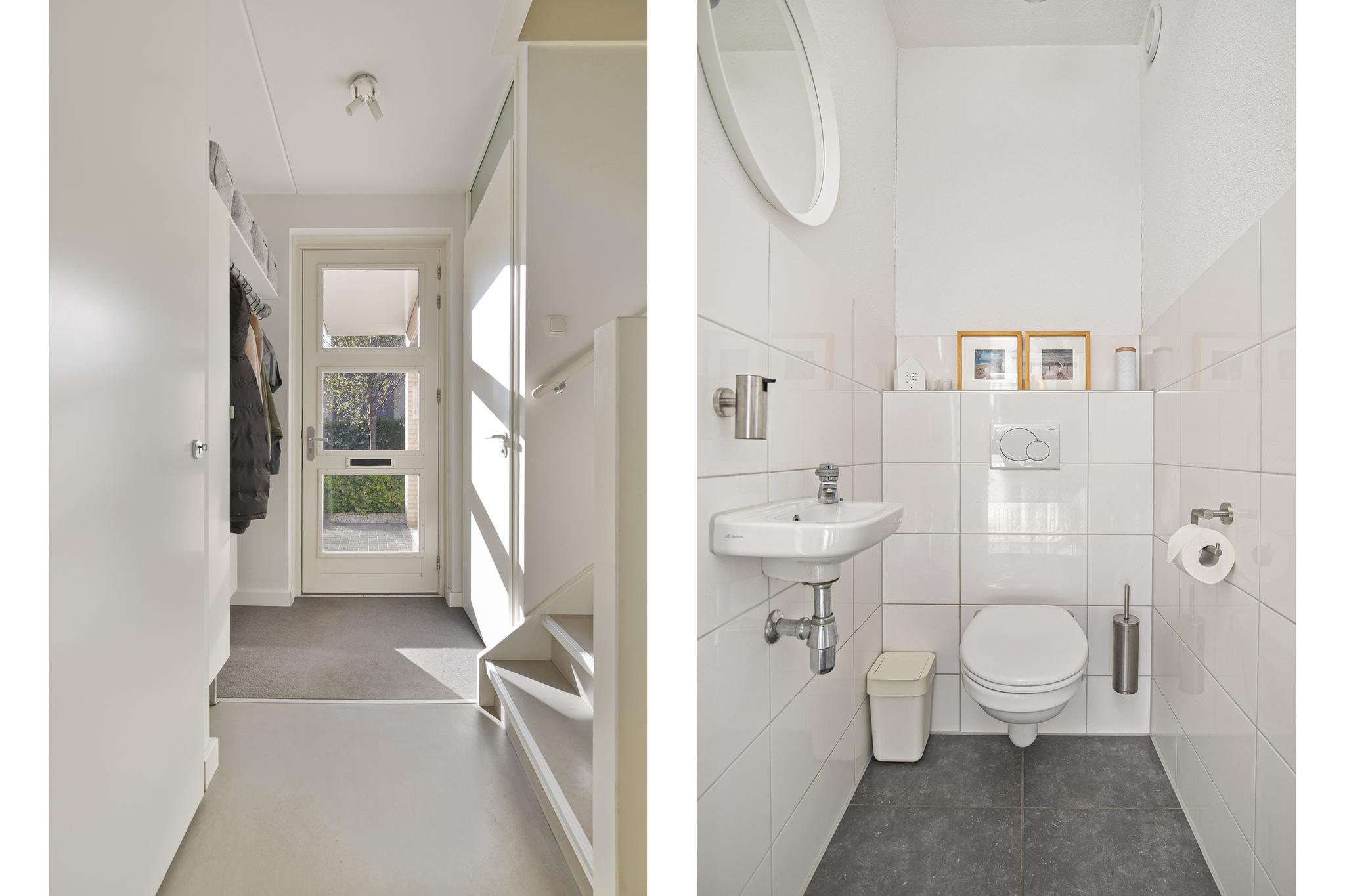Begane grond: overdekte entree; hal met garderobenis; meterkast en warmtewisselaar; wandtoilet met fontein tot de helft betegeld; praktische trapkast; woonkamer met zijgevelraam; aan de achterzijde een woon-/eetkeuken in U-opstelling geplaatst en voorzien van combimagnetron, oven, inductiekookplaat met afzuigkap, vaatwasser en koelkast.