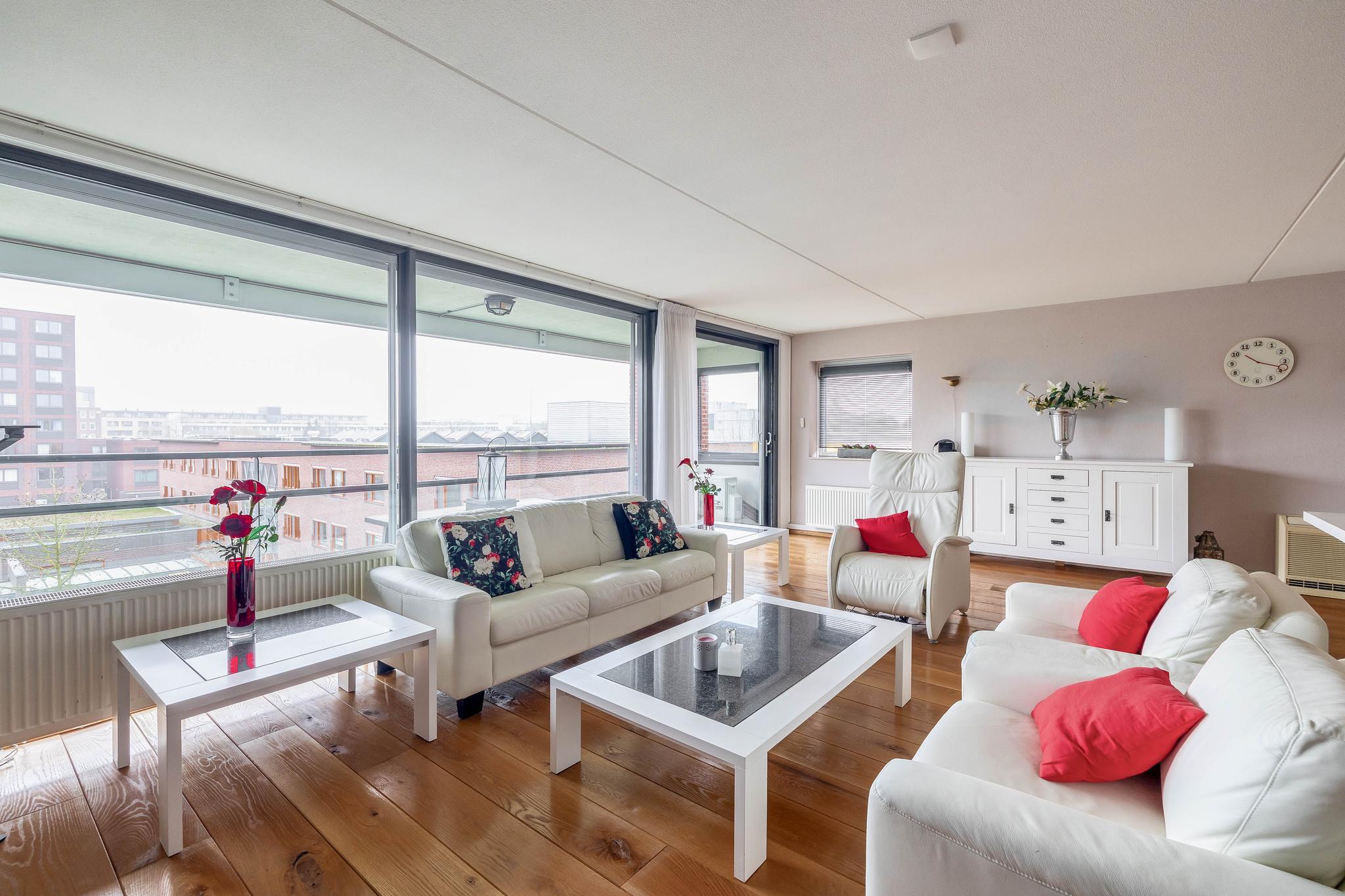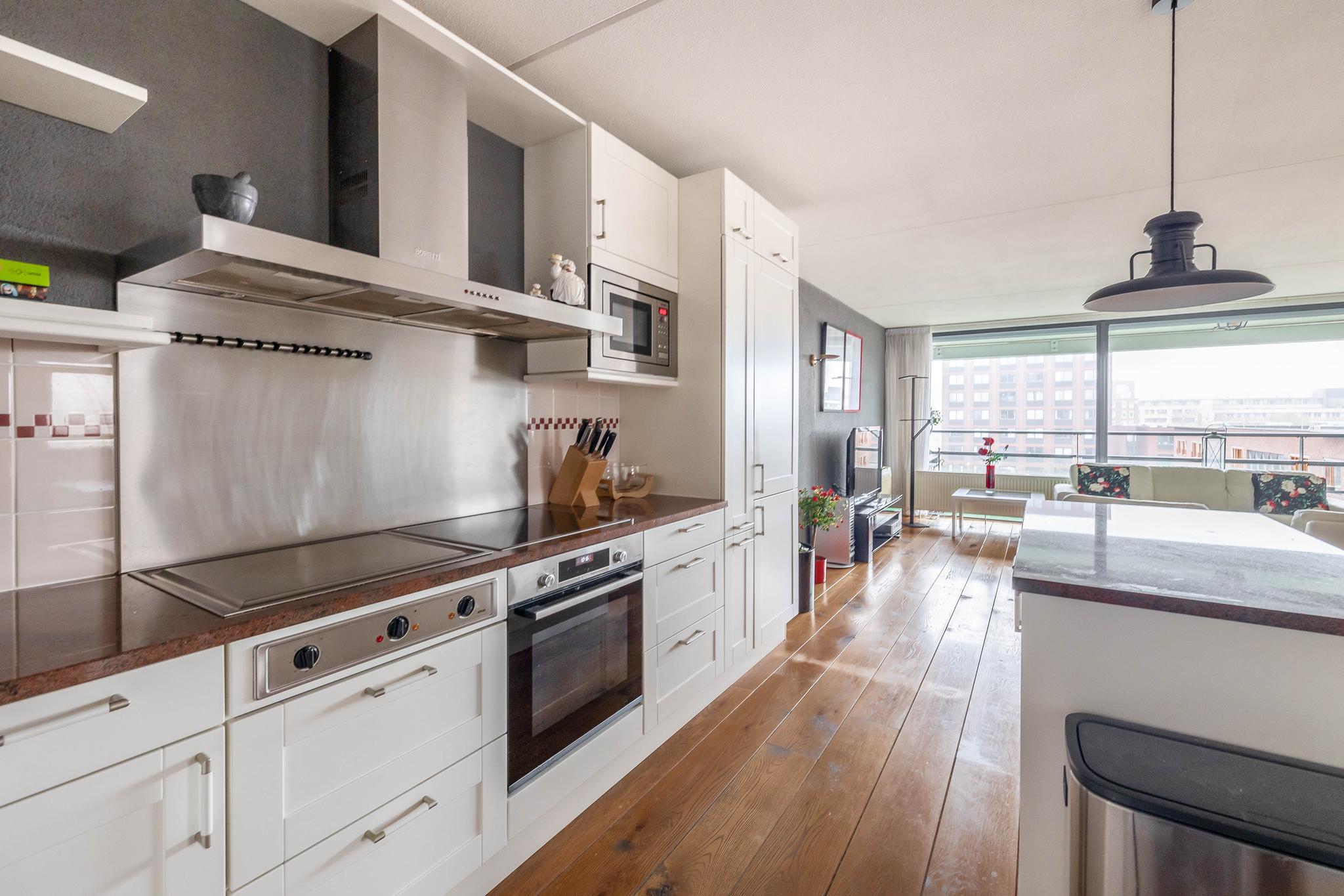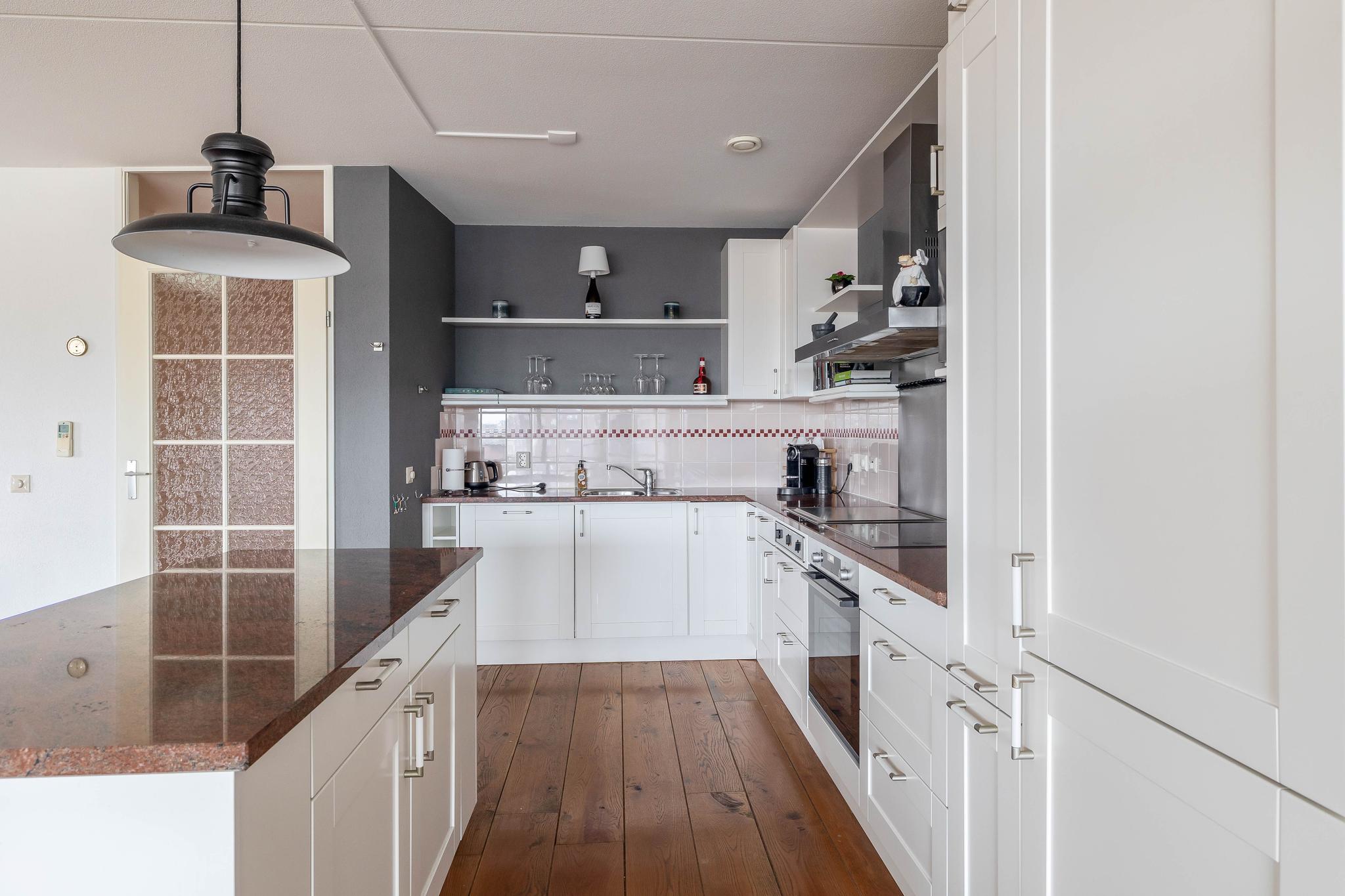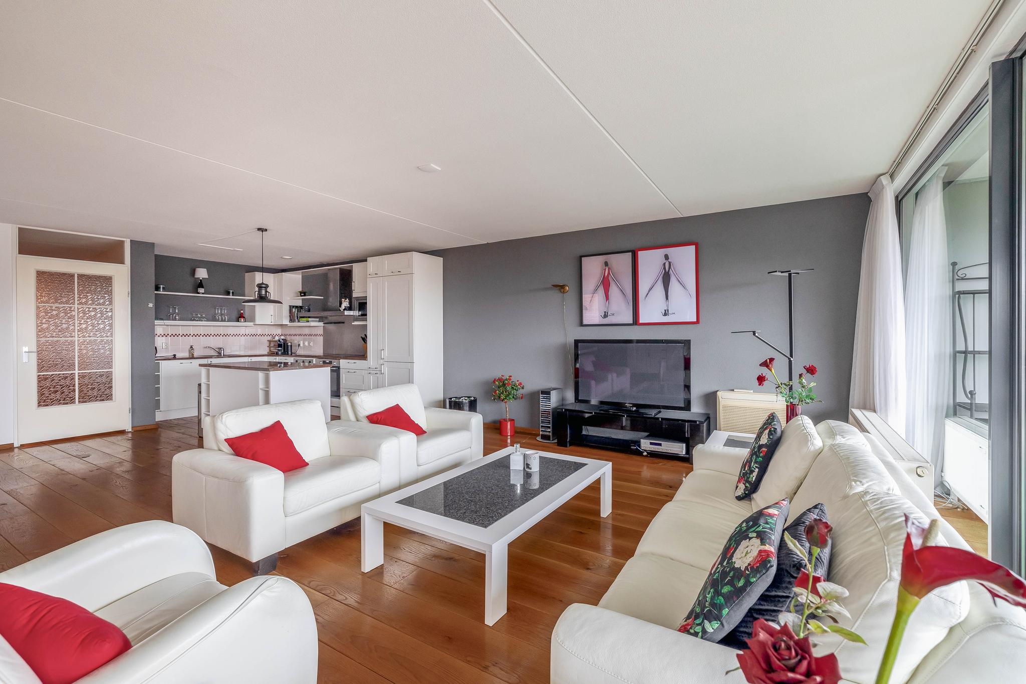 Entree; ruime hal met garderobe; meterkast; berging met c.v. opstelling en wasapparatuur aansluiting; vanuit de hal zijn alle vertrekken bereikbaar; wandcloset met fontein tot de helft betegeld; ruime badkamer tot het plafond betegeld is voorzien van een inloopdouche met drain, wastafel, ligbad en wandcloset; riante woonkamer met over de gehele breedte een schuifpui waardoor het een heerlijke lichte kamer betreft; de schuifpui biedt toegang tot het op het zuidwesten gelegen balkon van maar liefst 17 m²; open keuken uitgevoerd in lichte kleurstelling en heeft een L-opstelling met eiland en v.v. koelkast, vriezer, combi magnetron, oven, zowel een inductie kookplaat als teriyaki plaat met afzuigkap en vaatwasser.