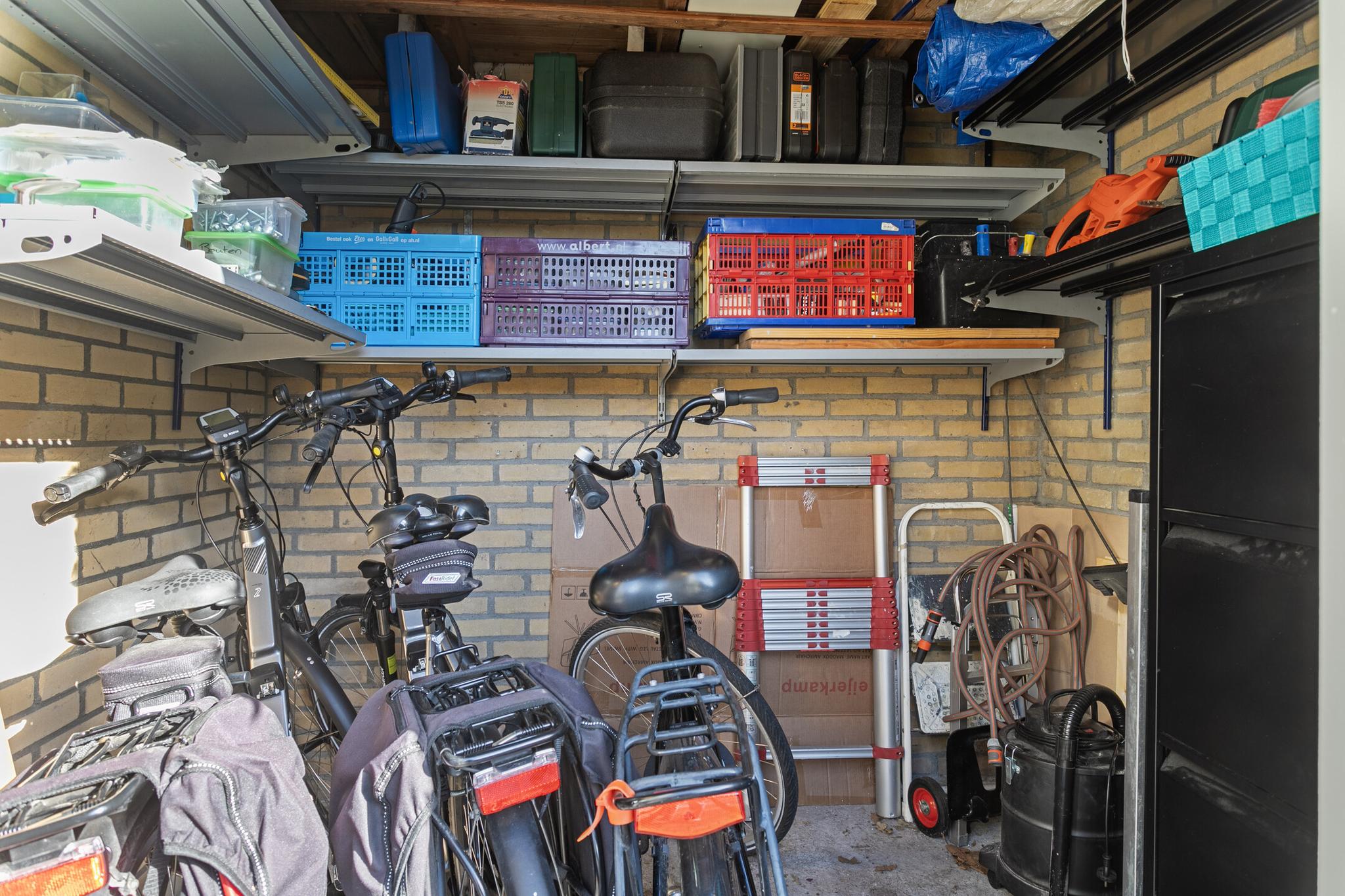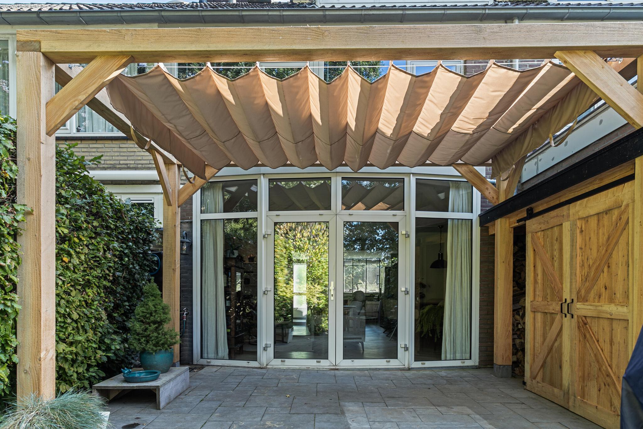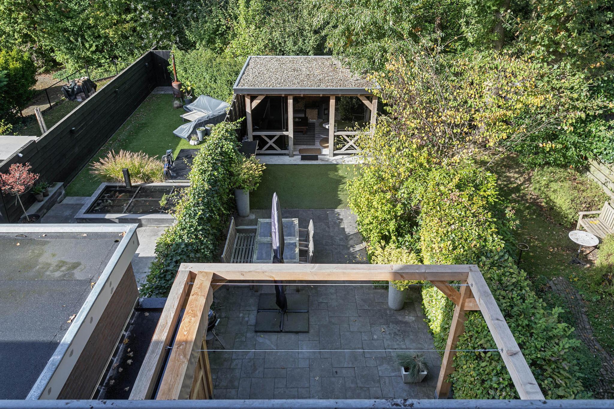– voor in de achtertuin een nieuw geplaatste pergola, ruime tuinkast en opslag voor haardhout.