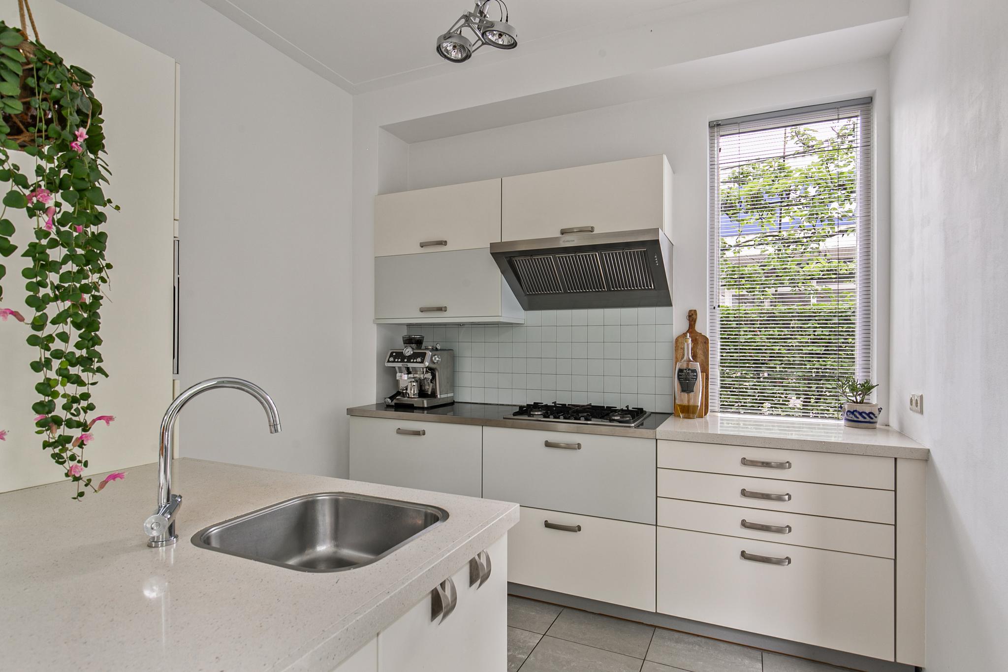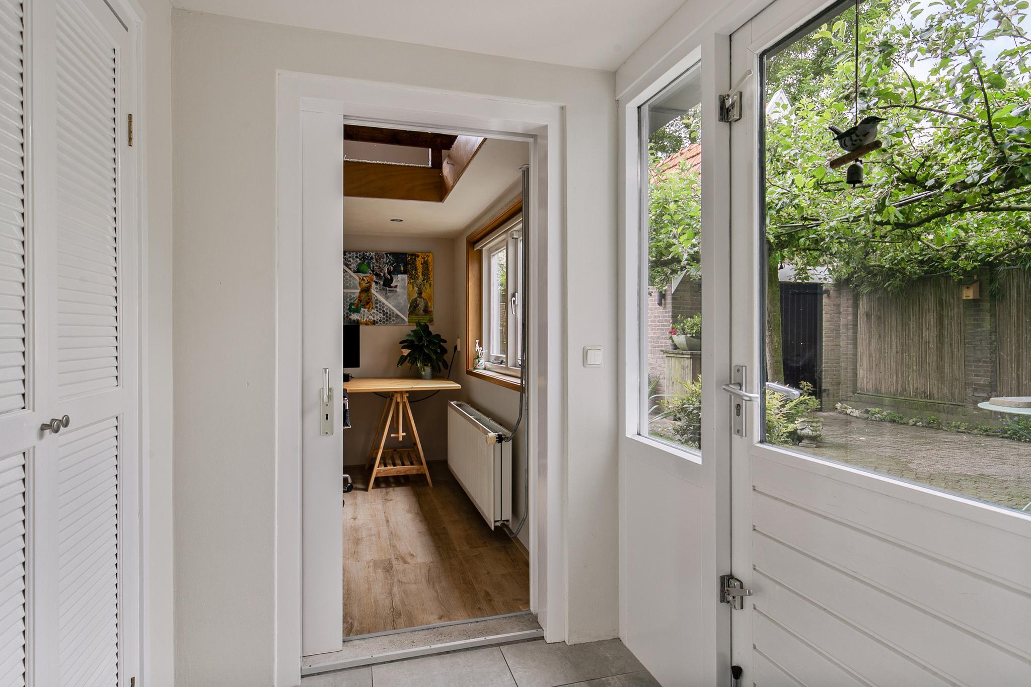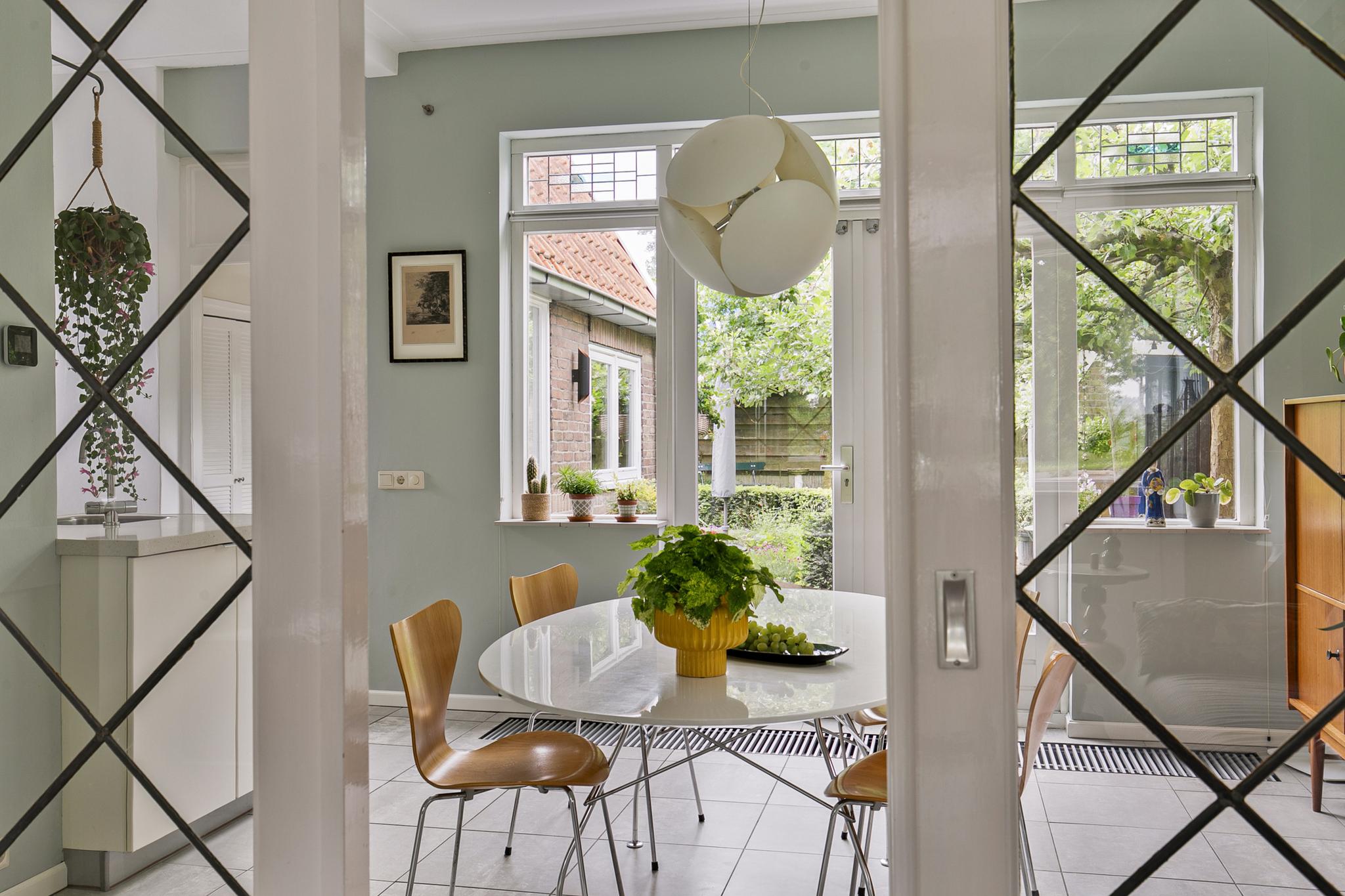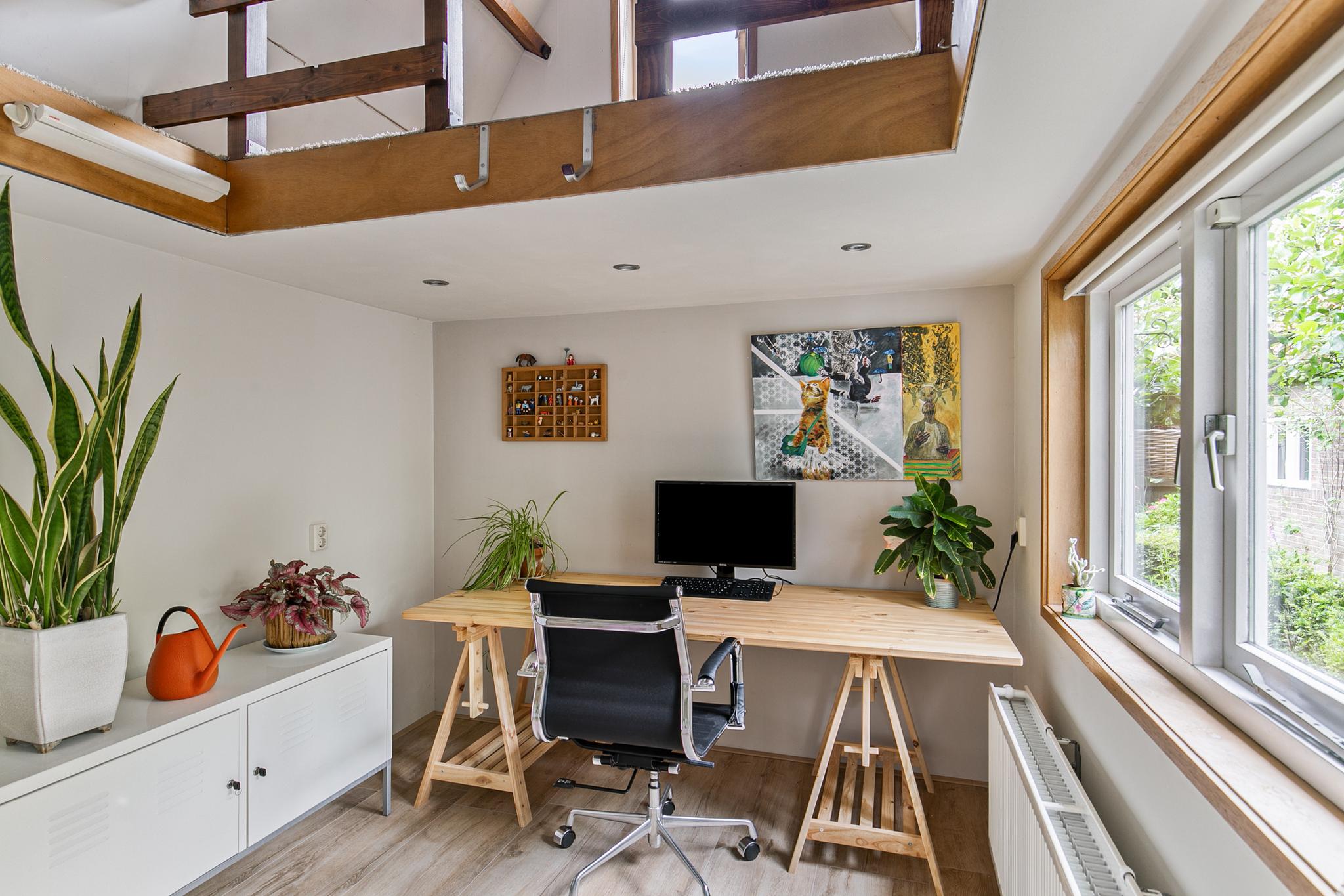 Begane grond: Entree; mooie betegelde hal met meterkast; wandcloset met fontein en raam; verdiepte trapkast; kamer en suite met erker deur en twee glas in lood schuifdeuren; dubbele deuren naar de zonnige tuin; half open keuken uitgevoerd in een lichte kleurstelling in rechte opstelling geplaatst met granieten aanrechtblad en voorzien van diverse inbouwapparatuur, t.w. vaatwasser, koelkast, oven/magnetron, afzuigkap en 5-pits gasfornuis; tussenhal met loopdeur naar de tuin en opstelplaats voor de wasmachine.; aparte werkkamer met vliering en opstelling C.V.-ketel (Atag One HR 2016)