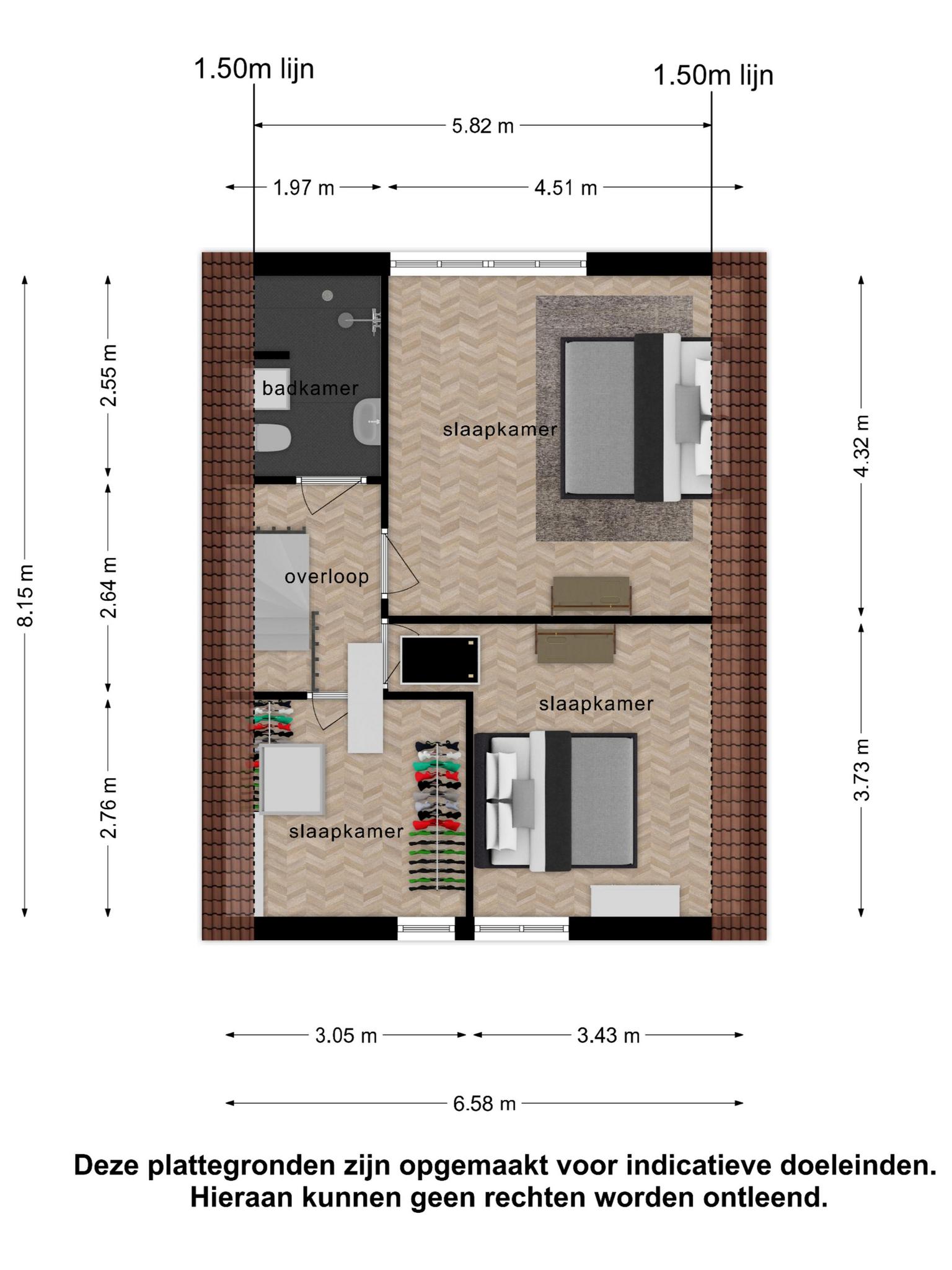1e verdieping: Overloop; slaapkamer I met raam en velux dakvenster; slaapkamer II ; slaapkamer III; badkamer met dakvenster en voorzien van wastafel, wandtoilet, inloopdouche met drain en mechanische ventilatie;