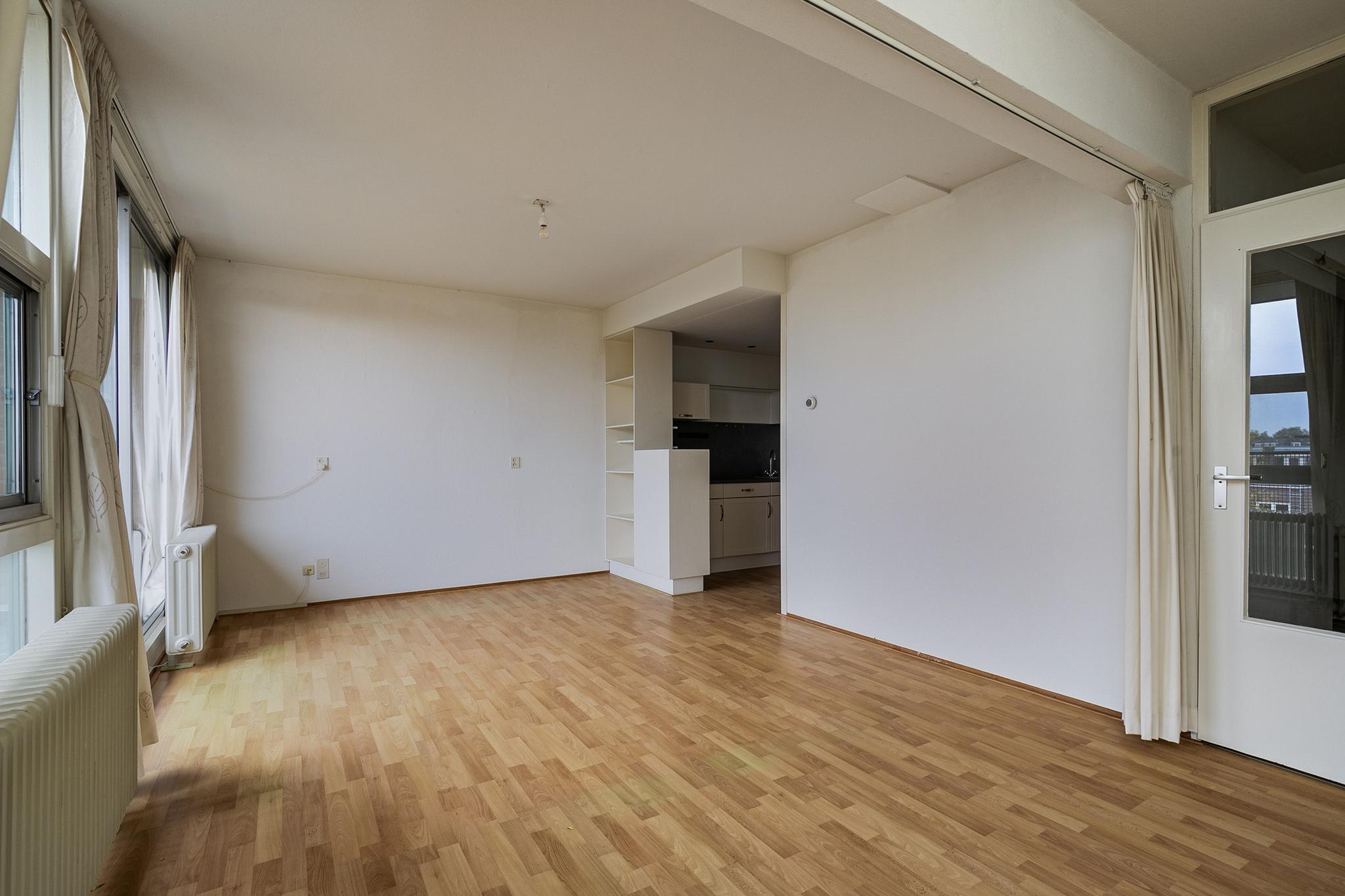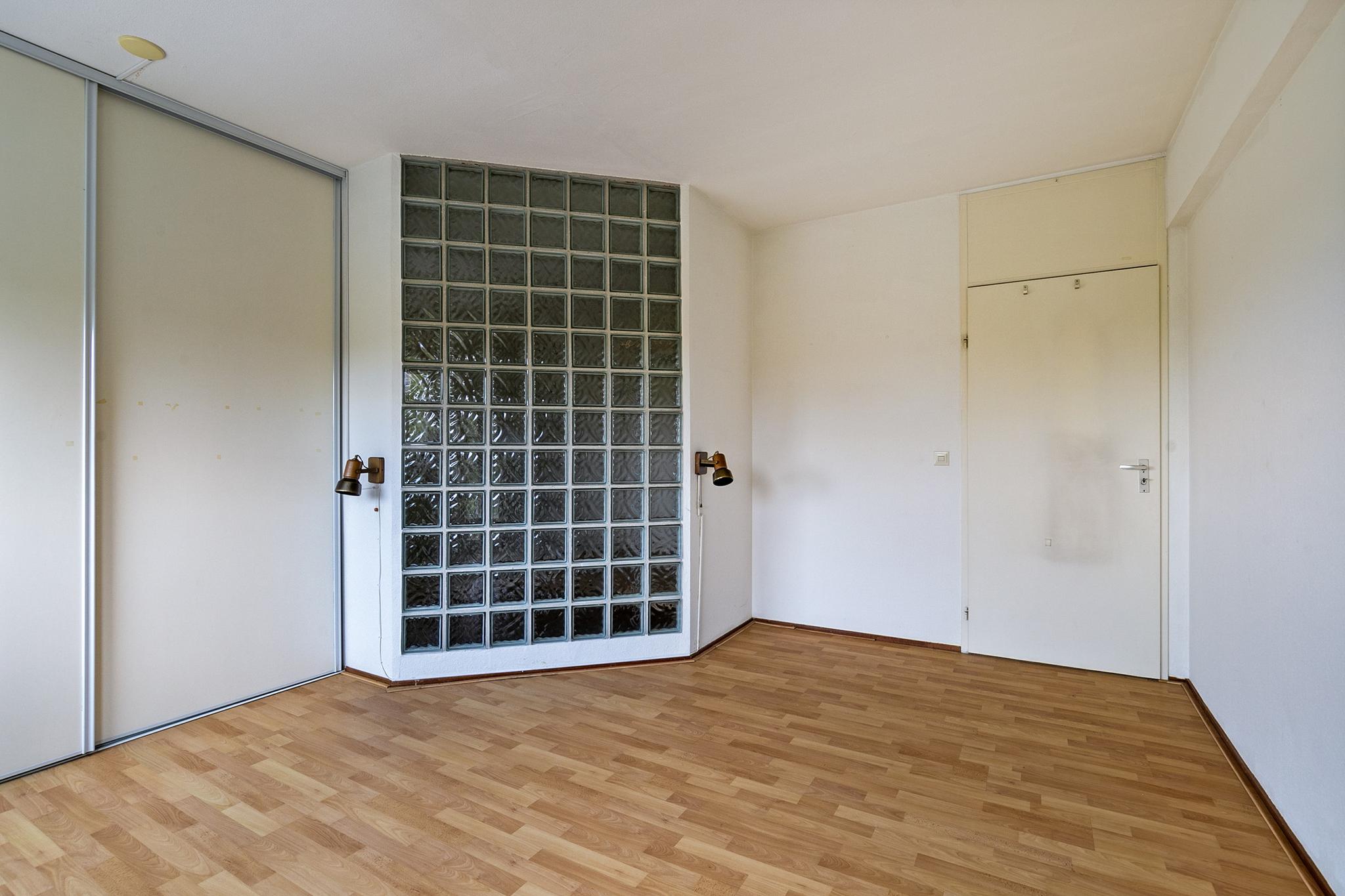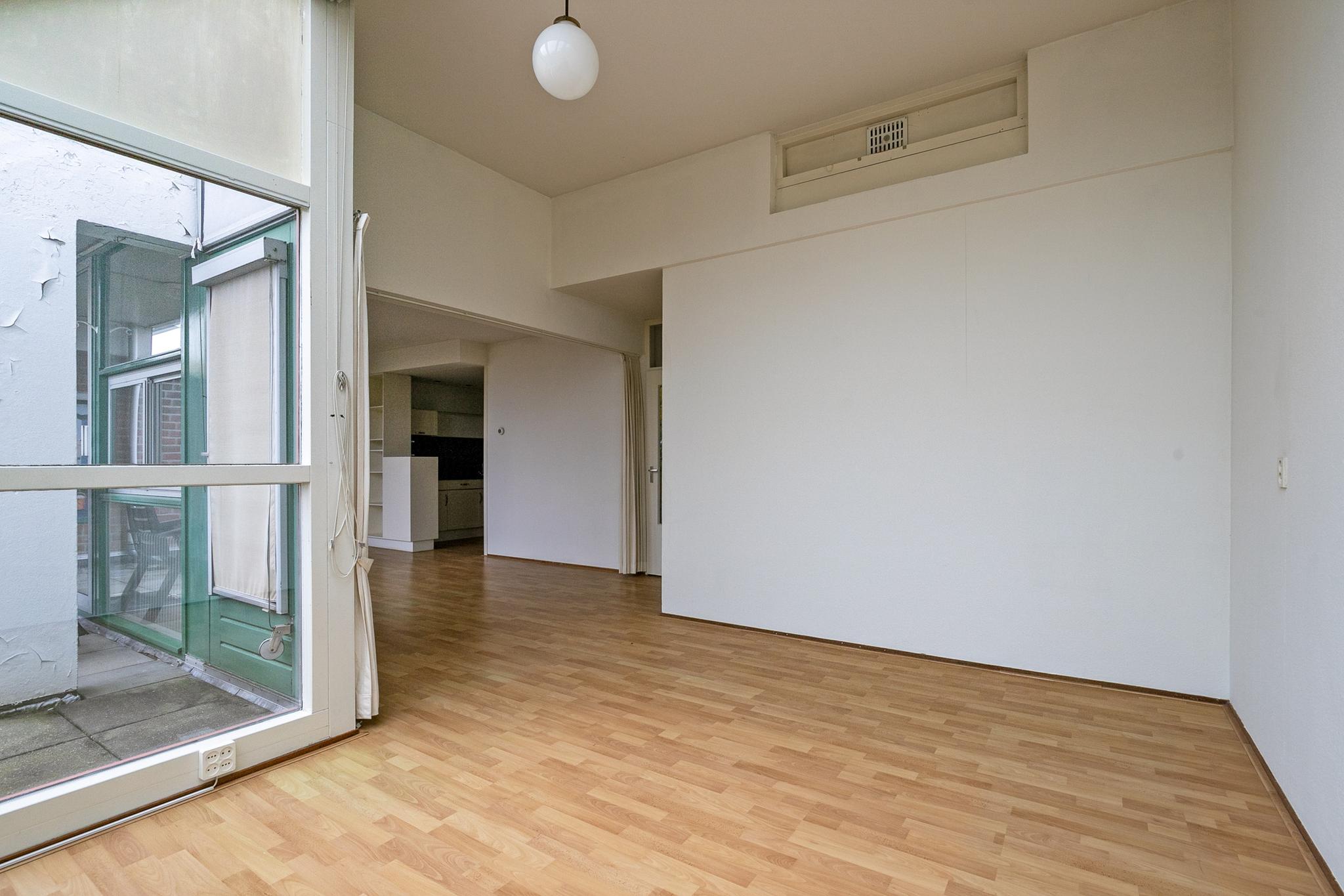 Begane grond: entree; hal met glazen bouwstenen waardoor veel lichtinval; meterkast; toilet met fontein tot plafond betegeld, lichte badkamer tot plafond betegeld voorzien van douchehoek, vaste wastafel, design radiator en wasmachine en wasdroger aansluiting; bijkeuken; slaapkamer I voorzien van dubbel glas en schuifkastenwand, slaapkamer II; half open keuken in 2x rechte opstelling geplaatst en voorzien van diverse inbouwapparatuur, t.w. wasemkap, oven, 4 pits gasfornuis en koelkast; naar terras; brede woonkamer met hoog plafond en veel lichtinval door schuine ramen en schuifpui naar het terras op het zuiden.