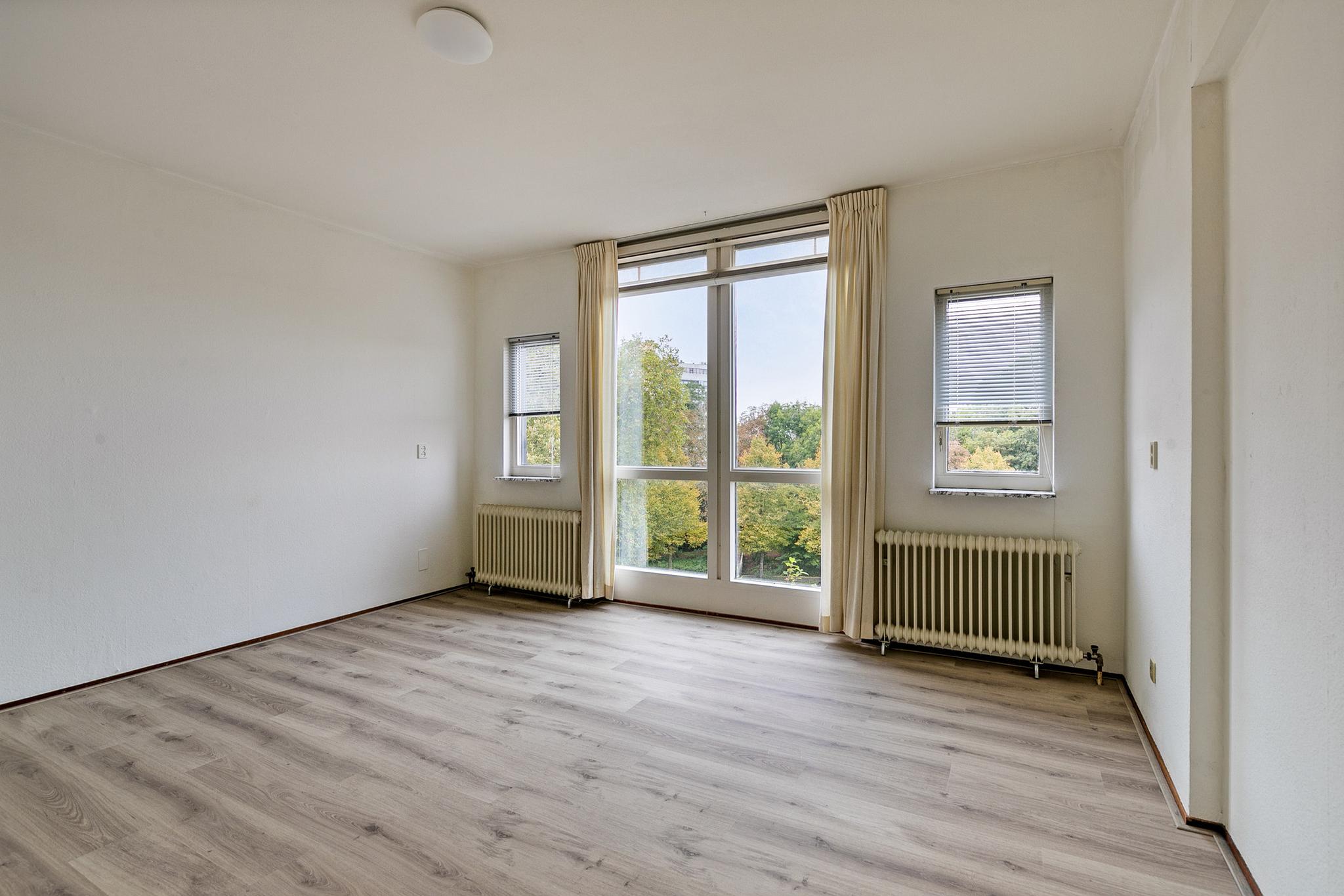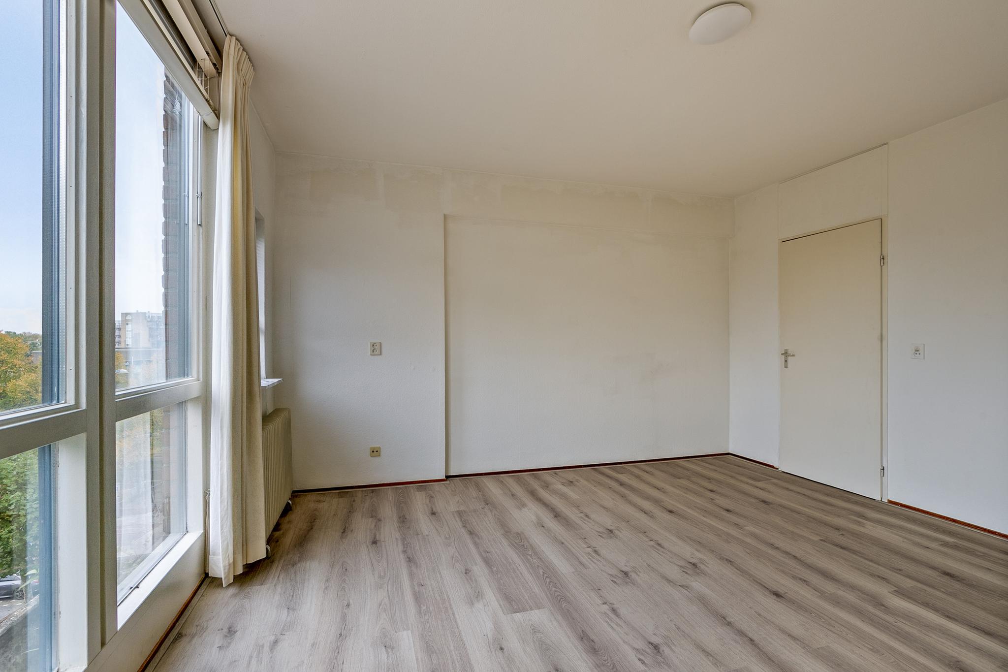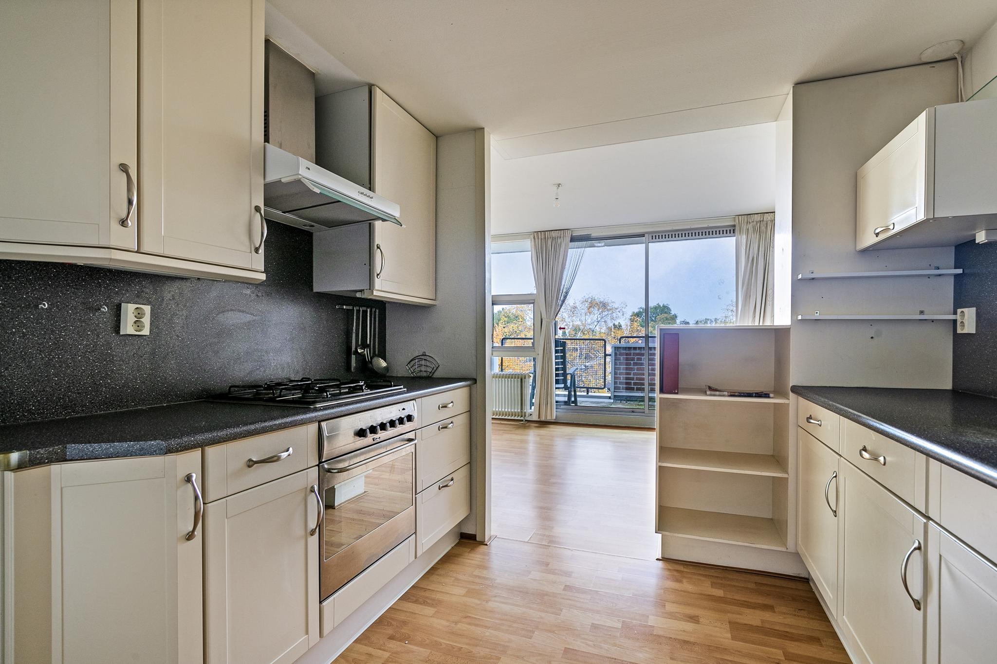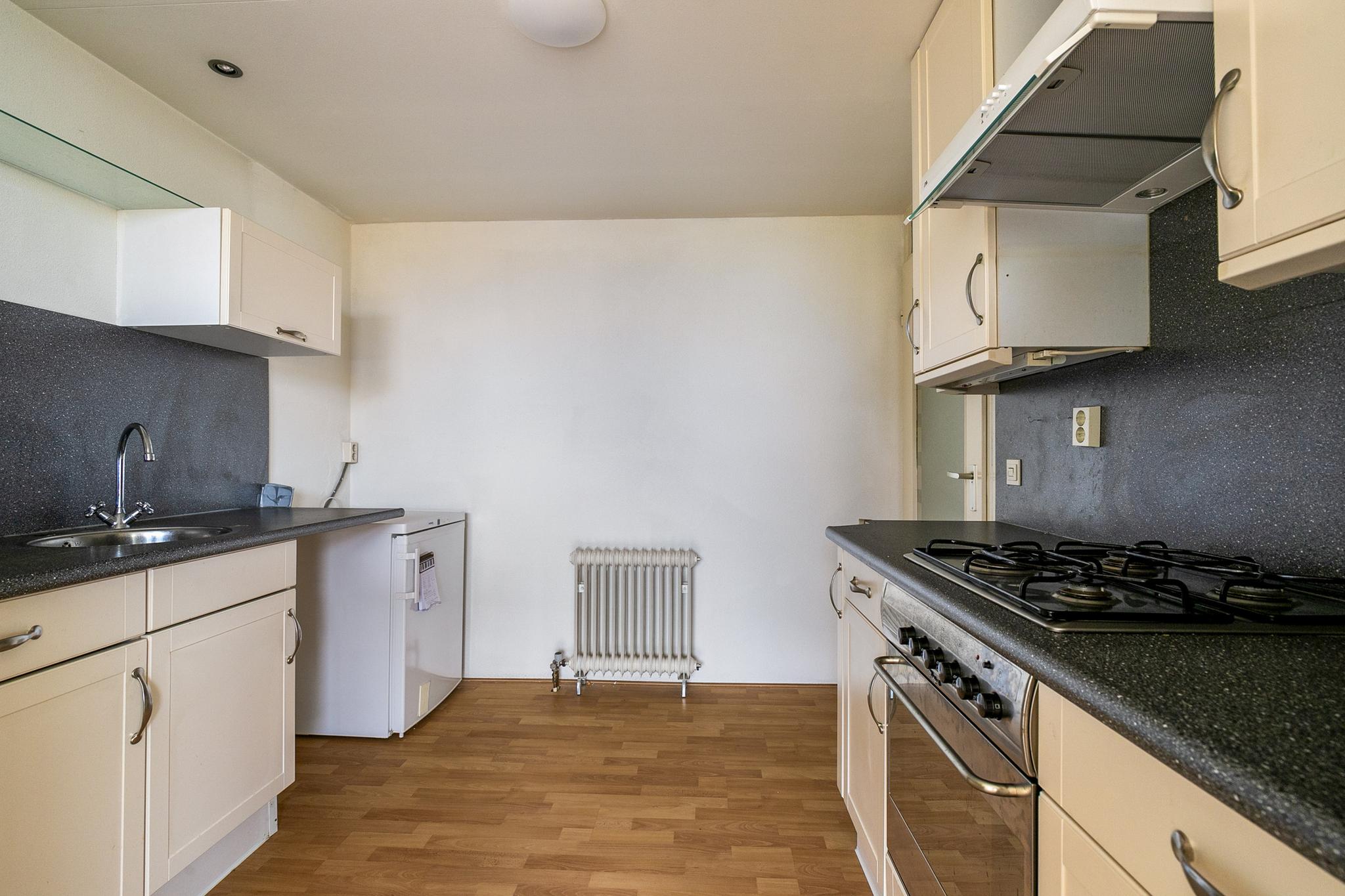Begane grond: entree; hal met glazen bouwstenen waardoor veel lichtinval; meterkast; toilet met fontein tot plafond betegeld, lichte badkamer tot plafond betegeld voorzien van douchehoek, vaste wastafel, design radiator en wasmachine en wasdroger aansluiting; bijkeuken; slaapkamer I voorzien van dubbel glas en schuifkastenwand, slaapkamer II; half open keuken in 2x rechte opstelling geplaatst en voorzien van diverse inbouwapparatuur, t.w. wasemkap, oven, 4 pits gasfornuis en koelkast; naar terras; brede woonkamer met hoog plafond en veel lichtinval door schuine ramen en schuifpui naar het terras op het zuiden.