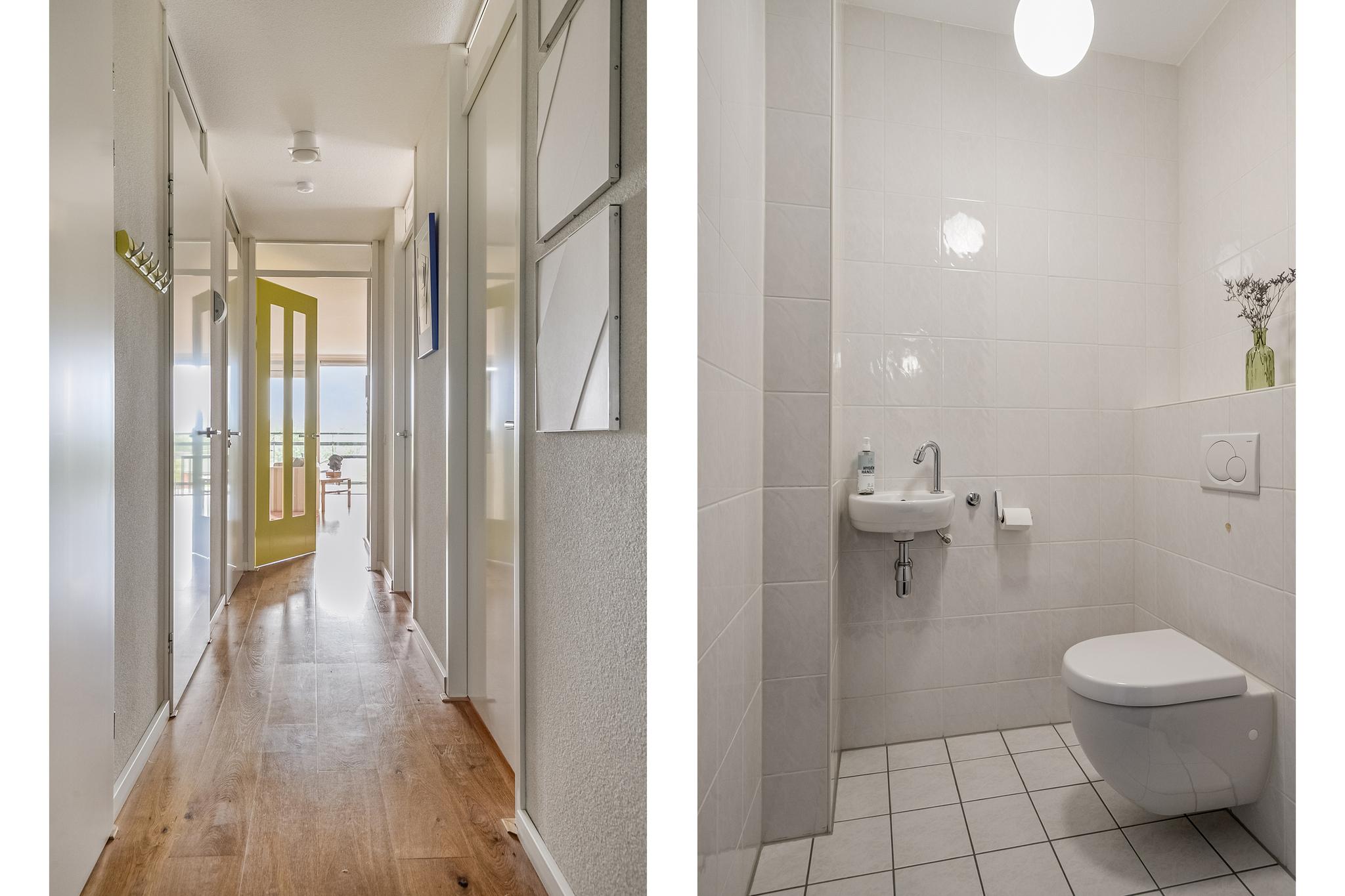 Entree; gang; wandcloset met fontein tot plafond betegeld; meterkast; berging met cv ketel Nefit HR (2020), wasmachine- en wasdrogeraansluiting voorzien van spoelbak en plavuizen vloer; lichte badkamer tot plafond betegeld voorzien van wandcloset, met dubbel wastafelmeubel, inloopdouche en design radiator; slaapkamer I & II zijn beiden voorzien van een zijgevelraam; glazen deur naar royale living voorzien van parketvloer met zijgevelraam en dubbele deuren naar overdekt balkon waardoor veel lichtinval; open keuken uitgevoerd in een lichte kleurstelling in U-opstelling geplaatst en voorzien van diverse inbouwapparatuur, t.w. koelkast, combi magnetron, composiet aanrechtblad, 5-pits gasfornuis, RVS afzuigkap en geintegreerde vaatwasmachine,