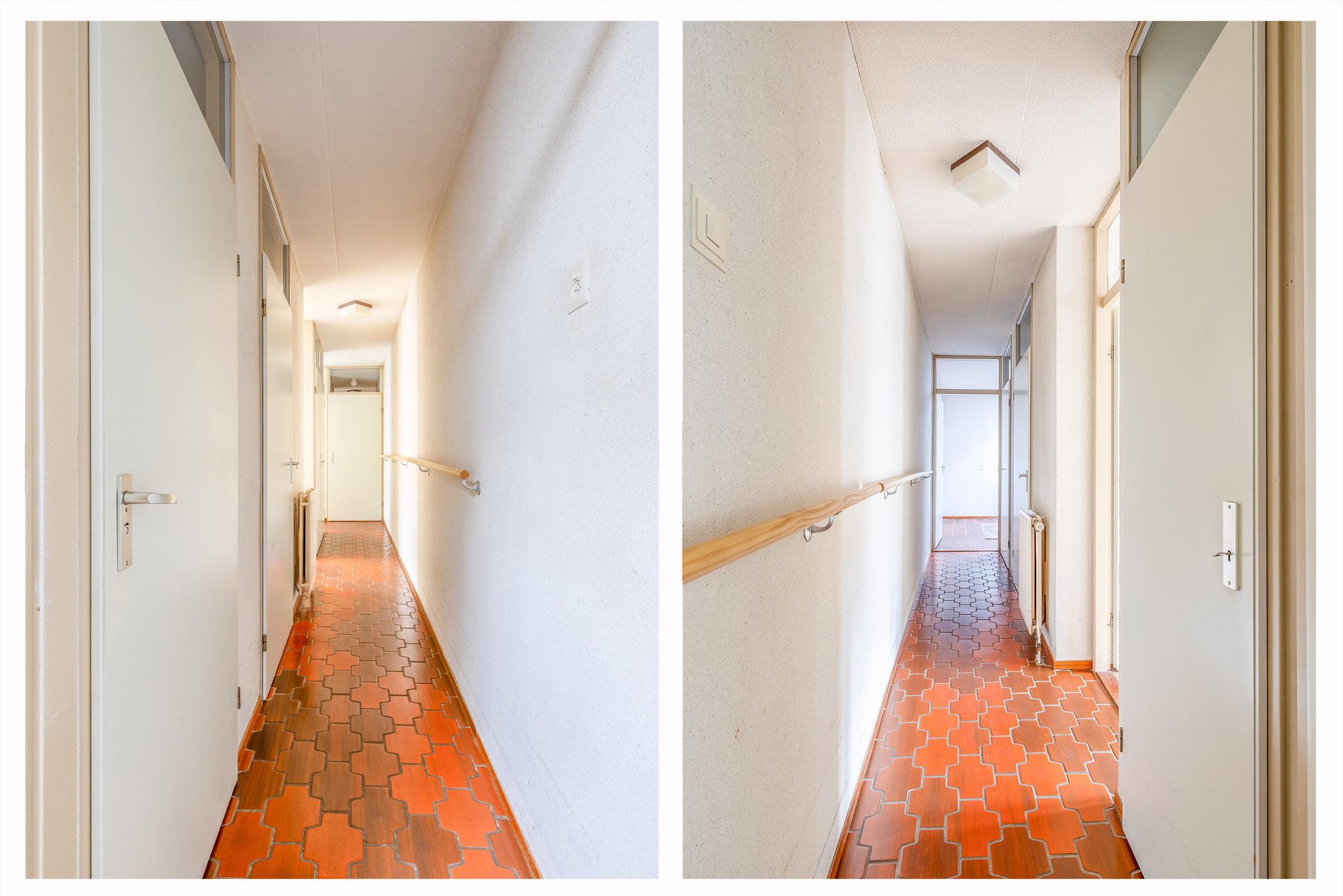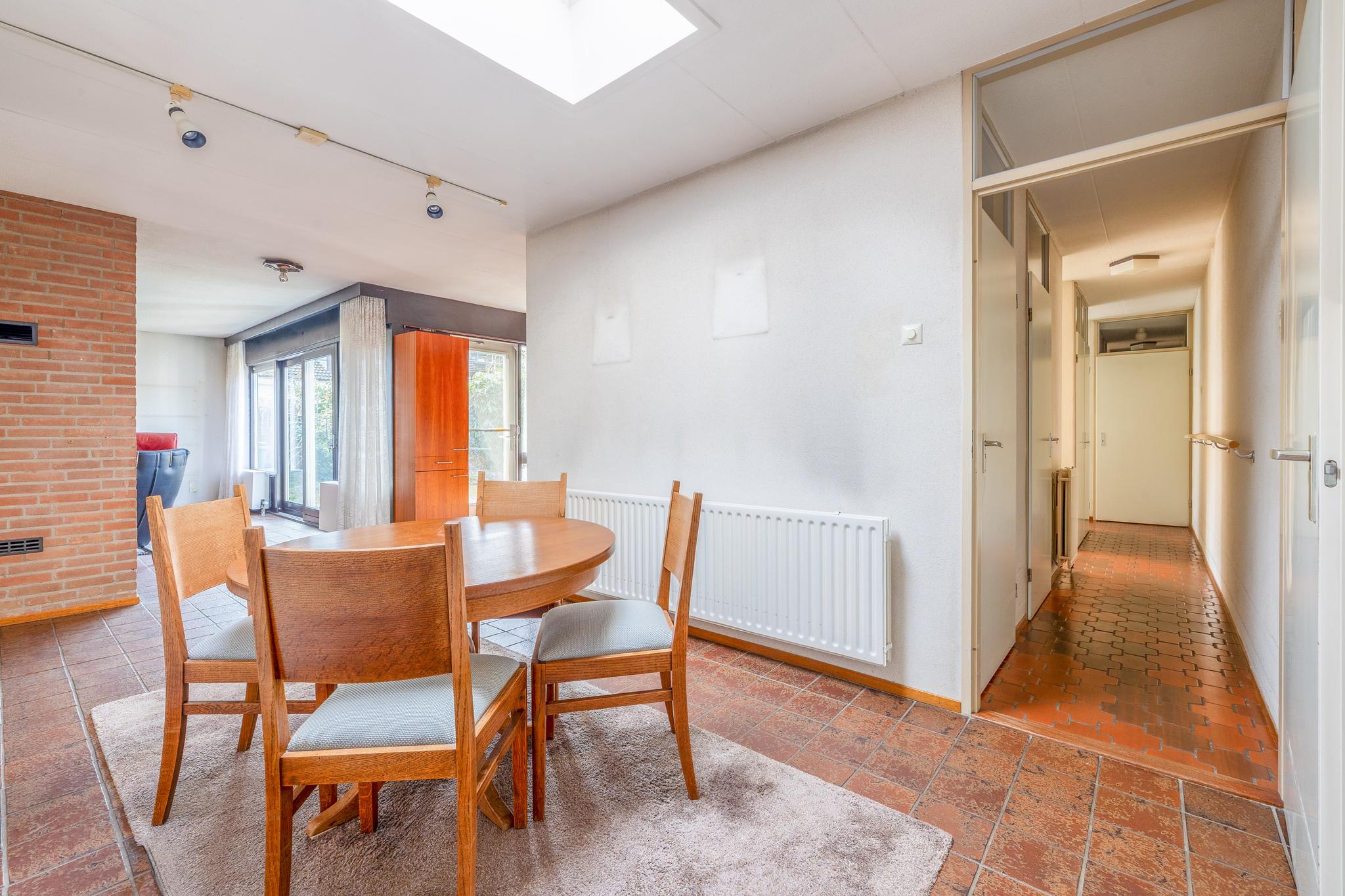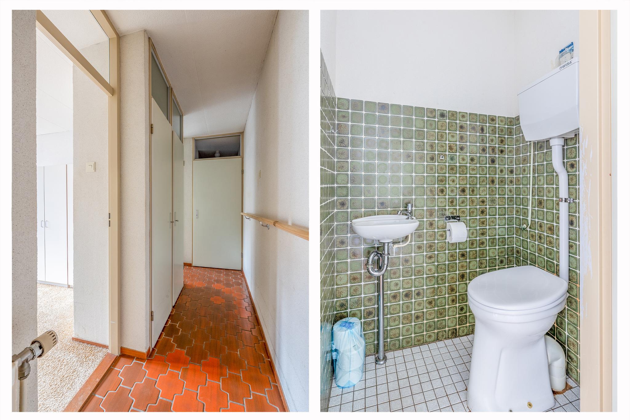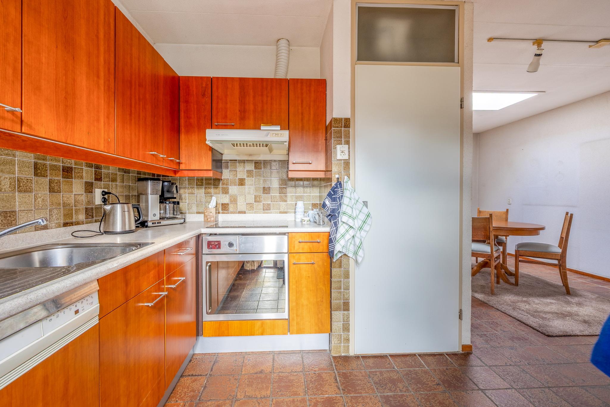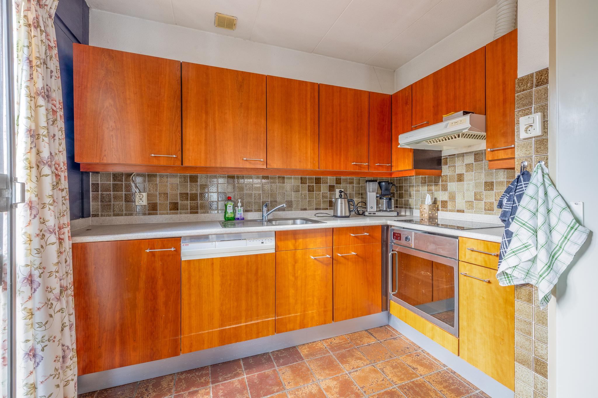 Begane grond: Entree, hal met meterkast en garderobe; vanuit de hal komt u in de eetkamer met lichtkoepel; aansluitend sfeervolle woonkamer met plavuizen vloer, open haard en schuifpui met toegang tot het terras; half open keuken in L-opstelling voorzien van inbouwapparatuur t.w. koelkast, vaatwasser, oven, inductie kookplaat en afzuigkap; tevens bevindt zich hier de c.v. opstelling kast; doorloop naar de werkkamer/slaapkamer; via de gang met diverse inbouwkasten zijn de 2 slaapkamers, toilet met fontein en badkamer bereikbaar; slaapkamer I en geeft via deur toegang tot het terras; de andere slaapkamer heeft extra opbergruimte en tevens een deur naar terras. De badkamer is uitgevoerd in lichte kleurstelling, tot plafond betegeld en voorzien van een inloopdouche met drain, wastafelmeubel en wasmachine aansluiting.
