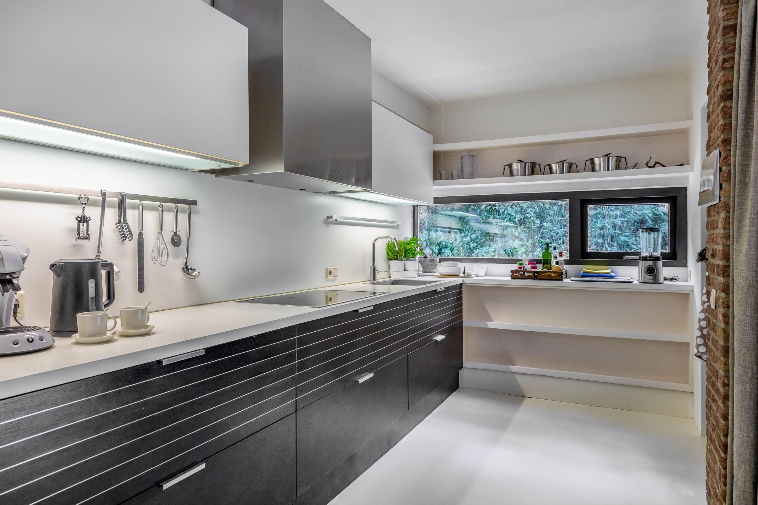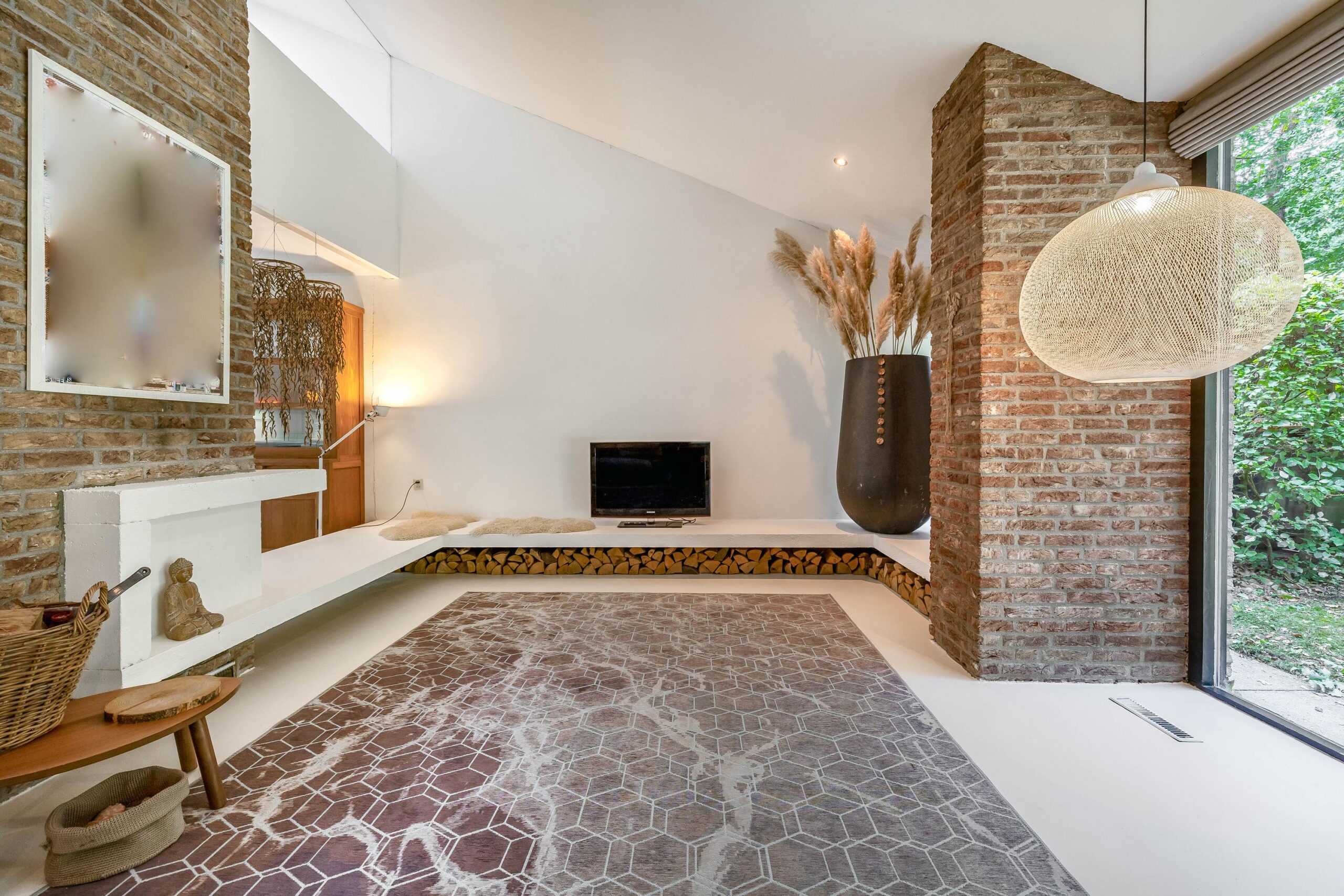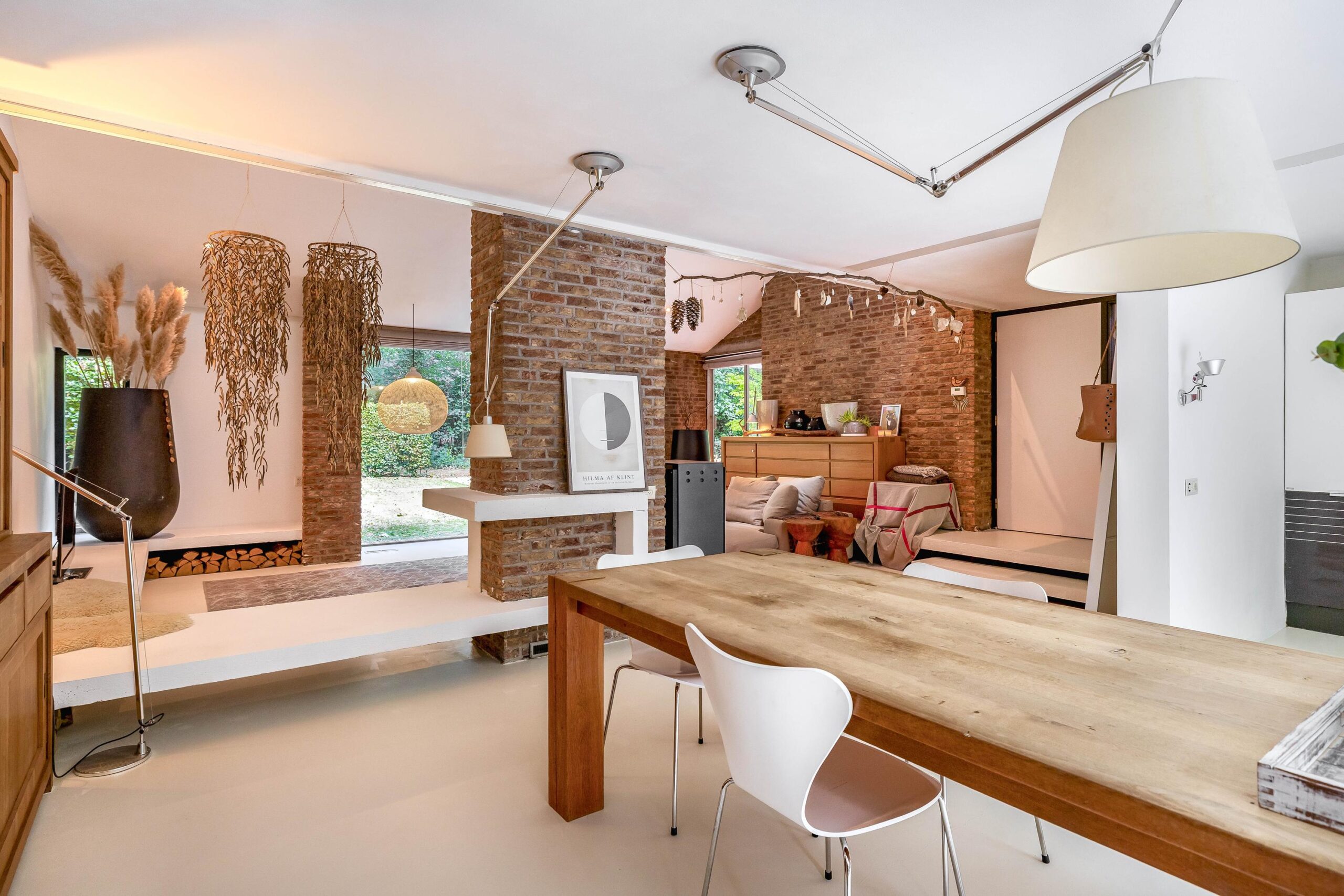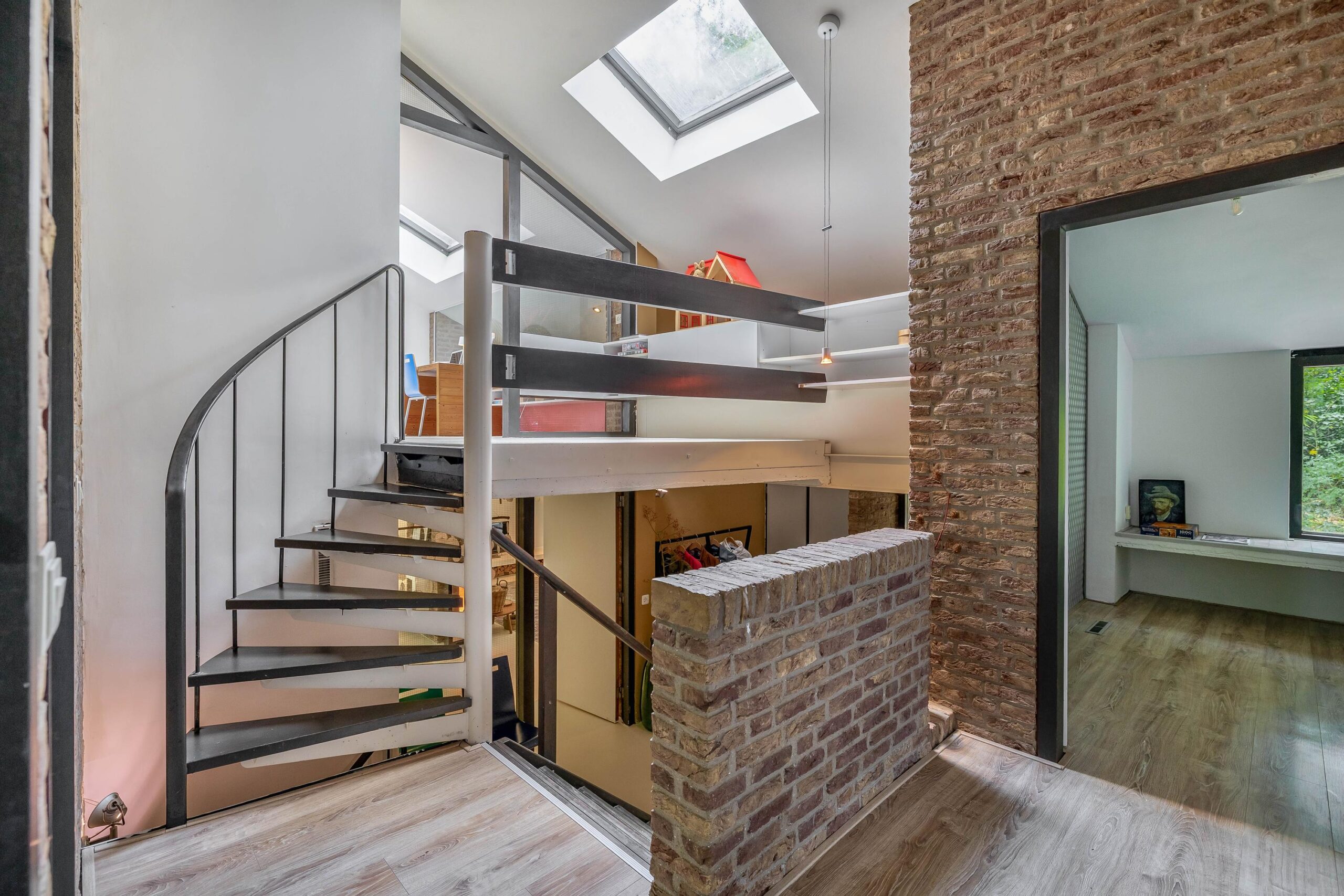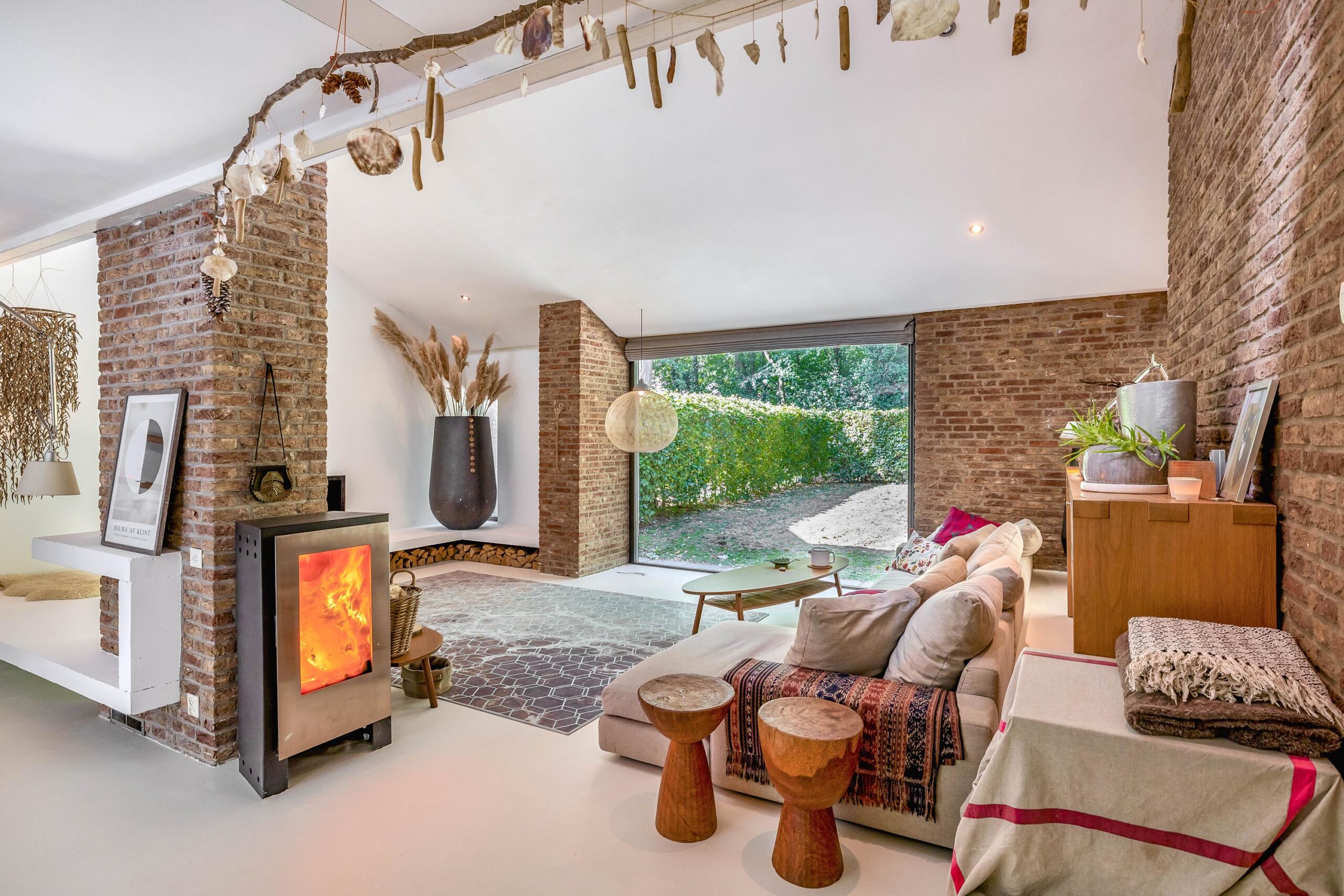 – hoge plafonds, vides, speelse indeling, houtkachel met zwevend plateau (met daaronder opslag voor hout) centraal
