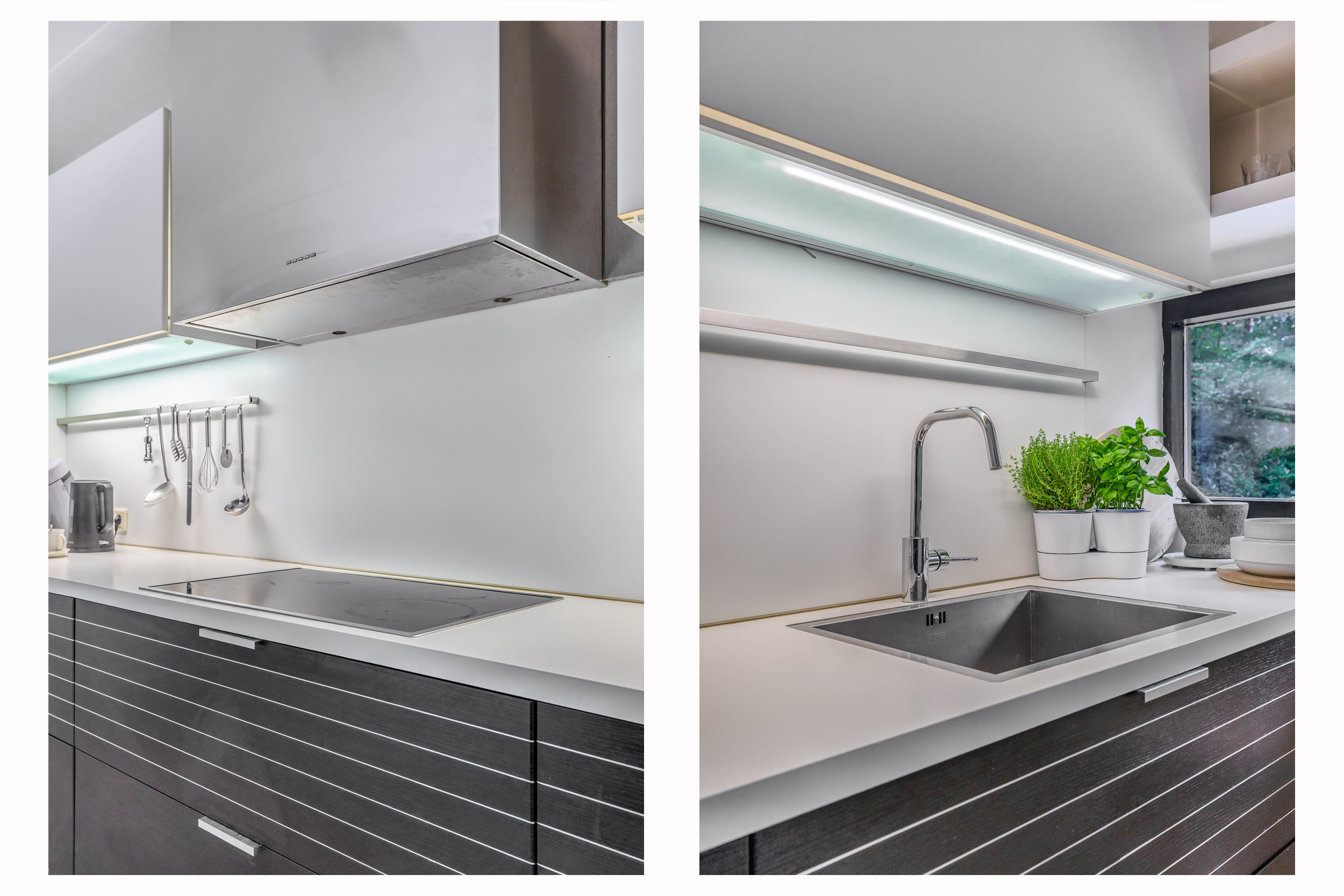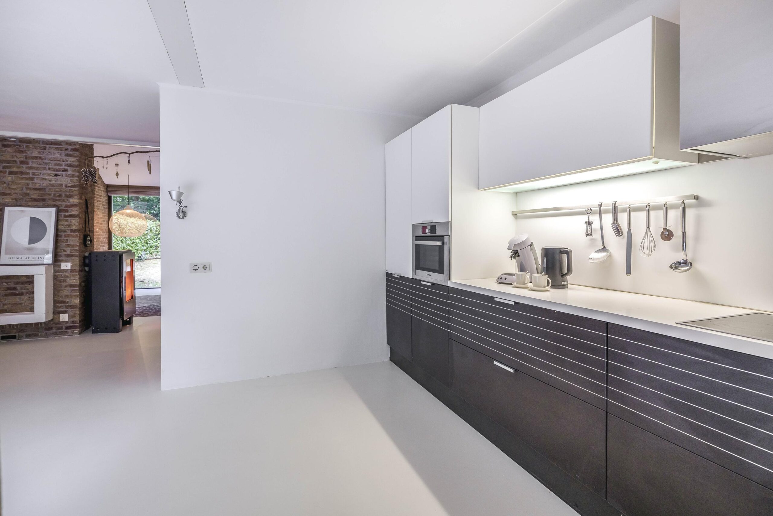 Begane grond (woongedeelte): Overdekte entree; hal (hoog plafond) met meterkast en opbergkast; prachtige lichte woonkamer met houtkachel, hoog plafond en betonnen vloer; eetkamer met schuifpui naar de tuin; open keuken in rechte opstelling geplaatst en voorzien van koelkast, combi stoomoven, vaatwasser, keramische kookplaat, afzuigkap en deur naar buiten.