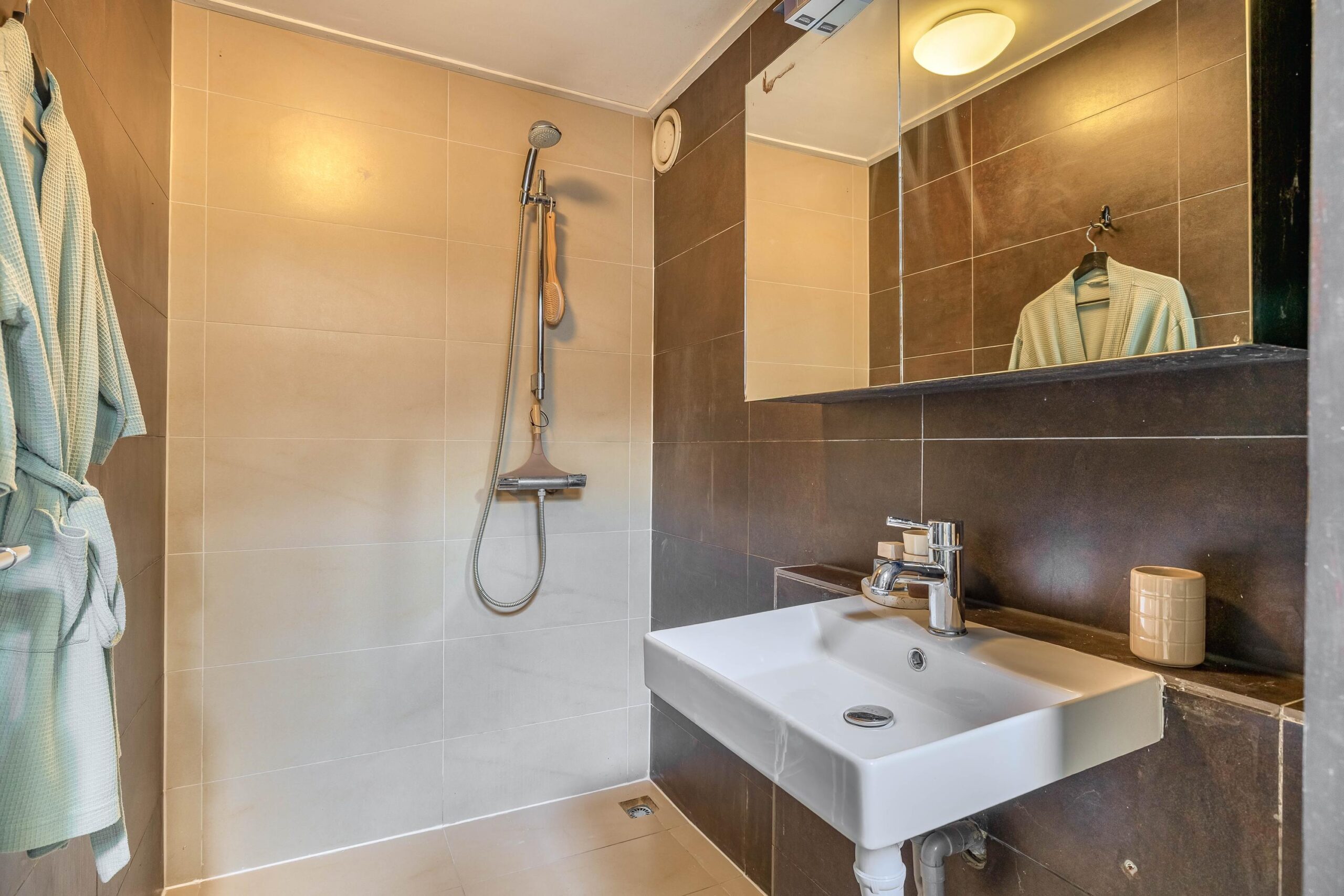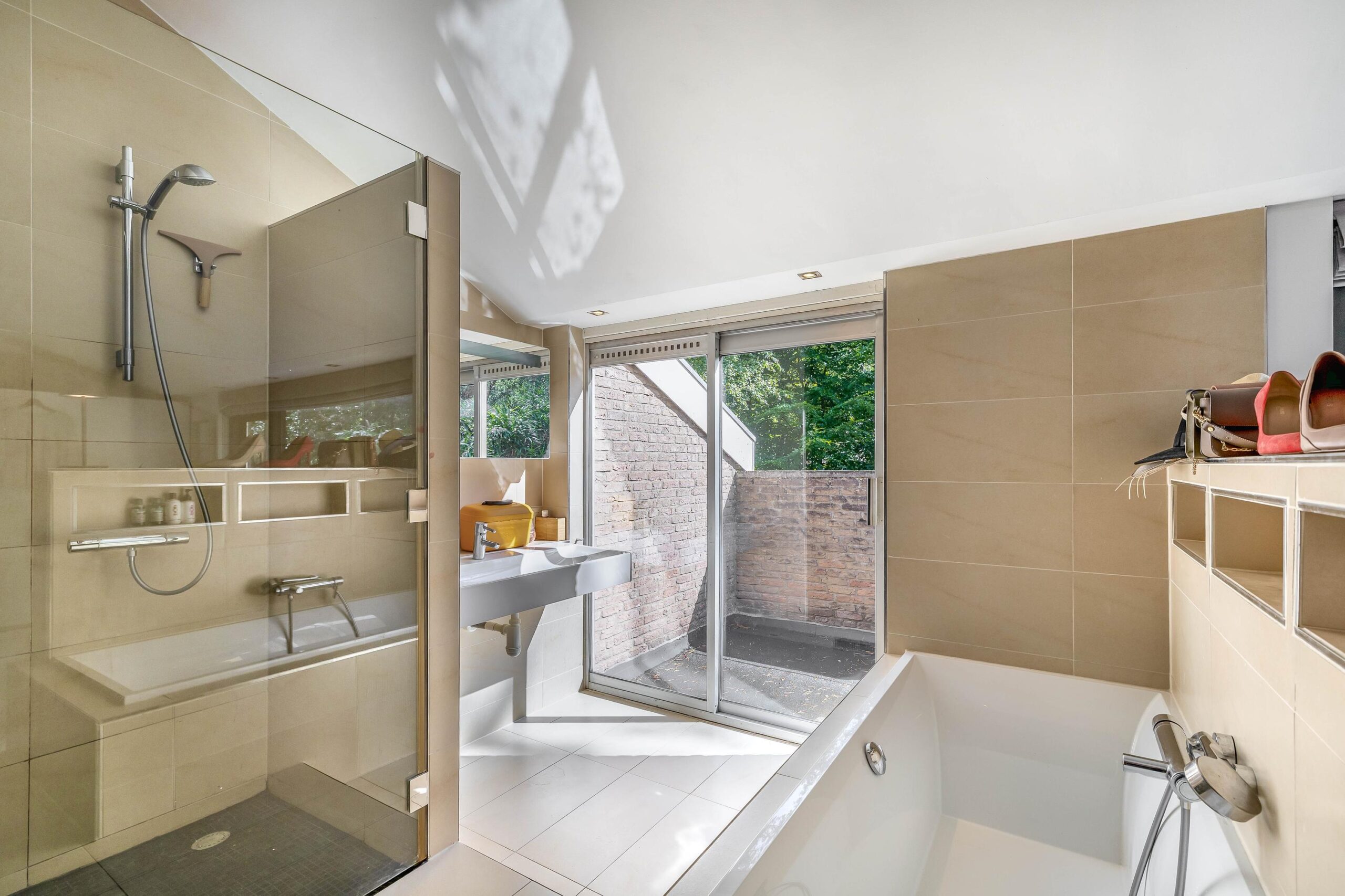 Splitlevel/1e verdieping (slaapgedeelte): Overloop; slaapkamer I met hoog plafond; vide; slaapkamer II met hoog plafond en vide; aparte toiletruimte met wandcloset en fonteintje; doucheruimte met wastafel, slaapkamer III.