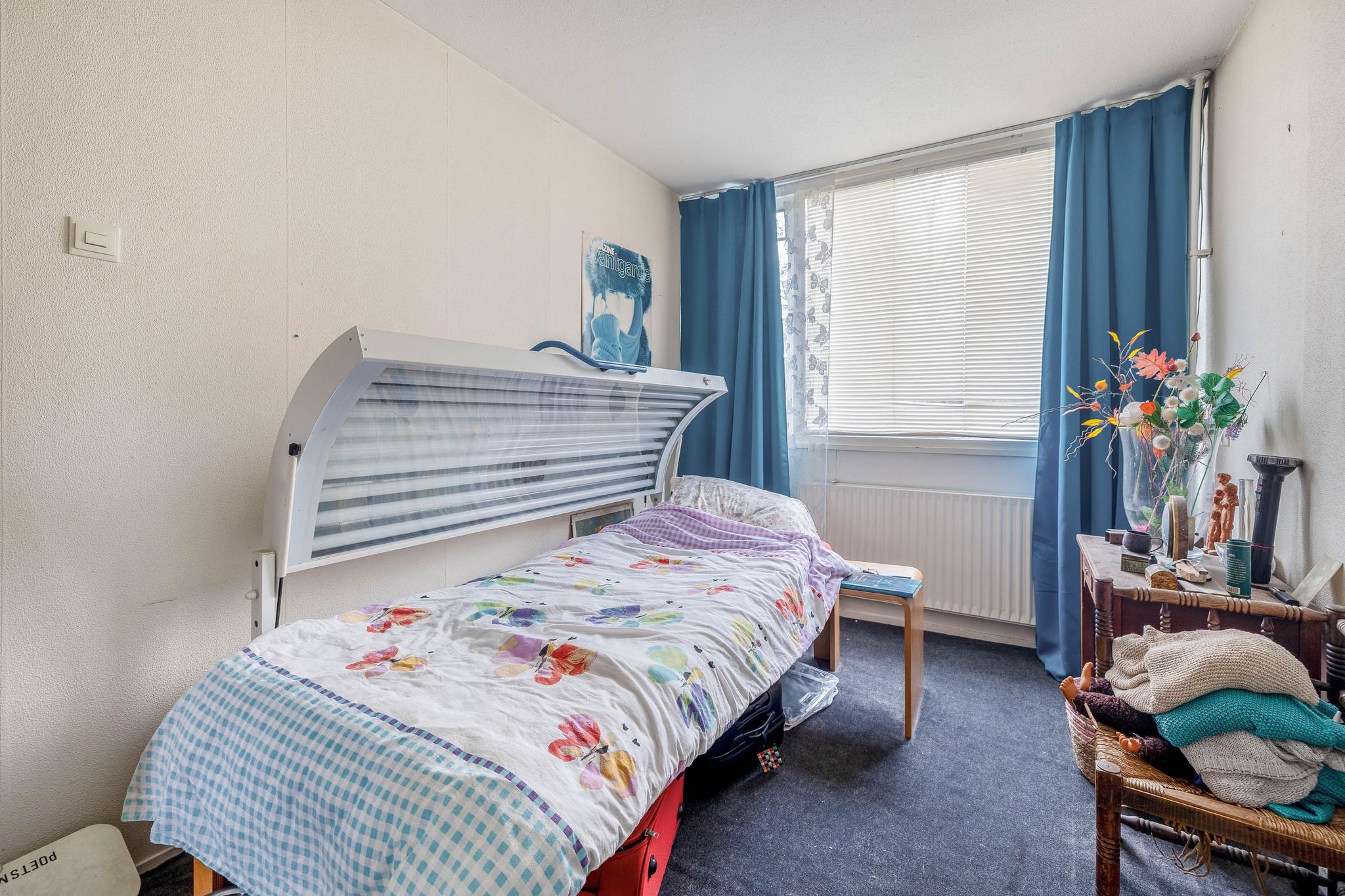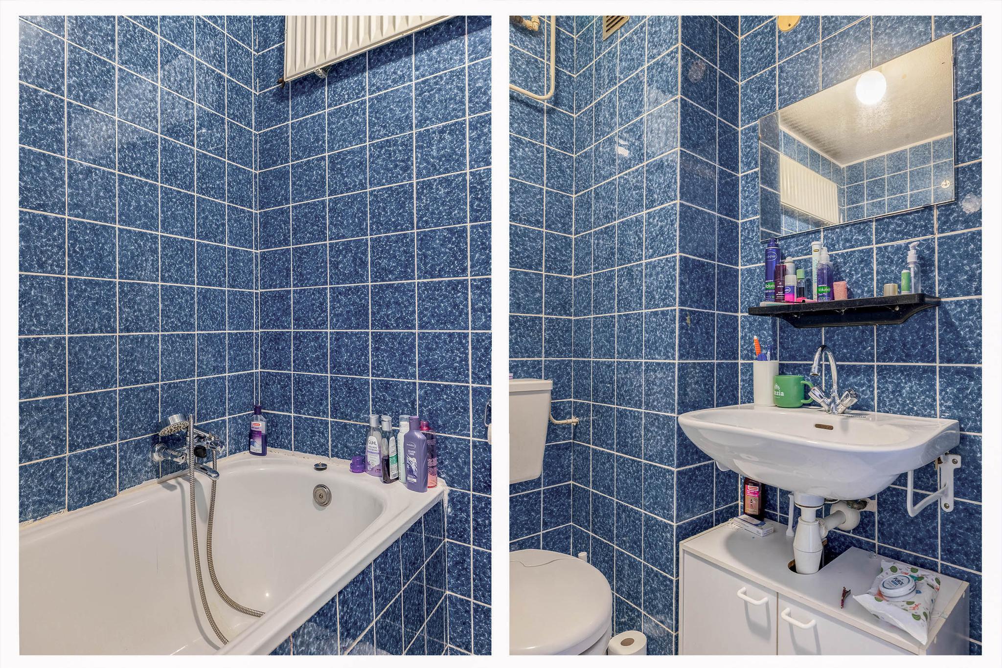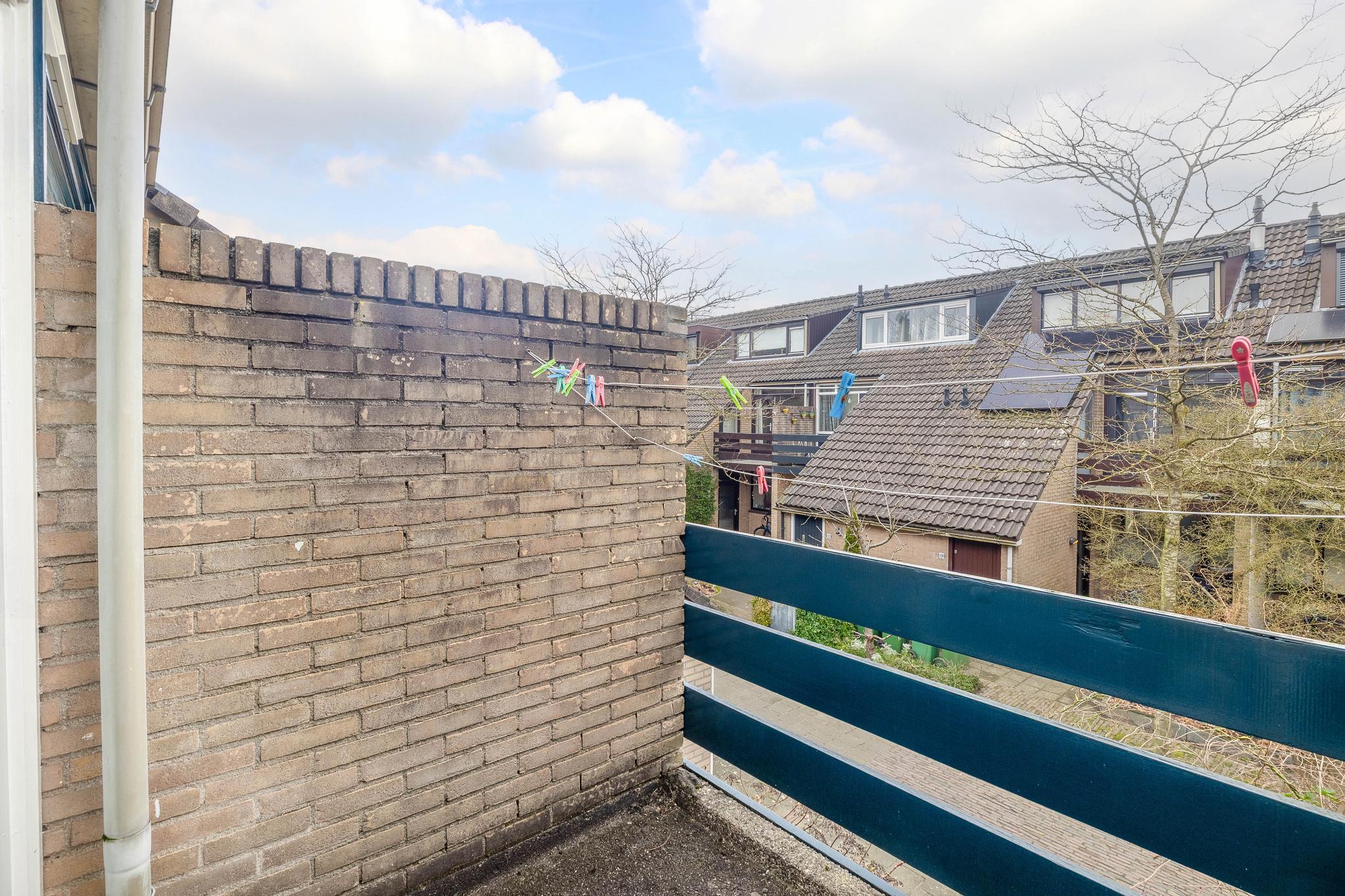 1e verdieping: overloop afgesloten middels een schuifdeur; slaapkamer I gelegen aan de voorzijde over de volle breedte van de woning met toegang tot het balkon en toegang tot de aangrenzende berging welke is voorzien van de opstelling van de wasapparatuur; badkamer tot plafond betegeld en v.v. ligbad, vaste wastafel en tweede toilet; slaapkamer II; slaapkamer III, beide gelegen aan de achterzijde van de woning.