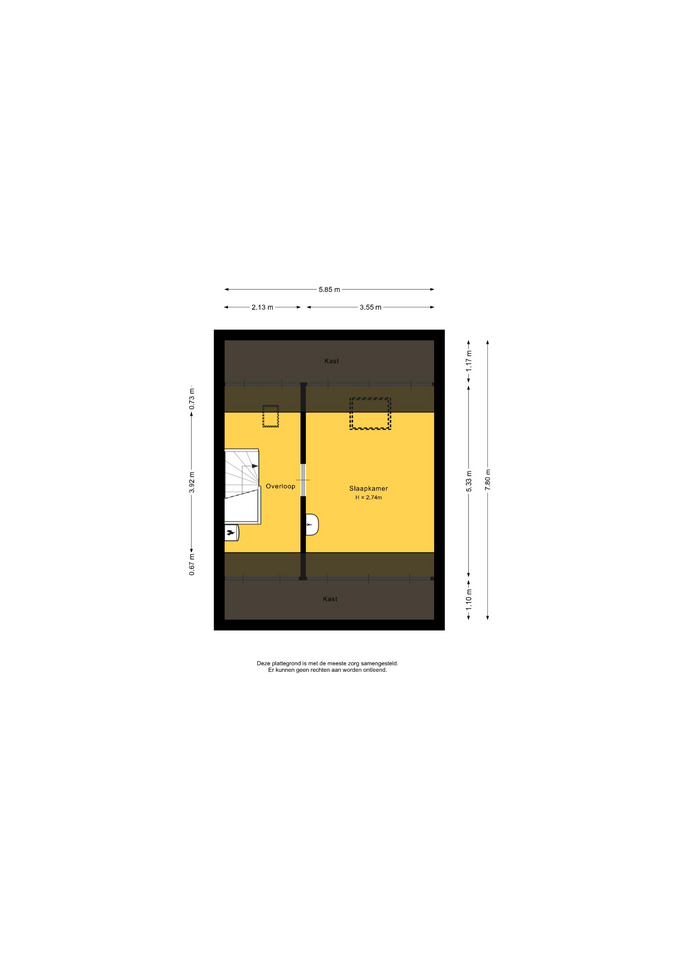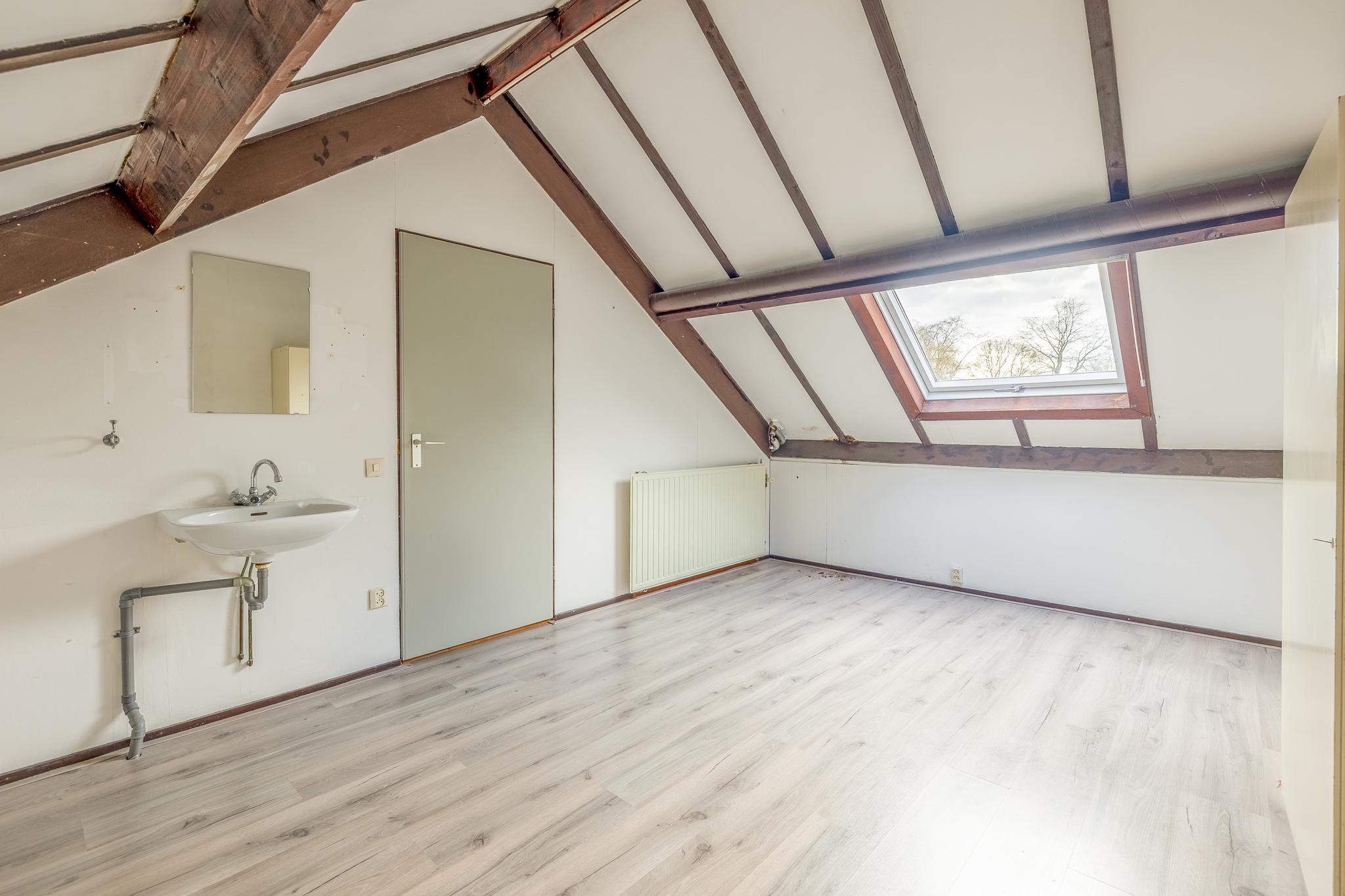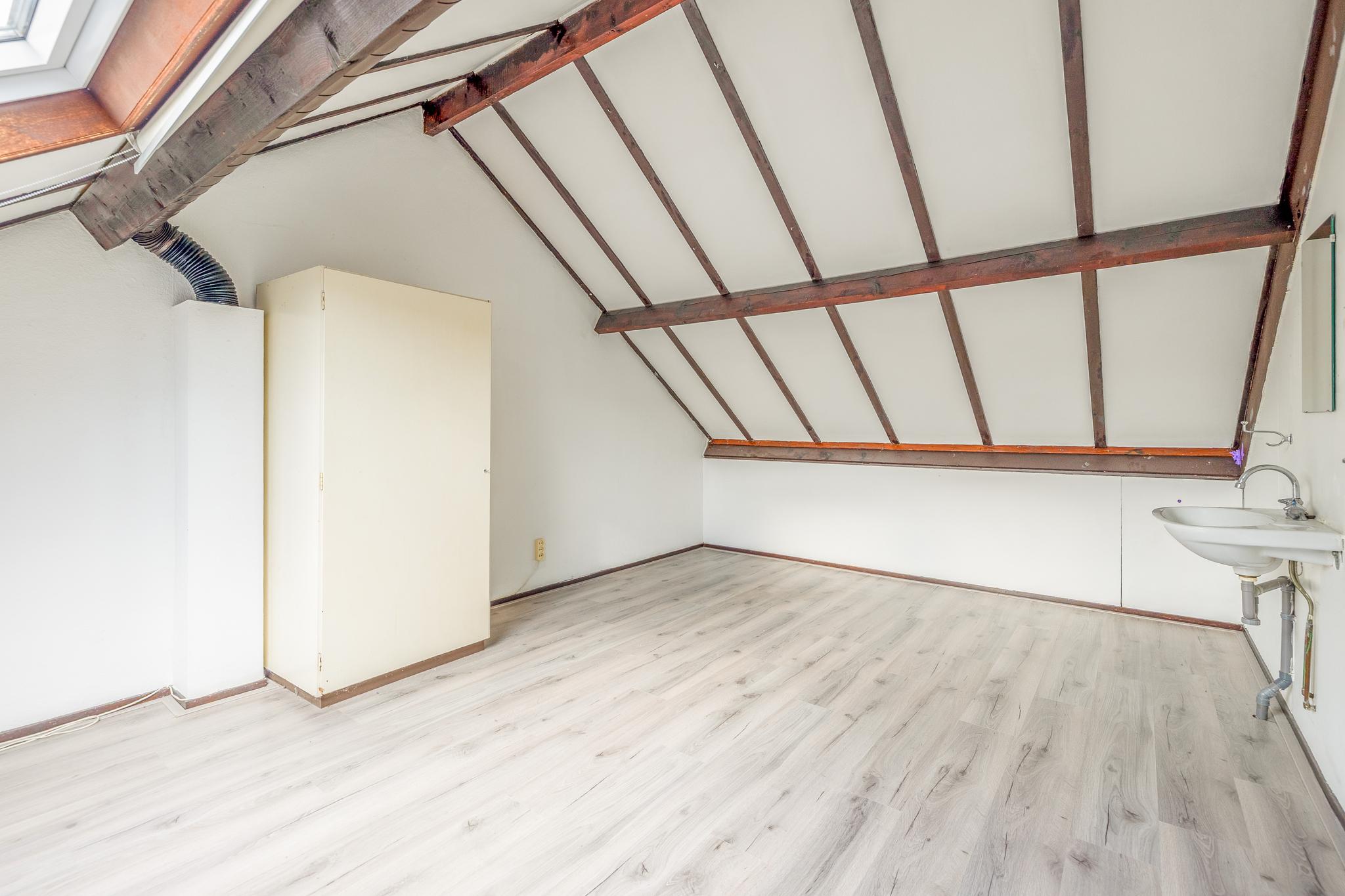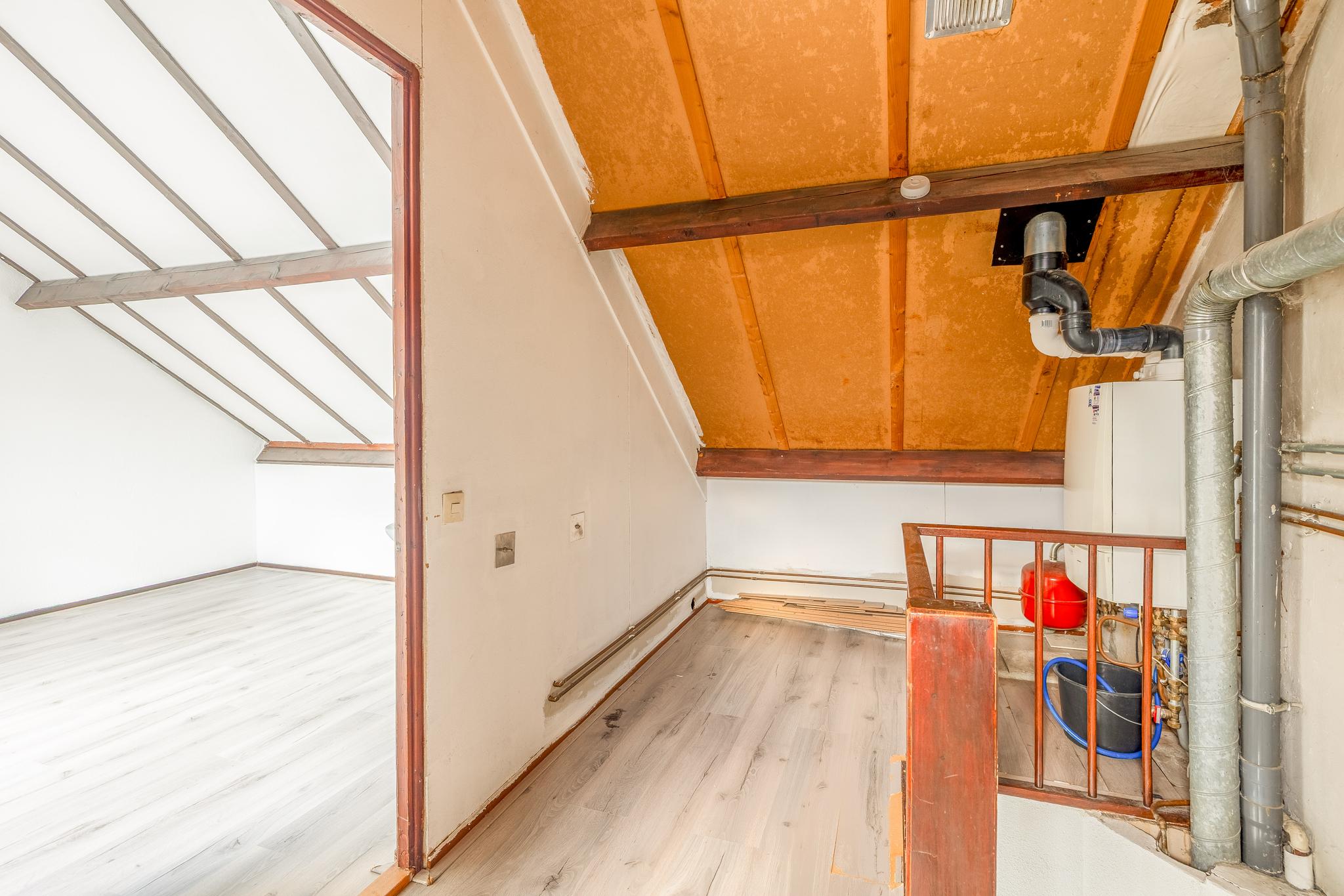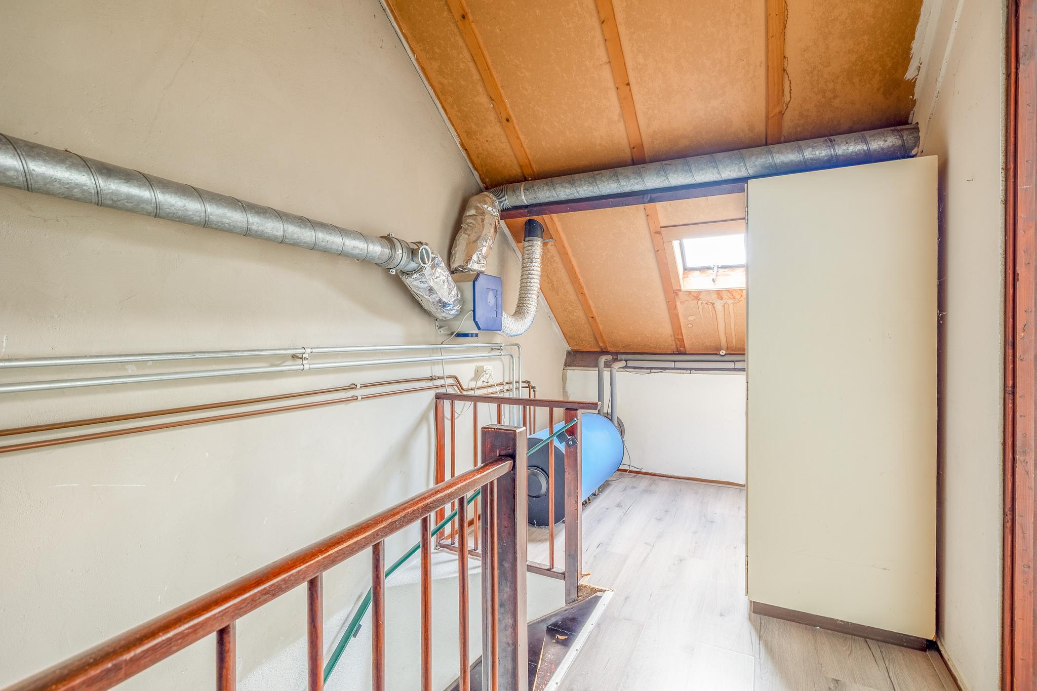 2e verdieping: Voorzolder met voorraadboiler en opstelling voor de C.V.-installatie; slaapkamer met dakvenster, vaste wastafel en bergruimte achter knieschotten.