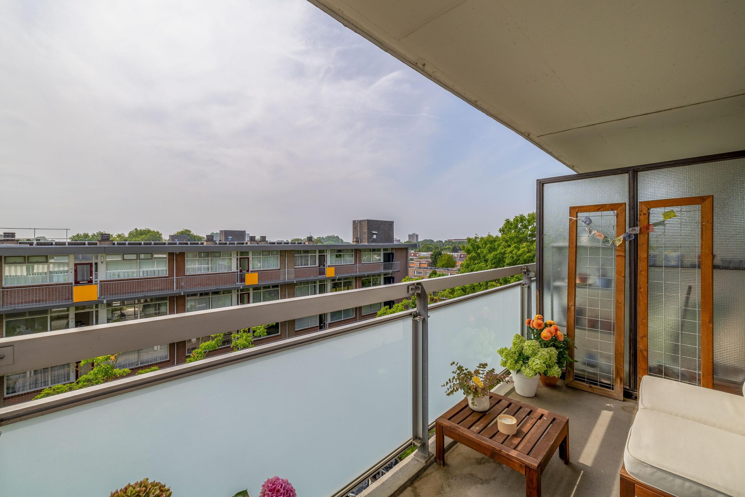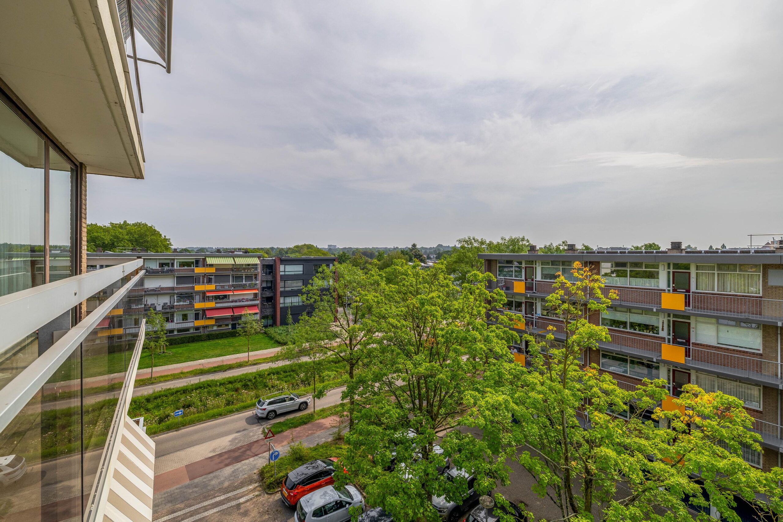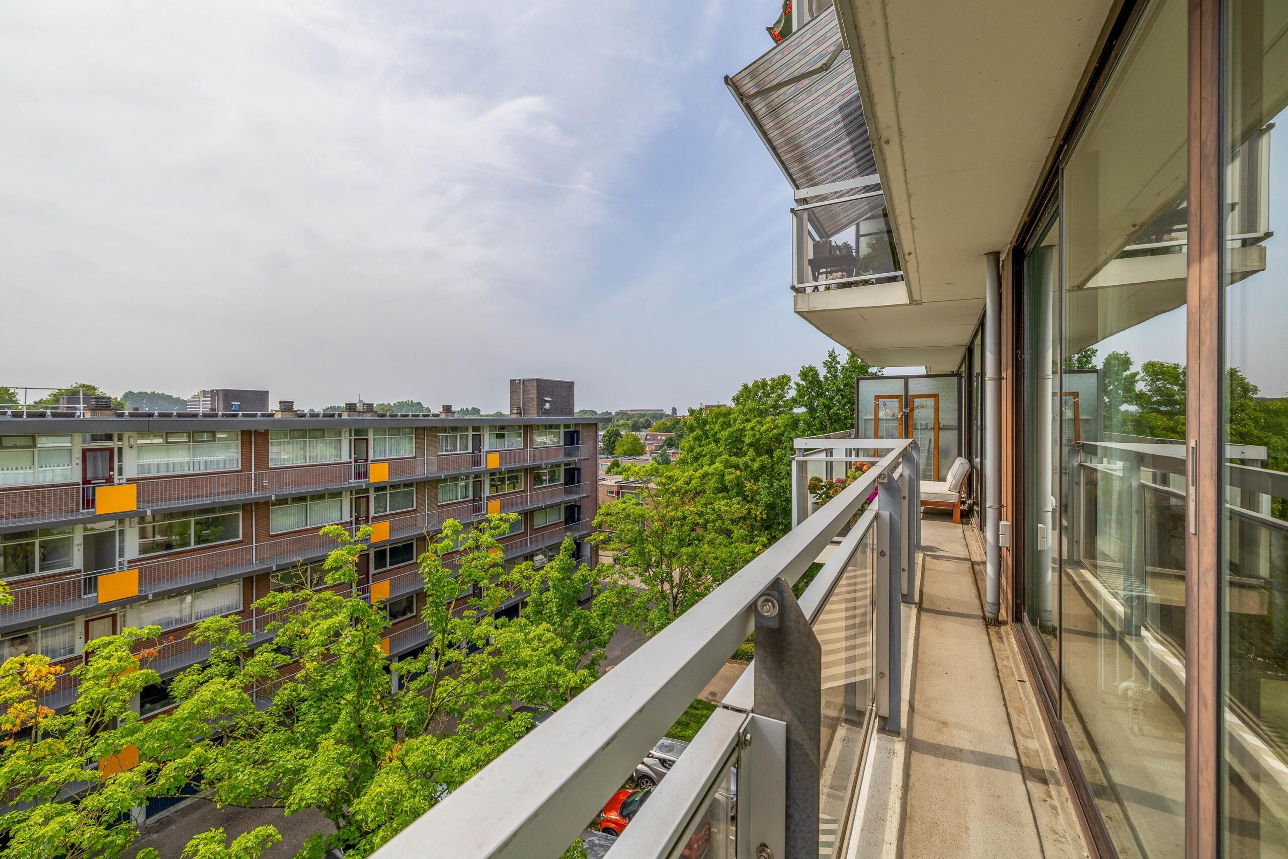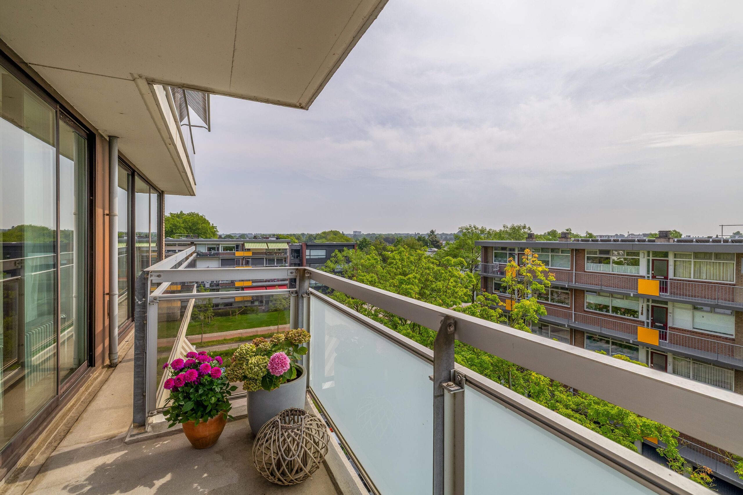 Op de 4e verdieping gelegen DRIEKAMER HOEKAPPARTEMENT (voorheen vierkamer) met rondom het hele appartement glazen puien (ruim 10 meter). Door de ligging en de grote glasoppervlakken is er vanuit het gehele appartement sprake van een vrij en panoramisch uitzicht. Dankzij de grote raampartijen en de gunstige situering, geniet je hier van een ongekend ruimtelijk gevoel. Binnen en buiten lopen naadloos in elkaar over, waarbij het brede balkon kan fungeren als verlengstuk van de woonruimte. Of je nu ‘s ochtends de dag begint met uitzicht over Wageningen en de opgaande zon, of ’s avonds ontspant bij ondergaande zon: dit is wonen met kwaliteit!