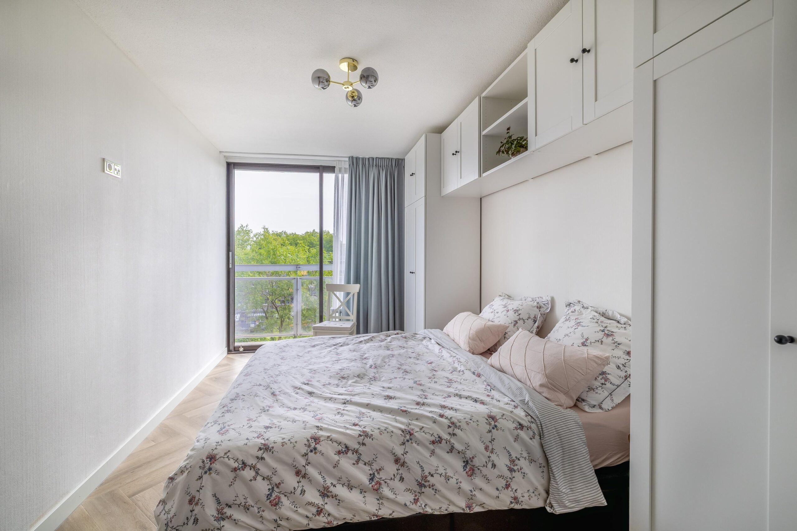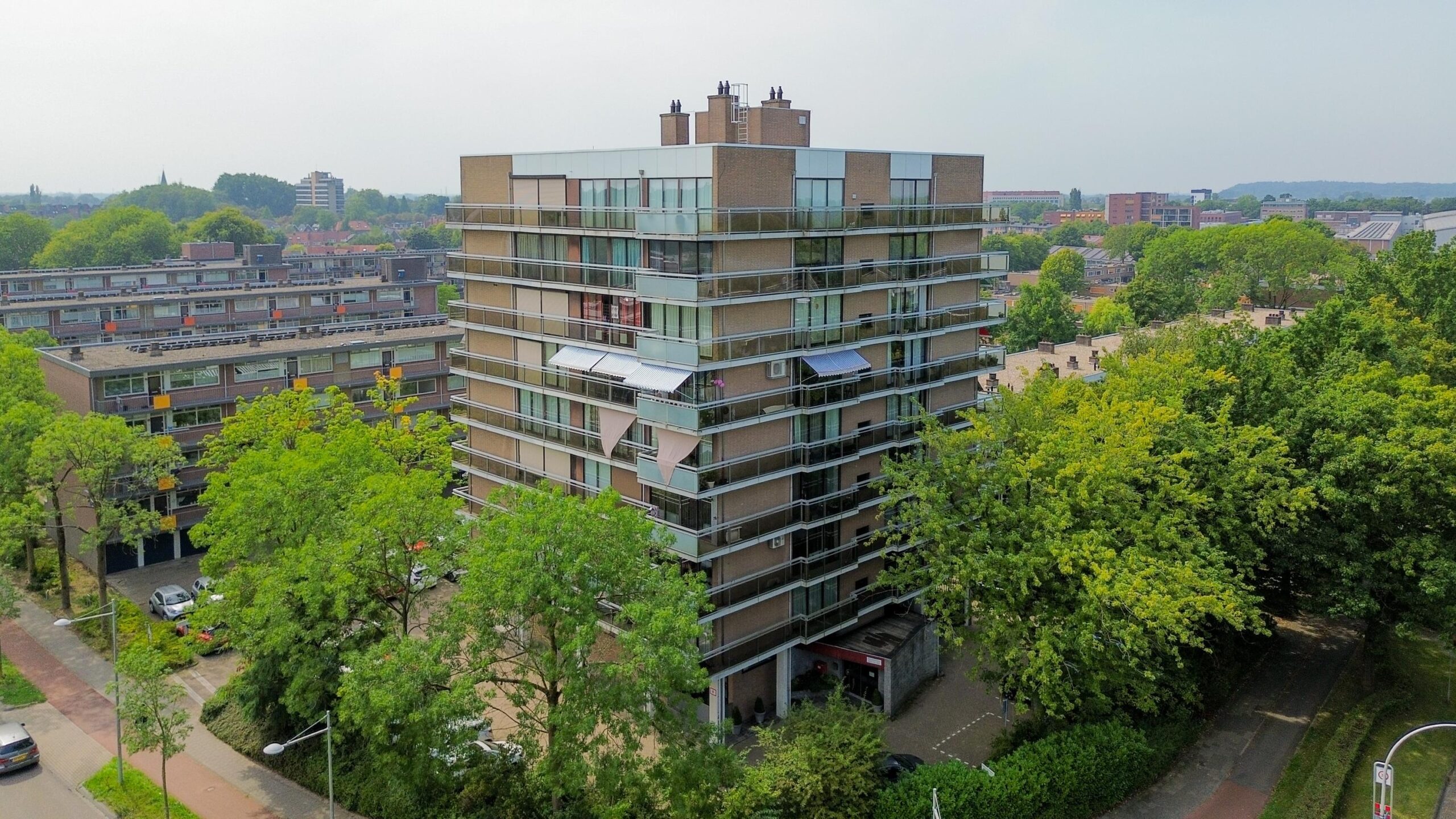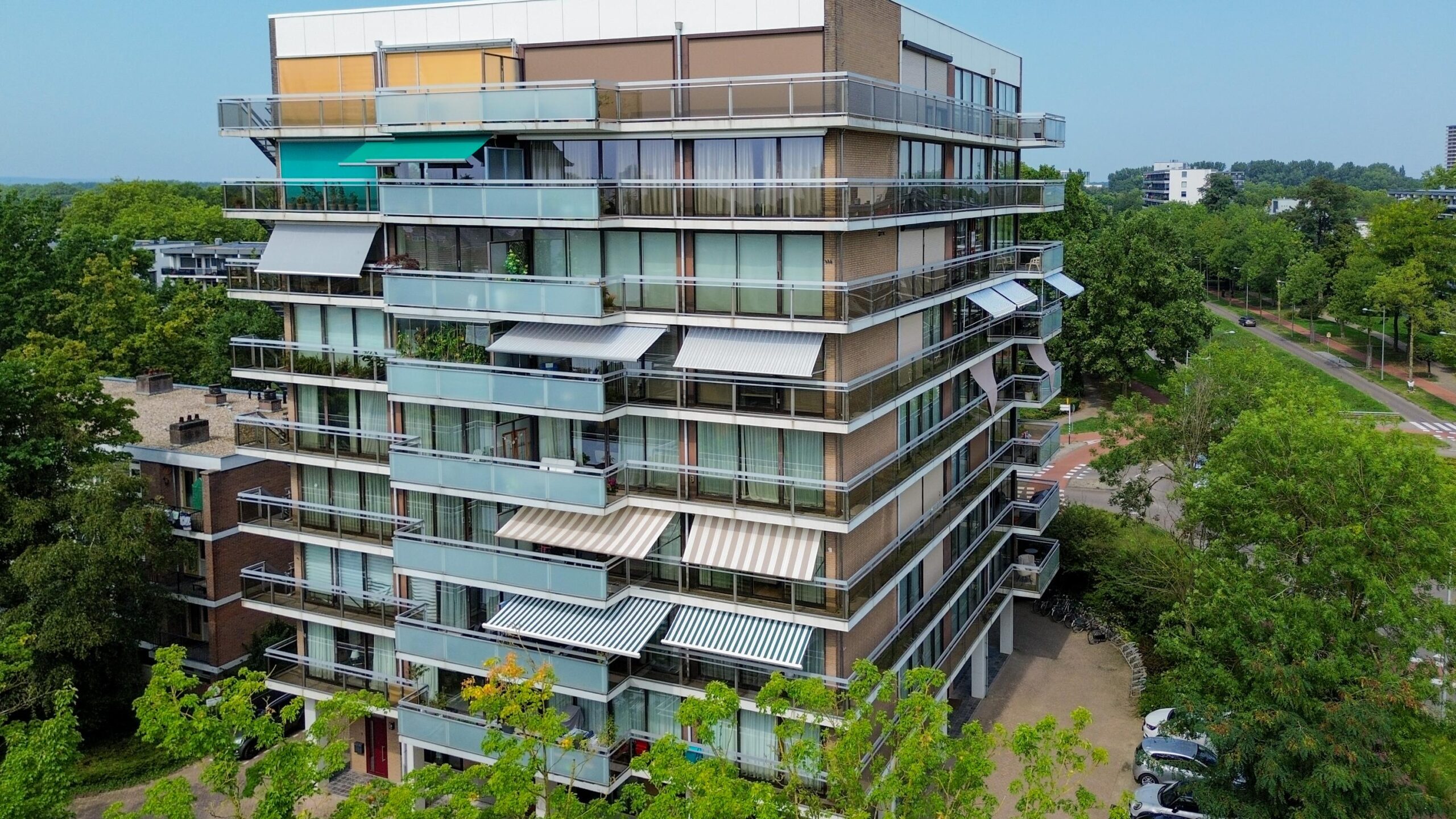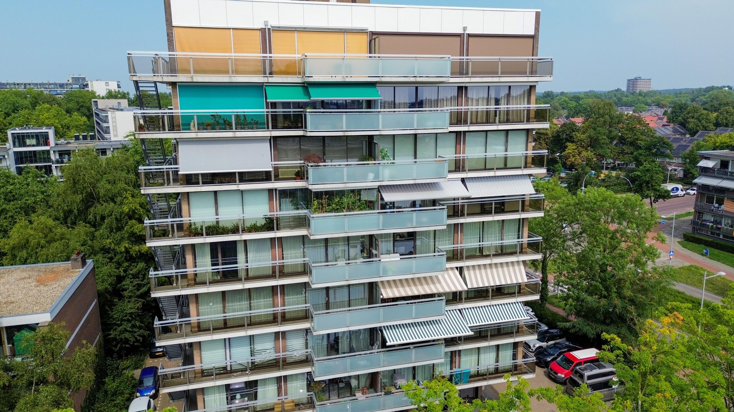 Op de 4e verdieping gelegen DRIEKAMER HOEKAPPARTEMENT (voorheen vierkamer) met rondom het hele appartement glazen puien (ruim 10 meter). Door de ligging en de grote glasoppervlakken is er vanuit het gehele appartement sprake van een vrij en panoramisch uitzicht. Dankzij de grote raampartijen en de gunstige situering, geniet je hier van een ongekend ruimtelijk gevoel. Binnen en buiten lopen naadloos in elkaar over, waarbij het brede balkon kan fungeren als verlengstuk van de woonruimte. Of je nu ‘s ochtends de dag begint met uitzicht over Wageningen en de opgaande zon, of ’s avonds ontspant bij ondergaande zon: dit is wonen met kwaliteit!